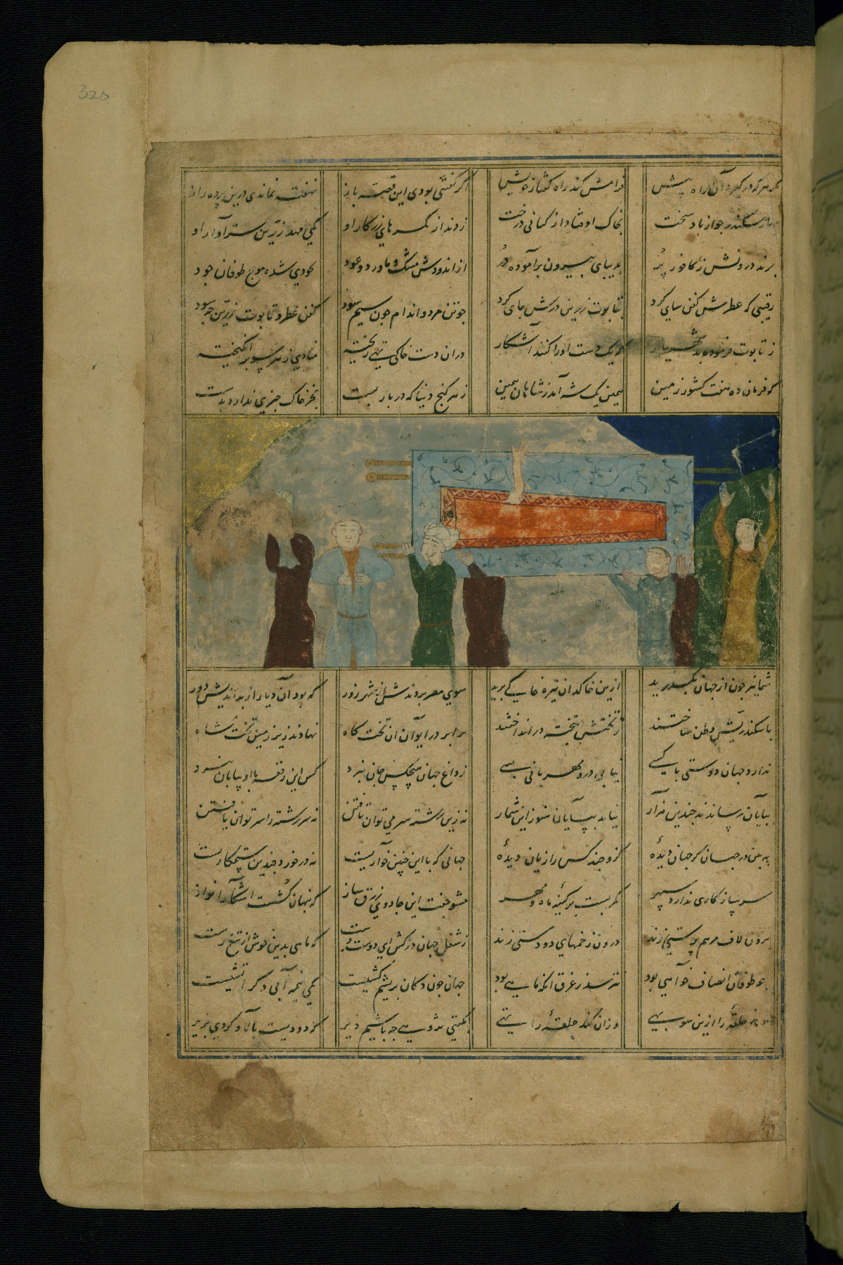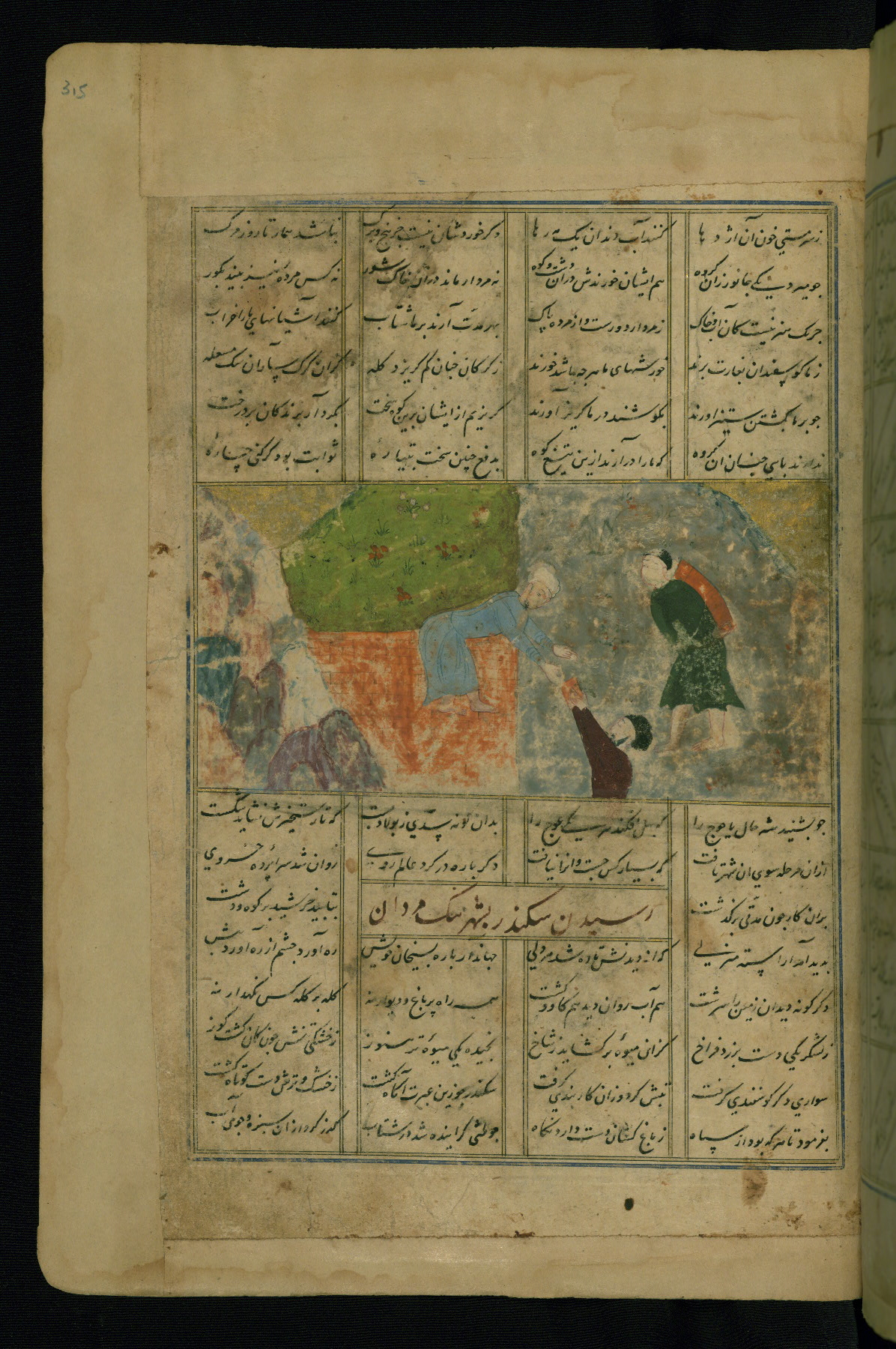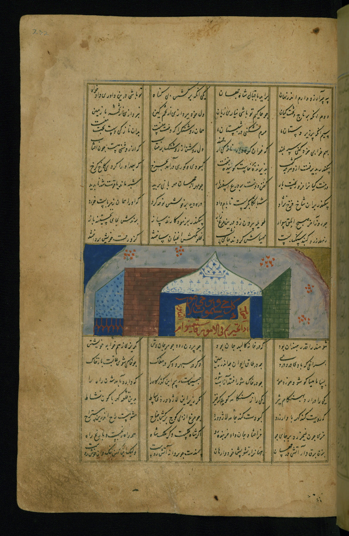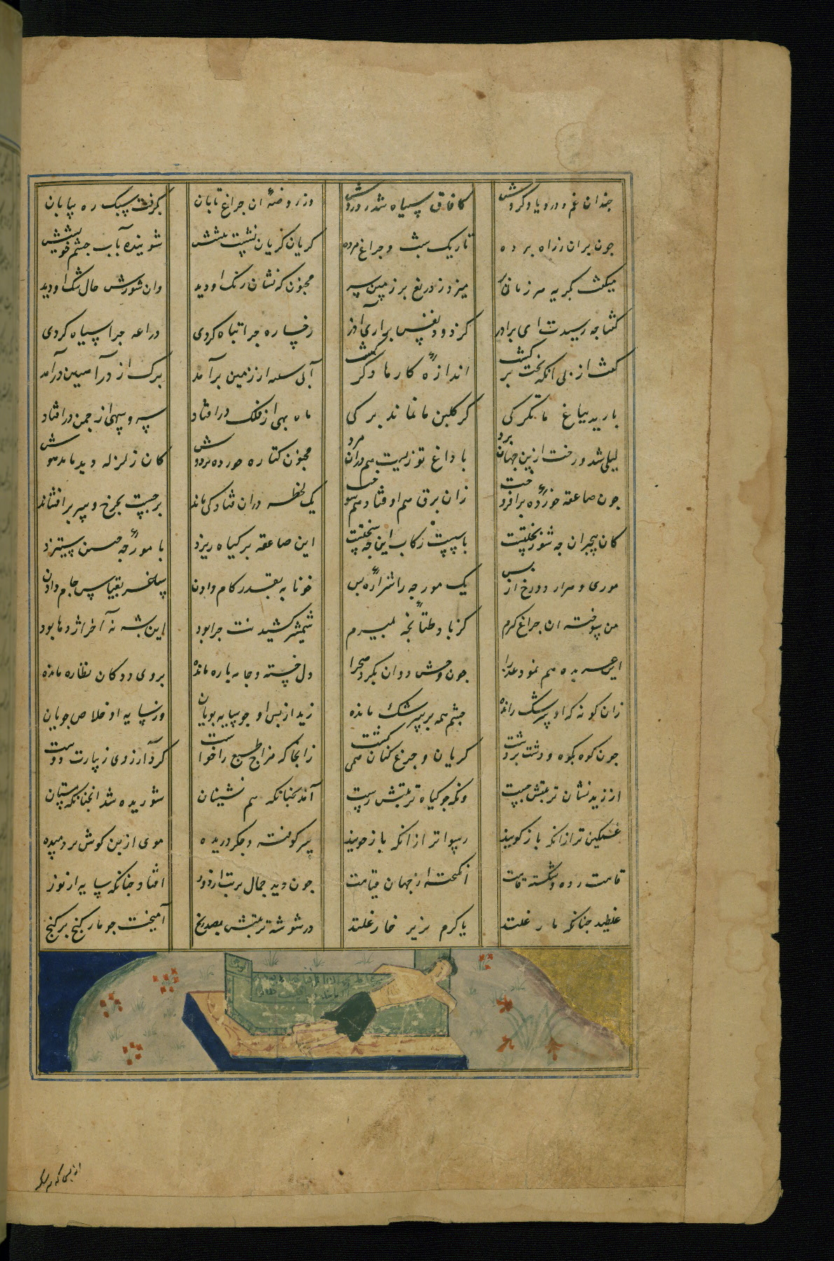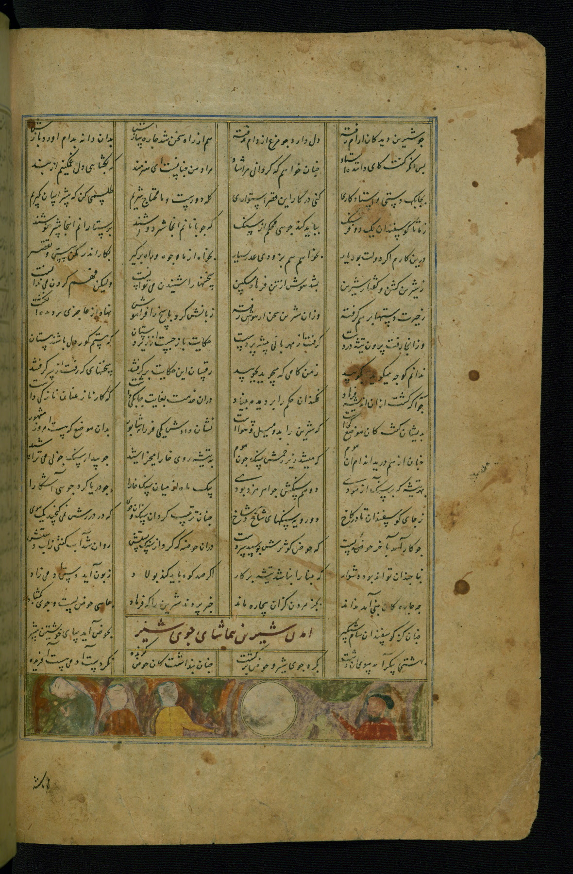 - Text note: Contains the following poems: Makhzan al-asrār (fols. 1b-25b), Khusraw va Shīrīn (fols. 26b-96a), Laylá va Majnūn (fols. 97a-145b), Haft paykar (fols. 146b-201a), and Iskandarnāmah (fols. 202b-323b), with Iqbālnāmah (second part of the Iskandarnāmah) beginning on fol. 281b