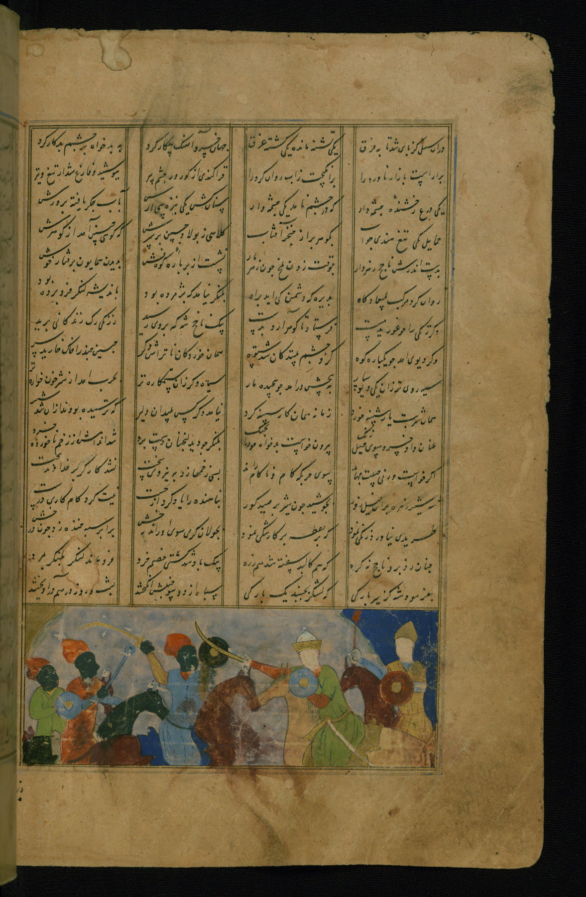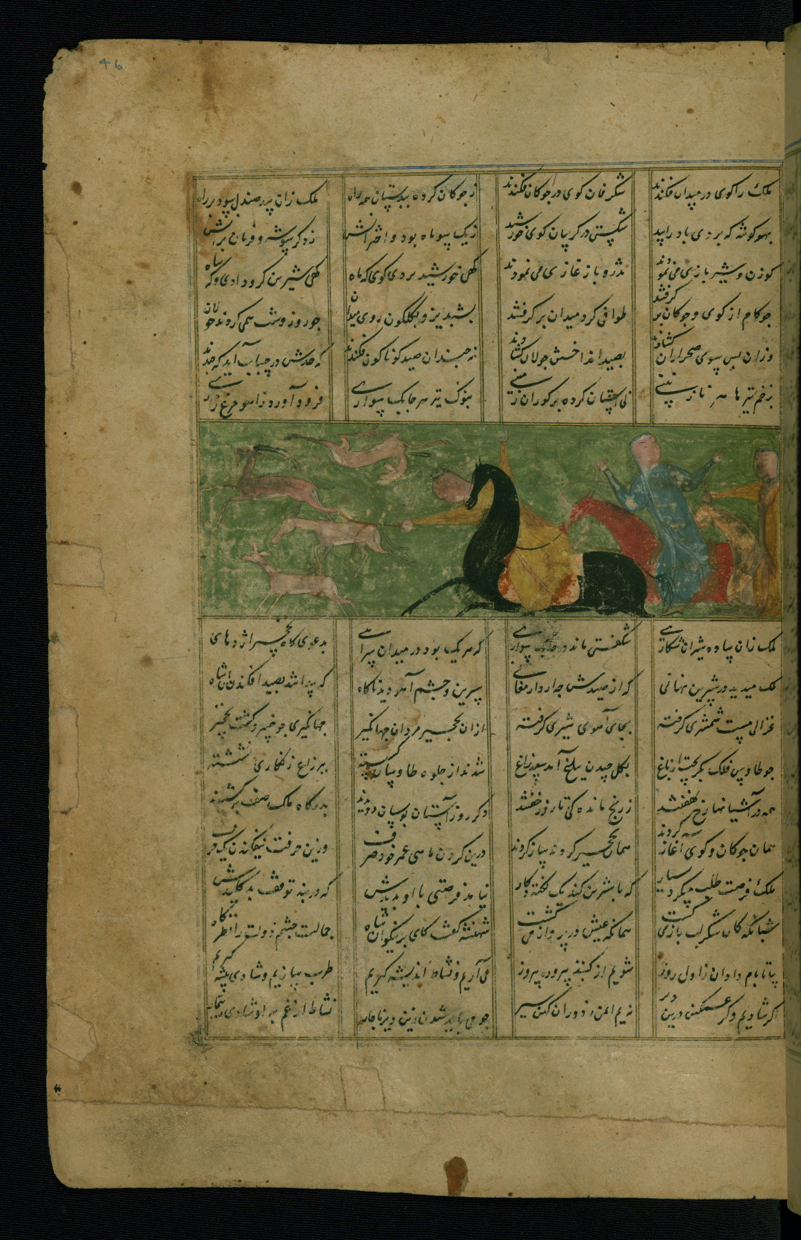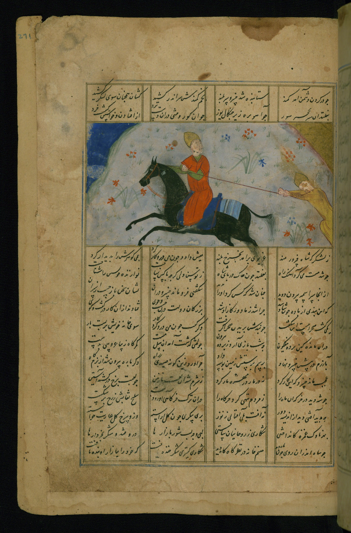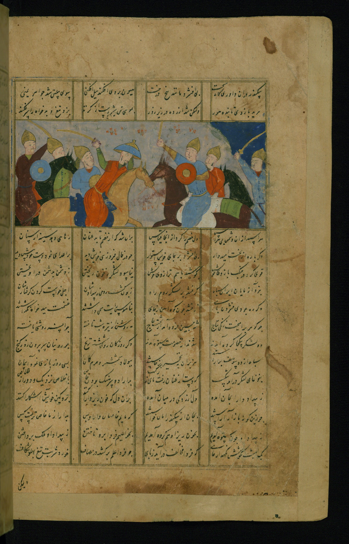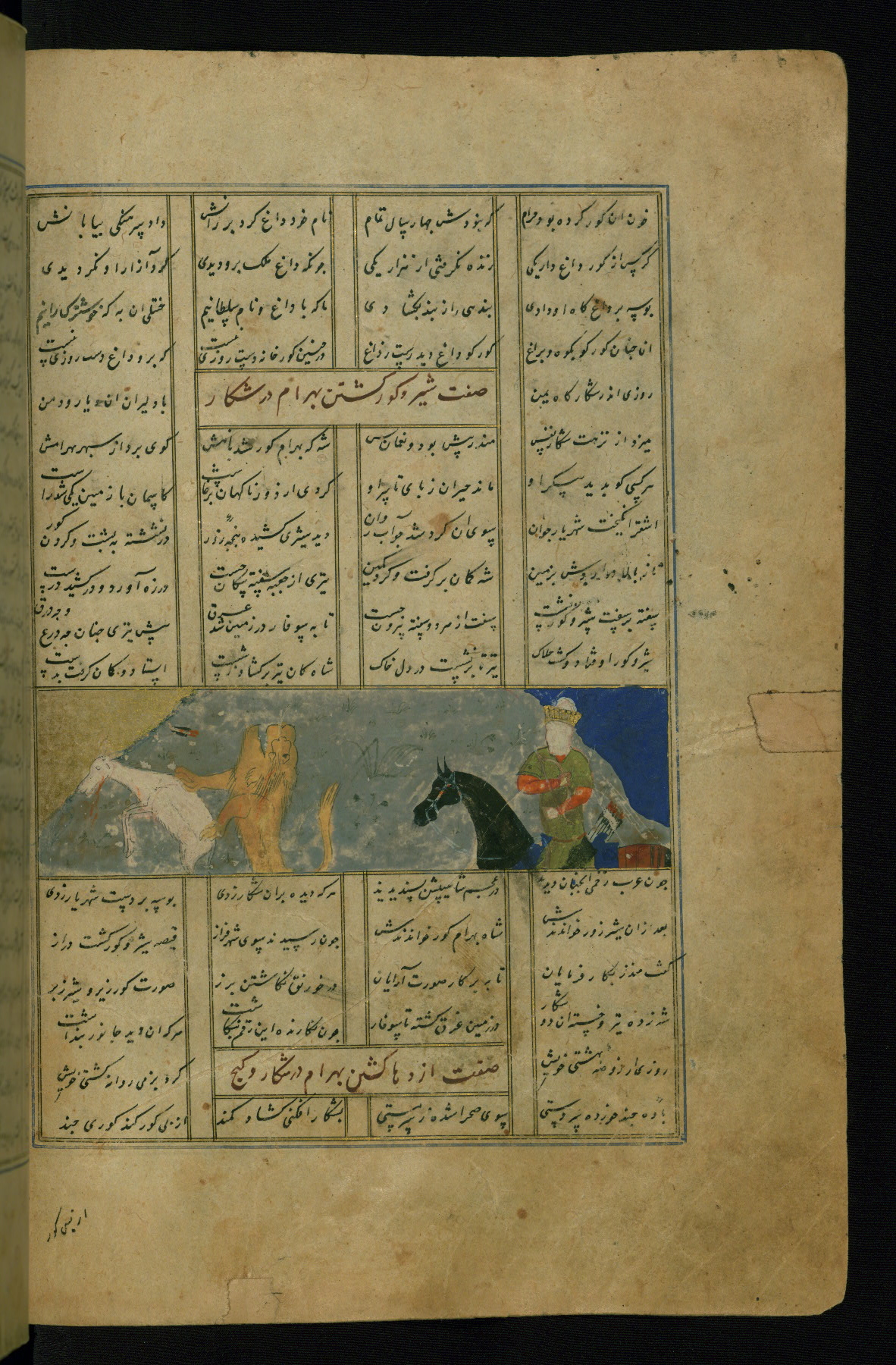 - Text note: Contains the following poems: Makhzan al-asrār (fols. 1b-25b), Khusraw va Shīrīn (fols. 26b-96a), Laylá va Majnūn (fols. 97a-145b), Haft paykar (fols. 146b-201a), and Iskandarnāmah (fols. 202b-323b), with Iqbālnāmah (second part of the Iskandarnāmah) beginning on fol. 281b
