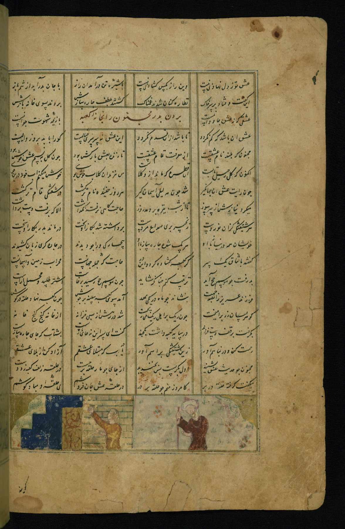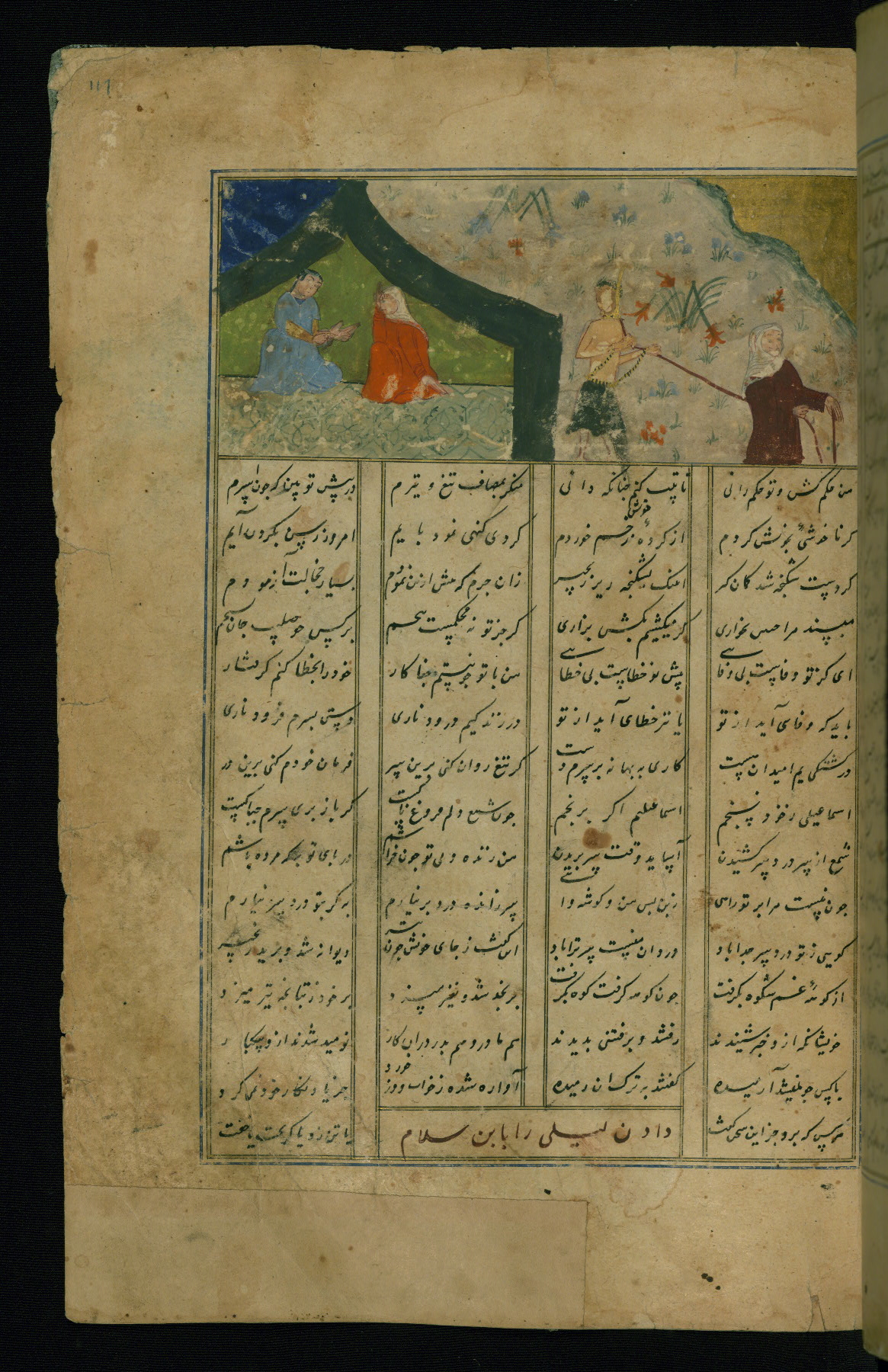 - Title: A widow leads Majnūn in chains before Laylá’s pavilion