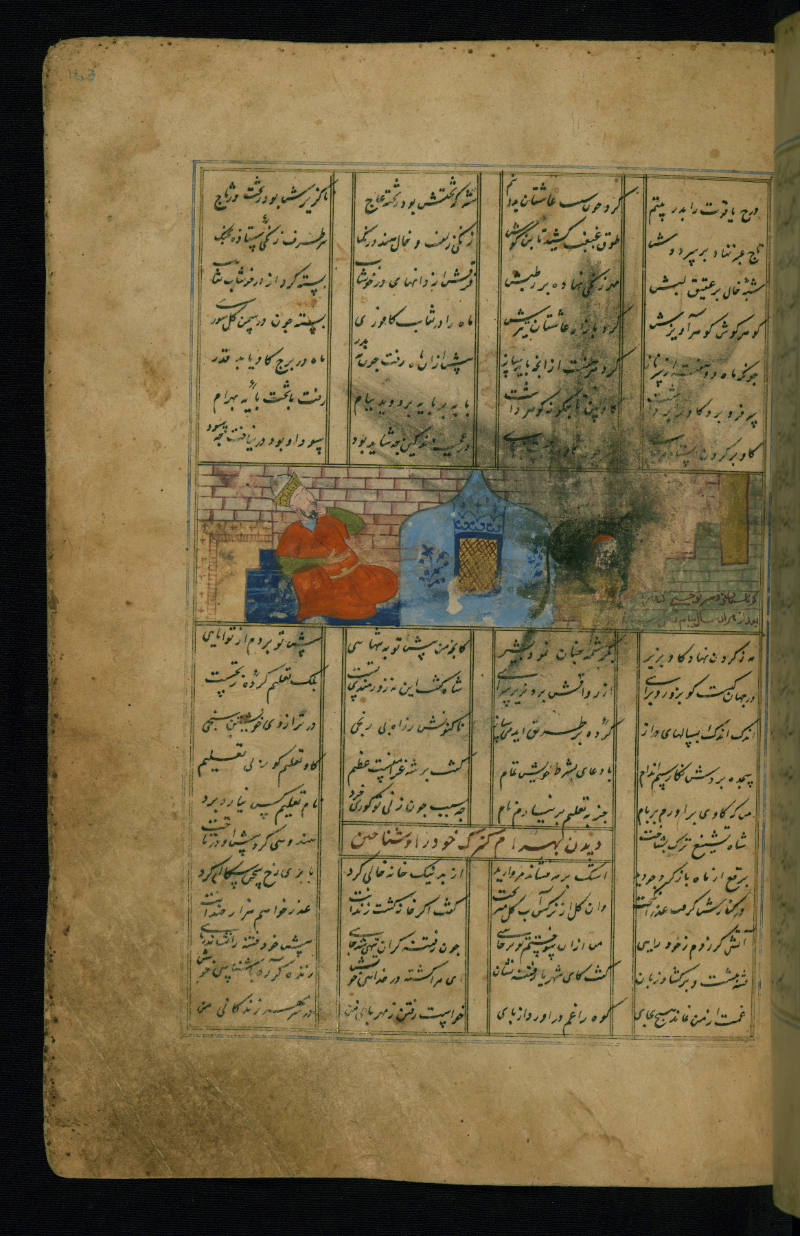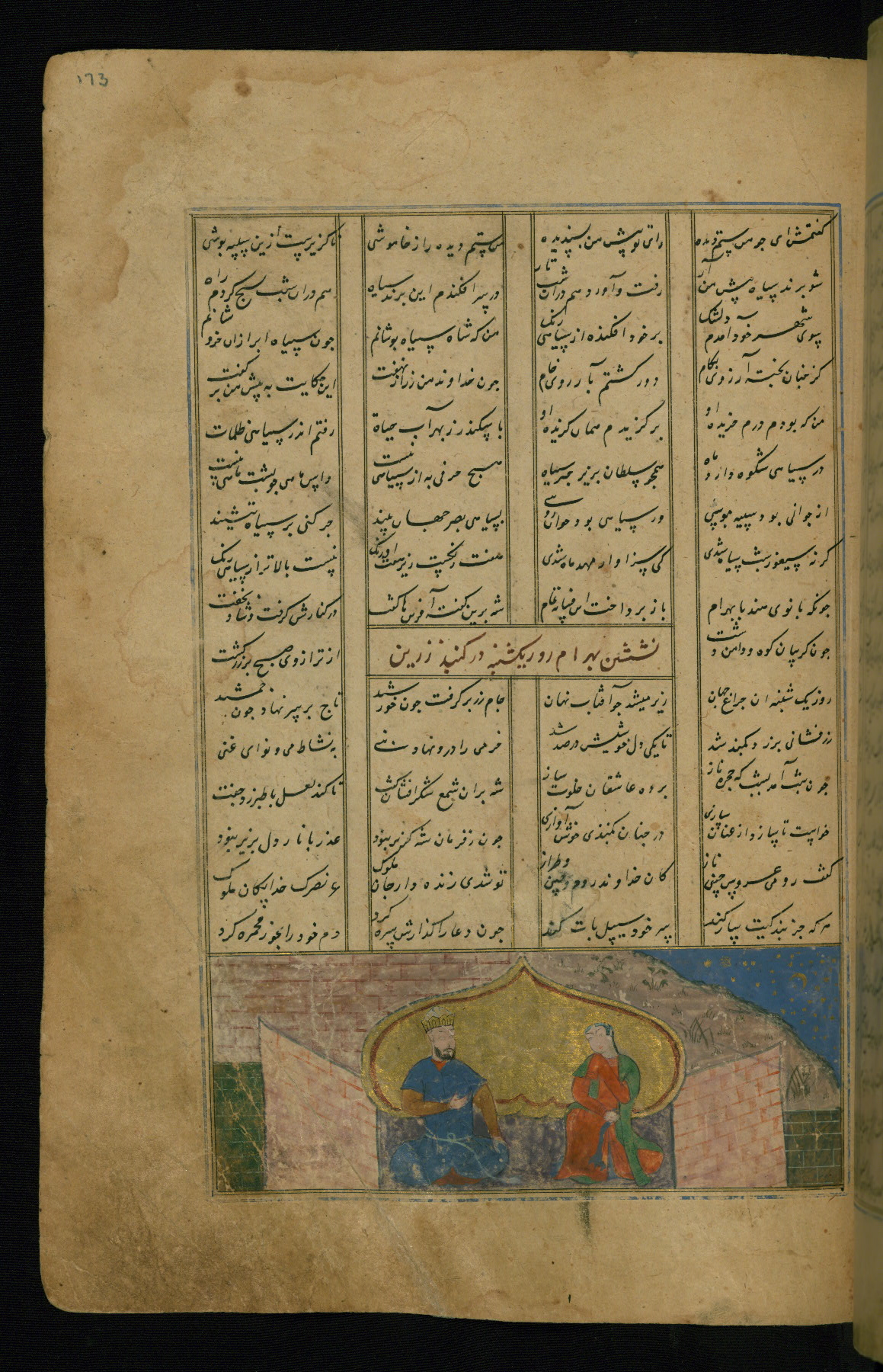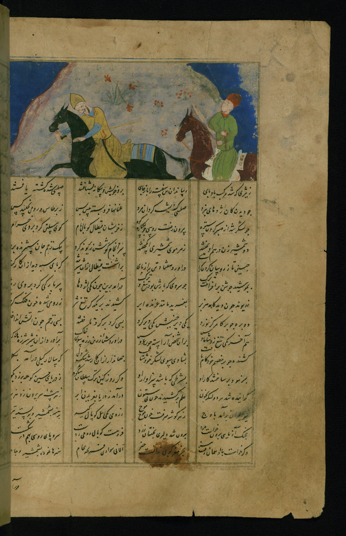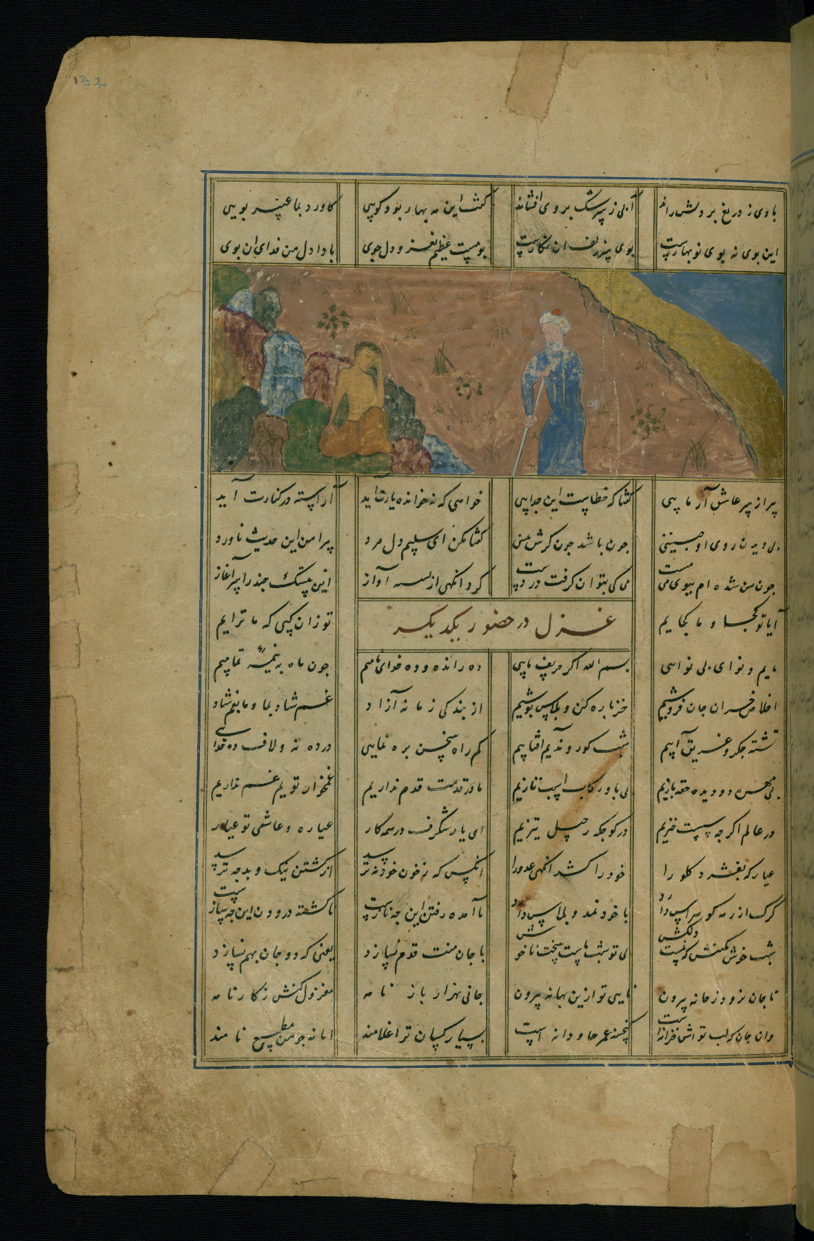 This is an illuminated and illustrated Timurid copy of the Khamsah of Niẓāmī Ganjavī (d. 605 AH / 1209 CE), completed in 886 AH / 1481 CE. The text is written in black nastaʿlīq script with chapter/section headings in red. Illuminated headings written in a foliated New Abbasid (broken cursive) style in white ink on a blue background with polychrome decoration introduce the poems of the Khamsah (fols. 26b, 97a, 146b, and 202b). (The beginning of Makhzan al-asrār is now missing). There are sixty illustrations. The reddish brown leather binding dates to the thirteenth century AH / nineteenth CE.