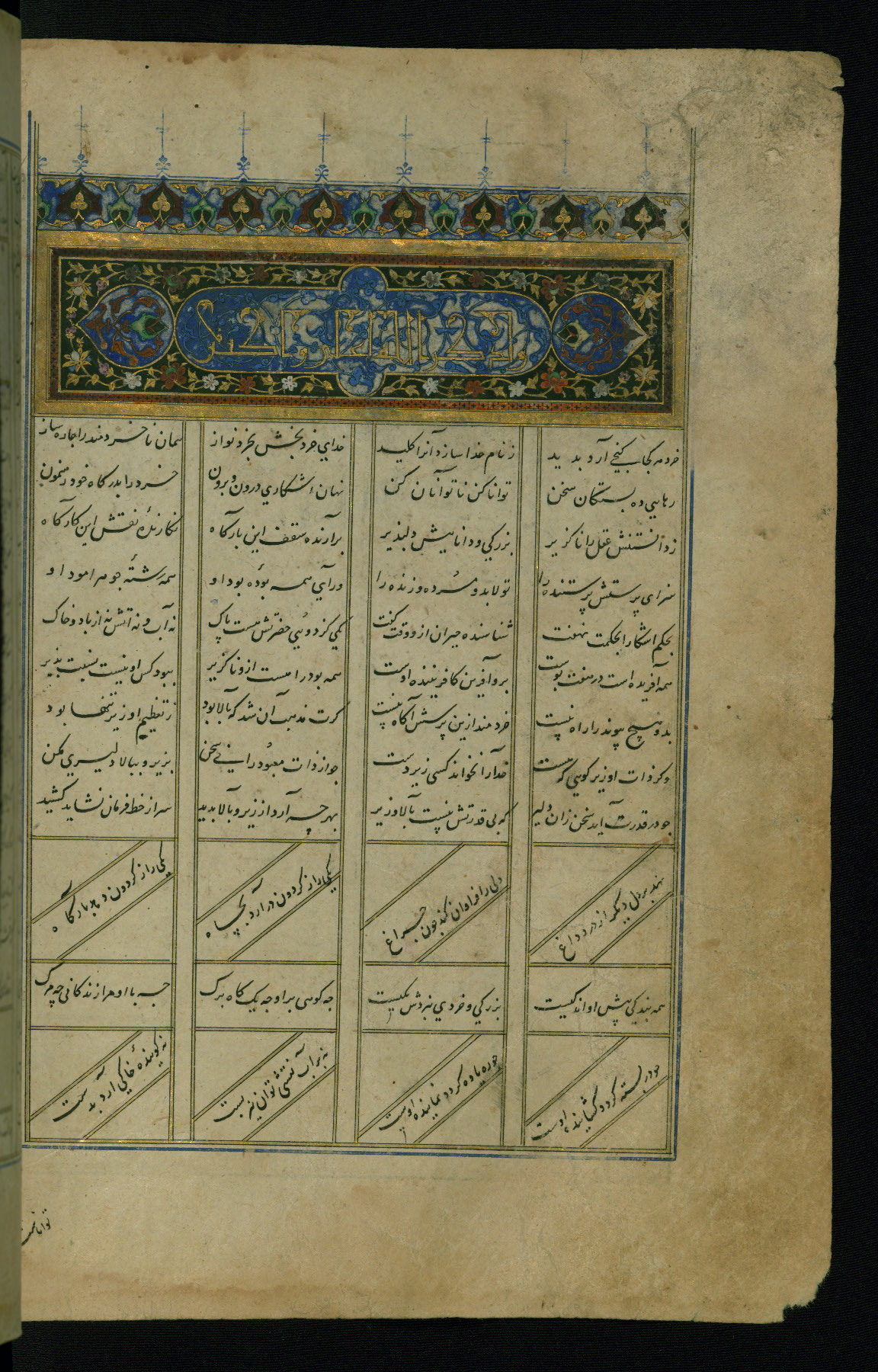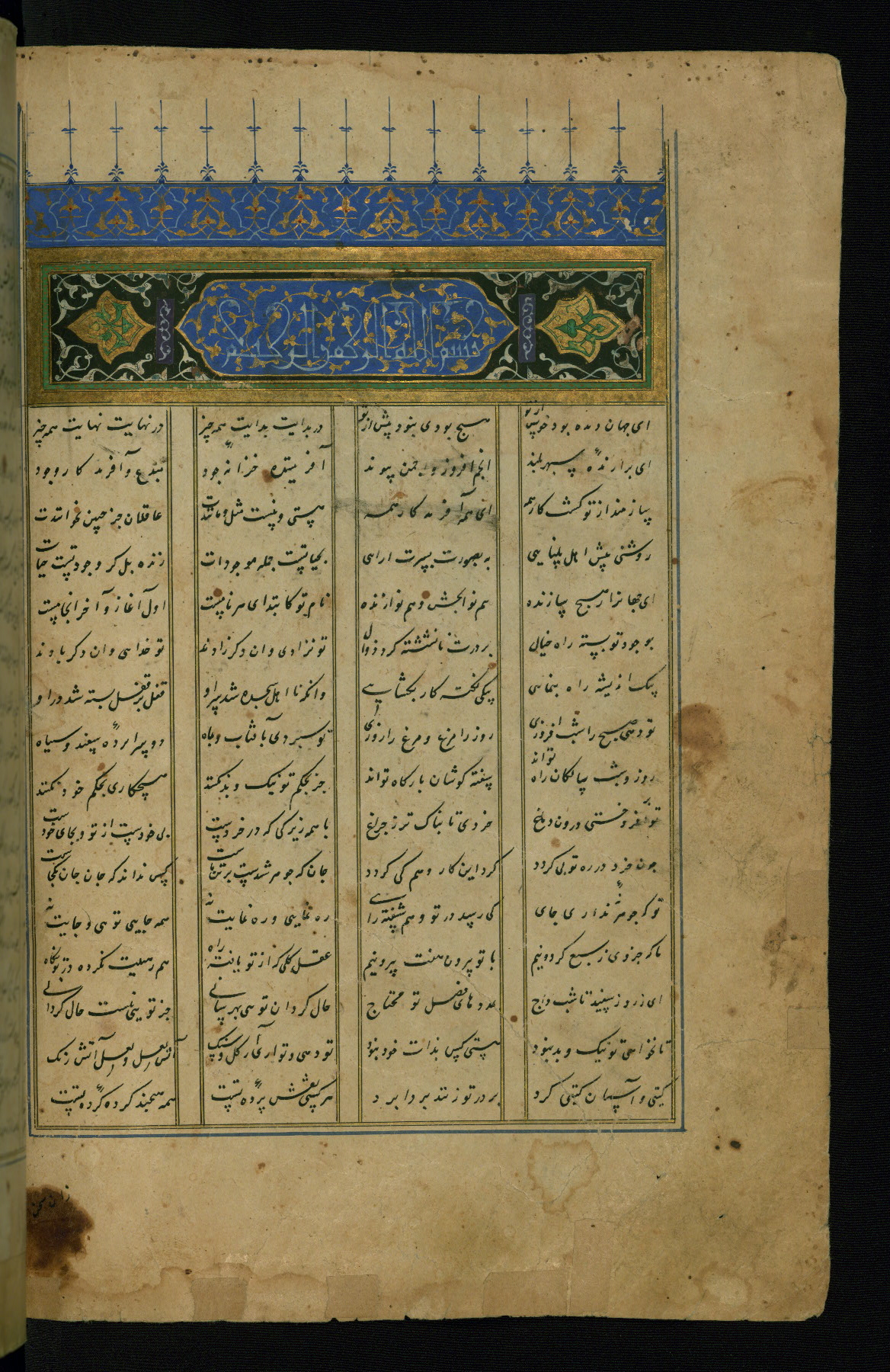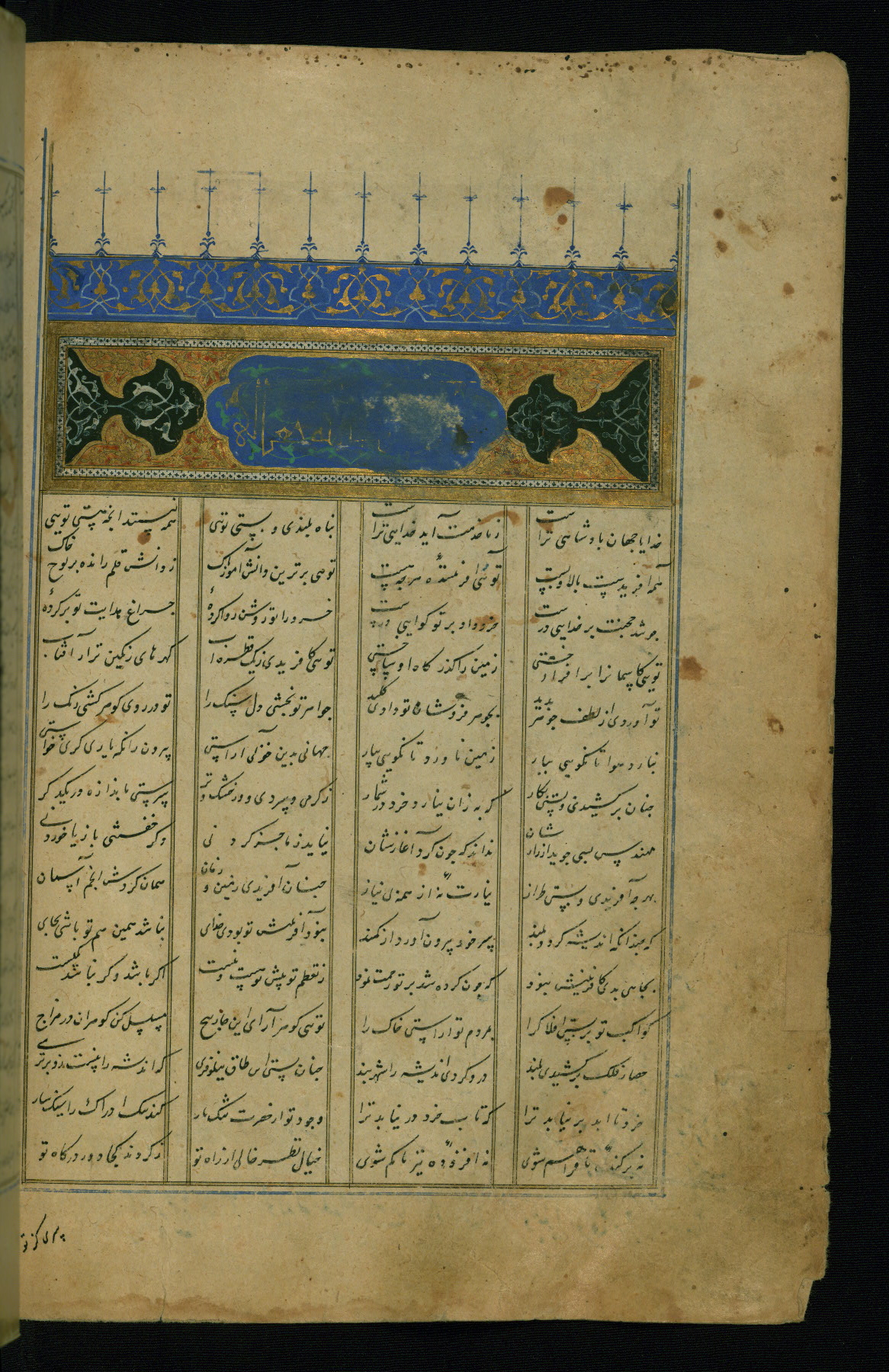 - Label: This illuminated incipit page introduces the fourth poem of the Khamsah, Haft paykar, and has a headpiece inscribed with the doxological formula (basmalah) in a foliated New Abbasid (broken cursive) style.