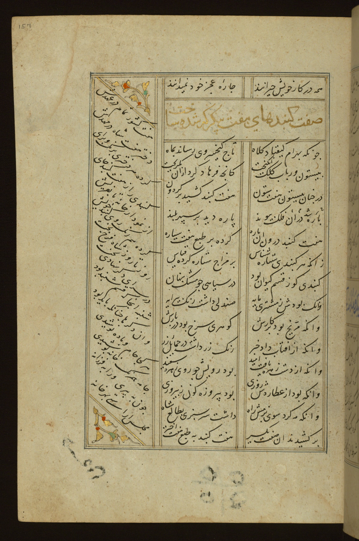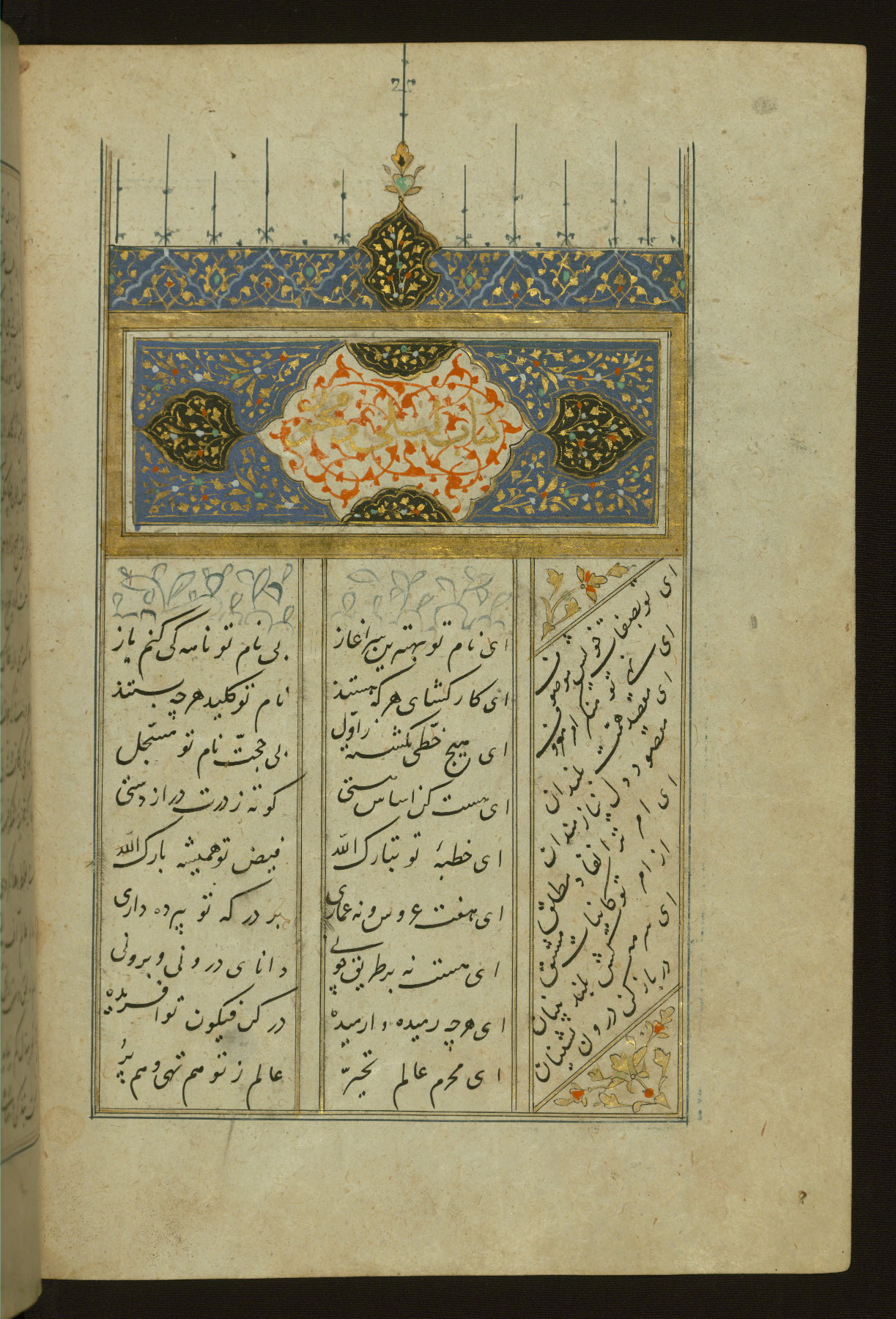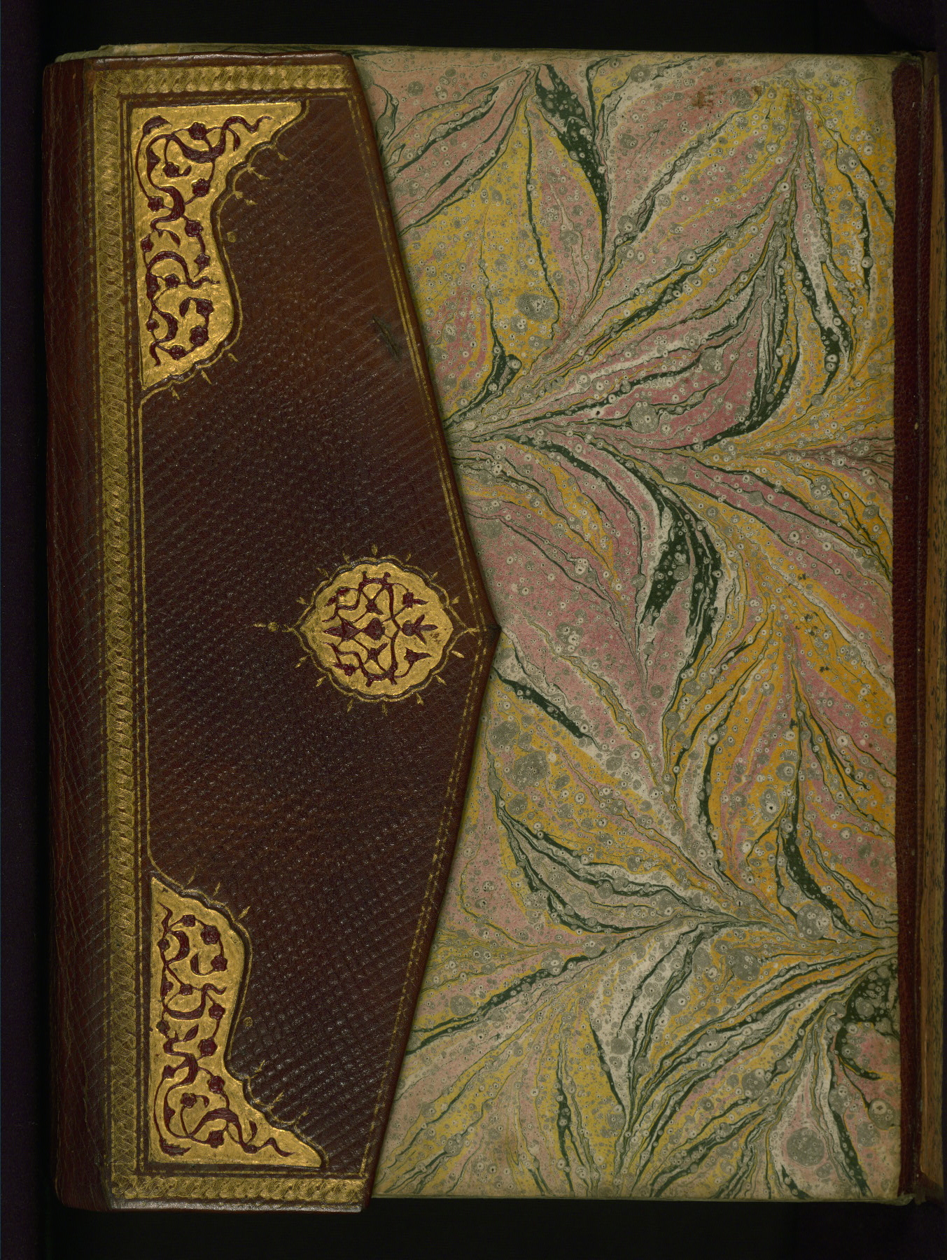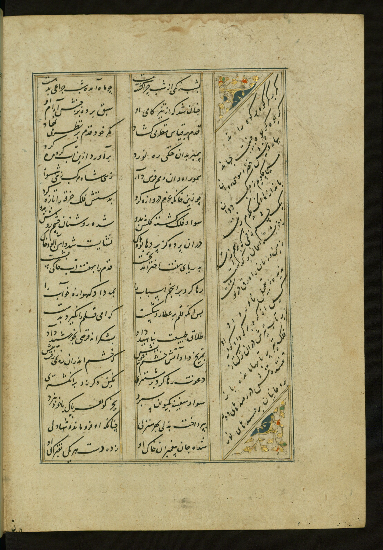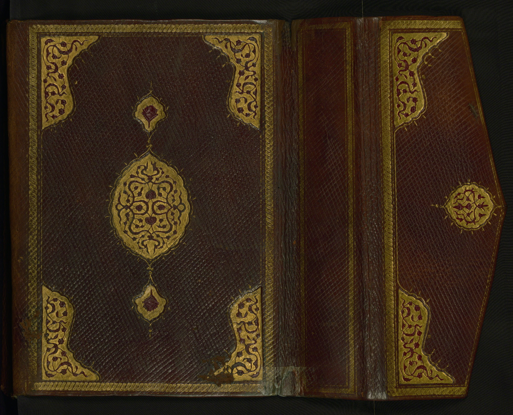 This copy of the Khamsah (quintet) of Niẓāmī Ganjavī (d. 605 AH / 1209 CE) was written by Abū Bakr Shāh ibn Ḥasan ibn ʿAlī al-Shahrastānī and illuminated by Jamāl al-Dīn ibn Muḥammad al-Ṣiddīqī al-Iṣfahānī between 892 AH / 1486 CE and 900 AH / 1494-5 CE. The manuscript opens with a double-page illuminated frontispiece with an inscription giving the title of the work and the name of the author (fols. 1b-2a). There are four illuminated titlepieces with the names of the individual poems and twenty-six repainted illustrations. According to evidence supplied by the colophons, the original binding was by the hand of Jamāl al-Dīn ibn Muḥammad al-Ṣiddīqī al-Iṣfahānī, as well. Unfortunately, it has not survived. The binding presently attached to the manuscript dates to the twelfth century AH / eighteenth CE.