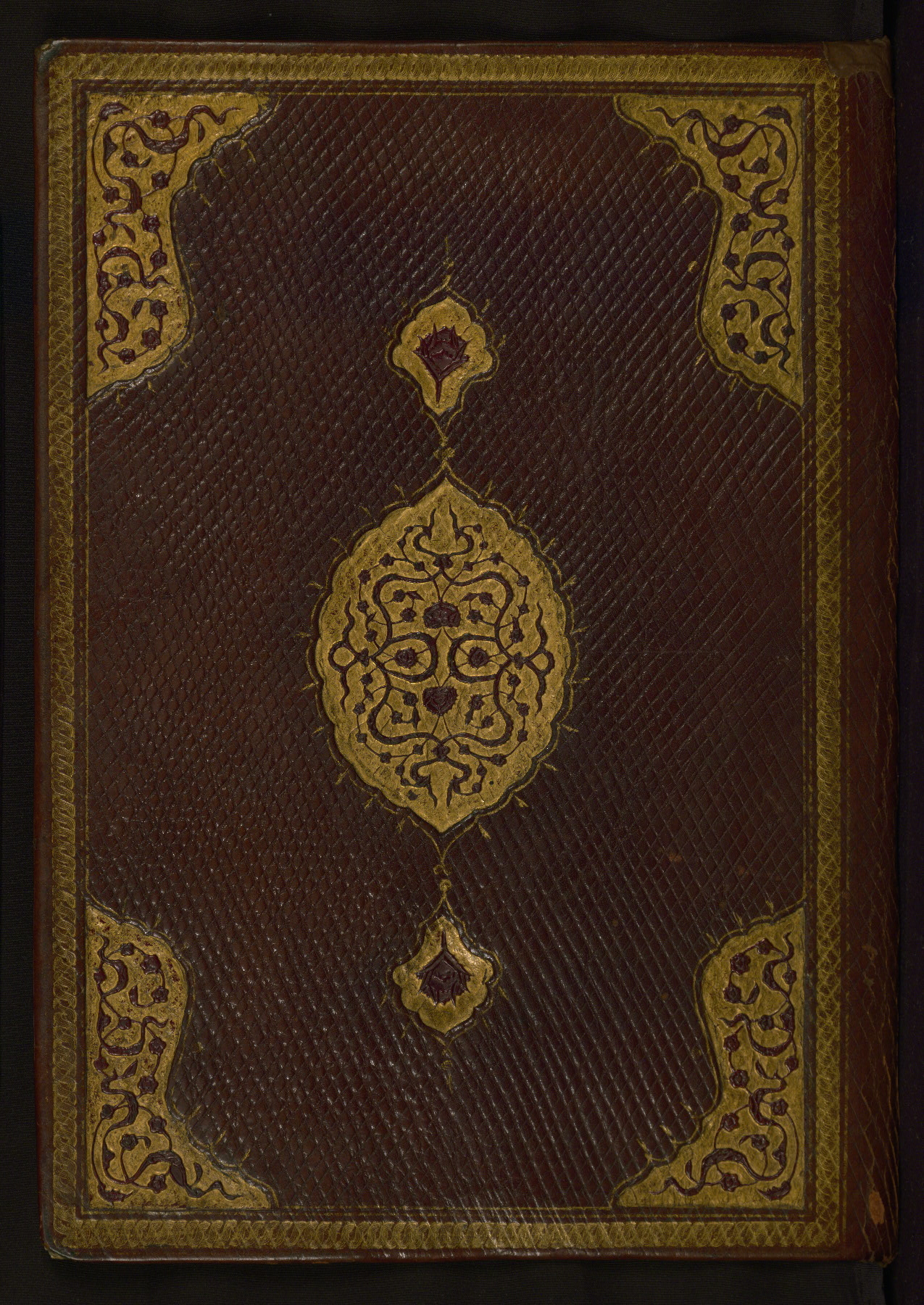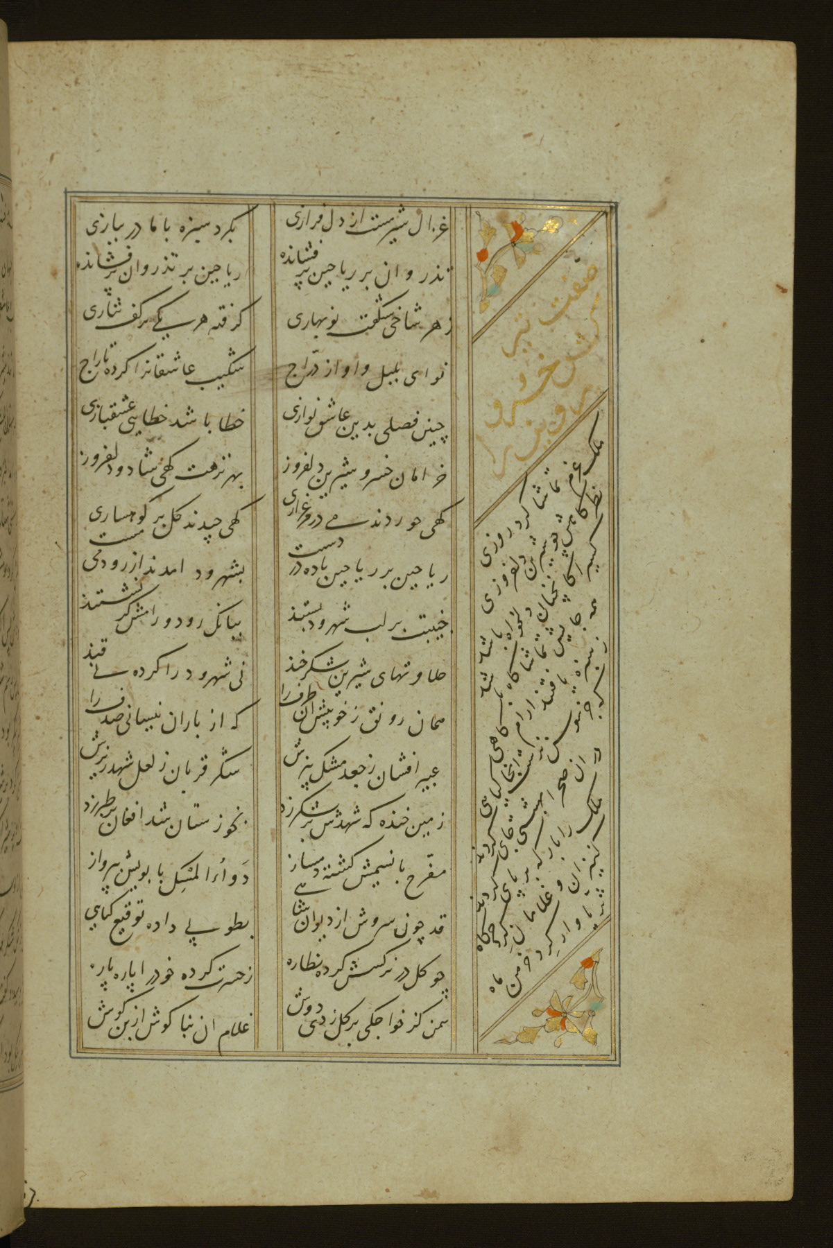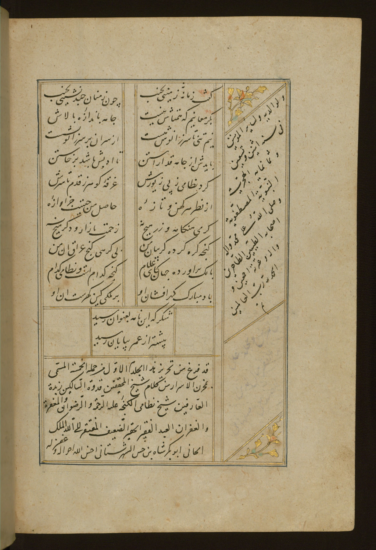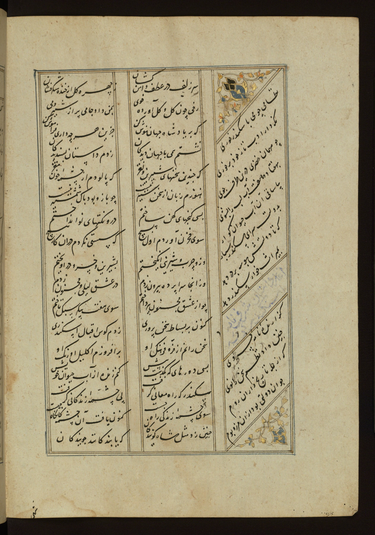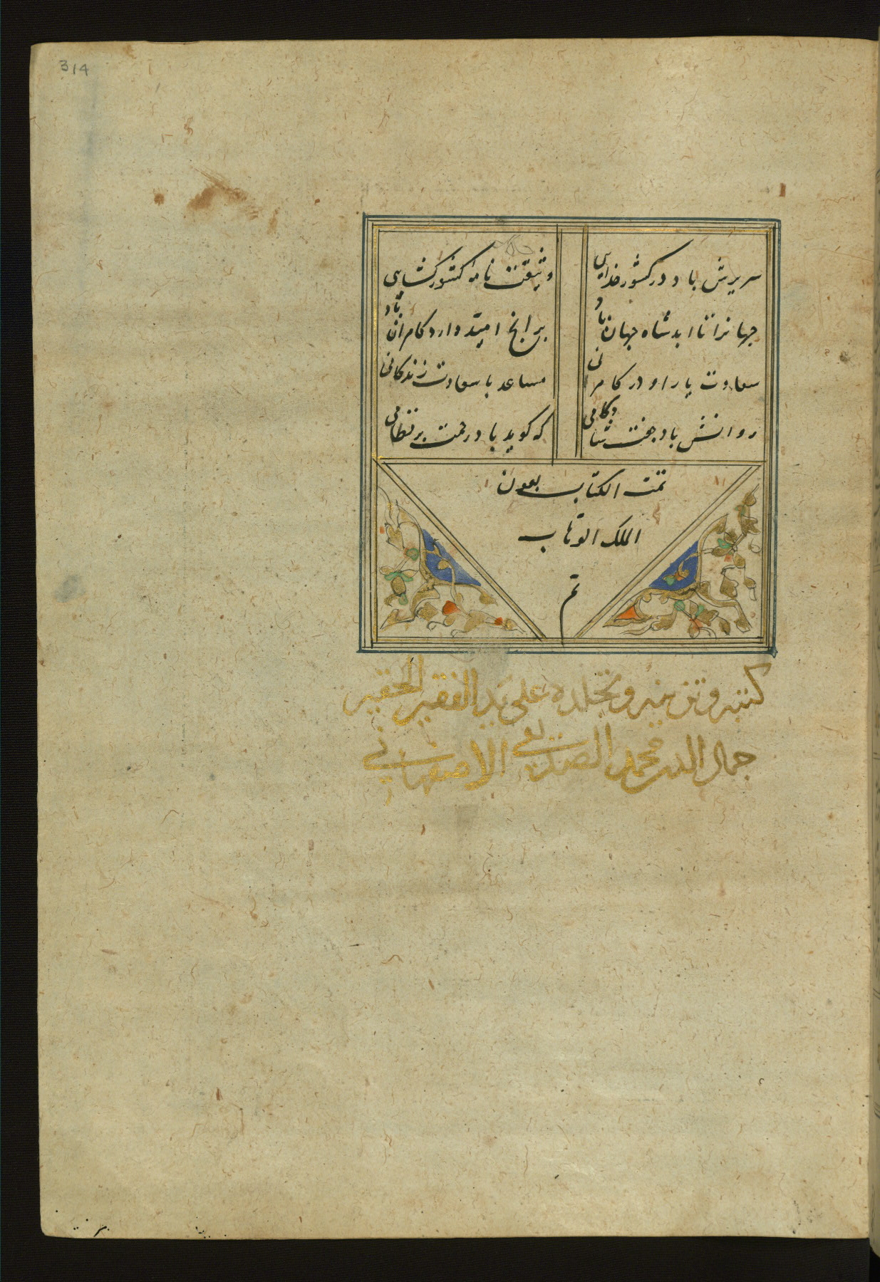 This copy of the Khamsah (quintet) of Niẓāmī Ganjavī (d. 605 AH / 1209 CE) was written by Abū Bakr Shāh ibn Ḥasan ibn ʿAlī al-Shahrastānī and illuminated by Jamāl al-Dīn ibn Muḥammad al-Ṣiddīqī al-Iṣfahānī between 892 AH / 1486 CE and 900 AH / 1494-5 CE. The manuscript opens with a double-page illuminated frontispiece with an inscription giving the title of the work and the name of the author (fols. 1b-2a). There are four illuminated titlepieces with the names of the individual poems and twenty-six repainted illustrations. According to evidence supplied by the colophons, the original binding was by the hand of Jamāl al-Dīn ibn Muḥammad al-Ṣiddīqī al-Iṣfahānī, as well. Unfortunately, it has not survived. The binding presently attached to the manuscript dates to the twelfth century AH / eighteenth CE.