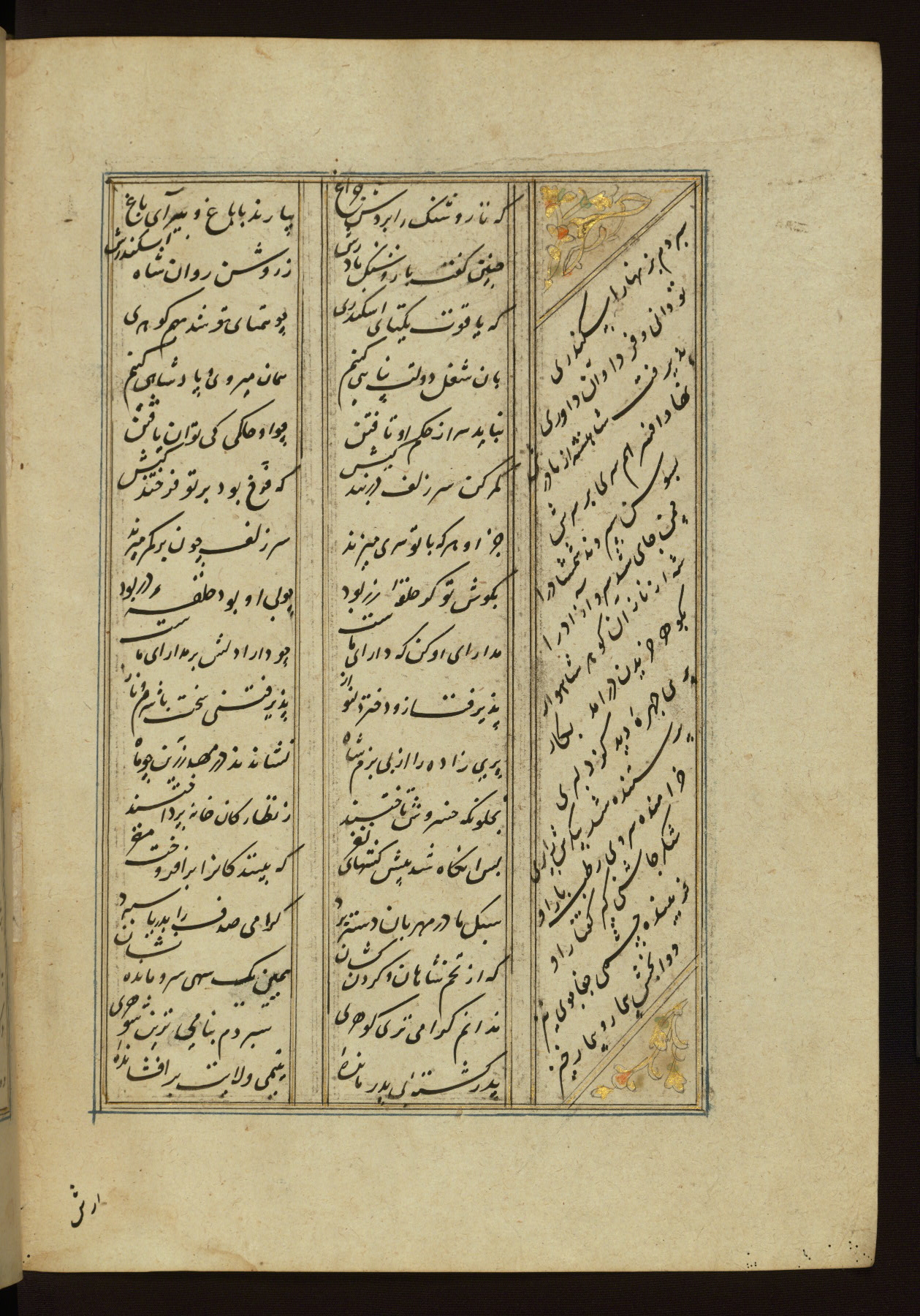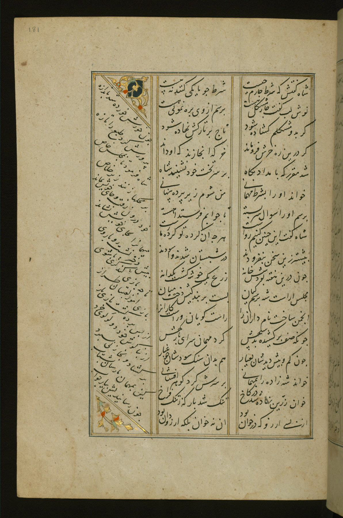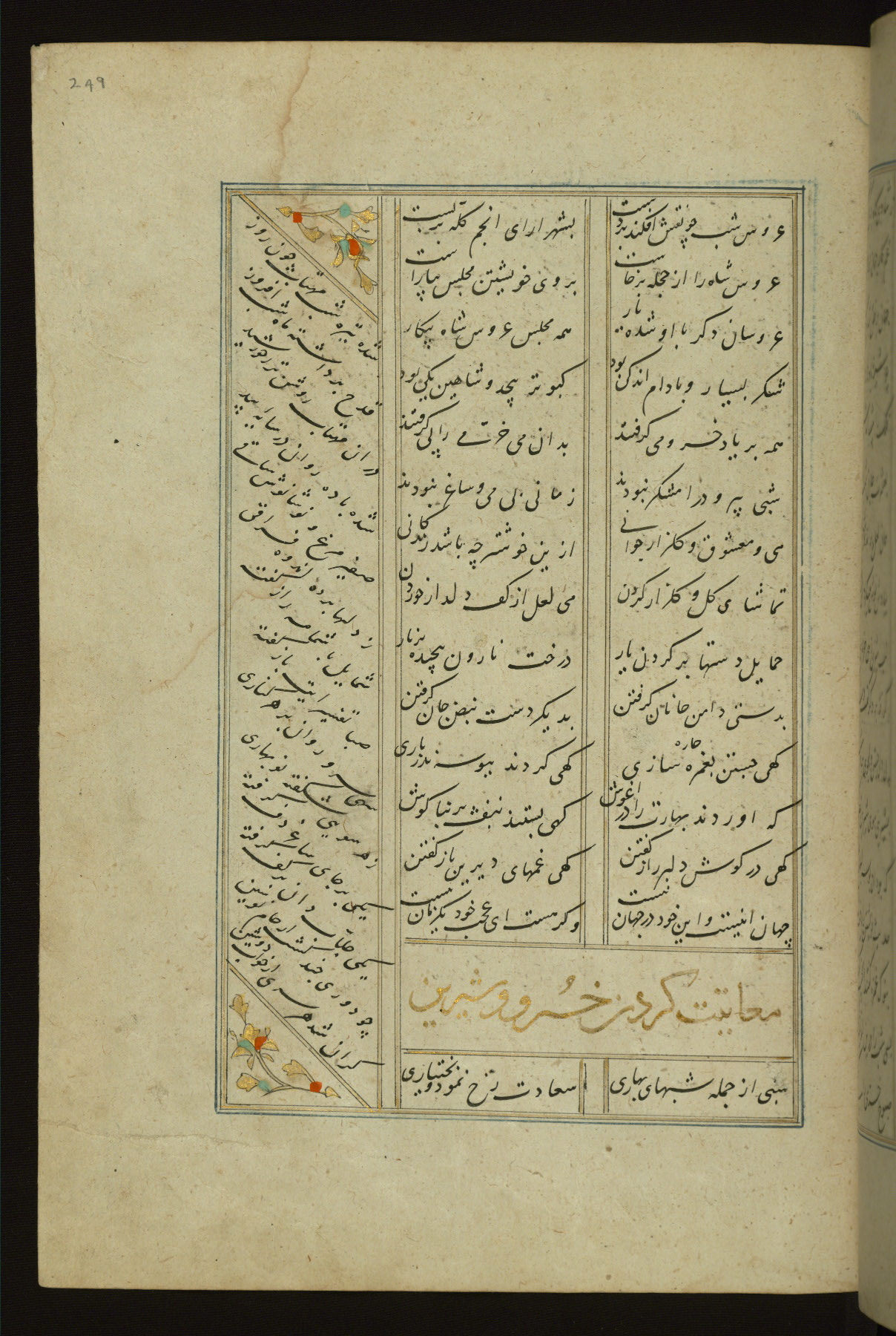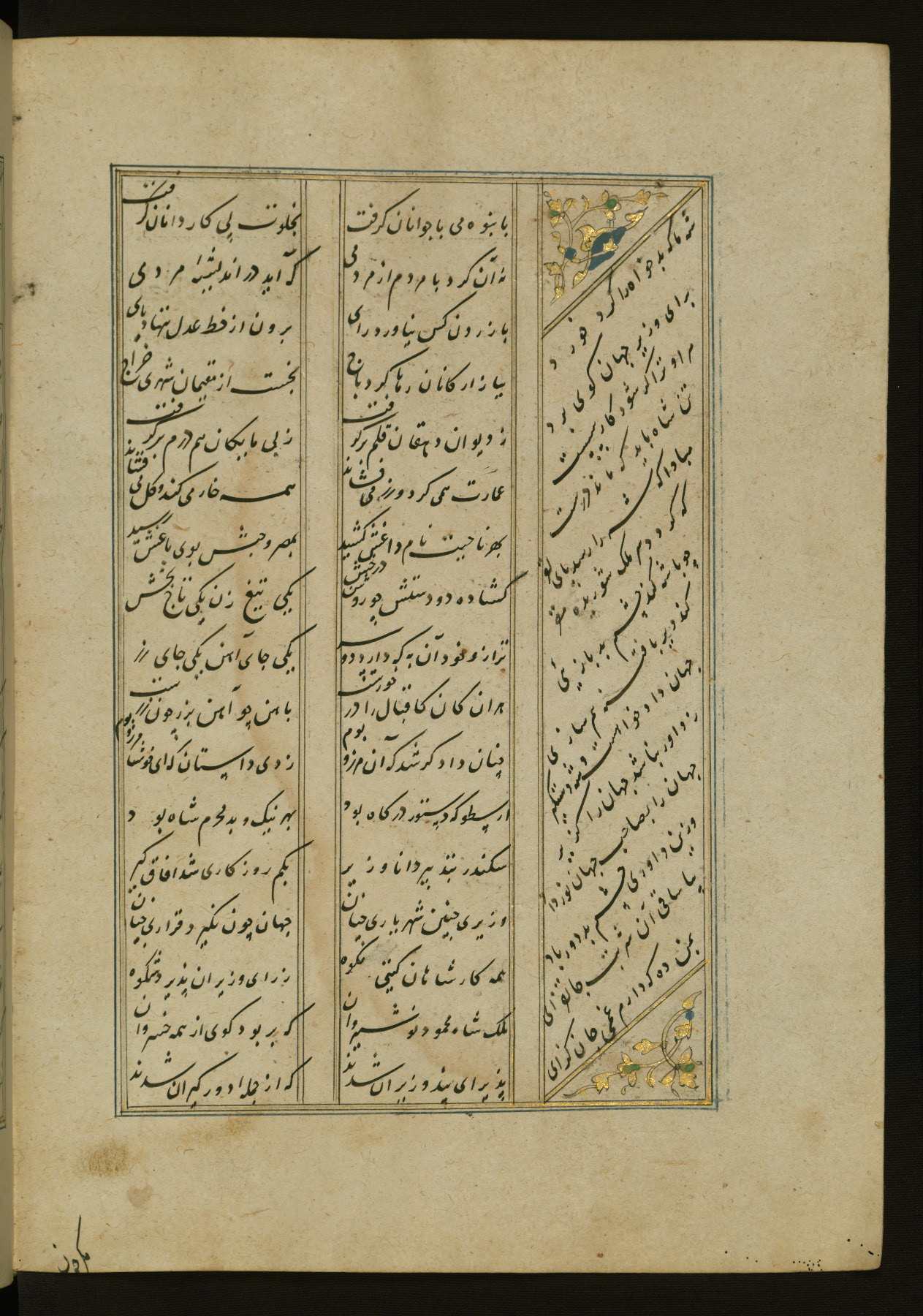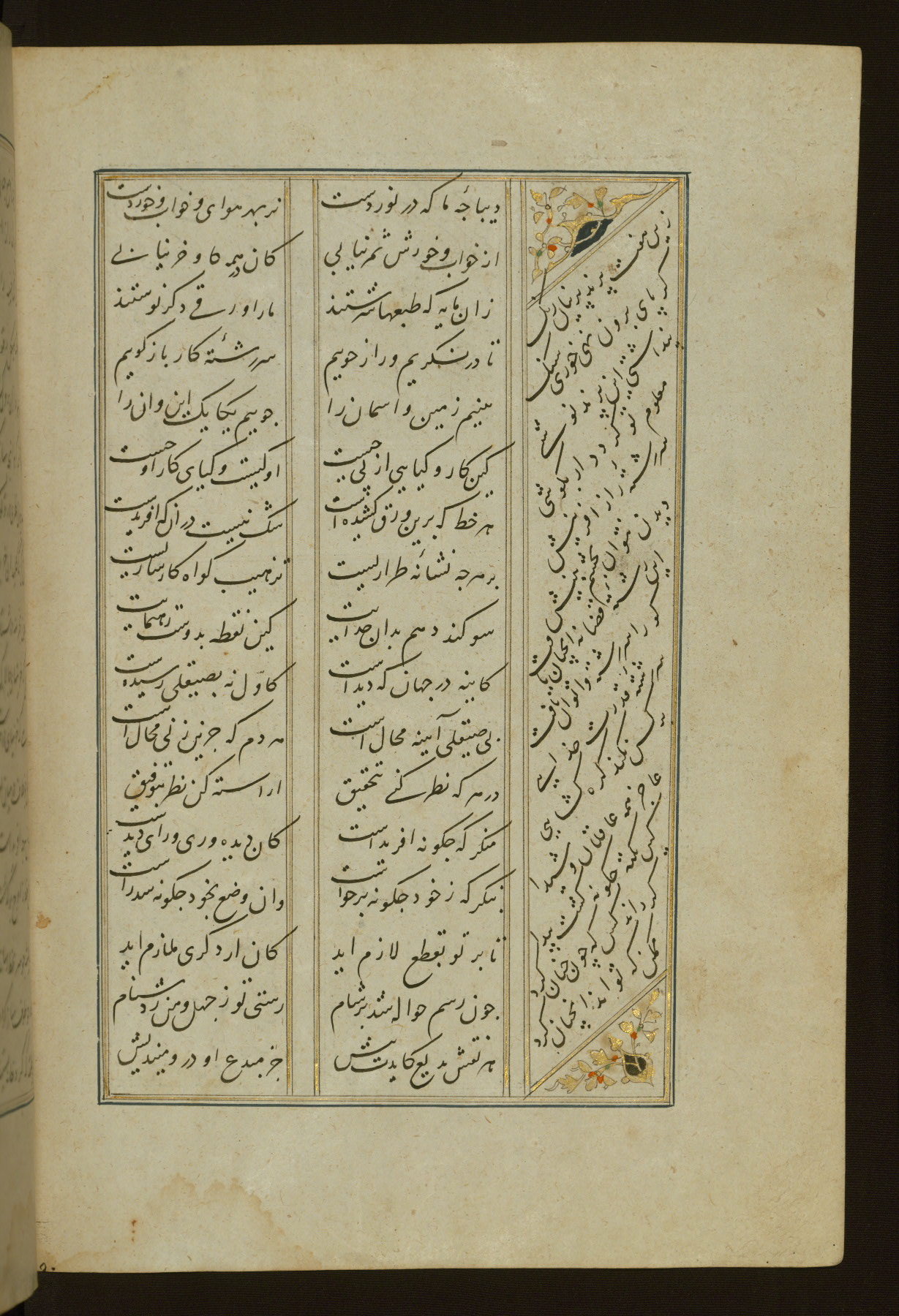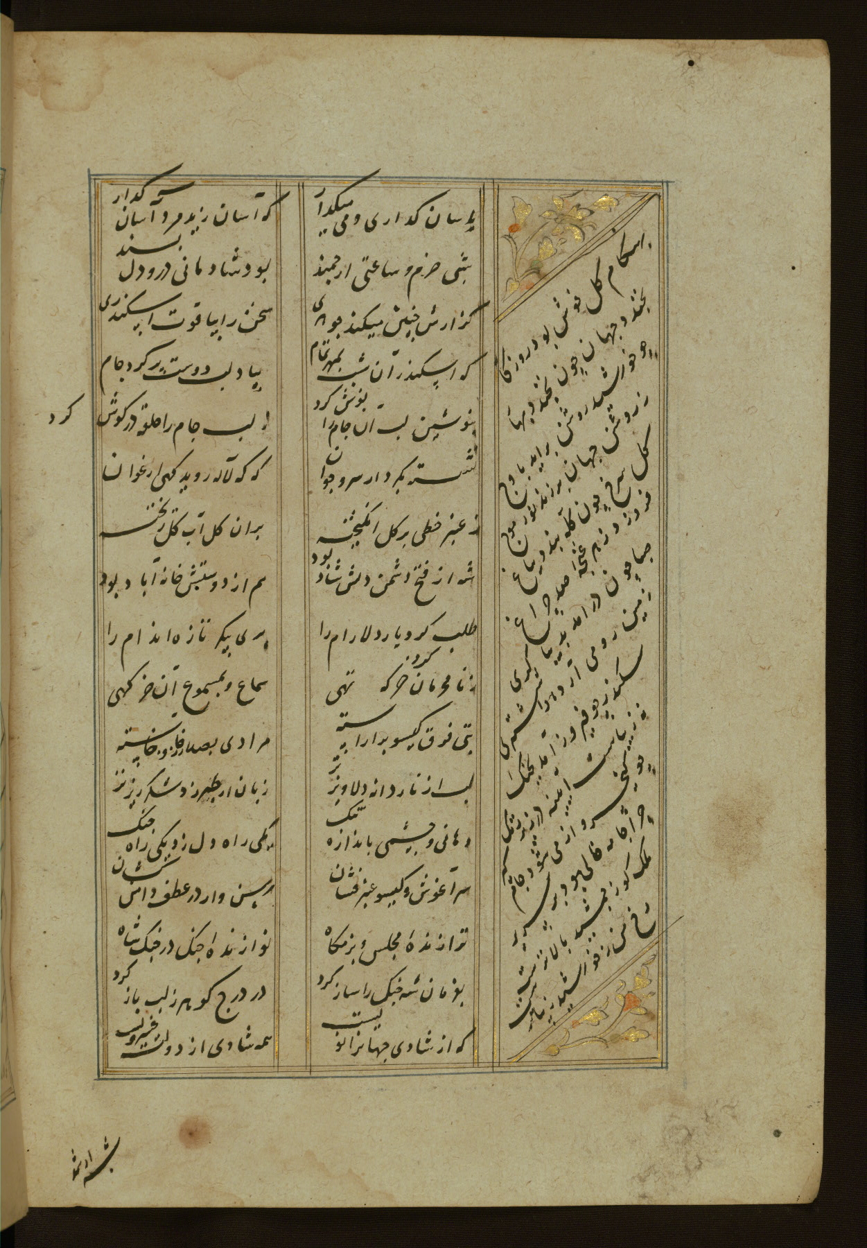 This copy of the Khamsah (quintet) of Niẓāmī Ganjavī (d. 605 AH / 1209 CE) was written by Abū Bakr Shāh ibn Ḥasan ibn ʿAlī al-Shahrastānī and illuminated by Jamāl al-Dīn ibn Muḥammad al-Ṣiddīqī al-Iṣfahānī between 892 AH / 1486 CE and 900 AH / 1494-5 CE. The manuscript opens with a double-page illuminated frontispiece with an inscription giving the title of the work and the name of the author (fols. 1b-2a). There are four illuminated titlepieces with the names of the individual poems and twenty-six repainted illustrations. According to evidence supplied by the colophons, the original binding was by the hand of Jamāl al-Dīn ibn Muḥammad al-Ṣiddīqī al-Iṣfahānī, as well. Unfortunately, it has not survived. The binding presently attached to the manuscript dates to the twelfth century AH / eighteenth CE.
