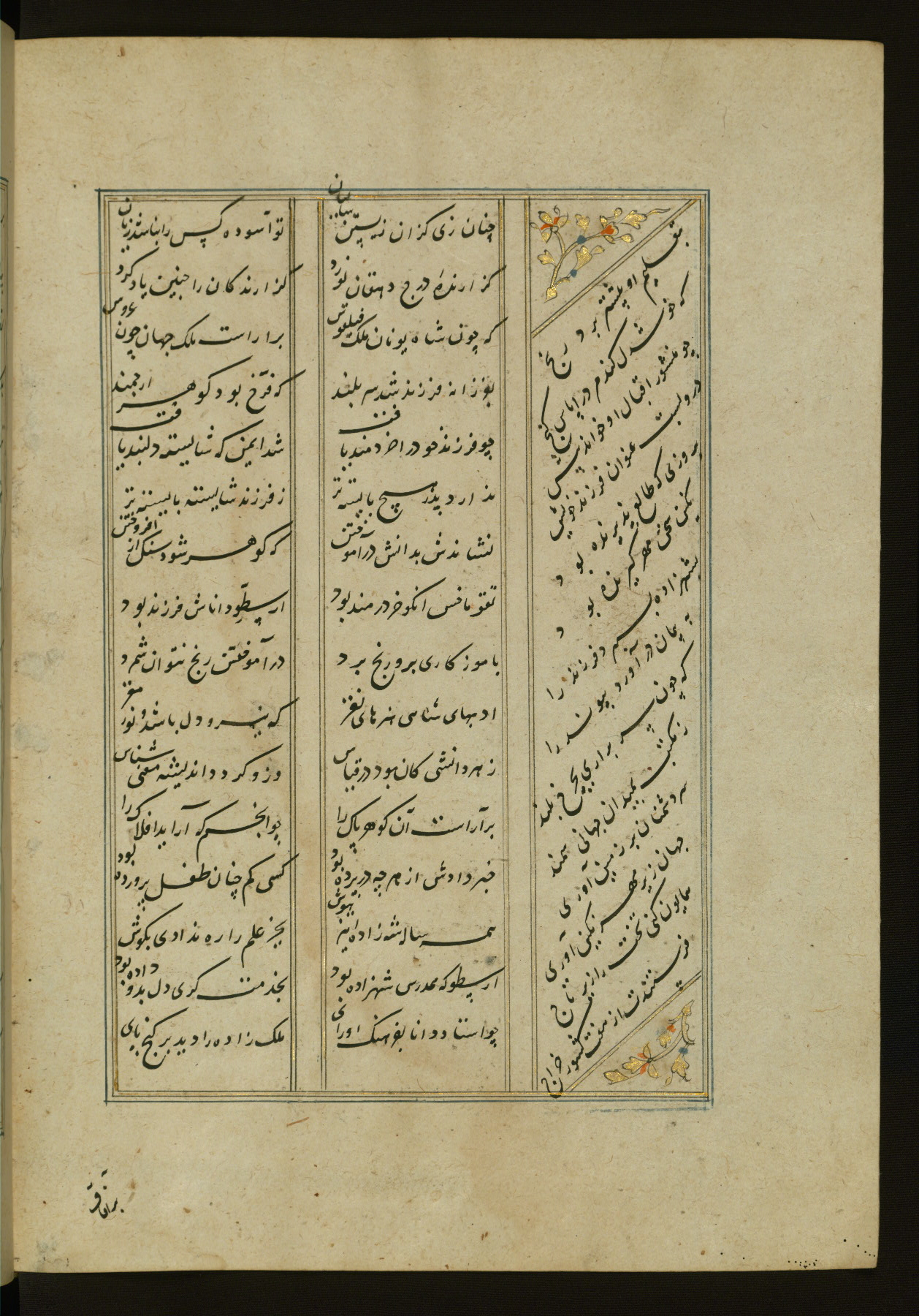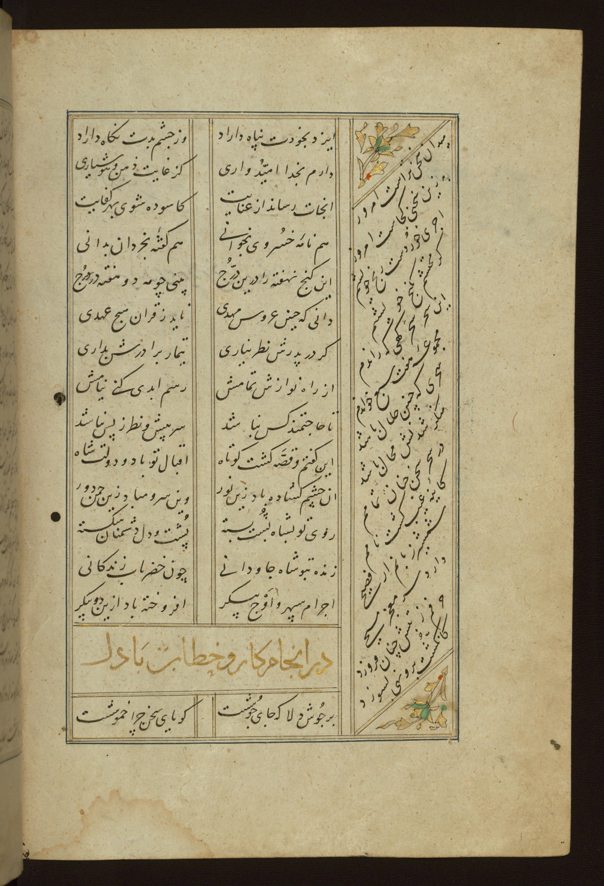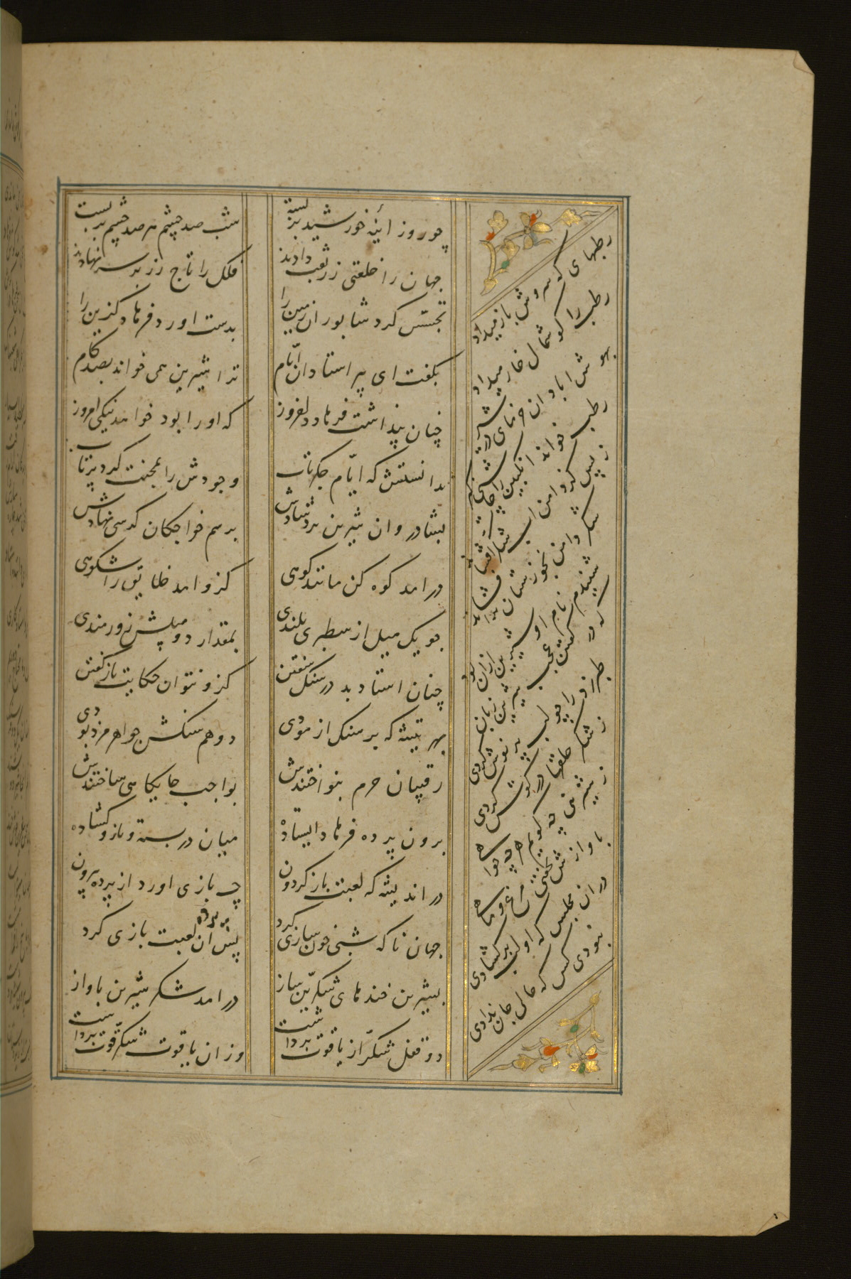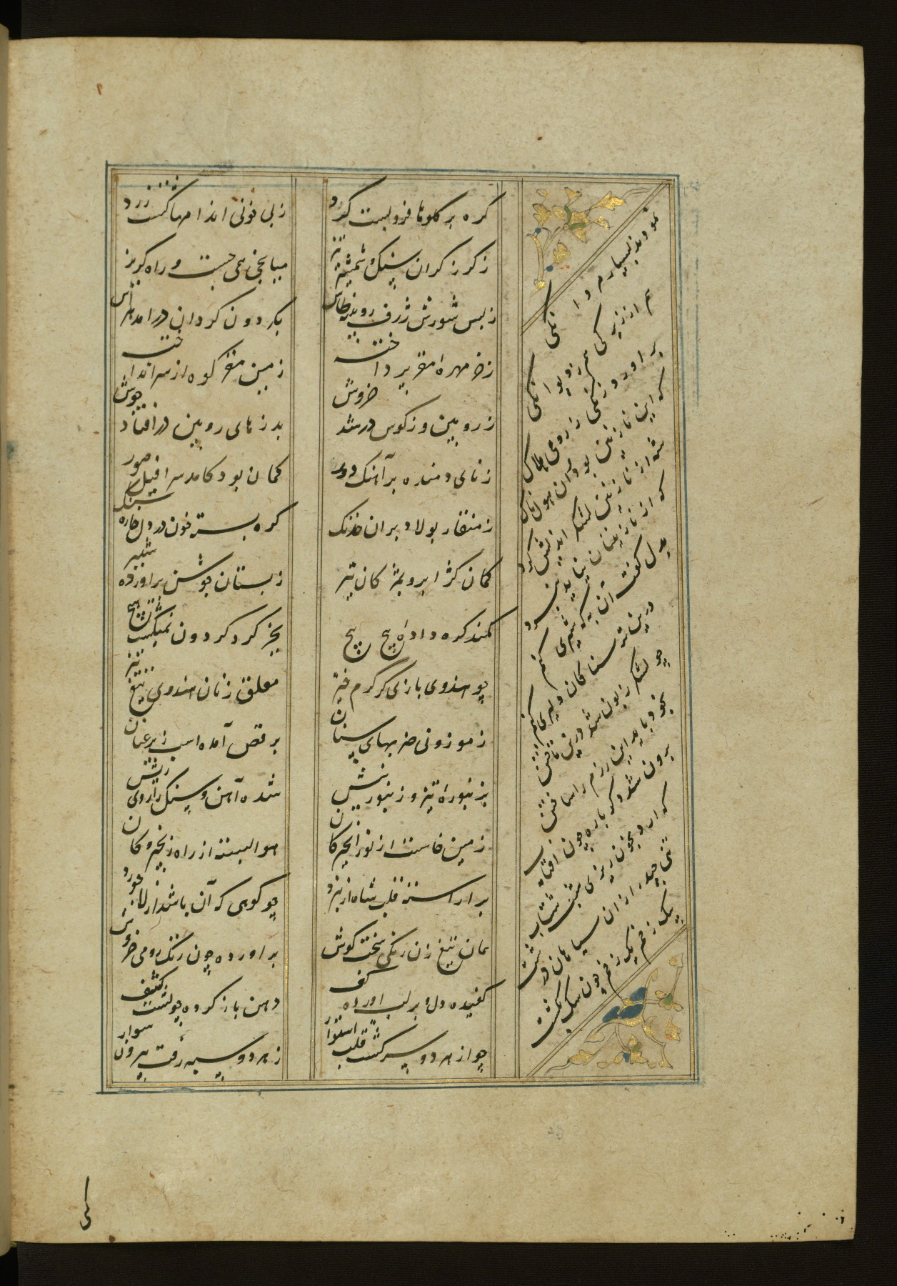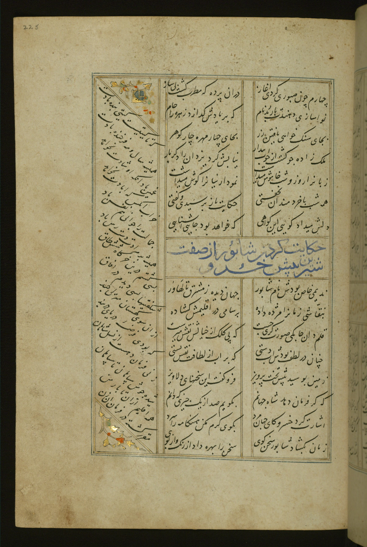 This copy of the Khamsah (quintet) of Niẓāmī Ganjavī (d. 605 AH / 1209 CE) was written by Abū Bakr Shāh ibn Ḥasan ibn ʿAlī al-Shahrastānī and illuminated by Jamāl al-Dīn ibn Muḥammad al-Ṣiddīqī al-Iṣfahānī between 892 AH / 1486 CE and 900 AH / 1494-5 CE. The manuscript opens with a double-page illuminated frontispiece with an inscription giving the title of the work and the name of the author (fols. 1b-2a). There are four illuminated titlepieces with the names of the individual poems and twenty-six repainted illustrations. According to evidence supplied by the colophons, the original binding was by the hand of Jamāl al-Dīn ibn Muḥammad al-Ṣiddīqī al-Iṣfahānī, as well. Unfortunately, it has not survived. The binding presently attached to the manuscript dates to the twelfth century AH / eighteenth CE.