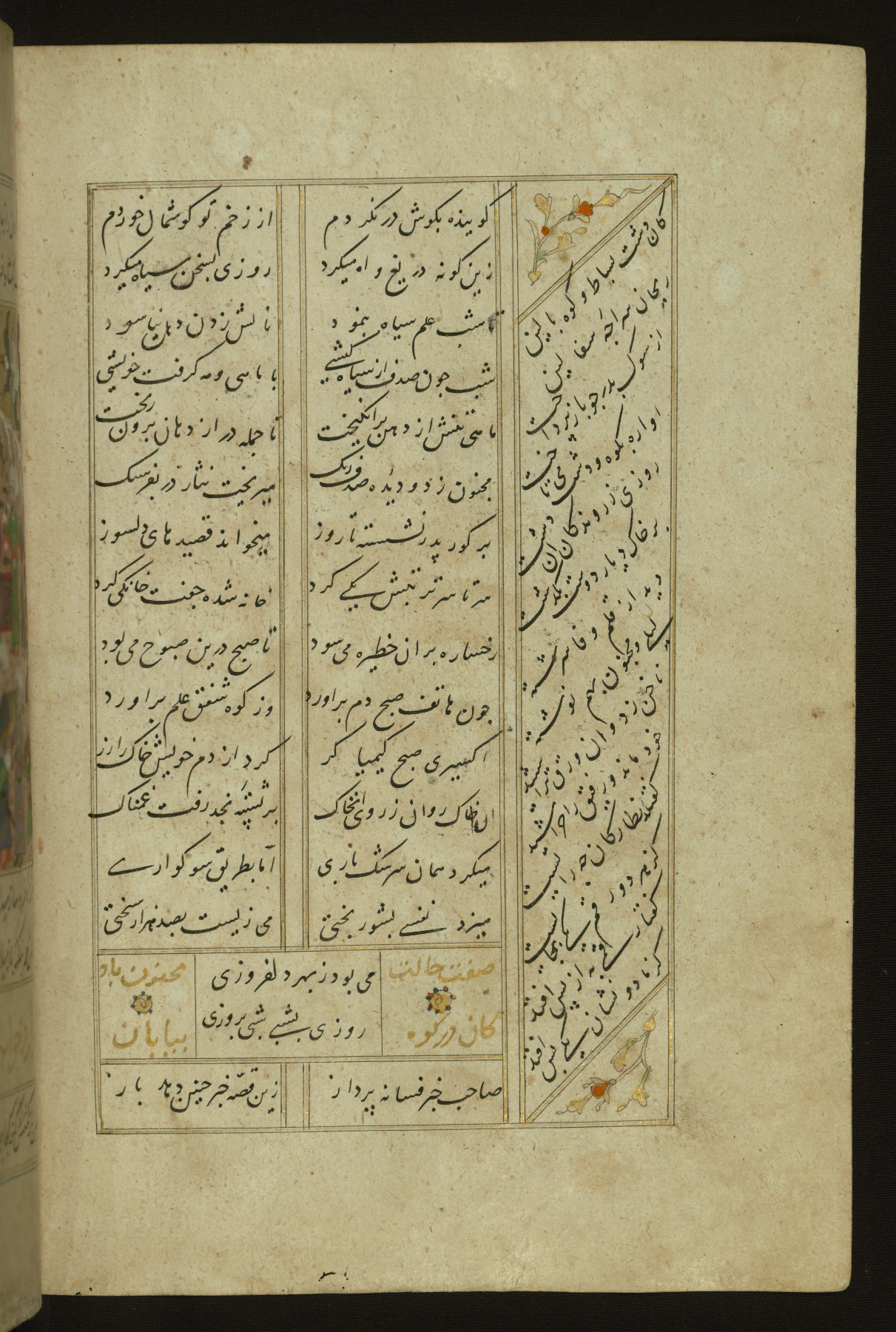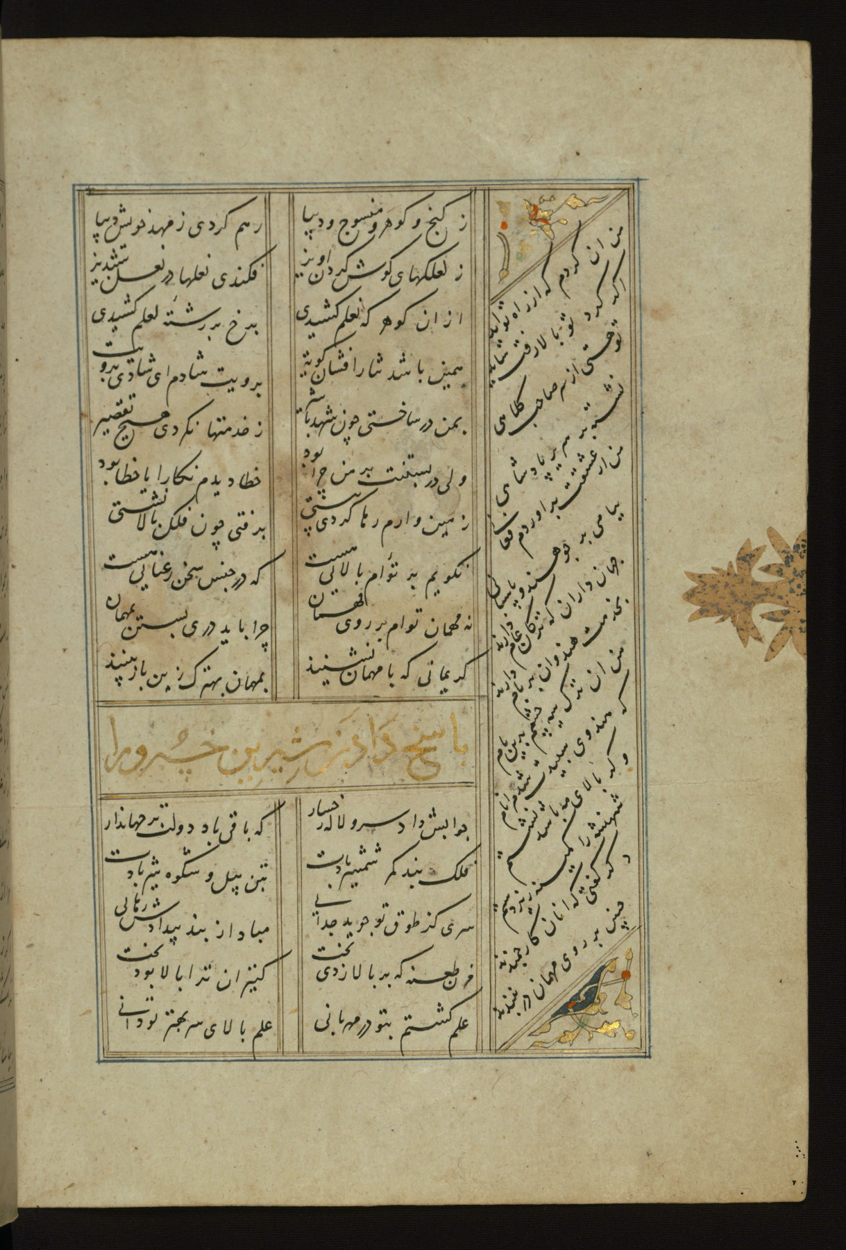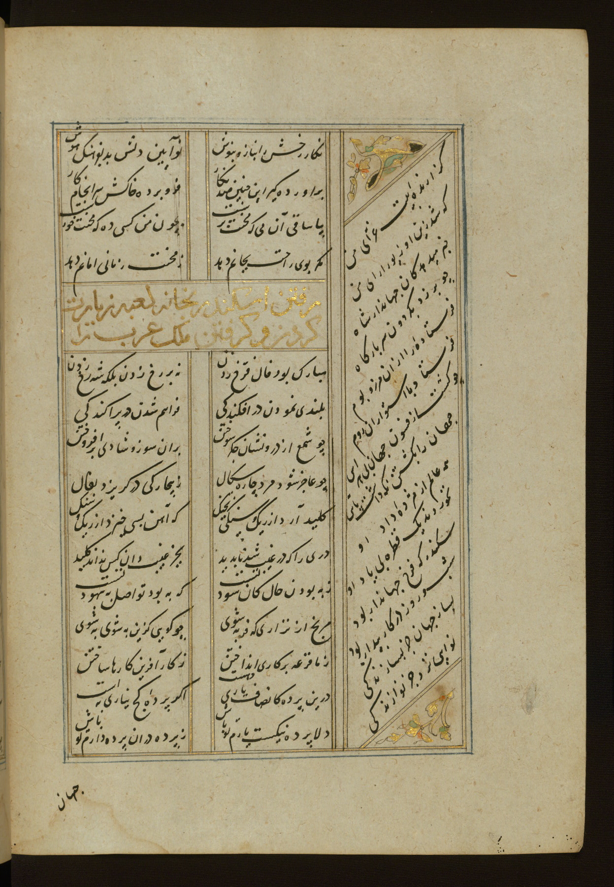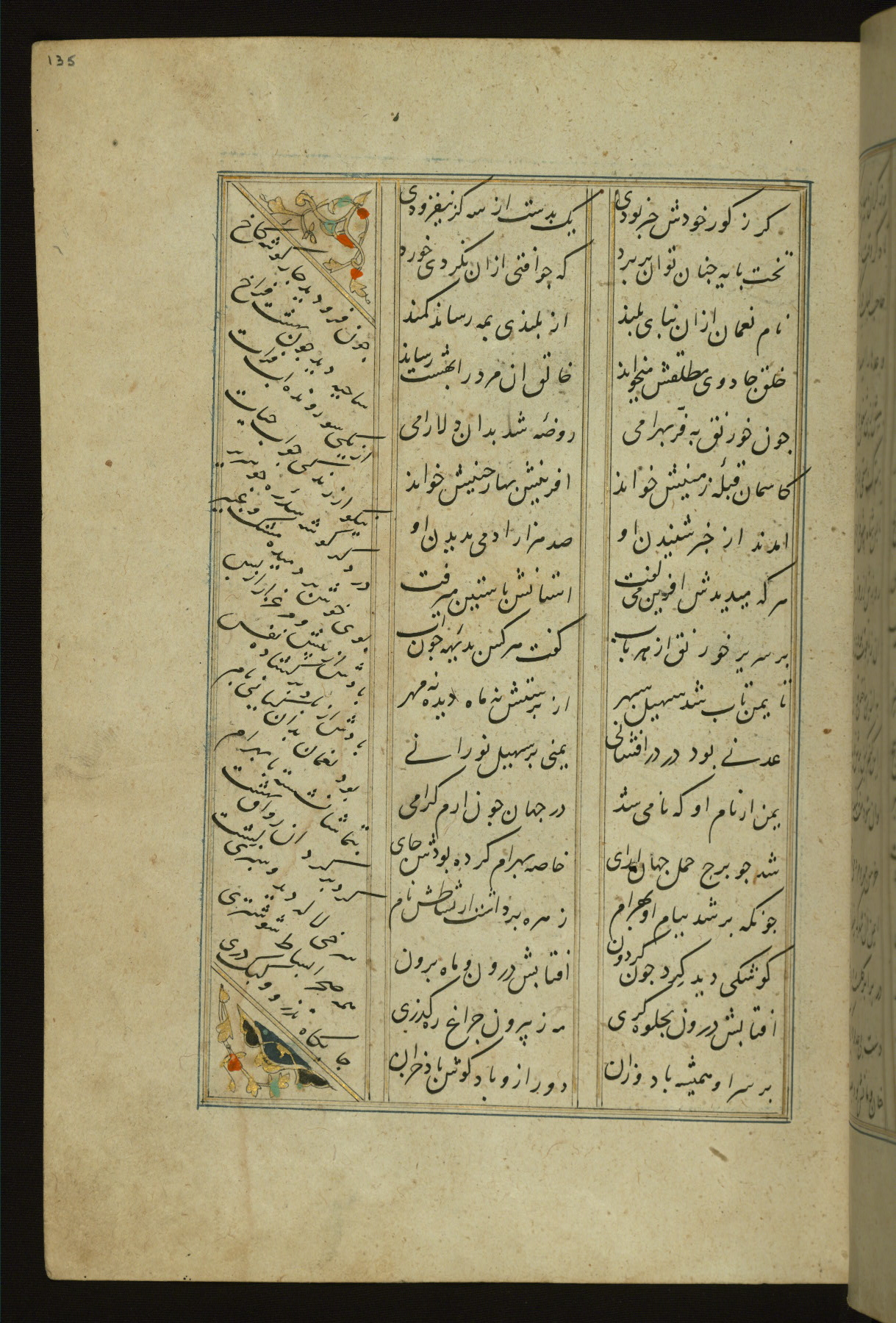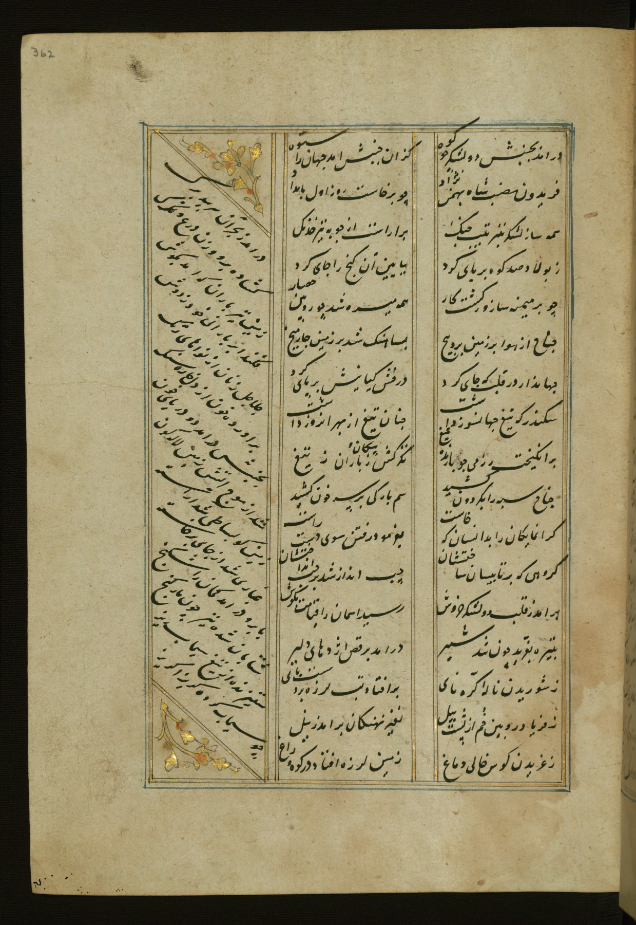 This copy of the Khamsah (quintet) of Niẓāmī Ganjavī (d. 605 AH / 1209 CE) was written by Abū Bakr Shāh ibn Ḥasan ibn ʿAlī al-Shahrastānī and illuminated by Jamāl al-Dīn ibn Muḥammad al-Ṣiddīqī al-Iṣfahānī between 892 AH / 1486 CE and 900 AH / 1494-5 CE. The manuscript opens with a double-page illuminated frontispiece with an inscription giving the title of the work and the name of the author (fols. 1b-2a). There are four illuminated titlepieces with the names of the individual poems and twenty-six repainted illustrations. According to evidence supplied by the colophons, the original binding was by the hand of Jamāl al-Dīn ibn Muḥammad al-Ṣiddīqī al-Iṣfahānī, as well. Unfortunately, it has not survived. The binding presently attached to the manuscript dates to the twelfth century AH / eighteenth CE.