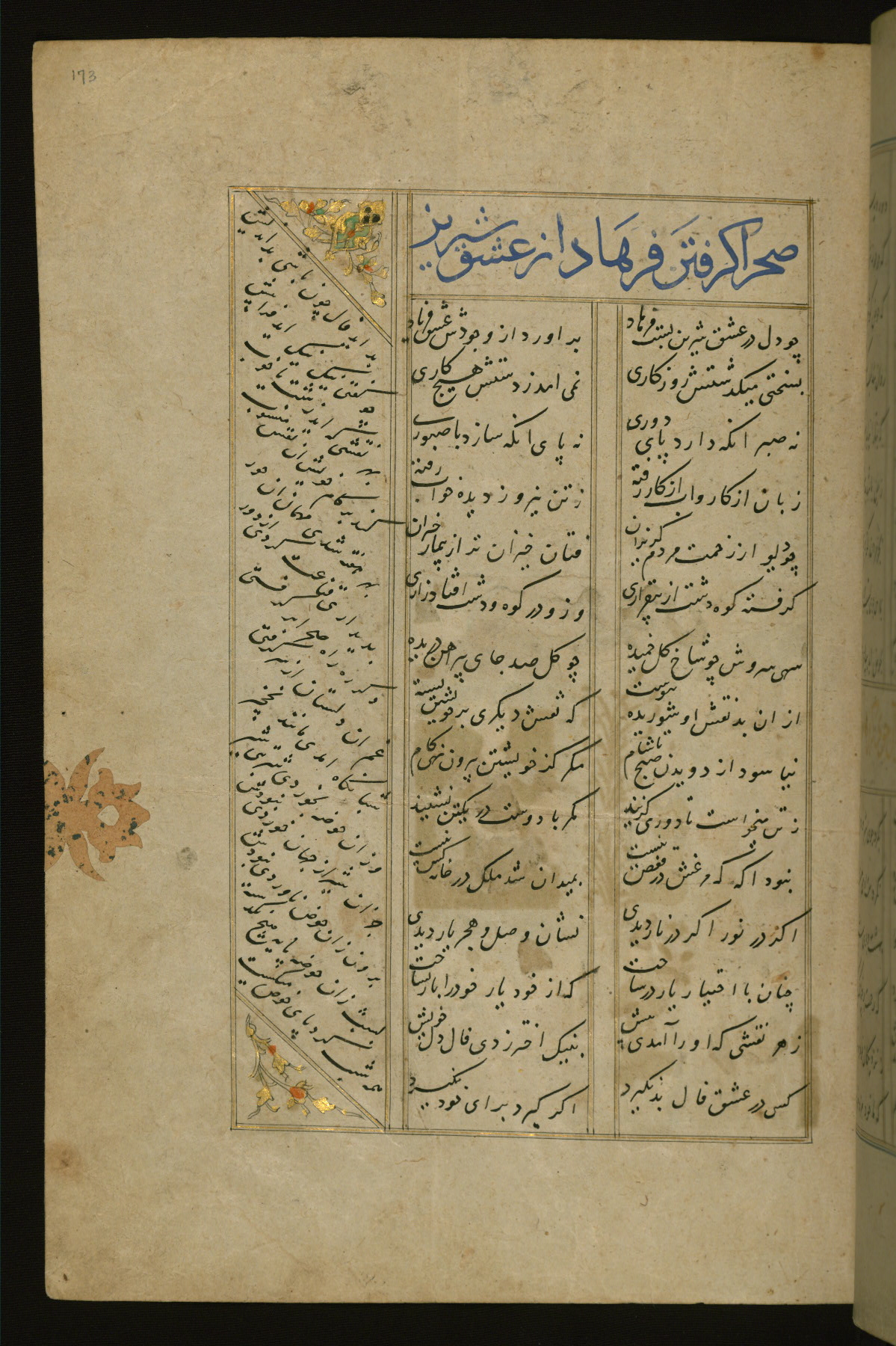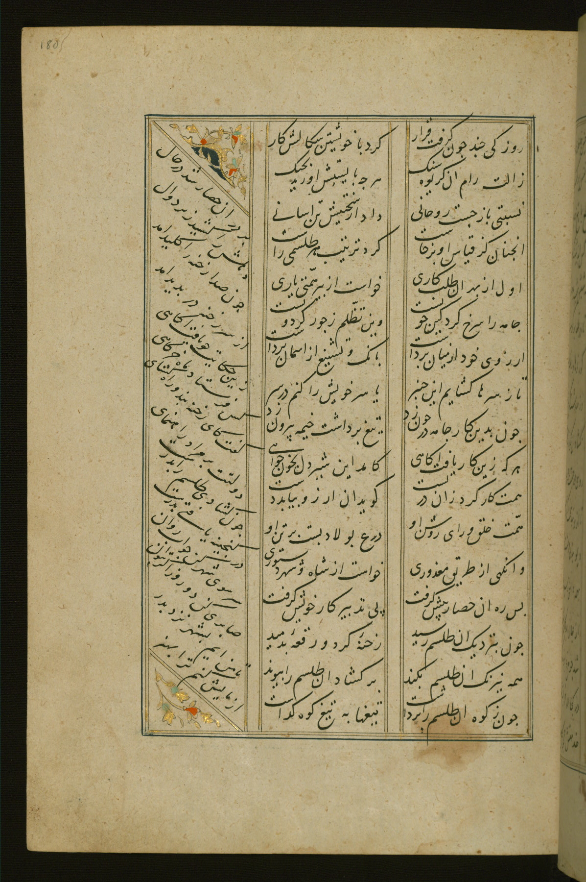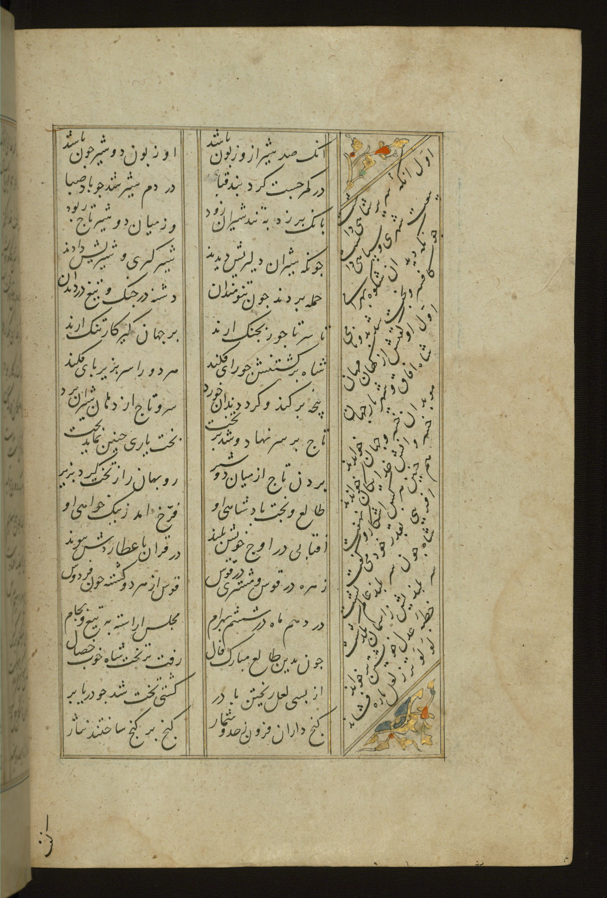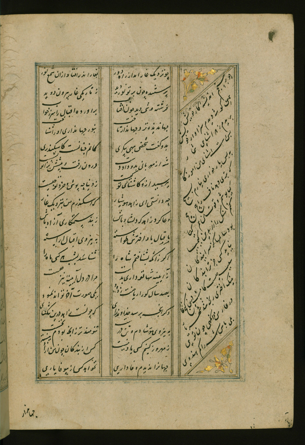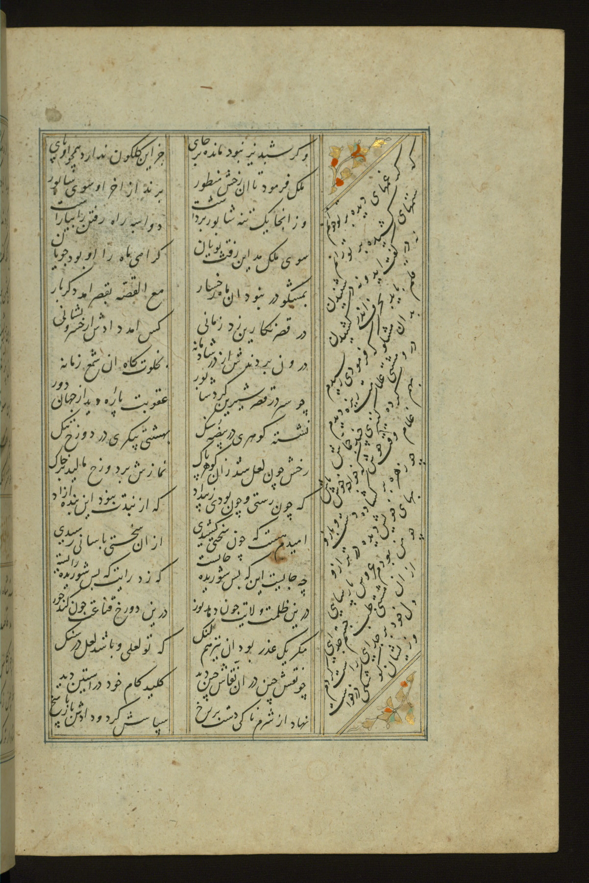 This copy of the Khamsah (quintet) of Niẓāmī Ganjavī (d. 605 AH / 1209 CE) was written by Abū Bakr Shāh ibn Ḥasan ibn ʿAlī al-Shahrastānī and illuminated by Jamāl al-Dīn ibn Muḥammad al-Ṣiddīqī al-Iṣfahānī between 892 AH / 1486 CE and 900 AH / 1494-5 CE. The manuscript opens with a double-page illuminated frontispiece with an inscription giving the title of the work and the name of the author (fols. 1b-2a). There are four illuminated titlepieces with the names of the individual poems and twenty-six repainted illustrations. According to evidence supplied by the colophons, the original binding was by the hand of Jamāl al-Dīn ibn Muḥammad al-Ṣiddīqī al-Iṣfahānī, as well. Unfortunately, it has not survived. The binding presently attached to the manuscript dates to the twelfth century AH / eighteenth CE.