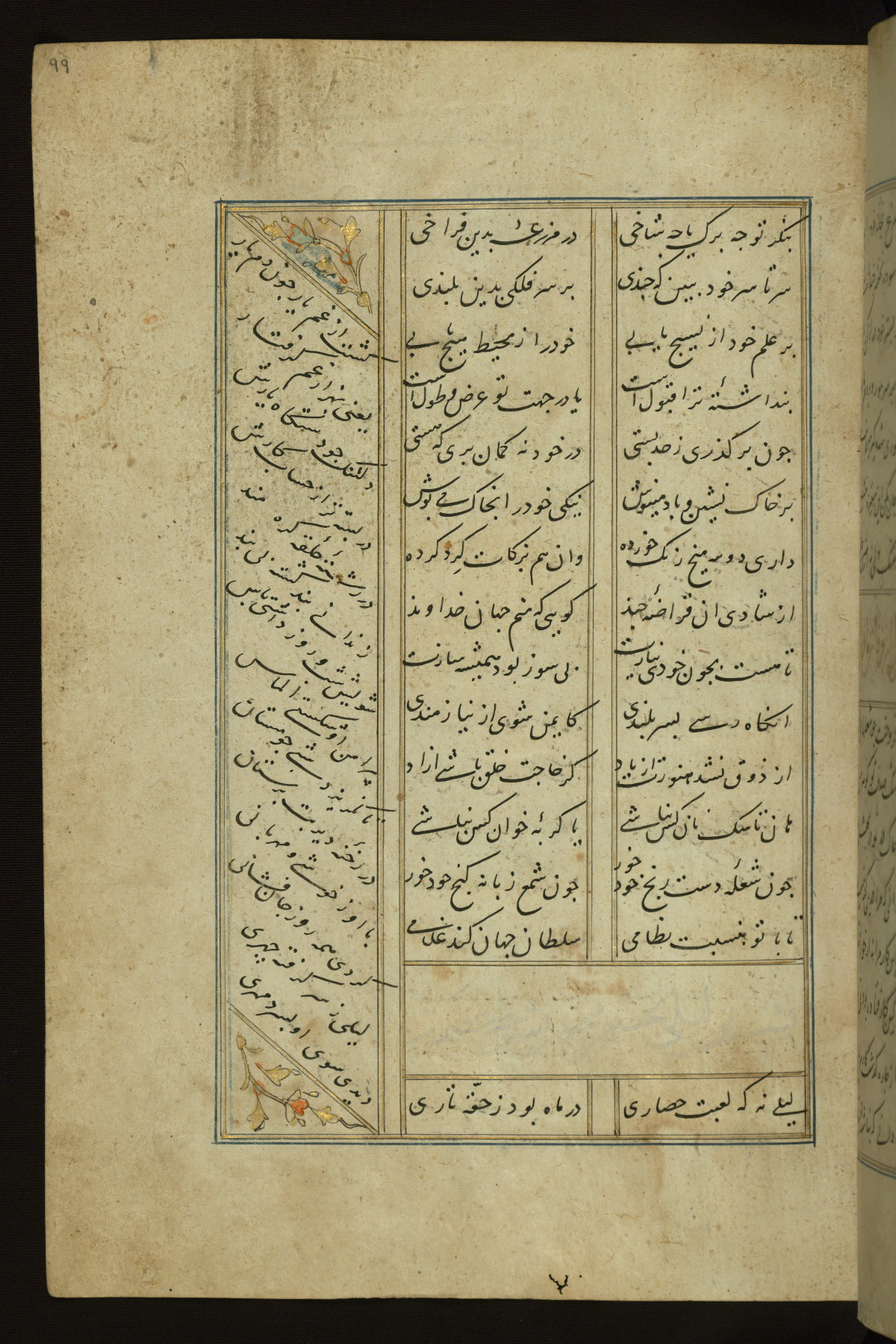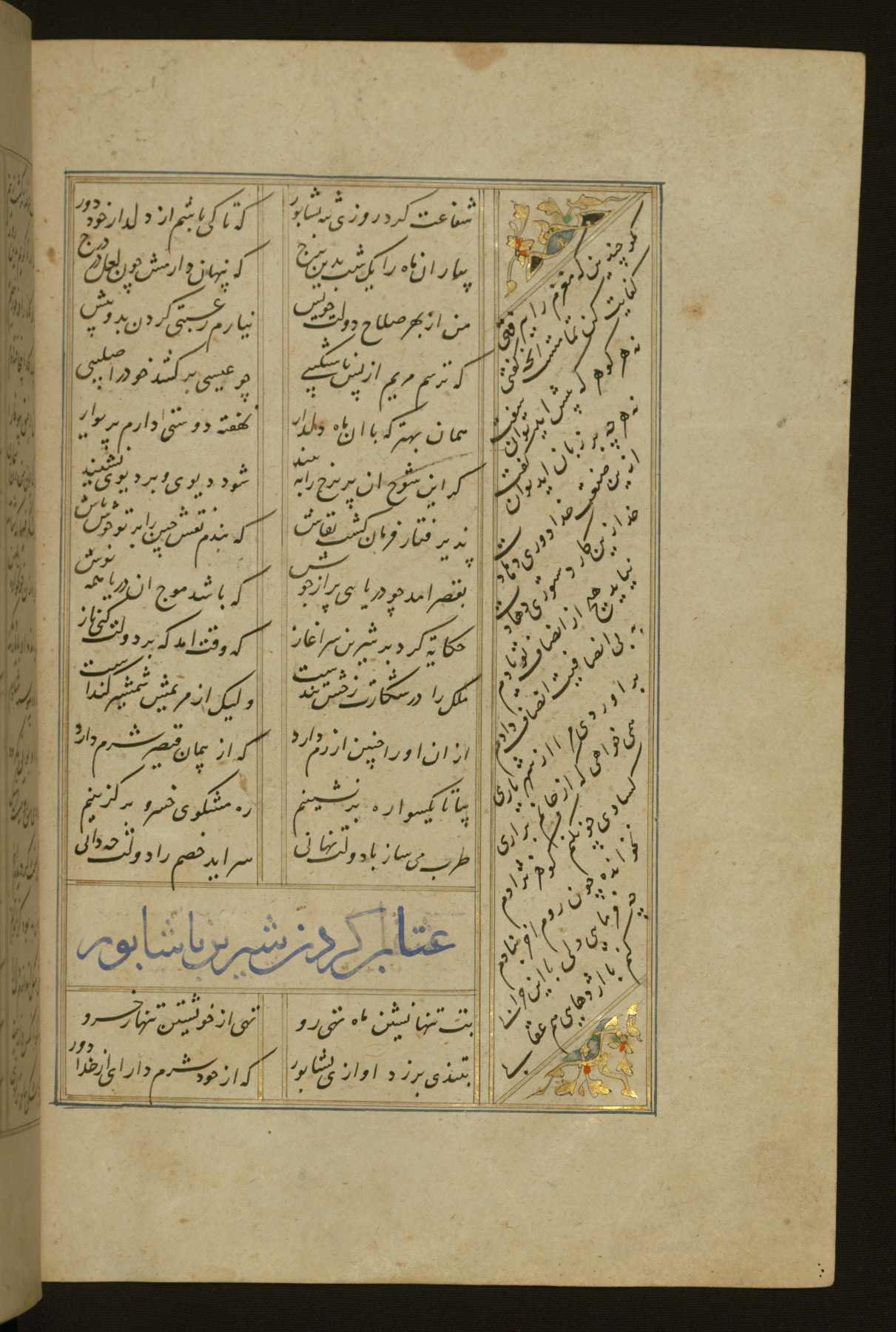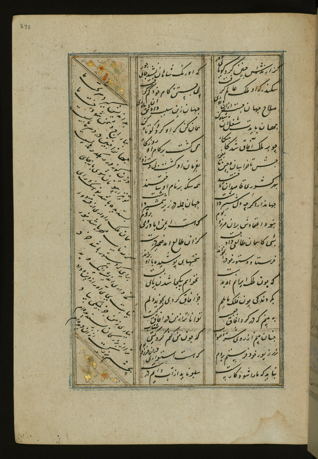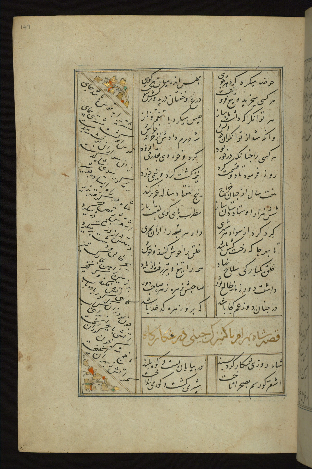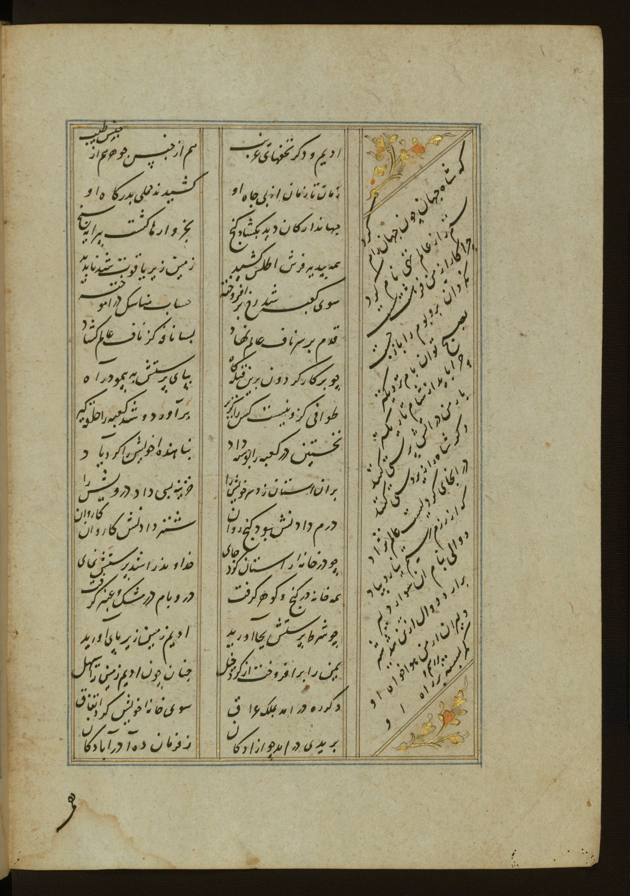 This copy of the Khamsah (quintet) of Niẓāmī Ganjavī (d. 605 AH / 1209 CE) was written by Abū Bakr Shāh ibn Ḥasan ibn ʿAlī al-Shahrastānī and illuminated by Jamāl al-Dīn ibn Muḥammad al-Ṣiddīqī al-Iṣfahānī between 892 AH / 1486 CE and 900 AH / 1494-5 CE. The manuscript opens with a double-page illuminated frontispiece with an inscription giving the title of the work and the name of the author (fols. 1b-2a). There are four illuminated titlepieces with the names of the individual poems and twenty-six repainted illustrations. According to evidence supplied by the colophons, the original binding was by the hand of Jamāl al-Dīn ibn Muḥammad al-Ṣiddīqī al-Iṣfahānī, as well. Unfortunately, it has not survived. The binding presently attached to the manuscript dates to the twelfth century AH / eighteenth CE.