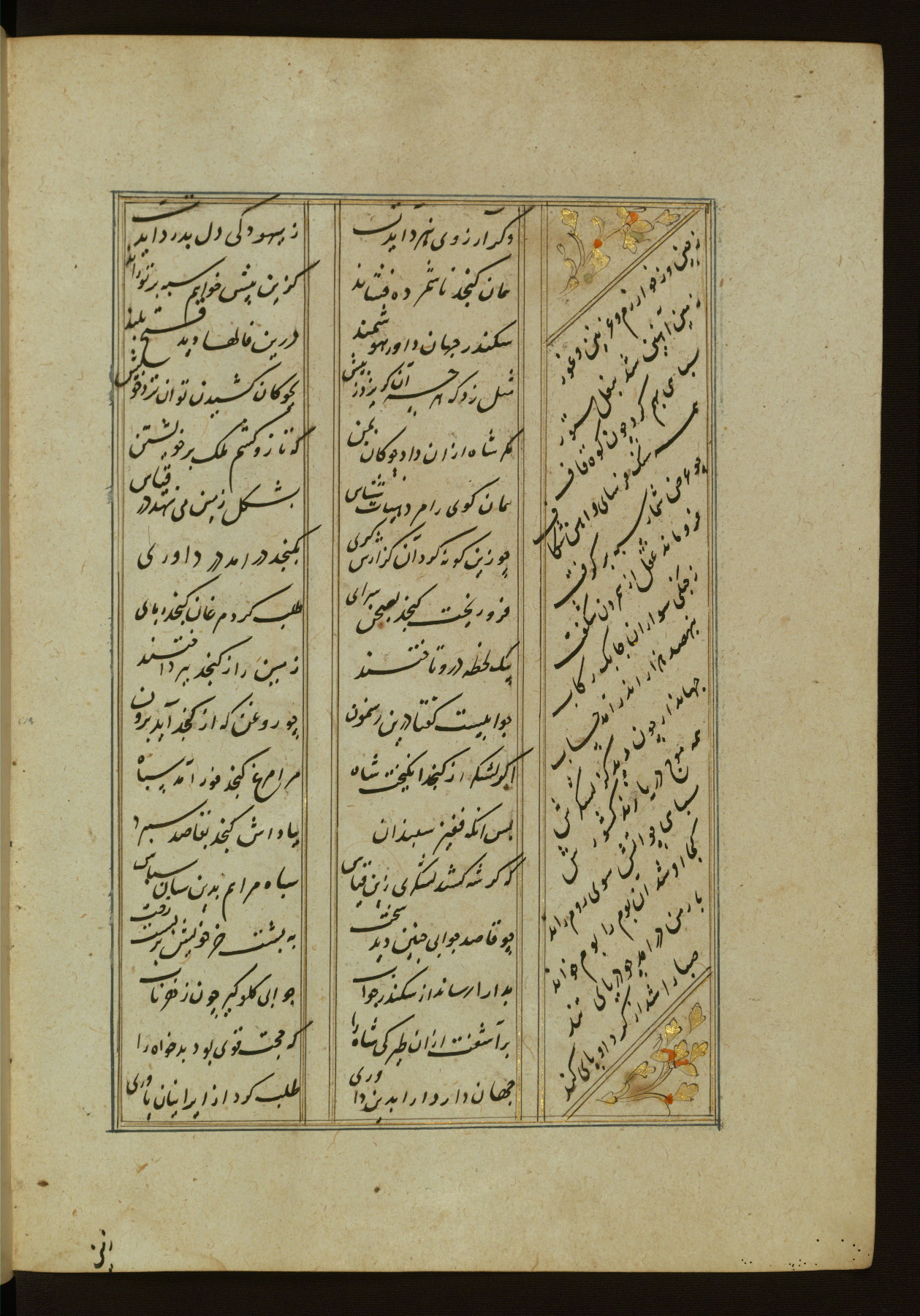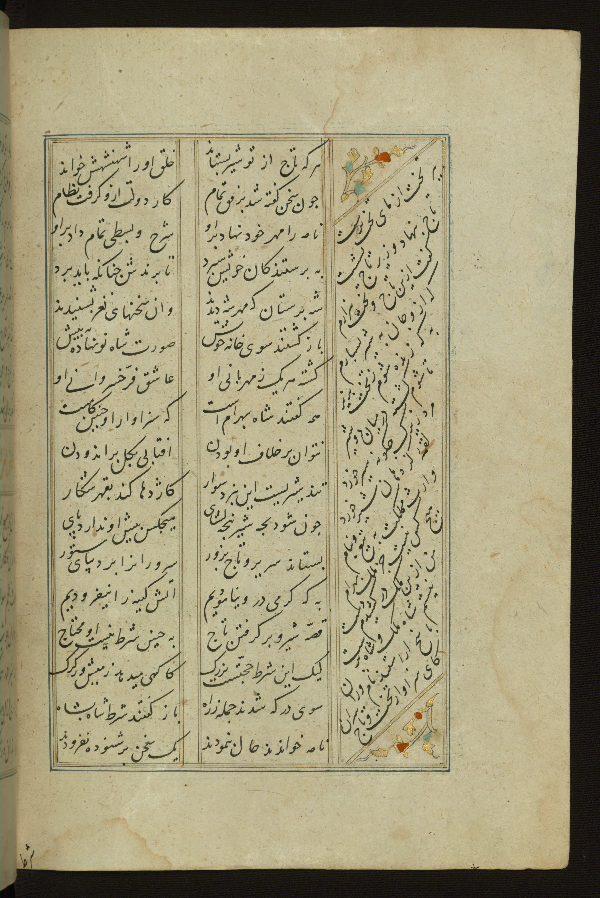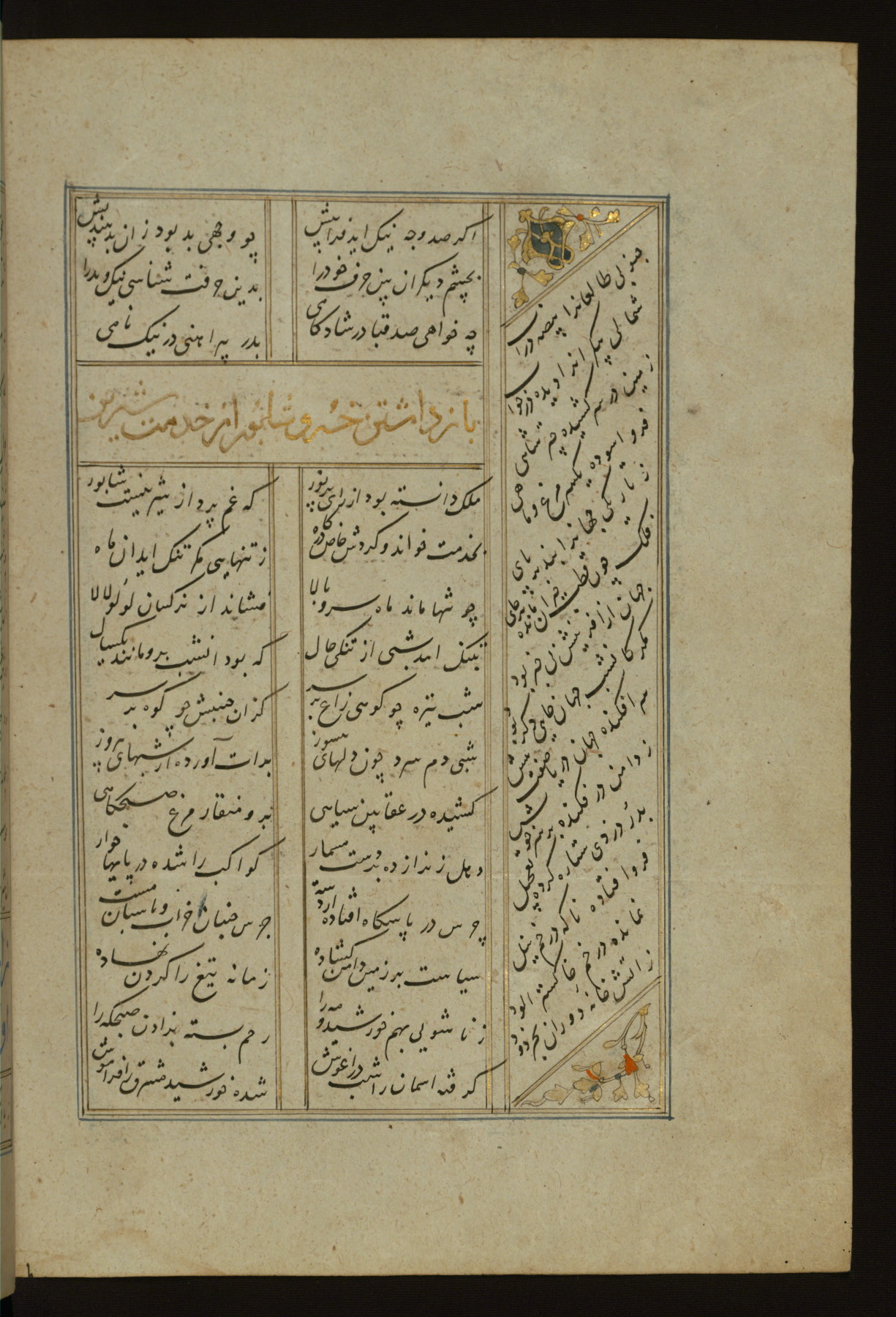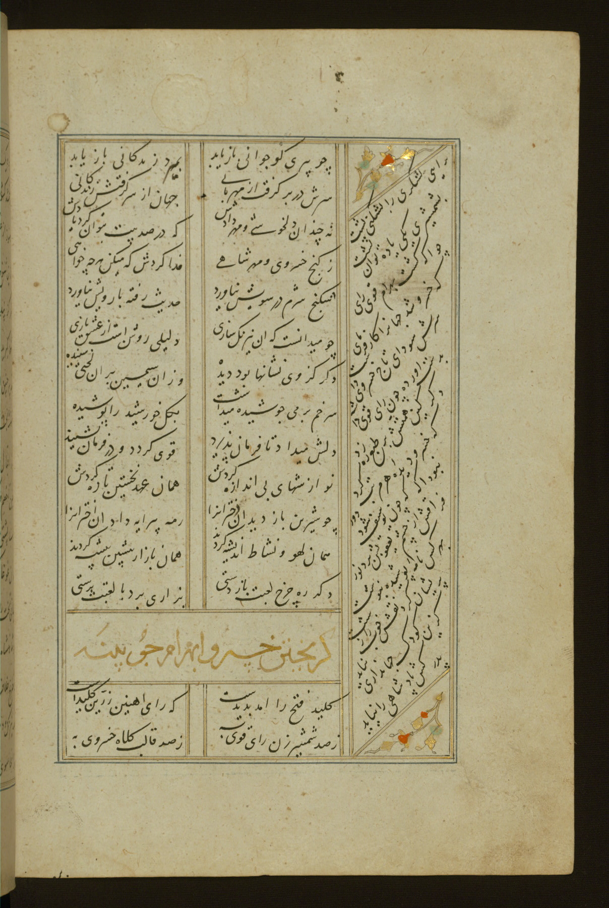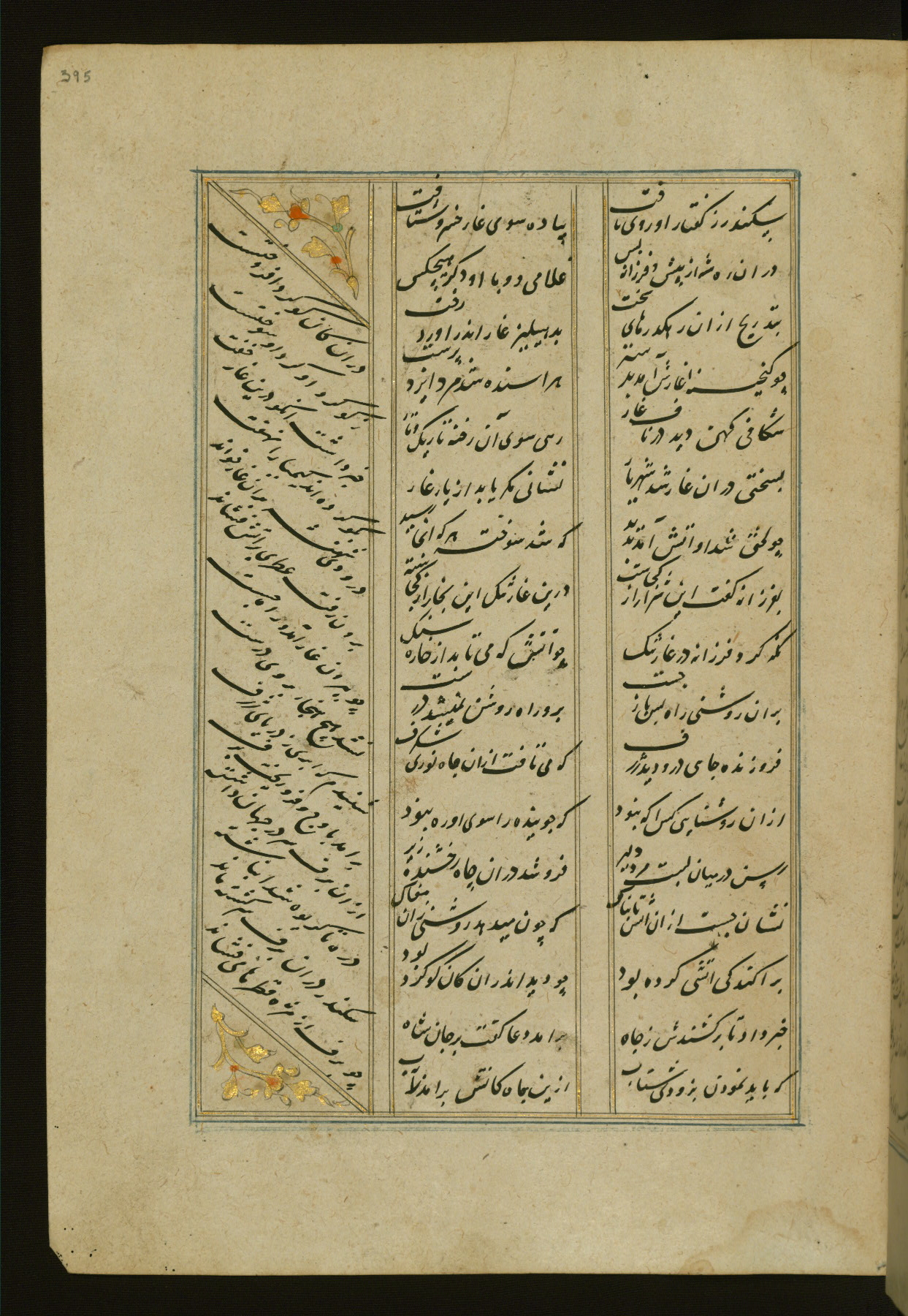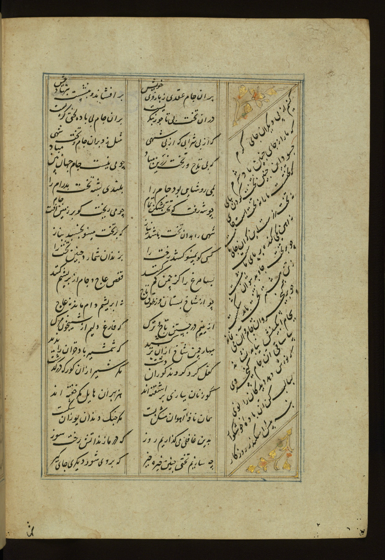 This copy of the Khamsah (quintet) of Niẓāmī Ganjavī (d. 605 AH / 1209 CE) was written by Abū Bakr Shāh ibn Ḥasan ibn ʿAlī al-Shahrastānī and illuminated by Jamāl al-Dīn ibn Muḥammad al-Ṣiddīqī al-Iṣfahānī between 892 AH / 1486 CE and 900 AH / 1494-5 CE. The manuscript opens with a double-page illuminated frontispiece with an inscription giving the title of the work and the name of the author (fols. 1b-2a). There are four illuminated titlepieces with the names of the individual poems and twenty-six repainted illustrations. According to evidence supplied by the colophons, the original binding was by the hand of Jamāl al-Dīn ibn Muḥammad al-Ṣiddīqī al-Iṣfahānī, as well. Unfortunately, it has not survived. The binding presently attached to the manuscript dates to the twelfth century AH / eighteenth CE.