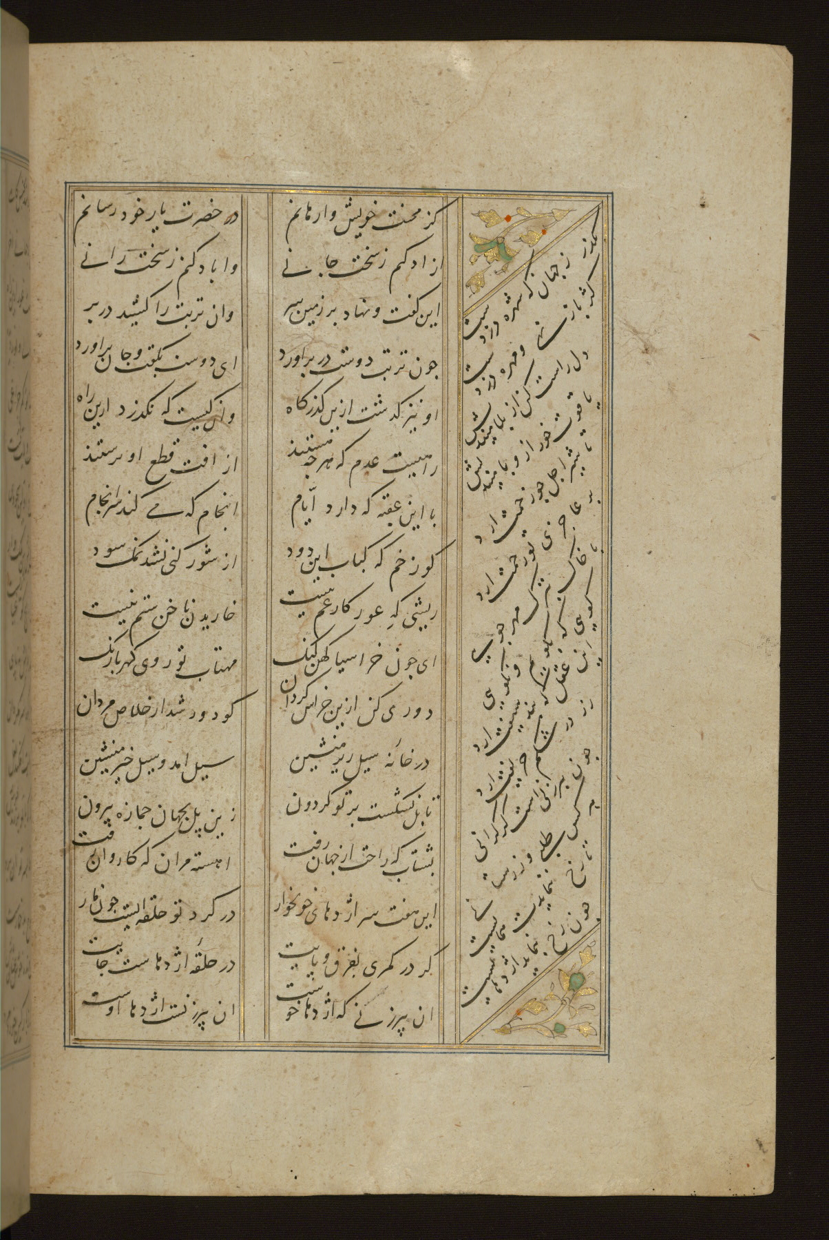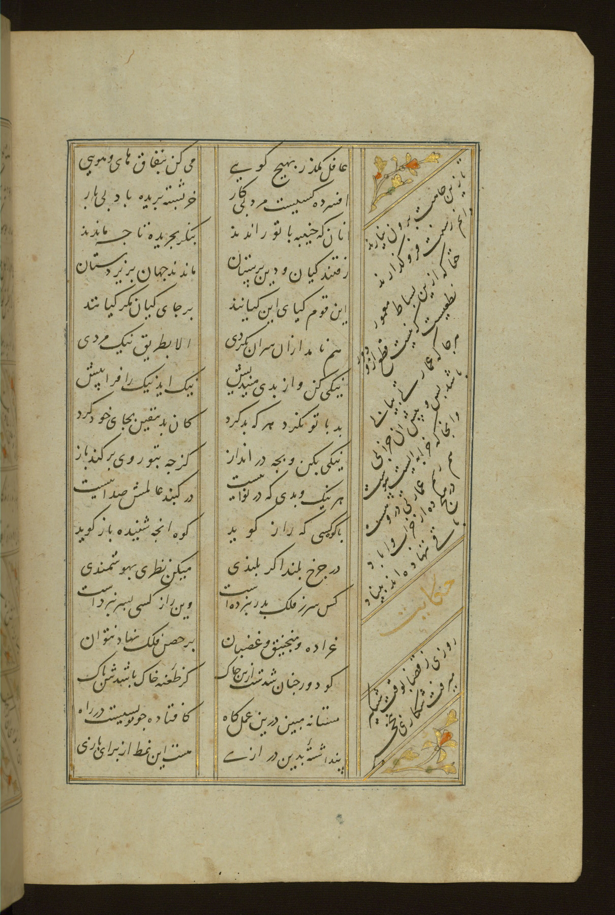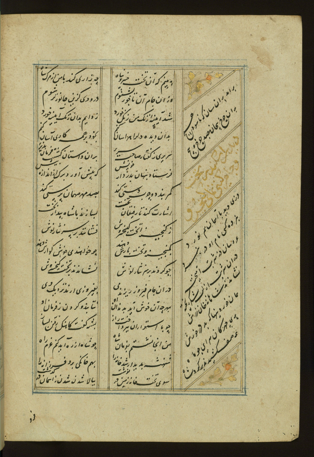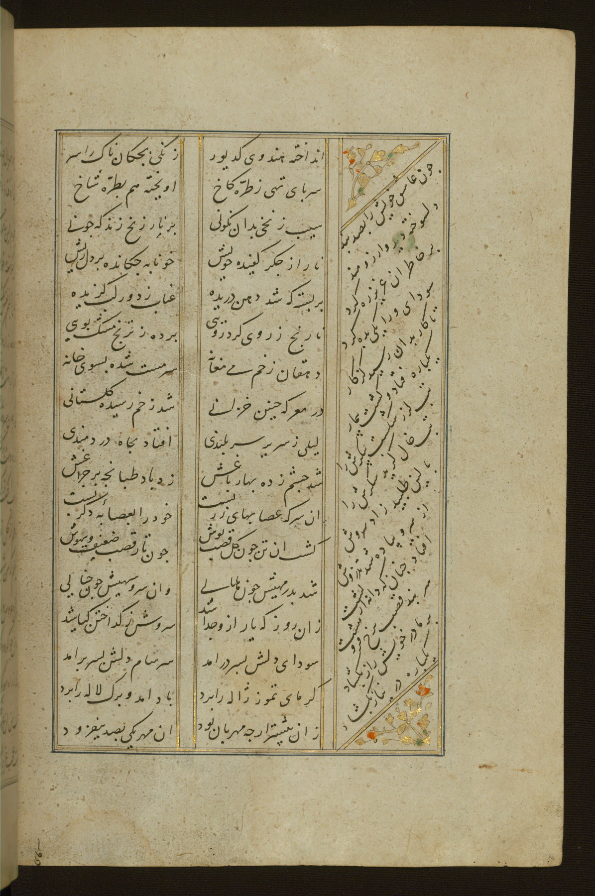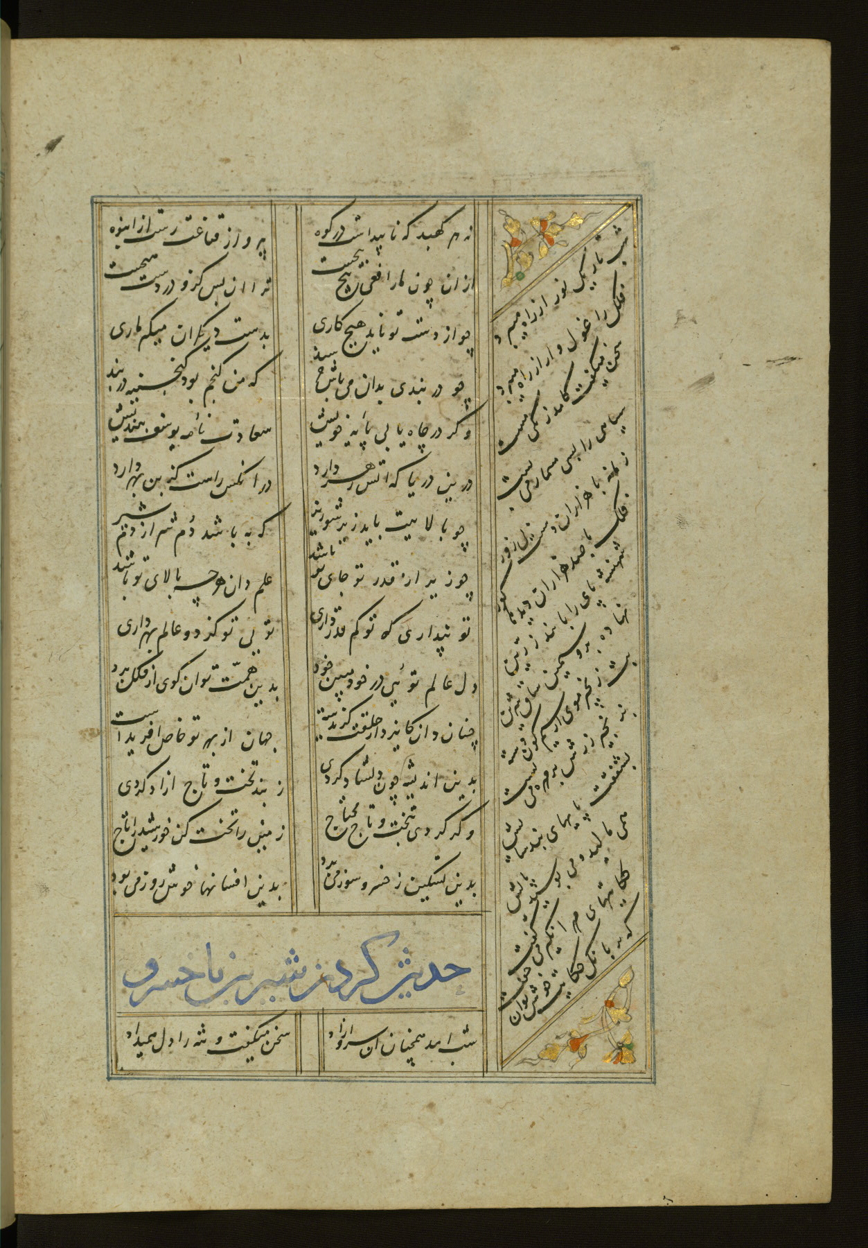 This copy of the Khamsah (quintet) of Niẓāmī Ganjavī (d. 605 AH / 1209 CE) was written by Abū Bakr Shāh ibn Ḥasan ibn ʿAlī al-Shahrastānī and illuminated by Jamāl al-Dīn ibn Muḥammad al-Ṣiddīqī al-Iṣfahānī between 892 AH / 1486 CE and 900 AH / 1494-5 CE. The manuscript opens with a double-page illuminated frontispiece with an inscription giving the title of the work and the name of the author (fols. 1b-2a). There are four illuminated titlepieces with the names of the individual poems and twenty-six repainted illustrations. According to evidence supplied by the colophons, the original binding was by the hand of Jamāl al-Dīn ibn Muḥammad al-Ṣiddīqī al-Iṣfahānī, as well. Unfortunately, it has not survived. The binding presently attached to the manuscript dates to the twelfth century AH / eighteenth CE.