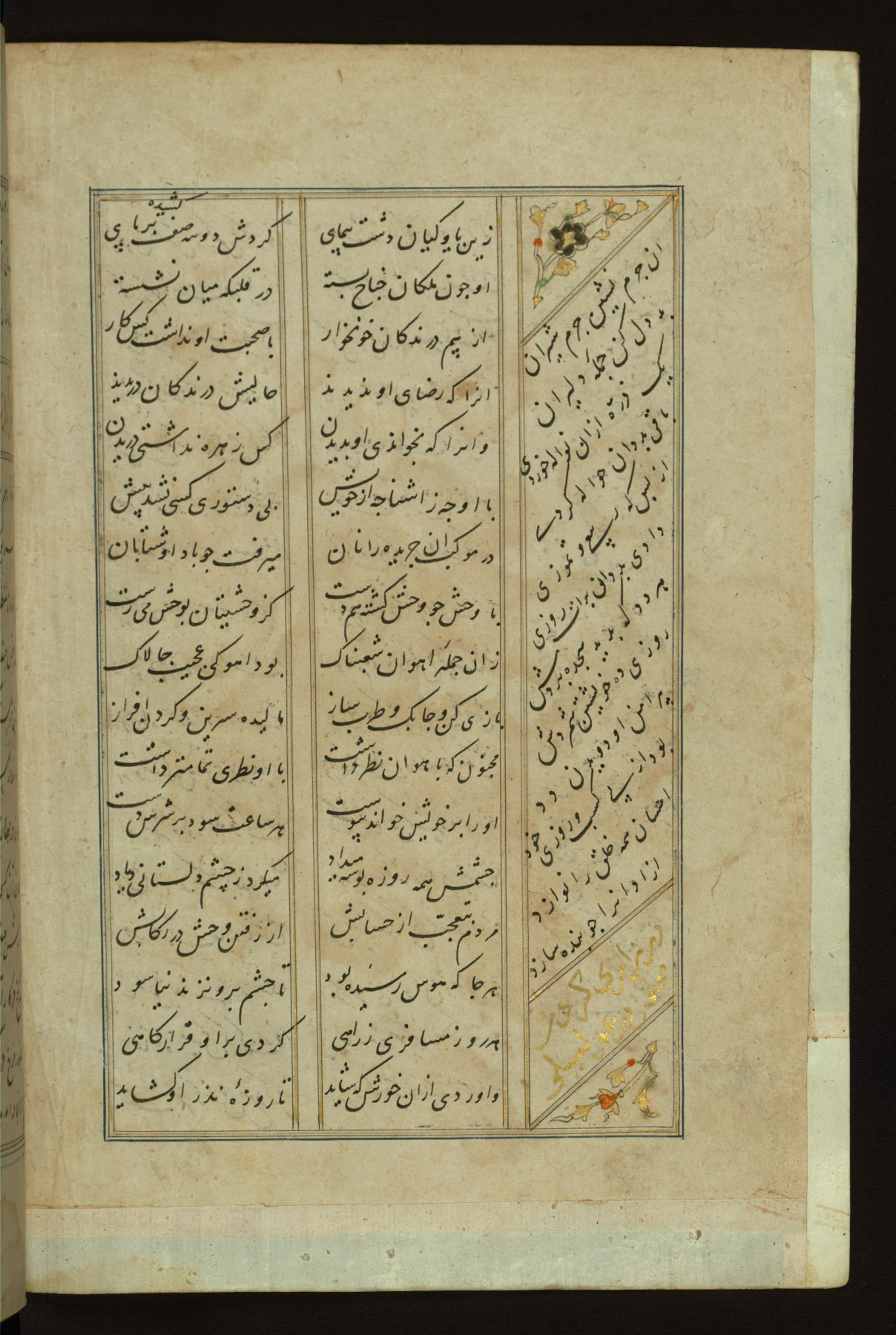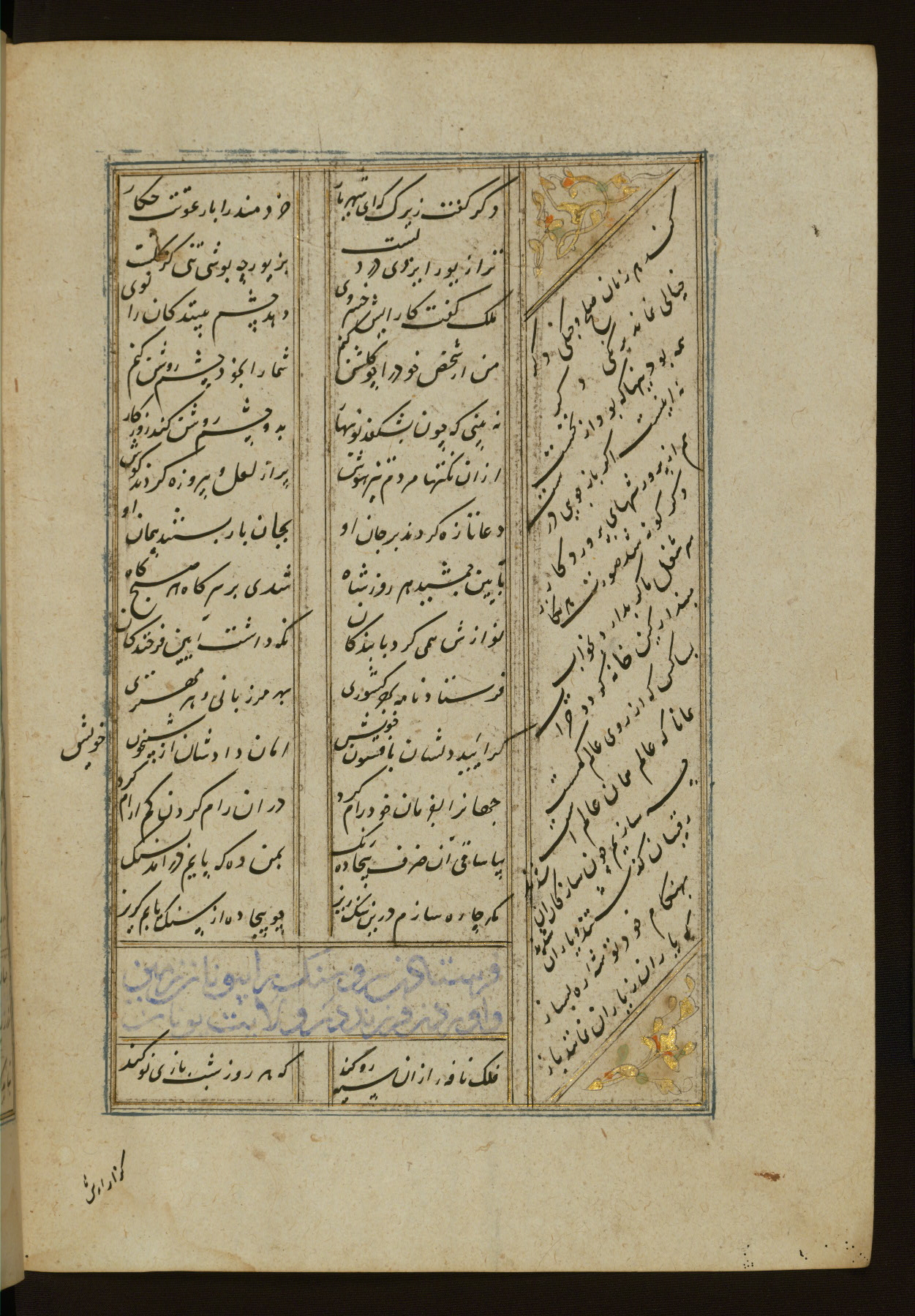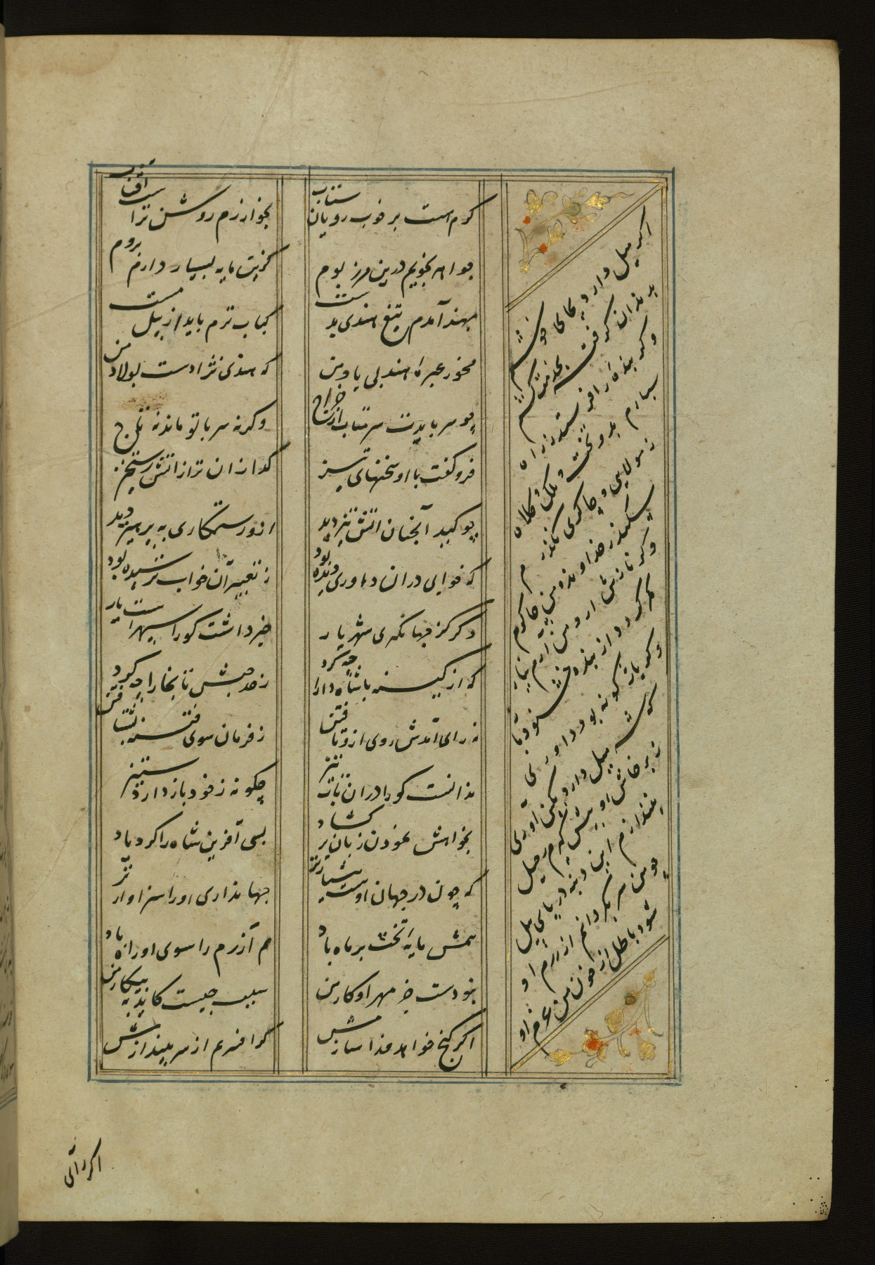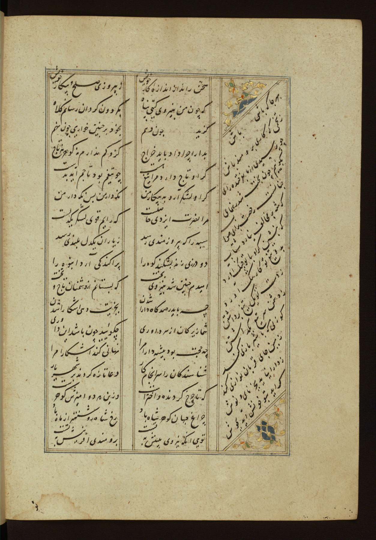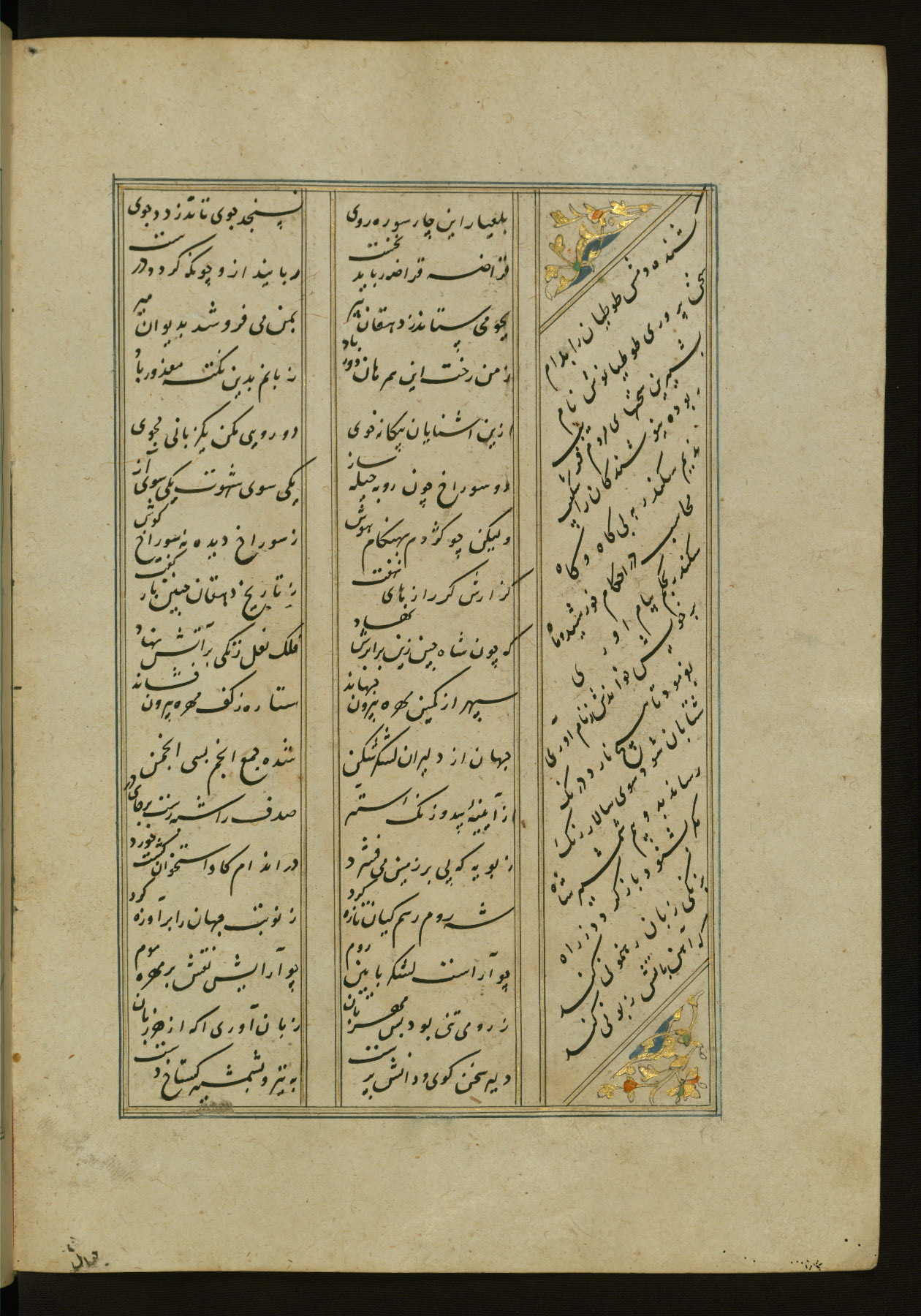 This copy of the Khamsah (quintet) of Niẓāmī Ganjavī (d. 605 AH / 1209 CE) was written by Abū Bakr Shāh ibn Ḥasan ibn ʿAlī al-Shahrastānī and illuminated by Jamāl al-Dīn ibn Muḥammad al-Ṣiddīqī al-Iṣfahānī between 892 AH / 1486 CE and 900 AH / 1494-5 CE. The manuscript opens with a double-page illuminated frontispiece with an inscription giving the title of the work and the name of the author (fols. 1b-2a). There are four illuminated titlepieces with the names of the individual poems and twenty-six repainted illustrations. According to evidence supplied by the colophons, the original binding was by the hand of Jamāl al-Dīn ibn Muḥammad al-Ṣiddīqī al-Iṣfahānī, as well. Unfortunately, it has not survived. The binding presently attached to the manuscript dates to the twelfth century AH / eighteenth CE.