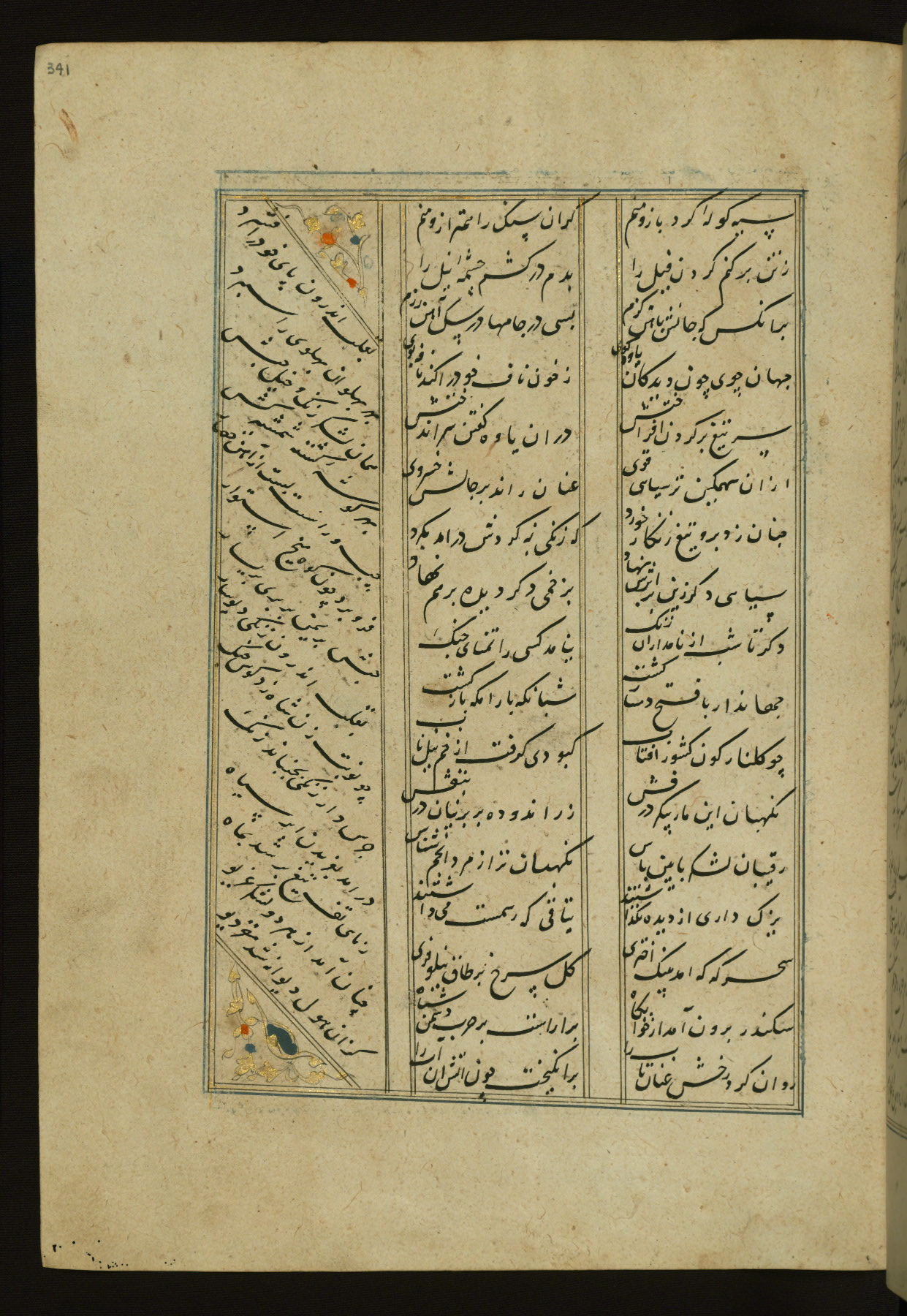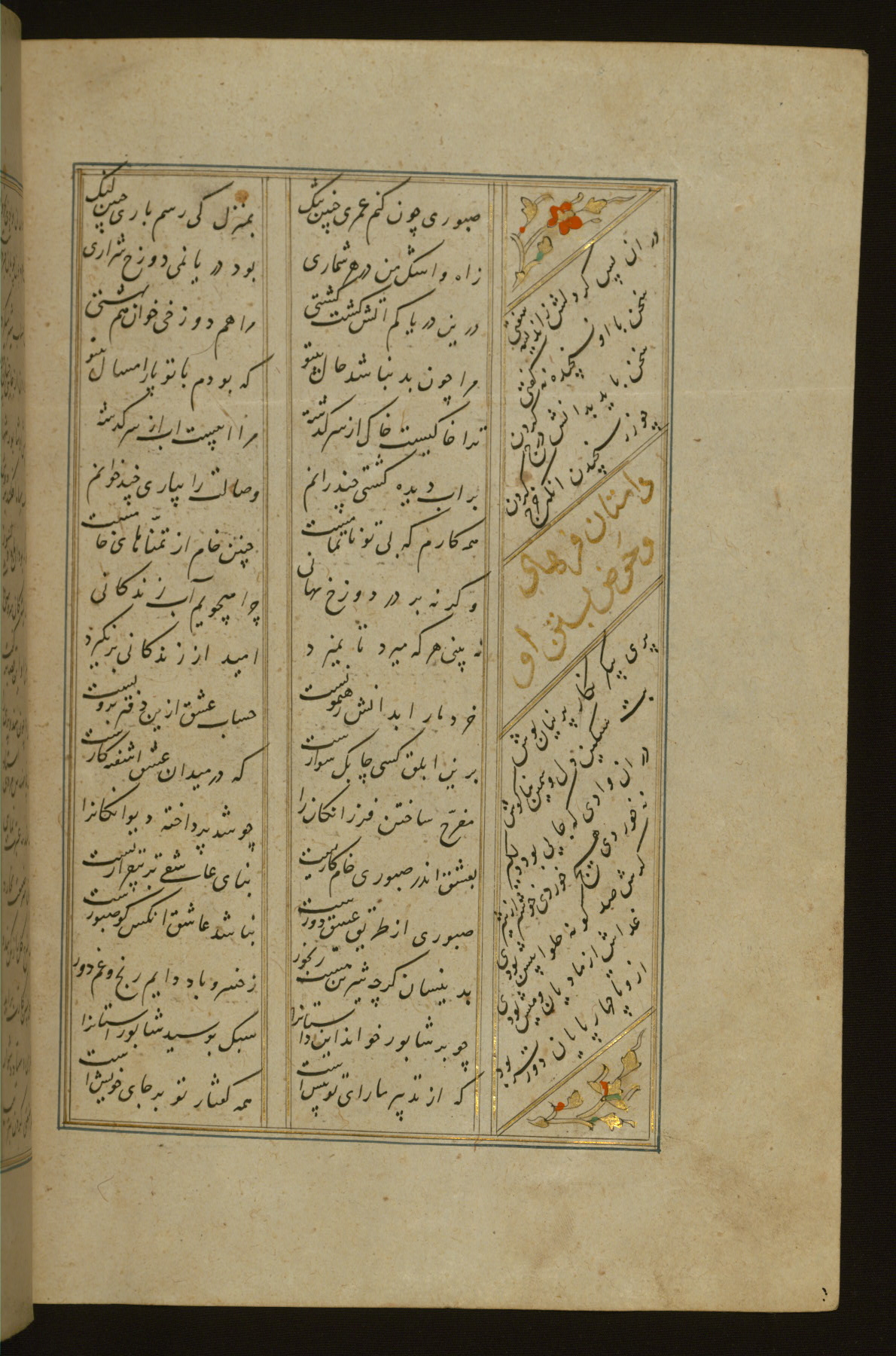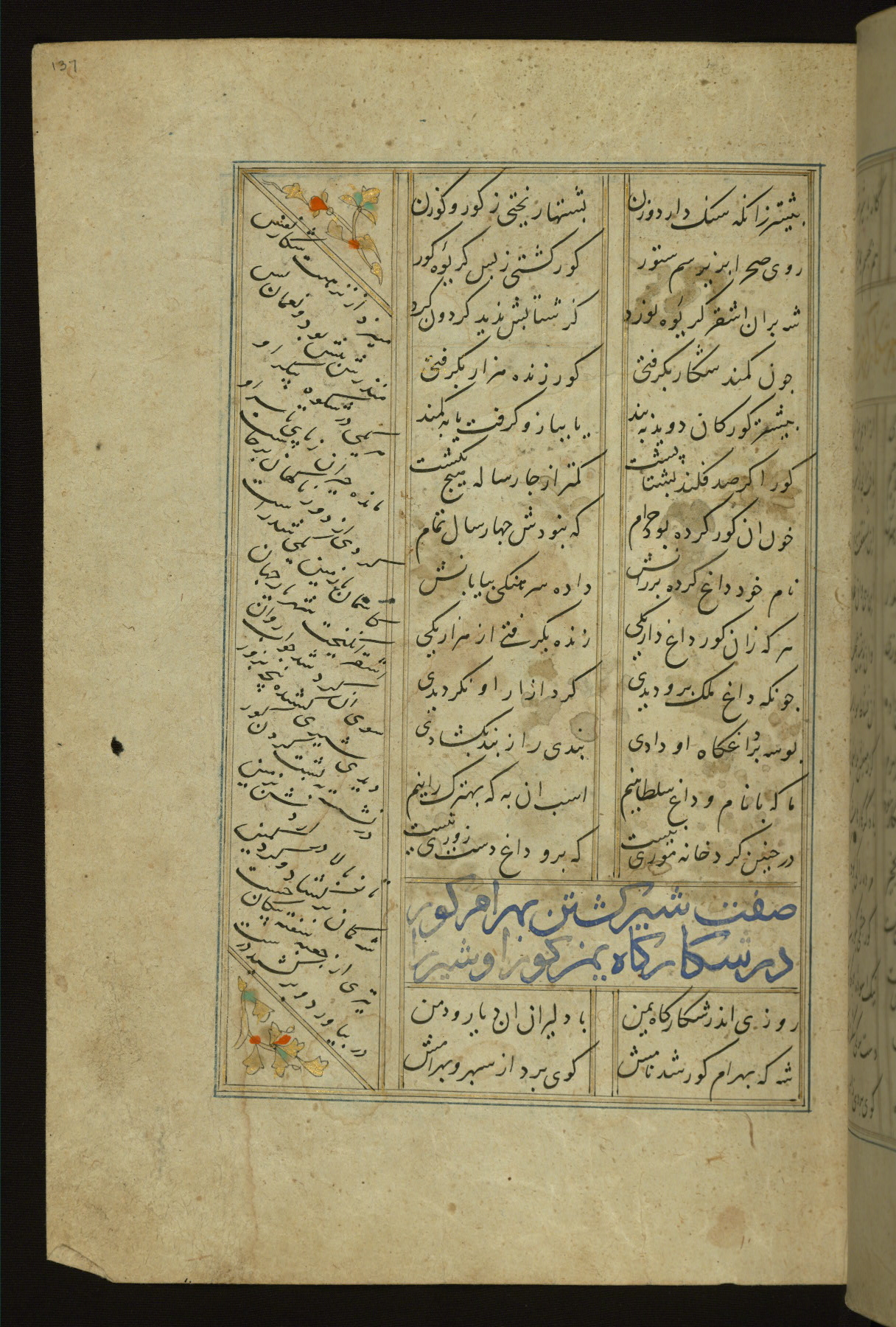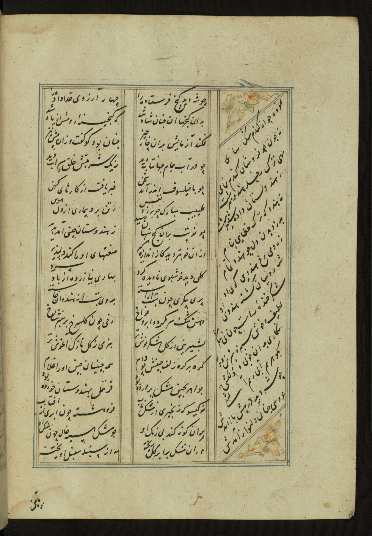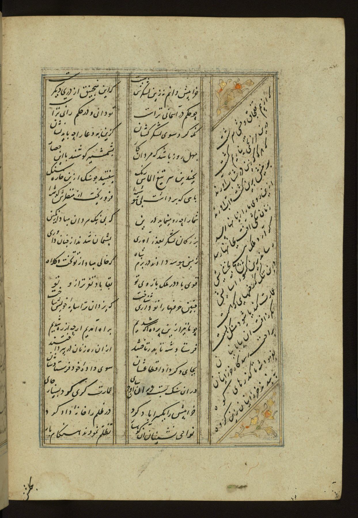 This copy of the Khamsah (quintet) of Niẓāmī Ganjavī (d. 605 AH / 1209 CE) was written by Abū Bakr Shāh ibn Ḥasan ibn ʿAlī al-Shahrastānī and illuminated by Jamāl al-Dīn ibn Muḥammad al-Ṣiddīqī al-Iṣfahānī between 892 AH / 1486 CE and 900 AH / 1494-5 CE. The manuscript opens with a double-page illuminated frontispiece with an inscription giving the title of the work and the name of the author (fols. 1b-2a). There are four illuminated titlepieces with the names of the individual poems and twenty-six repainted illustrations. According to evidence supplied by the colophons, the original binding was by the hand of Jamāl al-Dīn ibn Muḥammad al-Ṣiddīqī al-Iṣfahānī, as well. Unfortunately, it has not survived. The binding presently attached to the manuscript dates to the twelfth century AH / eighteenth CE.