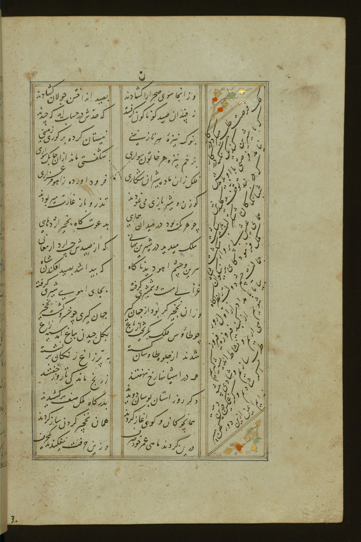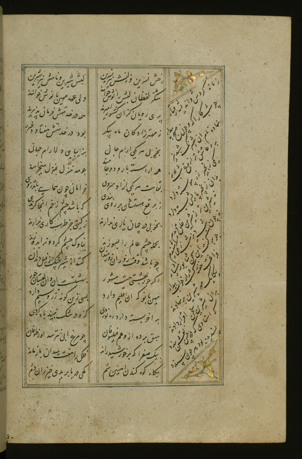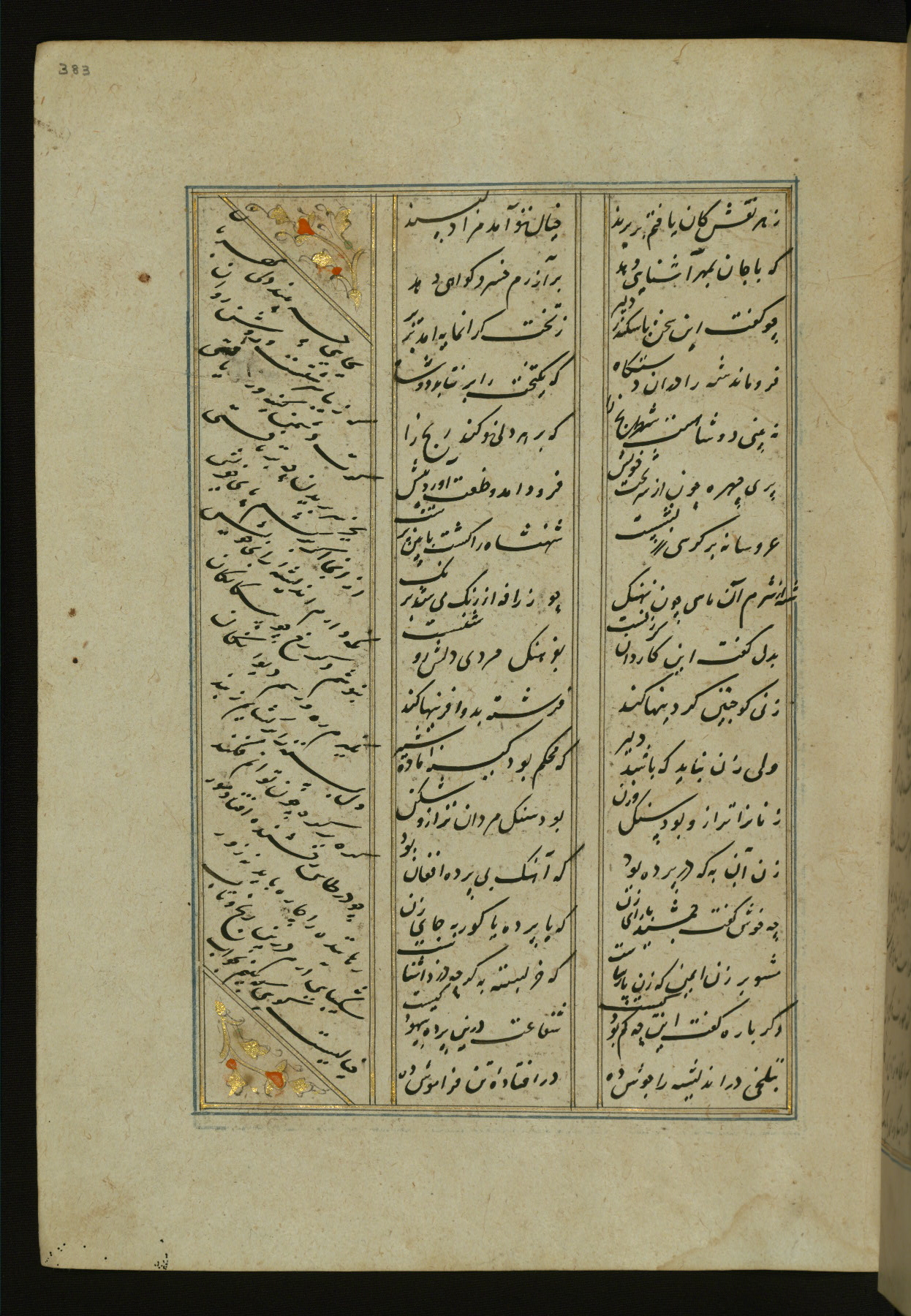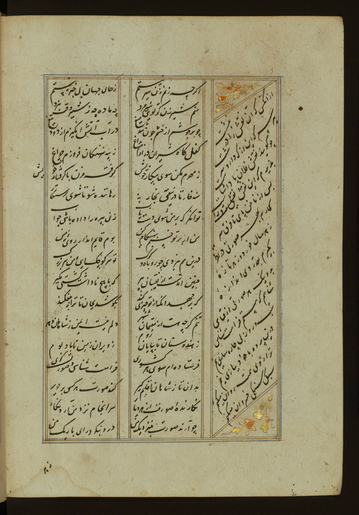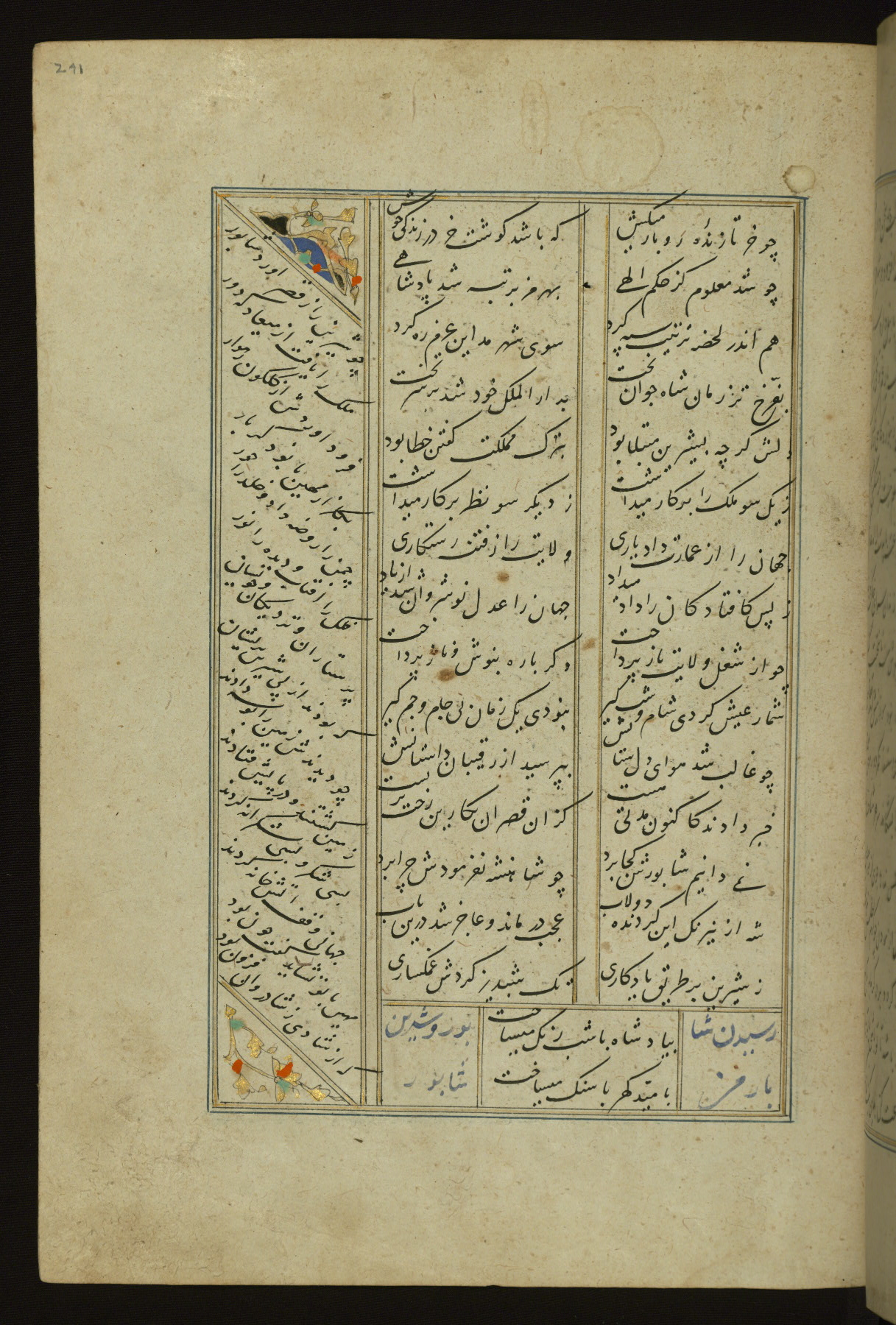 This copy of the Khamsah (quintet) of Niẓāmī Ganjavī (d. 605 AH / 1209 CE) was written by Abū Bakr Shāh ibn Ḥasan ibn ʿAlī al-Shahrastānī and illuminated by Jamāl al-Dīn ibn Muḥammad al-Ṣiddīqī al-Iṣfahānī between 892 AH / 1486 CE and 900 AH / 1494-5 CE. The manuscript opens with a double-page illuminated frontispiece with an inscription giving the title of the work and the name of the author (fols. 1b-2a). There are four illuminated titlepieces with the names of the individual poems and twenty-six repainted illustrations. According to evidence supplied by the colophons, the original binding was by the hand of Jamāl al-Dīn ibn Muḥammad al-Ṣiddīqī al-Iṣfahānī, as well. Unfortunately, it has not survived. The binding presently attached to the manuscript dates to the twelfth century AH / eighteenth CE.
