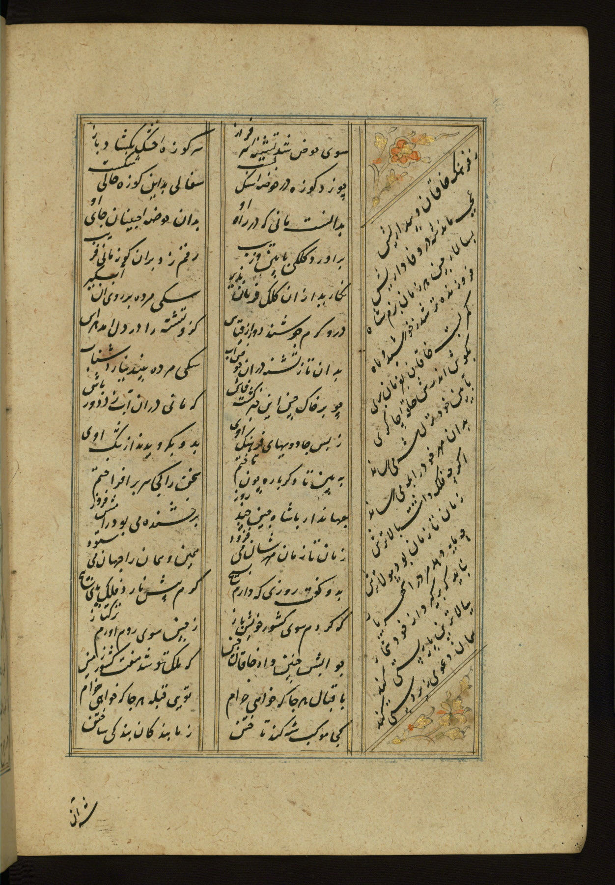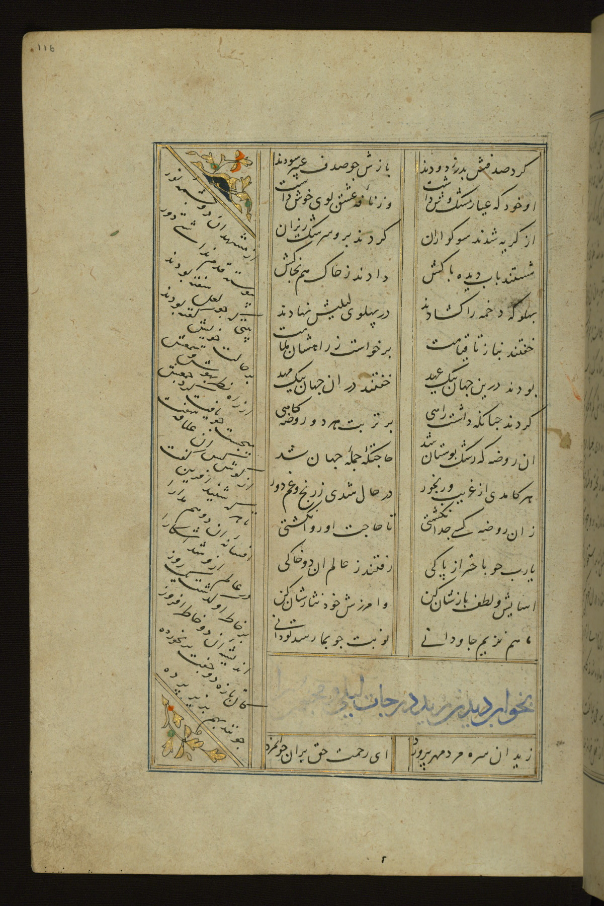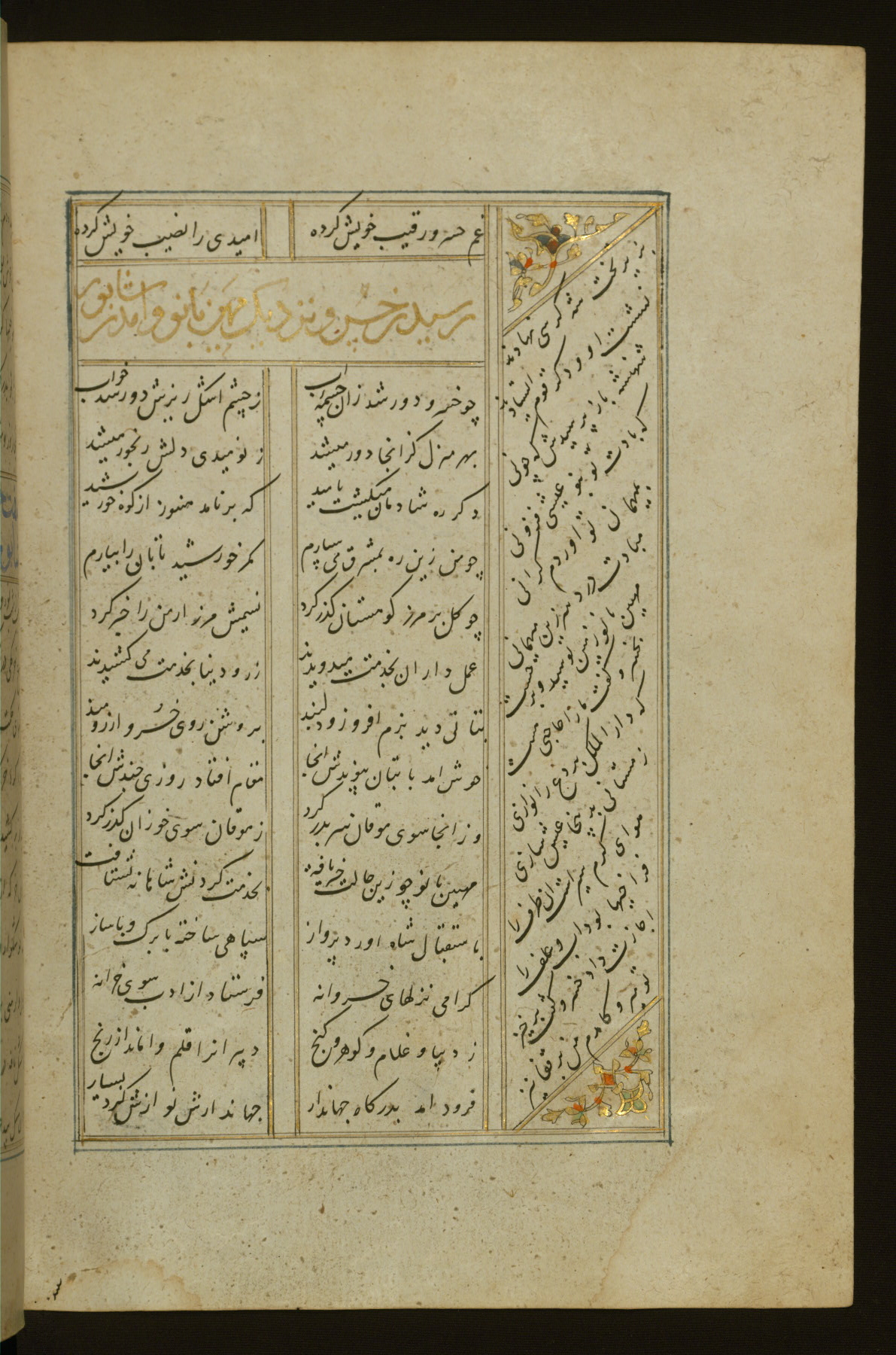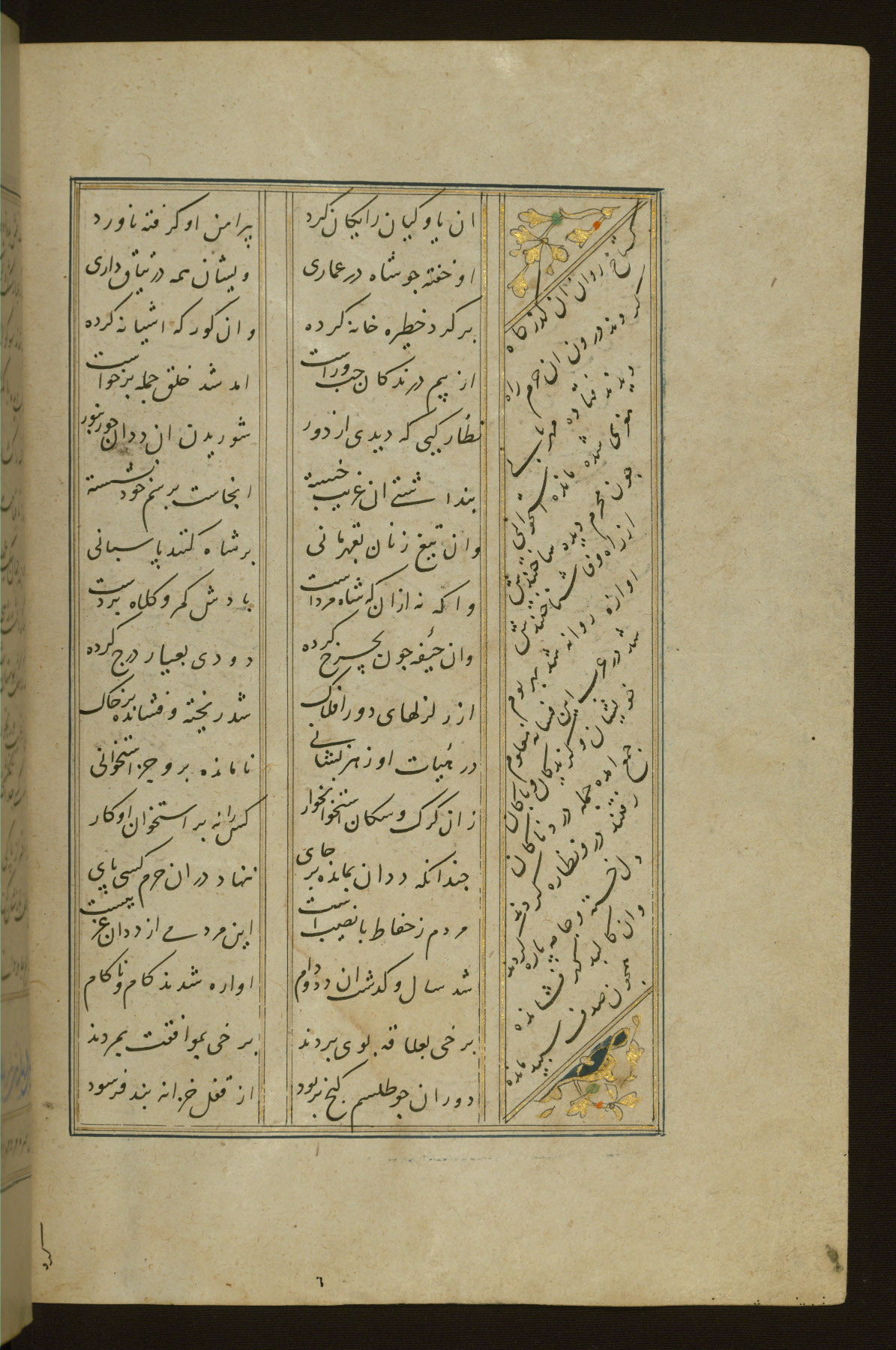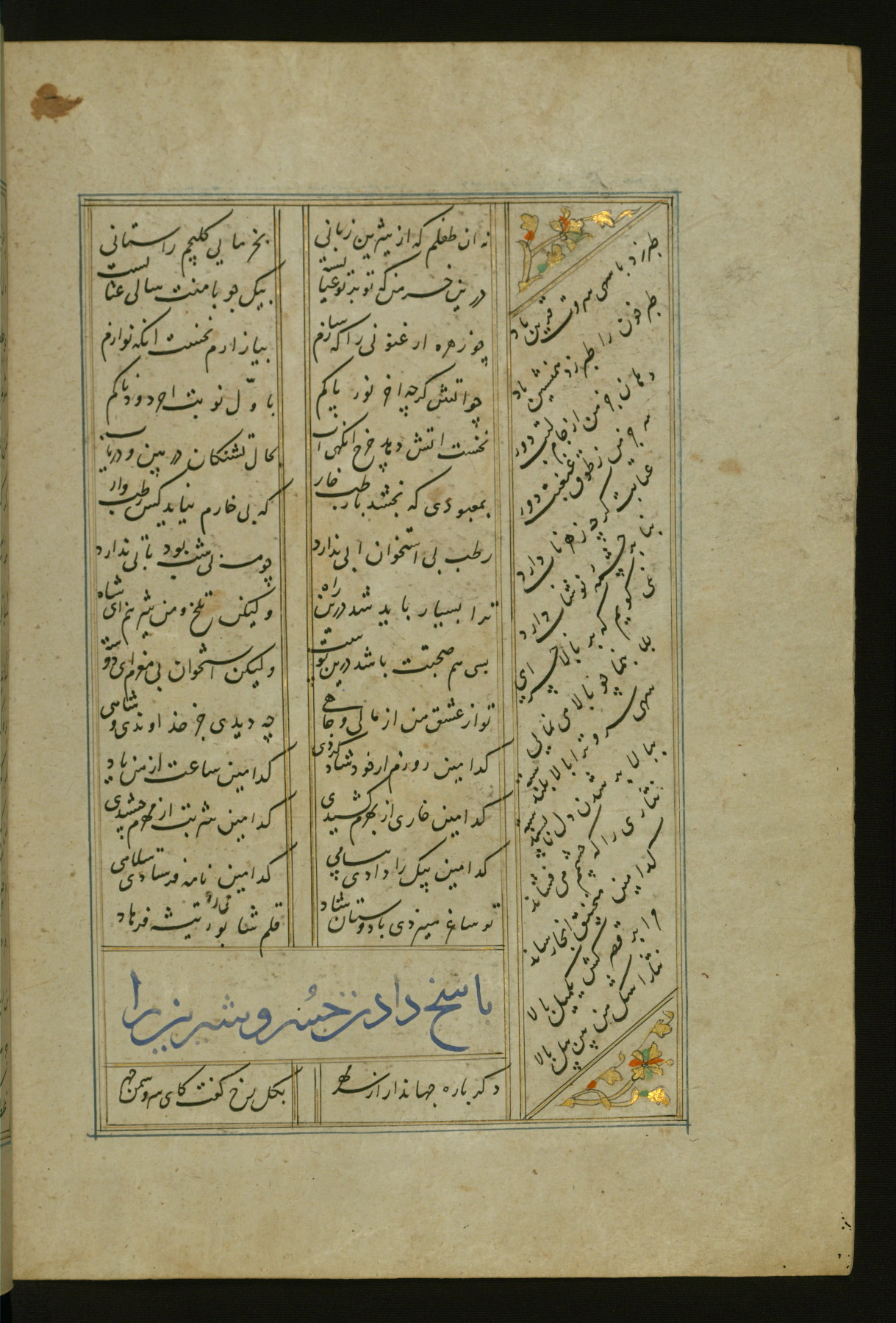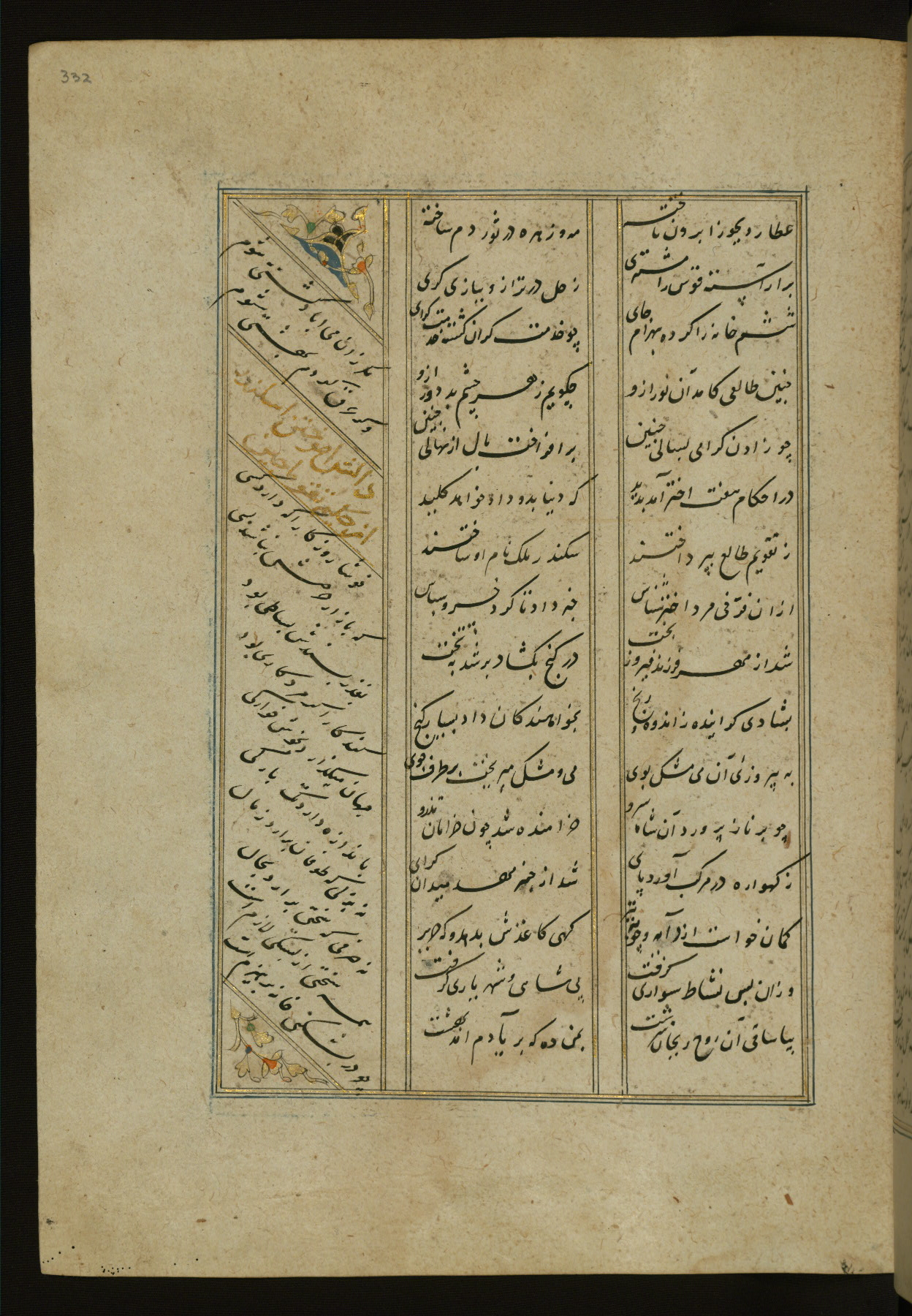 This copy of the Khamsah (quintet) of Niẓāmī Ganjavī (d. 605 AH / 1209 CE) was written by Abū Bakr Shāh ibn Ḥasan ibn ʿAlī al-Shahrastānī and illuminated by Jamāl al-Dīn ibn Muḥammad al-Ṣiddīqī al-Iṣfahānī between 892 AH / 1486 CE and 900 AH / 1494-5 CE. The manuscript opens with a double-page illuminated frontispiece with an inscription giving the title of the work and the name of the author (fols. 1b-2a). There are four illuminated titlepieces with the names of the individual poems and twenty-six repainted illustrations. According to evidence supplied by the colophons, the original binding was by the hand of Jamāl al-Dīn ibn Muḥammad al-Ṣiddīqī al-Iṣfahānī, as well. Unfortunately, it has not survived. The binding presently attached to the manuscript dates to the twelfth century AH / eighteenth CE.