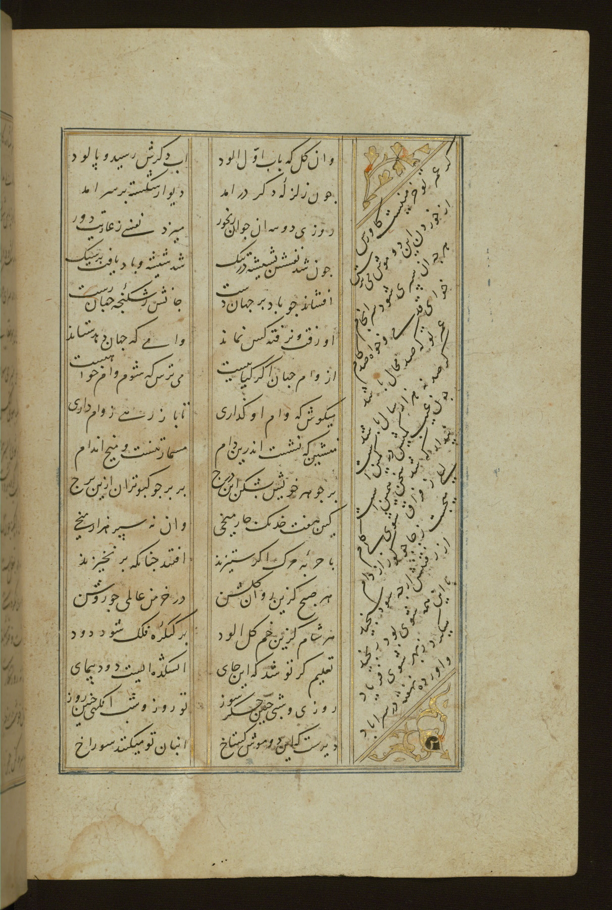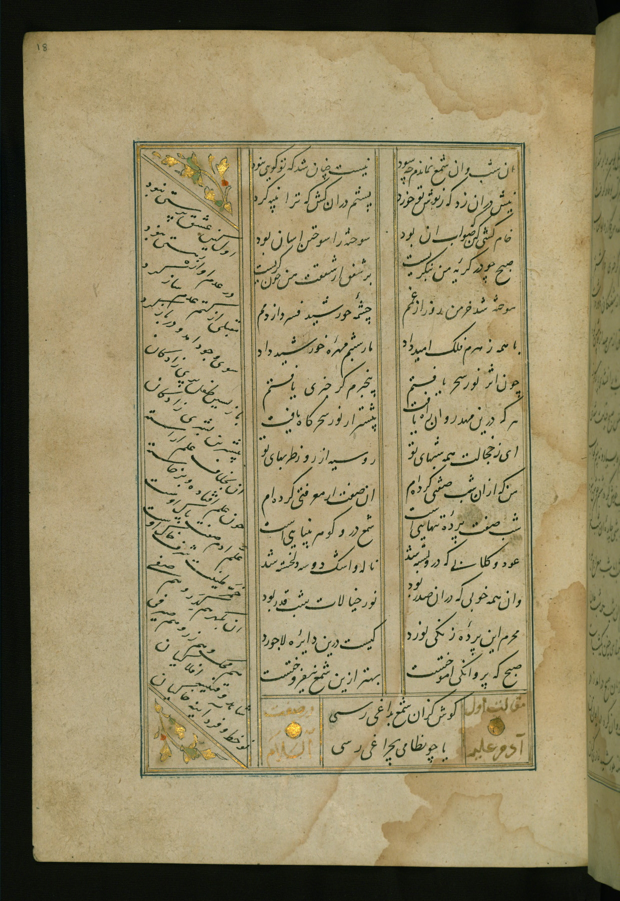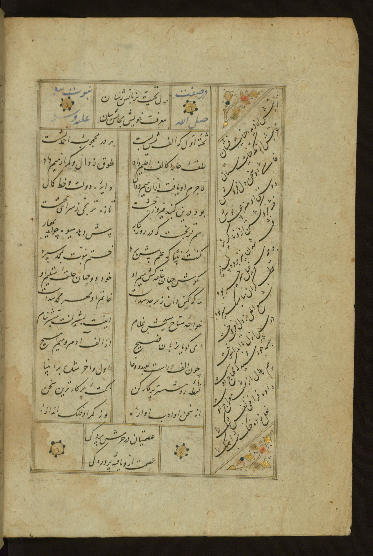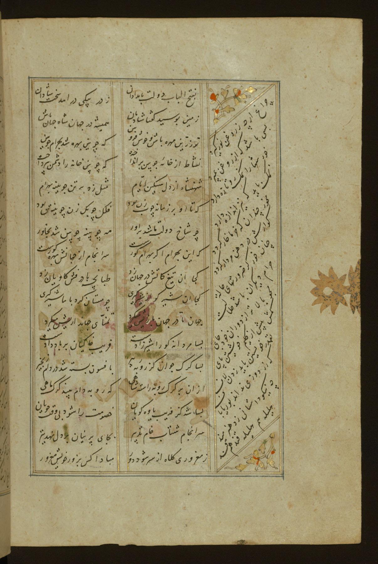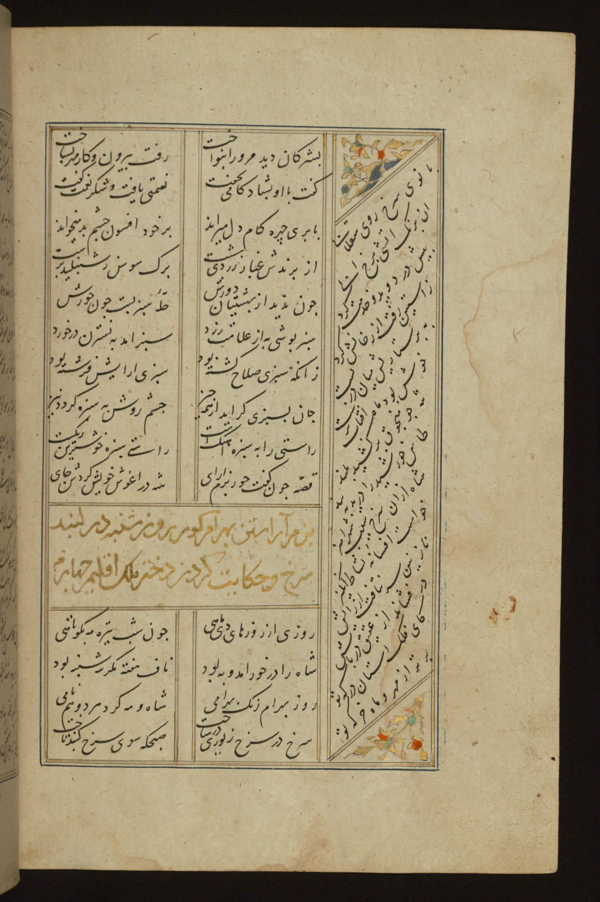 This copy of the Khamsah (quintet) of Niẓāmī Ganjavī (d. 605 AH / 1209 CE) was written by Abū Bakr Shāh ibn Ḥasan ibn ʿAlī al-Shahrastānī and illuminated by Jamāl al-Dīn ibn Muḥammad al-Ṣiddīqī al-Iṣfahānī between 892 AH / 1486 CE and 900 AH / 1494-5 CE. The manuscript opens with a double-page illuminated frontispiece with an inscription giving the title of the work and the name of the author (fols. 1b-2a). There are four illuminated titlepieces with the names of the individual poems and twenty-six repainted illustrations. According to evidence supplied by the colophons, the original binding was by the hand of Jamāl al-Dīn ibn Muḥammad al-Ṣiddīqī al-Iṣfahānī, as well. Unfortunately, it has not survived. The binding presently attached to the manuscript dates to the twelfth century AH / eighteenth CE.