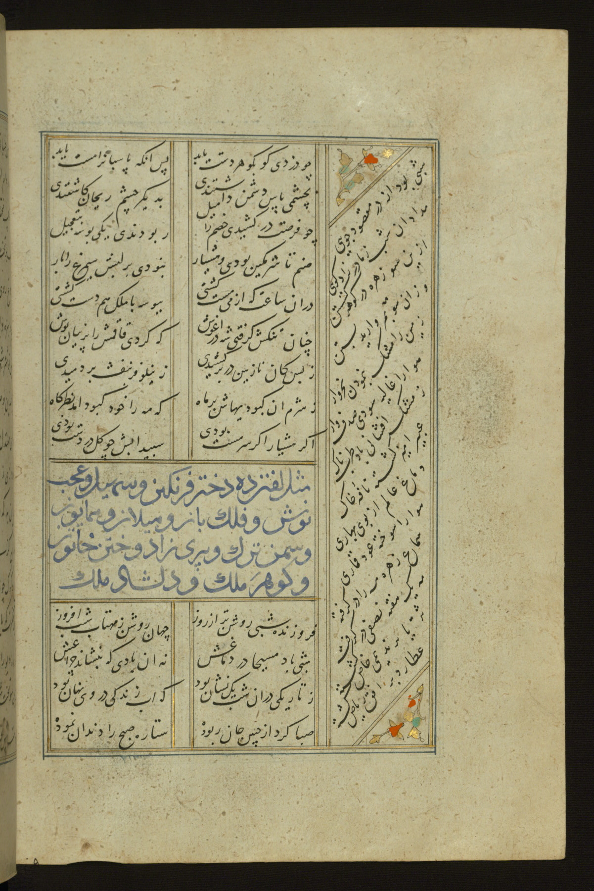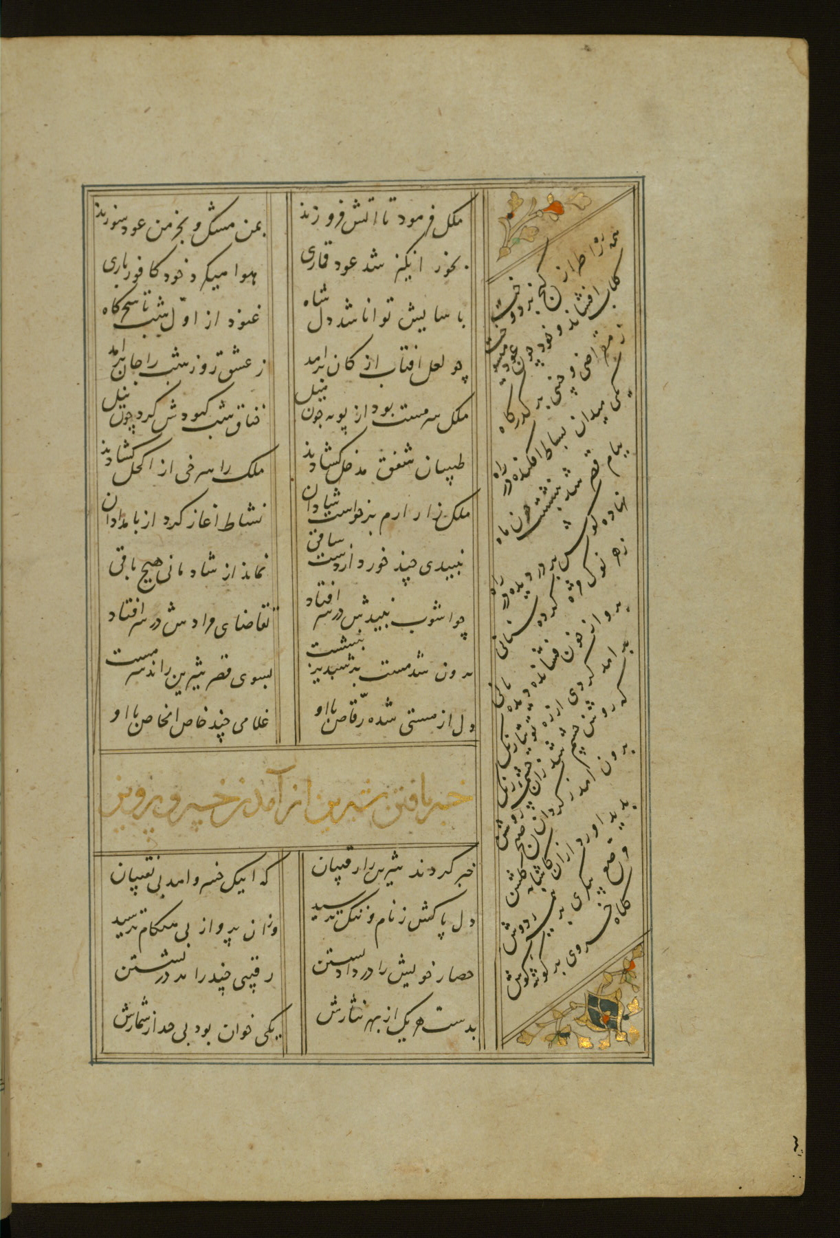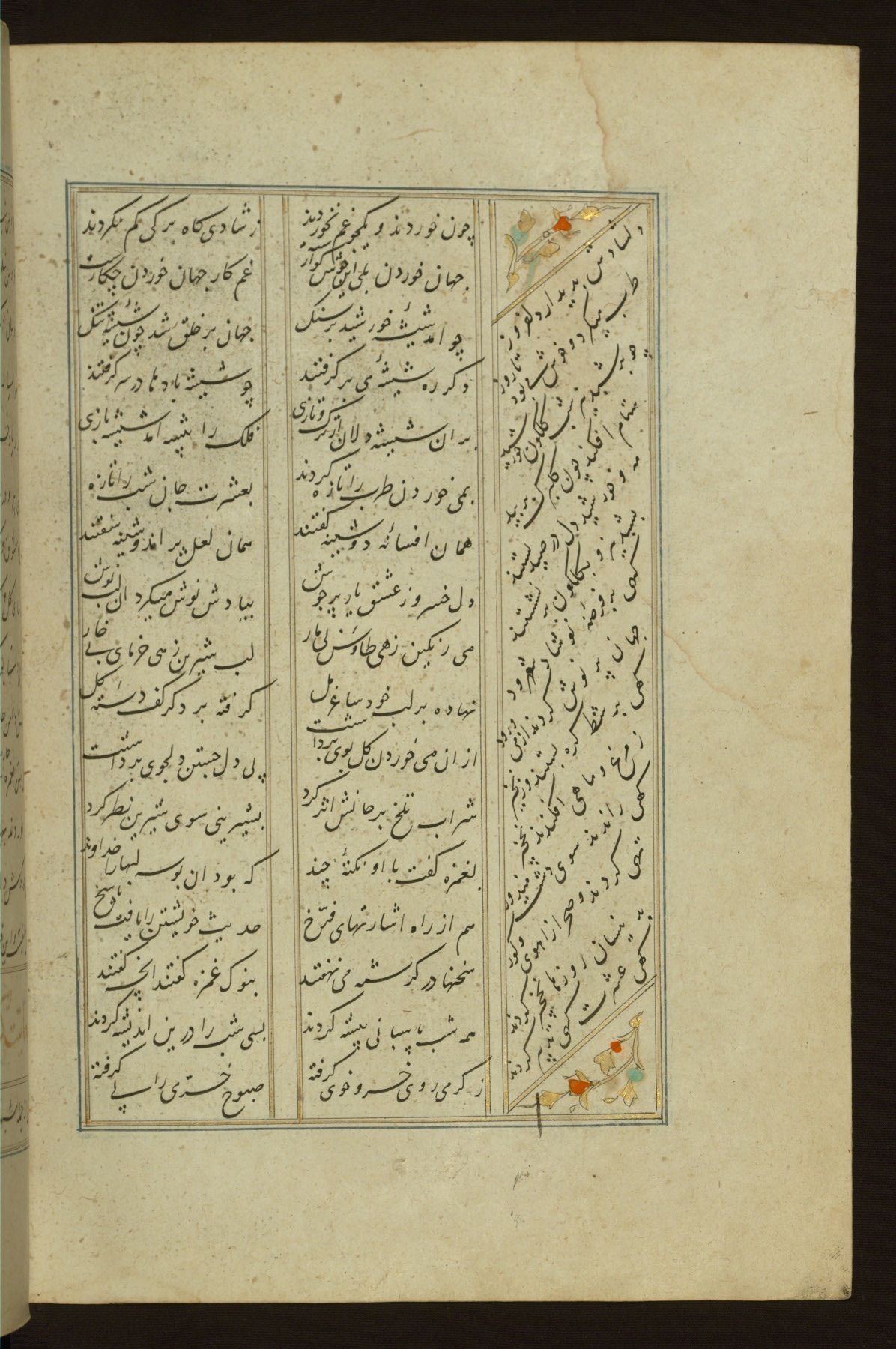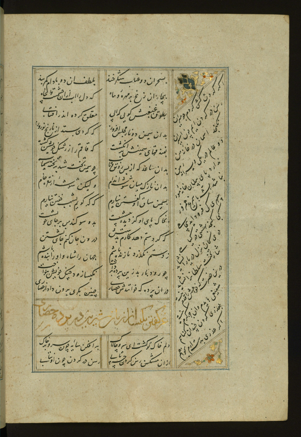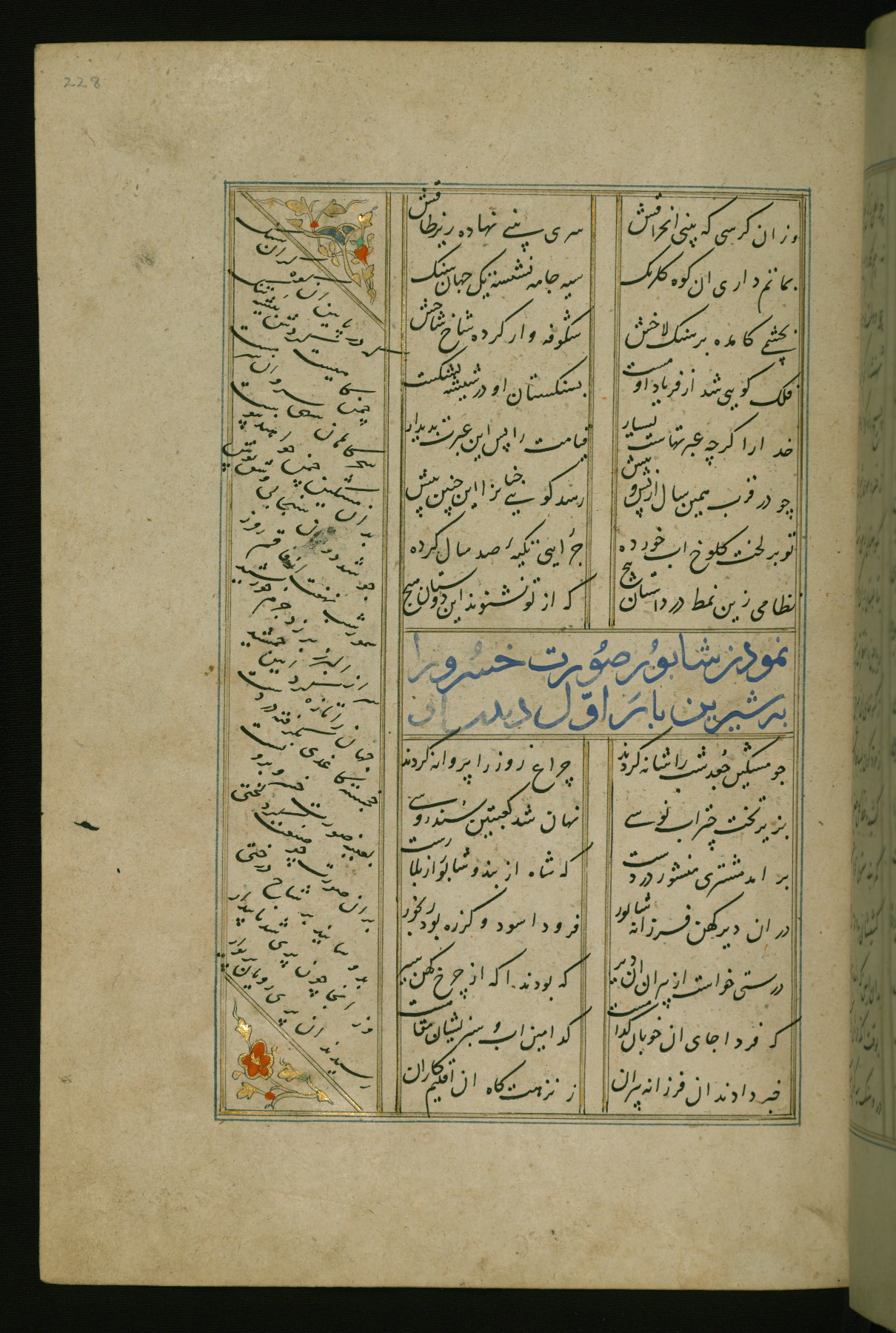 This copy of the Khamsah (quintet) of Niẓāmī Ganjavī (d. 605 AH / 1209 CE) was written by Abū Bakr Shāh ibn Ḥasan ibn ʿAlī al-Shahrastānī and illuminated by Jamāl al-Dīn ibn Muḥammad al-Ṣiddīqī al-Iṣfahānī between 892 AH / 1486 CE and 900 AH / 1494-5 CE. The manuscript opens with a double-page illuminated frontispiece with an inscription giving the title of the work and the name of the author (fols. 1b-2a). There are four illuminated titlepieces with the names of the individual poems and twenty-six repainted illustrations. According to evidence supplied by the colophons, the original binding was by the hand of Jamāl al-Dīn ibn Muḥammad al-Ṣiddīqī al-Iṣfahānī, as well. Unfortunately, it has not survived. The binding presently attached to the manuscript dates to the twelfth century AH / eighteenth CE.