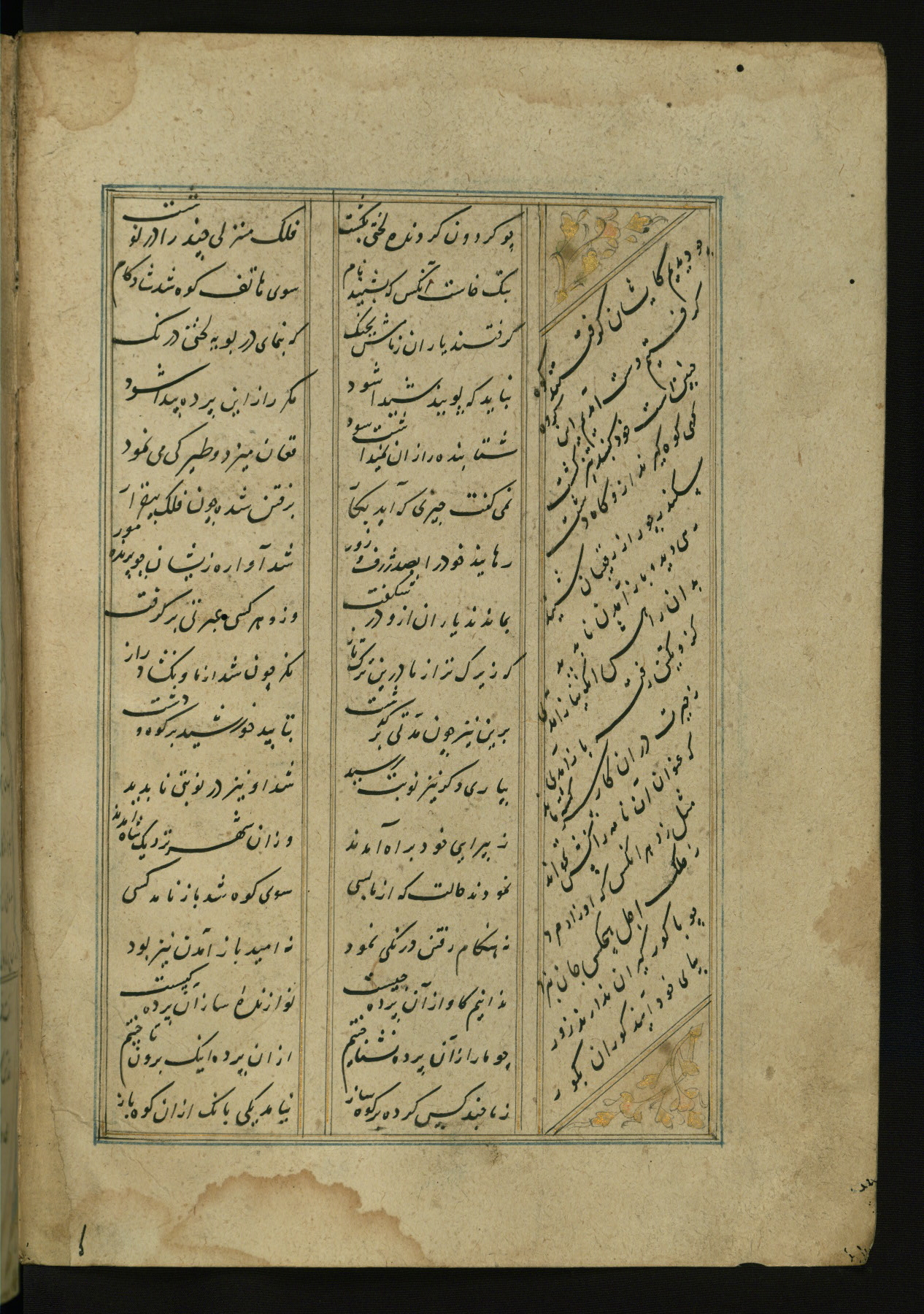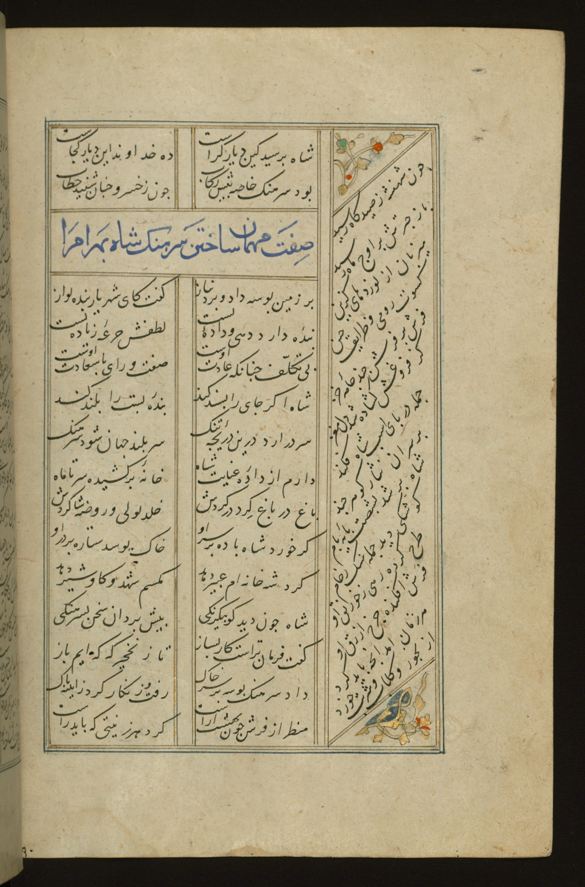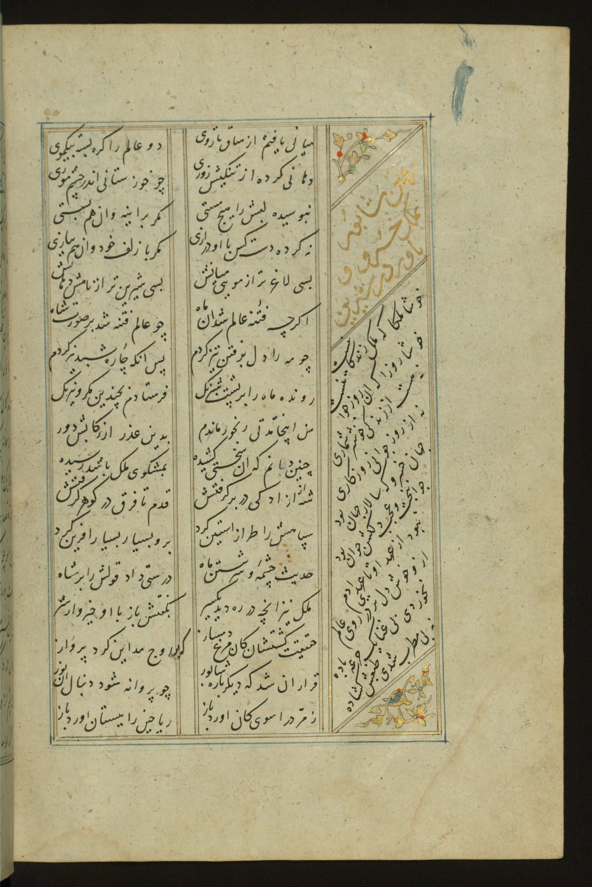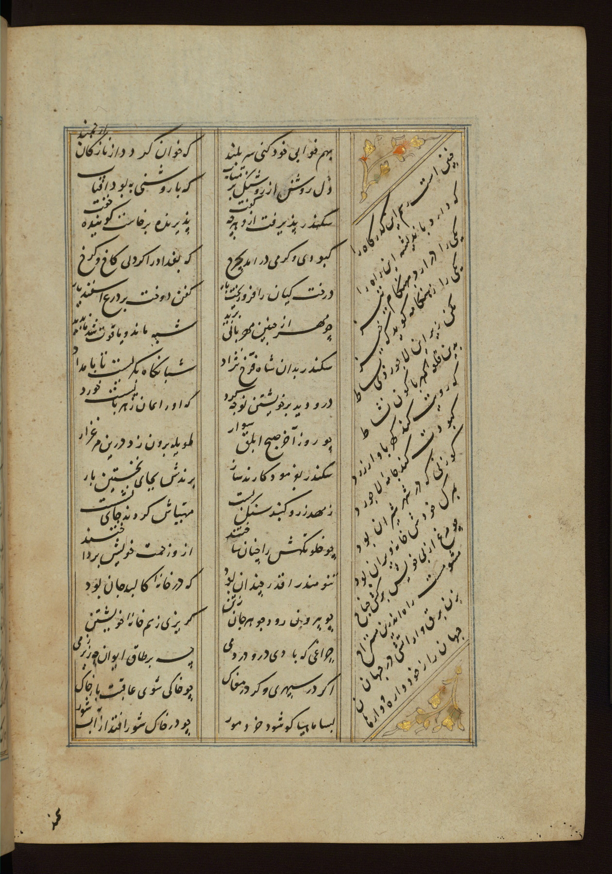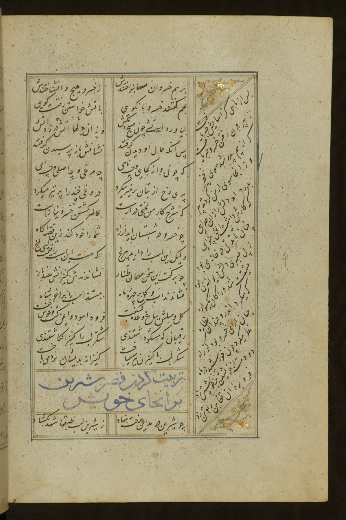This copy of the Khamsah (quintet) of Niẓāmī Ganjavī (d. 605 AH / 1209 CE) was written by Abū Bakr Shāh ibn Ḥasan ibn ʿAlī al-Shahrastānī and illuminated by Jamāl al-Dīn ibn Muḥammad al-Ṣiddīqī al-Iṣfahānī between 892 AH / 1486 CE and 900 AH / 1494-5 CE. The manuscript opens with a double-page illuminated frontispiece with an inscription giving the title of the work and the name of the author (fols. 1b-2a). There are four illuminated titlepieces with the names of the individual poems and twenty-six repainted illustrations. According to evidence supplied by the colophons, the original binding was by the hand of Jamāl al-Dīn ibn Muḥammad al-Ṣiddīqī al-Iṣfahānī, as well. Unfortunately, it has not survived. The binding presently attached to the manuscript dates to the twelfth century AH / eighteenth CE.