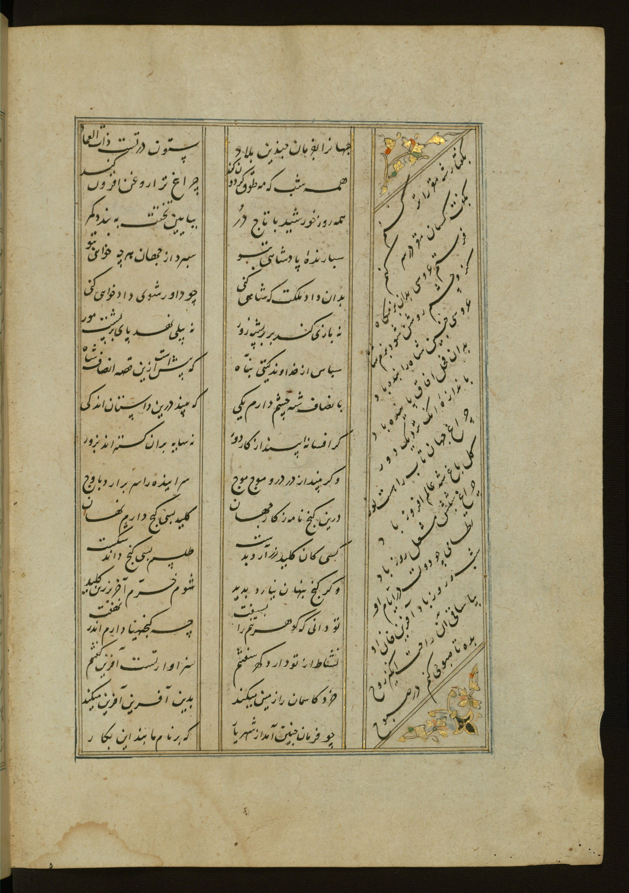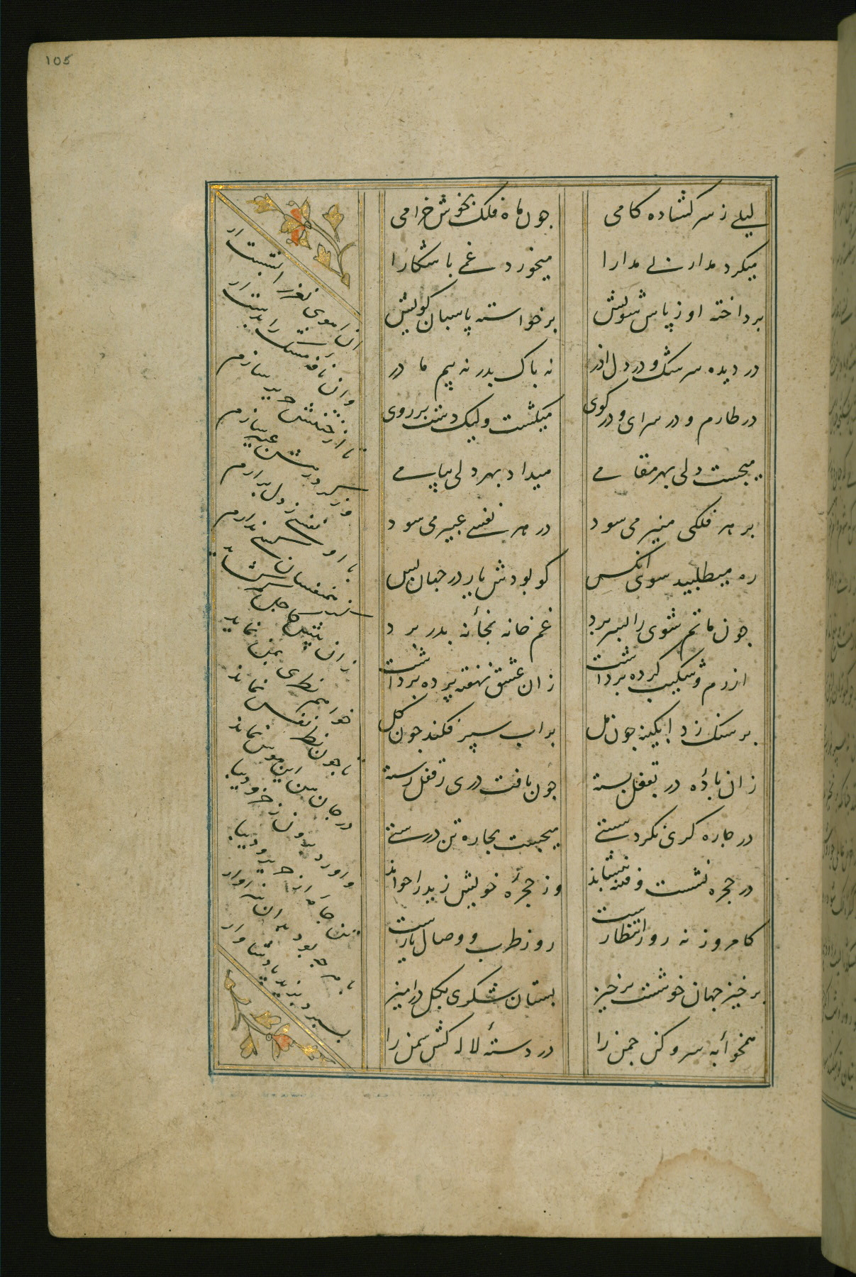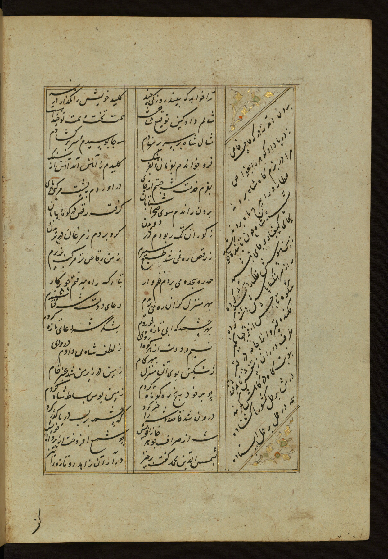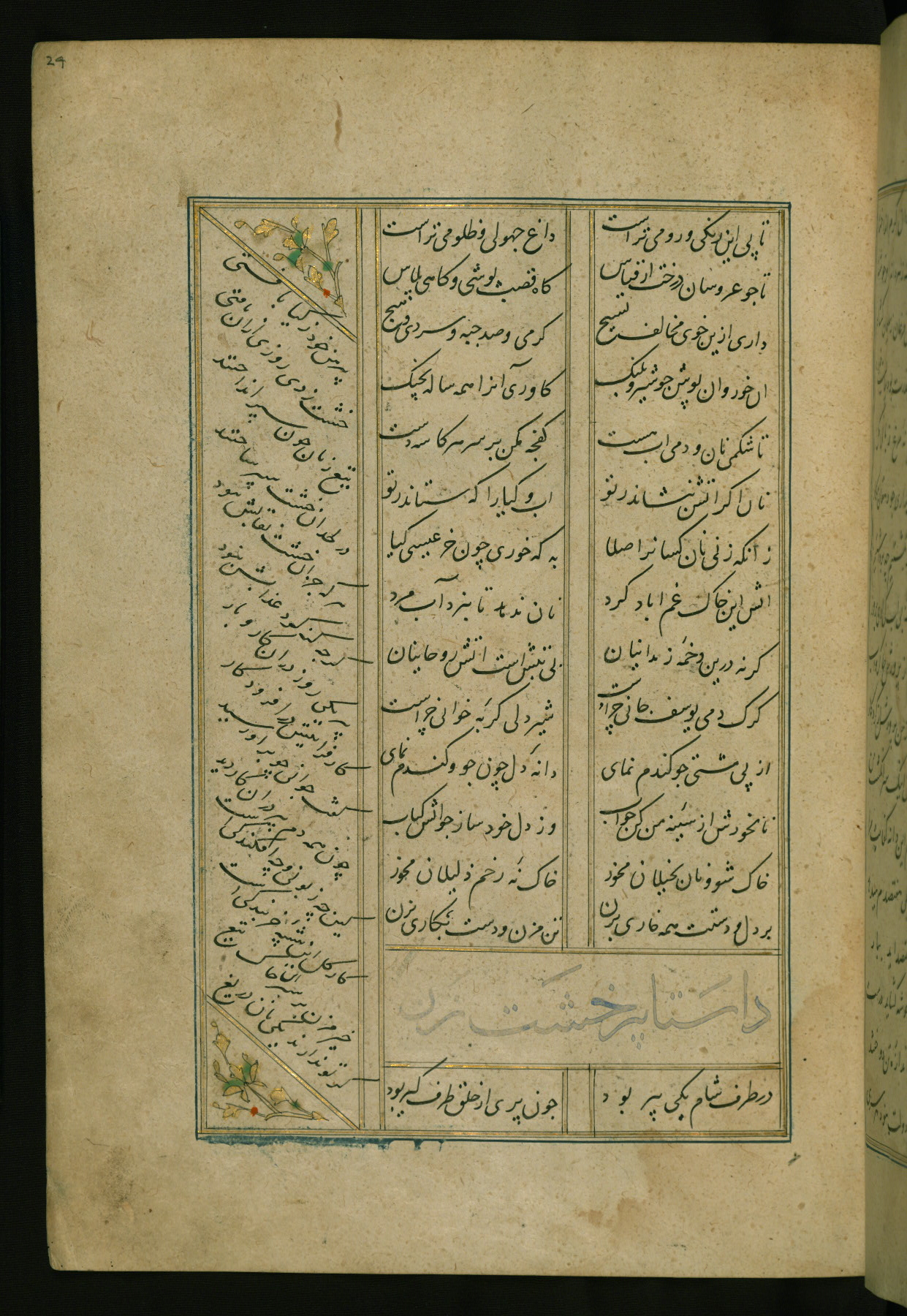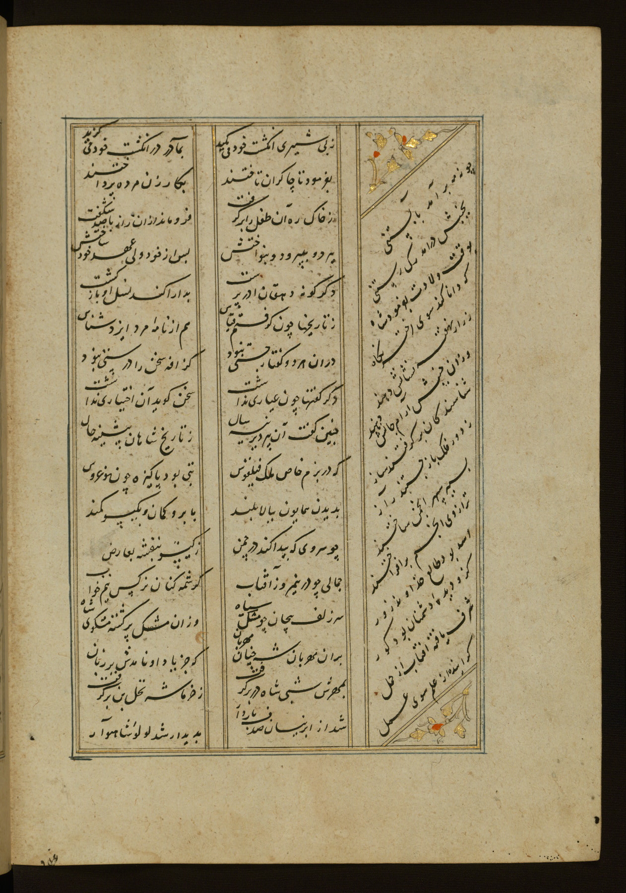This copy of the Khamsah (quintet) of Niẓāmī Ganjavī (d. 605 AH / 1209 CE) was written by Abū Bakr Shāh ibn Ḥasan ibn ʿAlī al-Shahrastānī and illuminated by Jamāl al-Dīn ibn Muḥammad al-Ṣiddīqī al-Iṣfahānī between 892 AH / 1486 CE and 900 AH / 1494-5 CE. The manuscript opens with a double-page illuminated frontispiece with an inscription giving the title of the work and the name of the author (fols. 1b-2a). There are four illuminated titlepieces with the names of the individual poems and twenty-six repainted illustrations. According to evidence supplied by the colophons, the original binding was by the hand of Jamāl al-Dīn ibn Muḥammad al-Ṣiddīqī al-Iṣfahānī, as well. Unfortunately, it has not survived. The binding presently attached to the manuscript dates to the twelfth century AH / eighteenth CE.