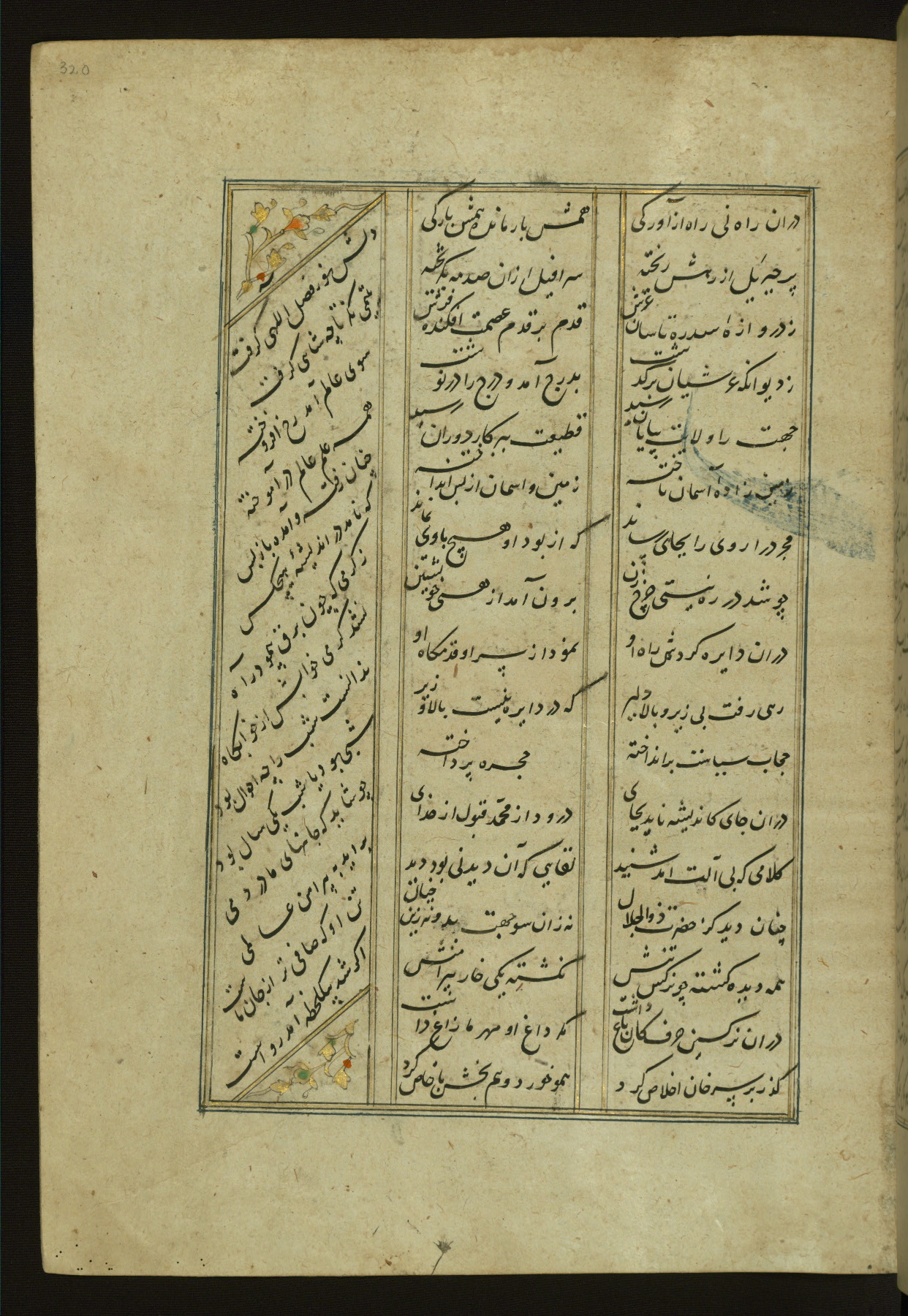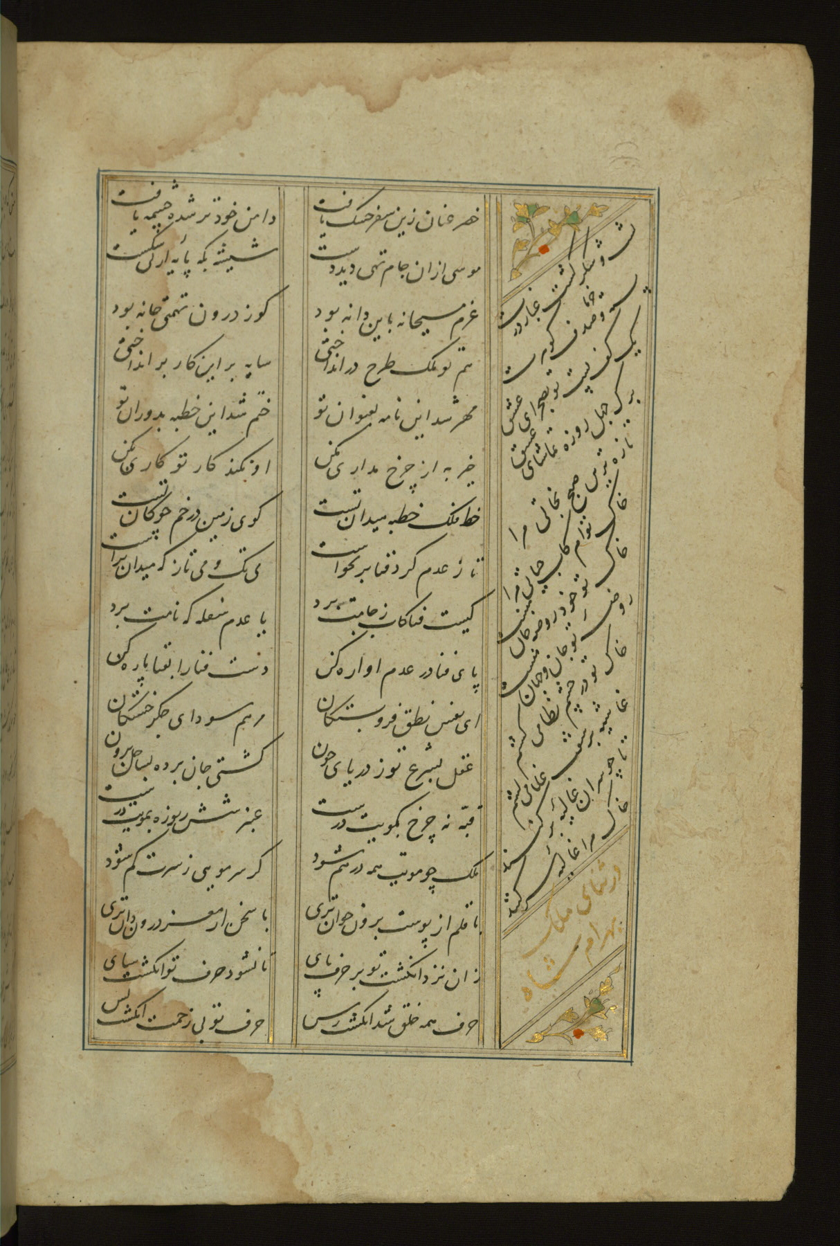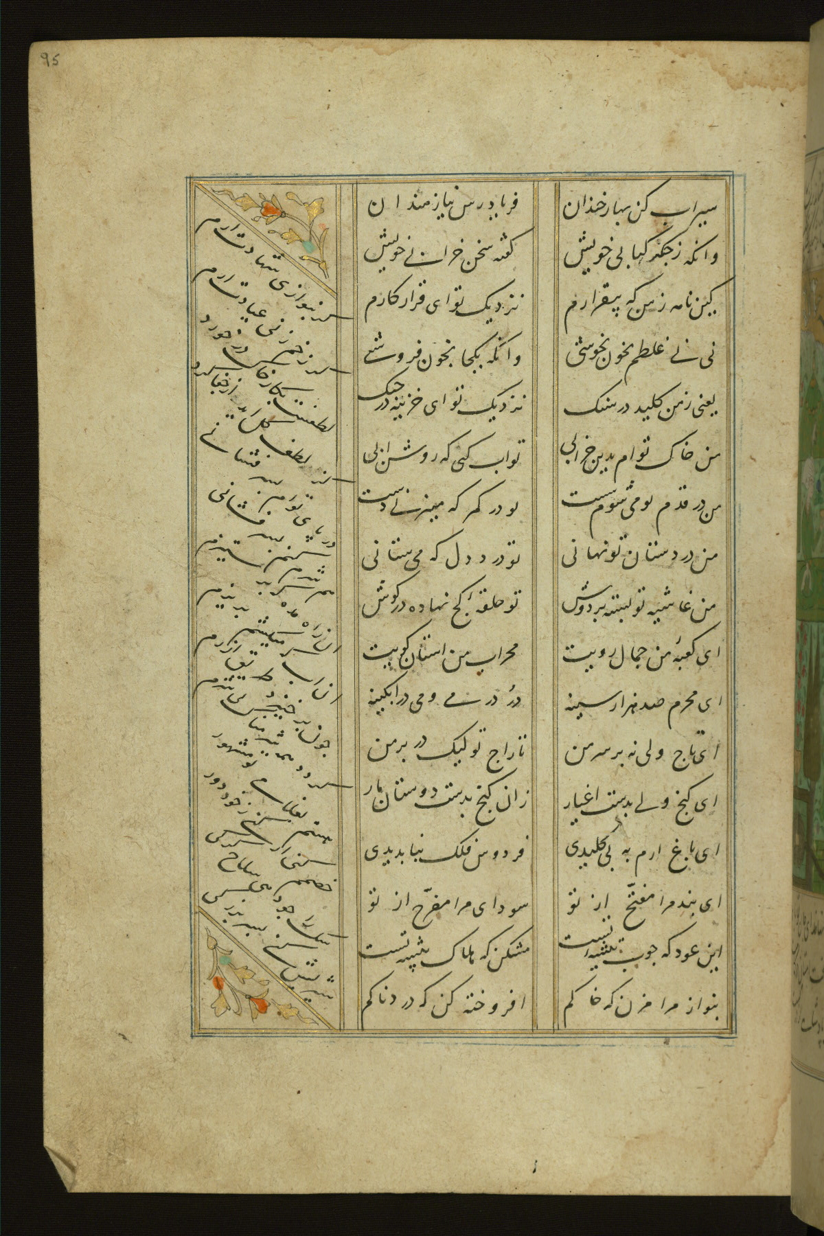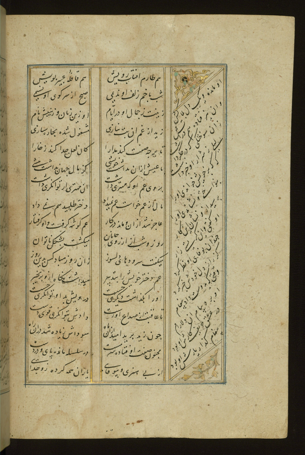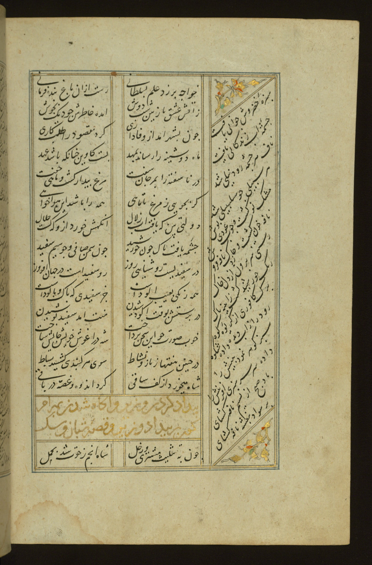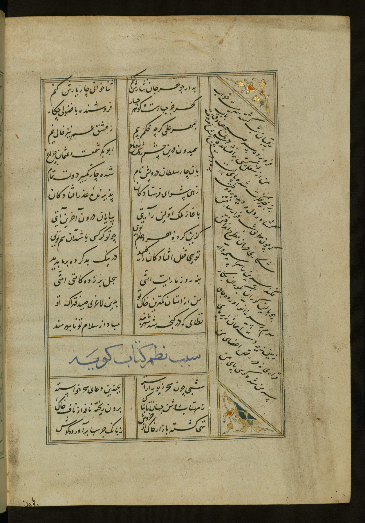This copy of the Khamsah (quintet) of Niẓāmī Ganjavī (d. 605 AH / 1209 CE) was written by Abū Bakr Shāh ibn Ḥasan ibn ʿAlī al-Shahrastānī and illuminated by Jamāl al-Dīn ibn Muḥammad al-Ṣiddīqī al-Iṣfahānī between 892 AH / 1486 CE and 900 AH / 1494-5 CE. The manuscript opens with a double-page illuminated frontispiece with an inscription giving the title of the work and the name of the author (fols. 1b-2a). There are four illuminated titlepieces with the names of the individual poems and twenty-six repainted illustrations. According to evidence supplied by the colophons, the original binding was by the hand of Jamāl al-Dīn ibn Muḥammad al-Ṣiddīqī al-Iṣfahānī, as well. Unfortunately, it has not survived. The binding presently attached to the manuscript dates to the twelfth century AH / eighteenth CE.