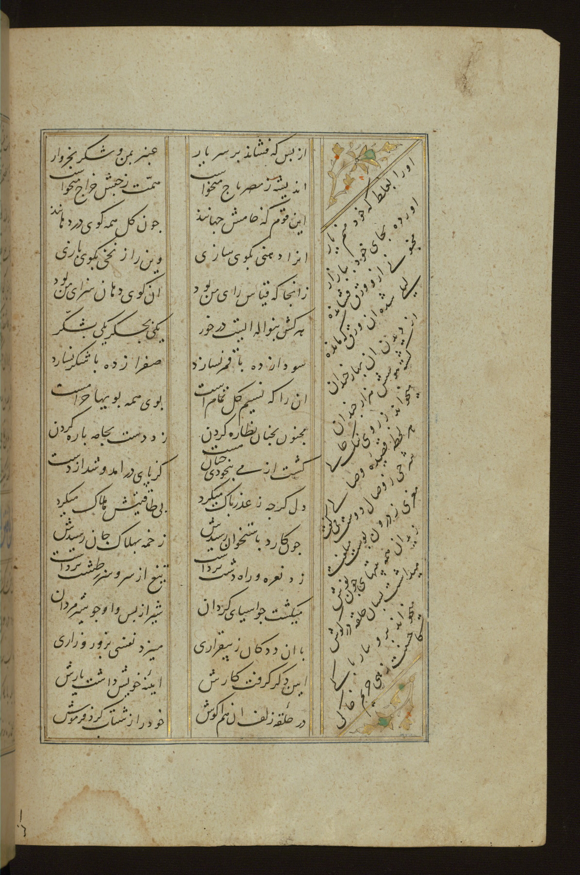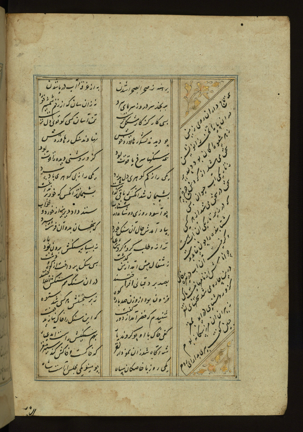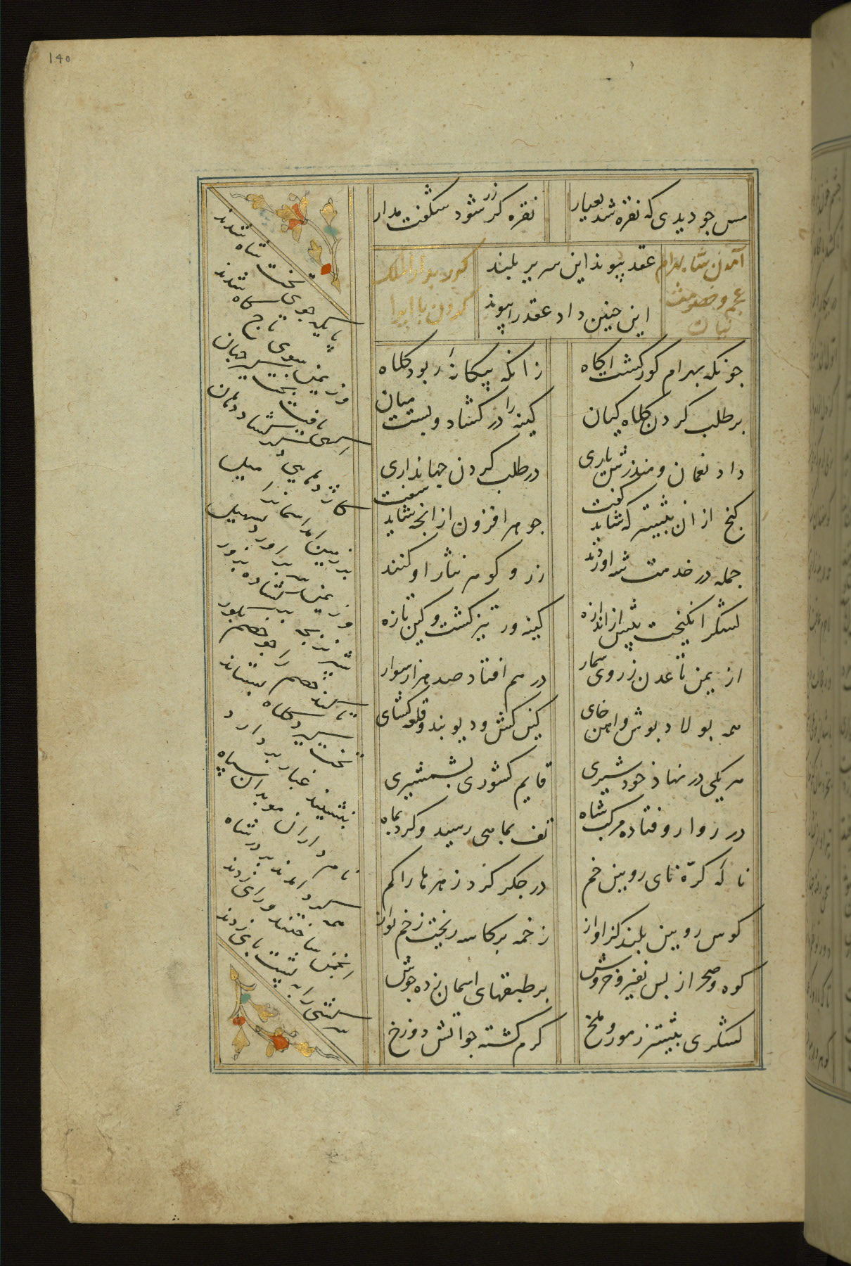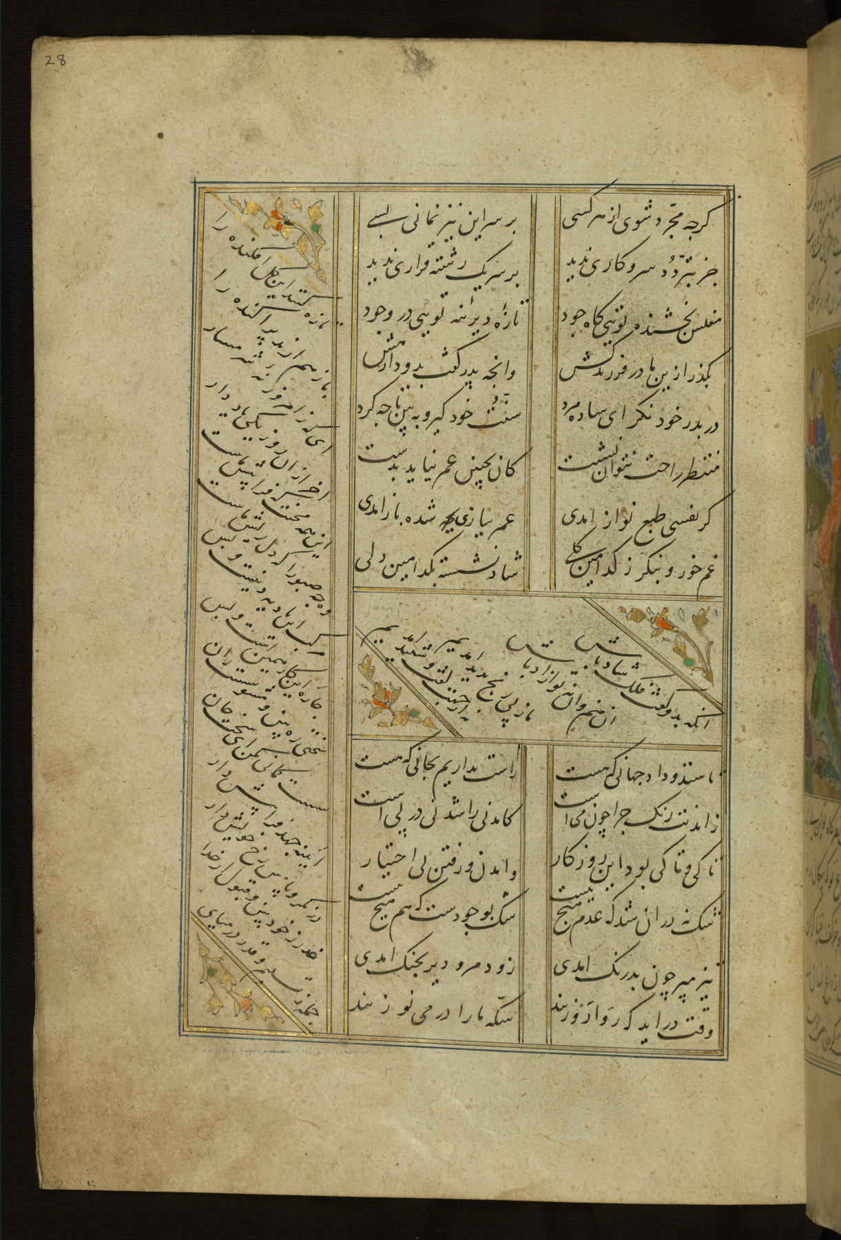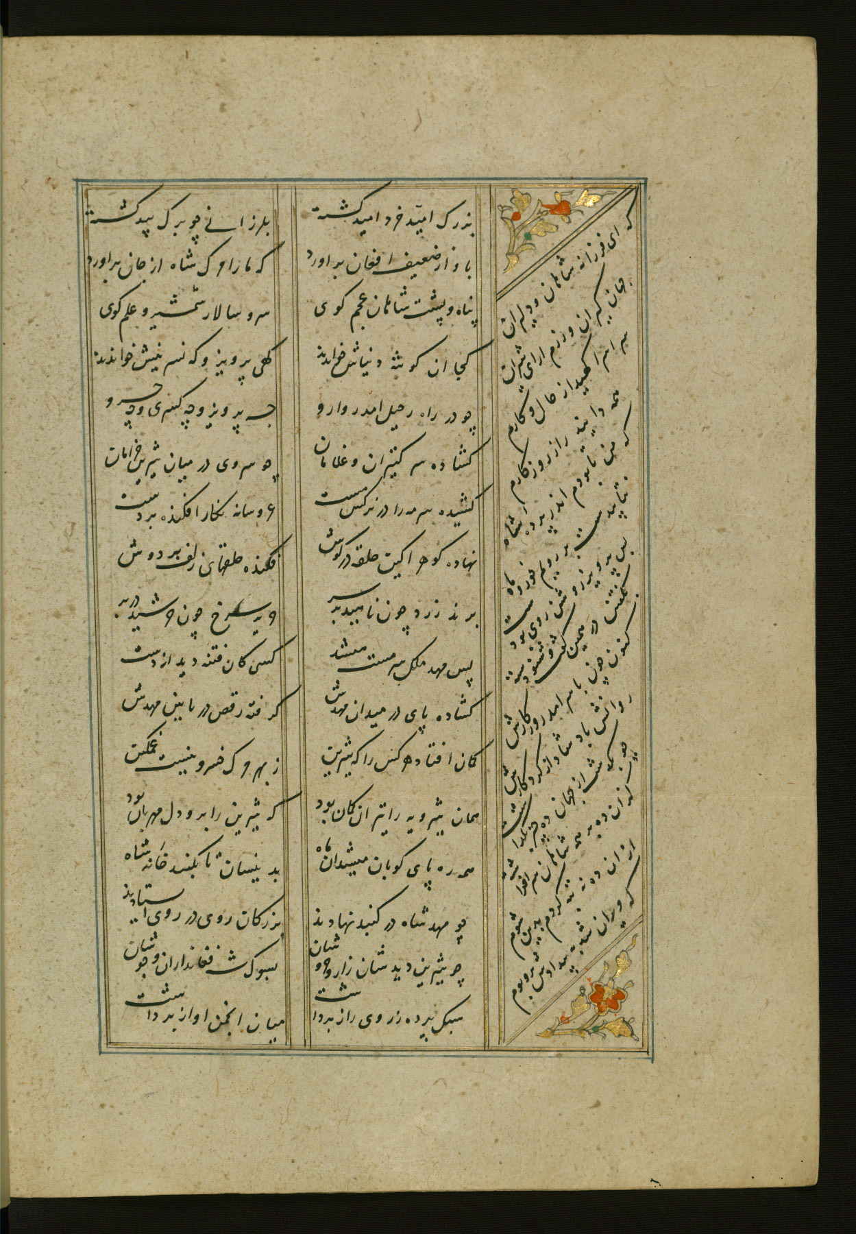This copy of the Khamsah (quintet) of Niẓāmī Ganjavī (d. 605 AH / 1209 CE) was written by Abū Bakr Shāh ibn Ḥasan ibn ʿAlī al-Shahrastānī and illuminated by Jamāl al-Dīn ibn Muḥammad al-Ṣiddīqī al-Iṣfahānī between 892 AH / 1486 CE and 900 AH / 1494-5 CE. The manuscript opens with a double-page illuminated frontispiece with an inscription giving the title of the work and the name of the author (fols. 1b-2a). There are four illuminated titlepieces with the names of the individual poems and twenty-six repainted illustrations. According to evidence supplied by the colophons, the original binding was by the hand of Jamāl al-Dīn ibn Muḥammad al-Ṣiddīqī al-Iṣfahānī, as well. Unfortunately, it has not survived. The binding presently attached to the manuscript dates to the twelfth century AH / eighteenth CE.