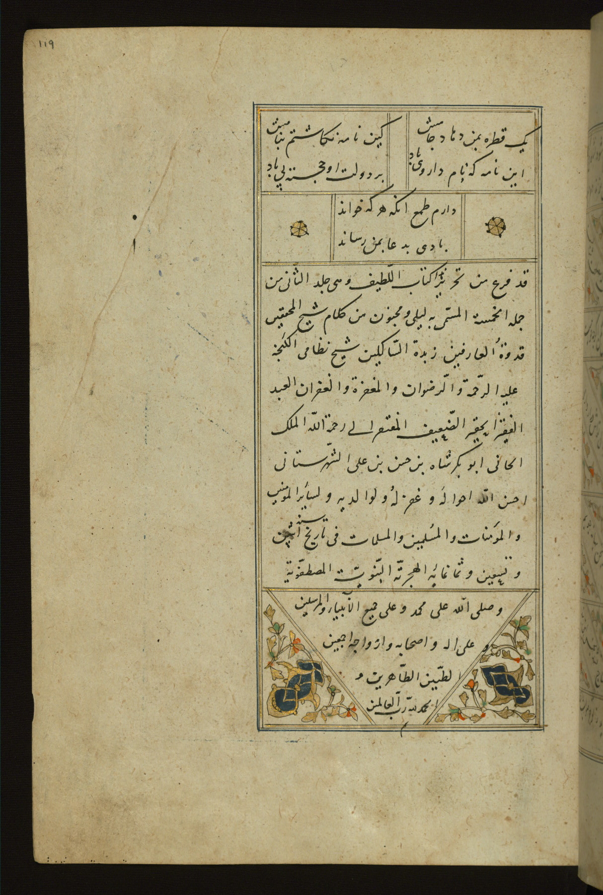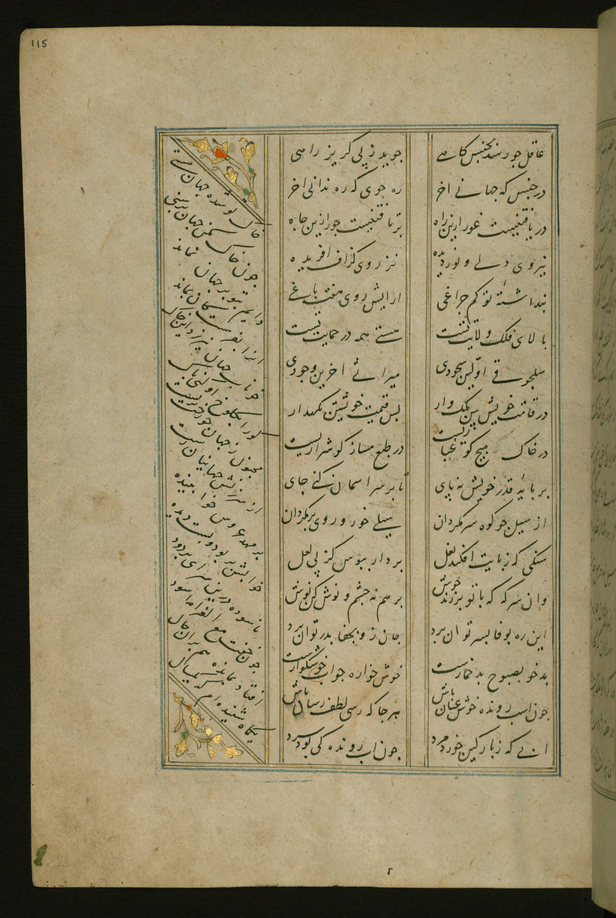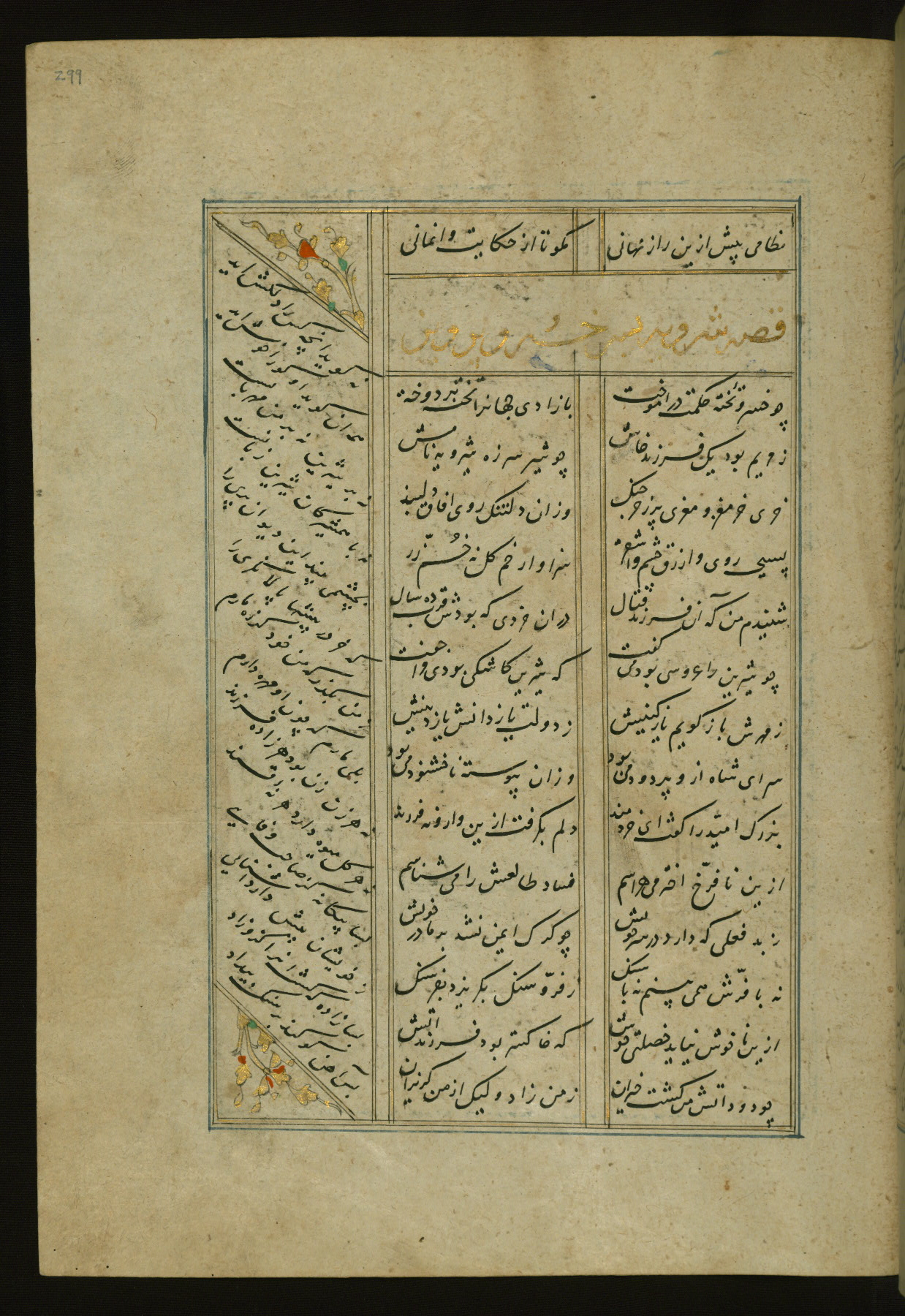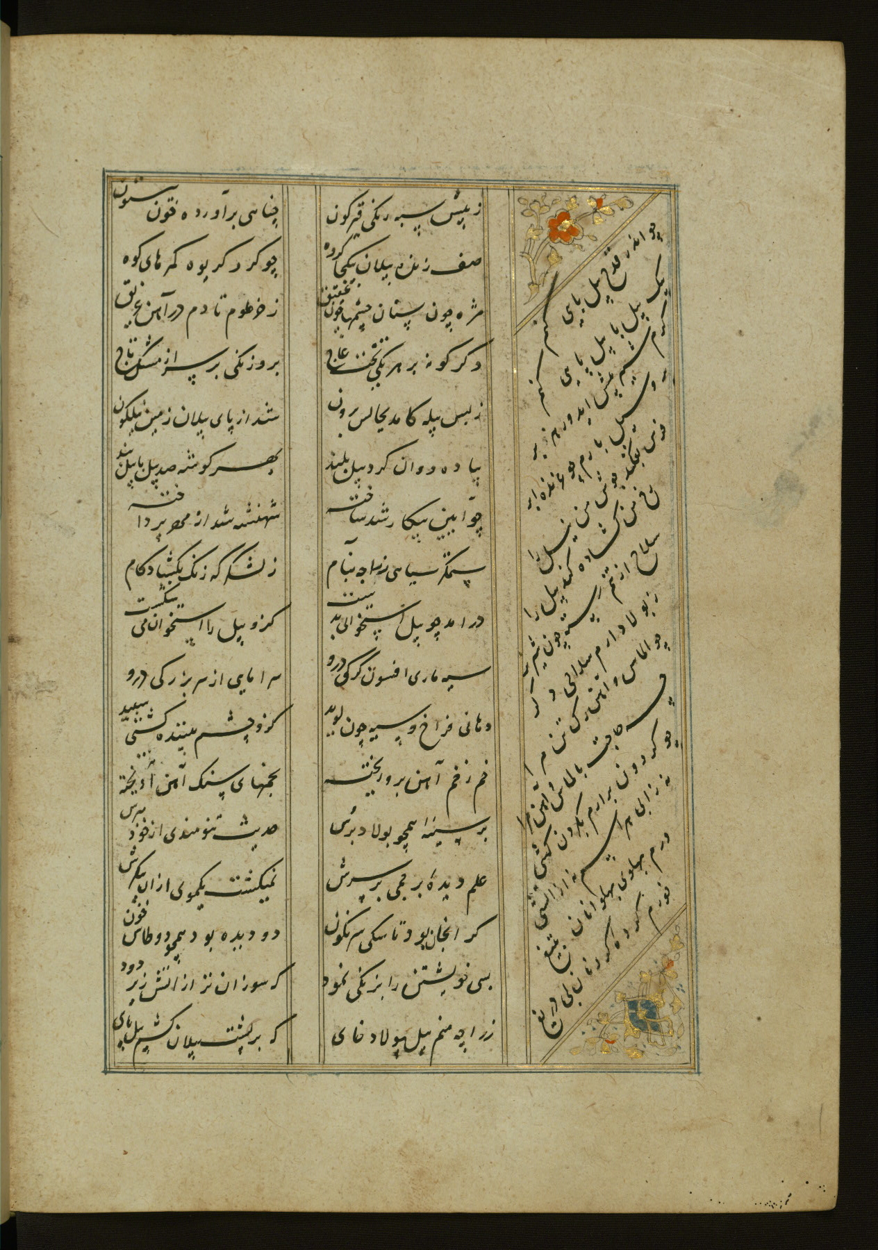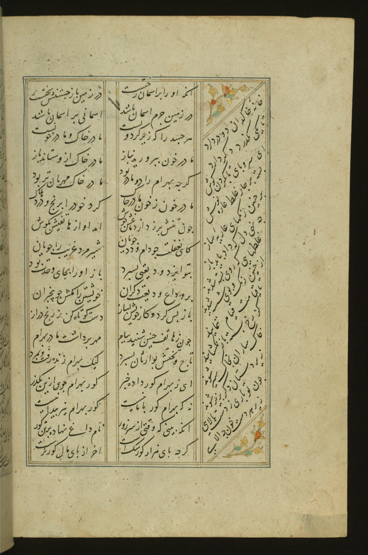 This copy of the Khamsah (quintet) of Niẓāmī Ganjavī (d. 605 AH / 1209 CE) was written by Abū Bakr Shāh ibn Ḥasan ibn ʿAlī al-Shahrastānī and illuminated by Jamāl al-Dīn ibn Muḥammad al-Ṣiddīqī al-Iṣfahānī between 892 AH / 1486 CE and 900 AH / 1494-5 CE. The manuscript opens with a double-page illuminated frontispiece with an inscription giving the title of the work and the name of the author (fols. 1b-2a). There are four illuminated titlepieces with the names of the individual poems and twenty-six repainted illustrations. According to evidence supplied by the colophons, the original binding was by the hand of Jamāl al-Dīn ibn Muḥammad al-Ṣiddīqī al-Iṣfahānī, as well. Unfortunately, it has not survived. The binding presently attached to the manuscript dates to the twelfth century AH / eighteenth CE.