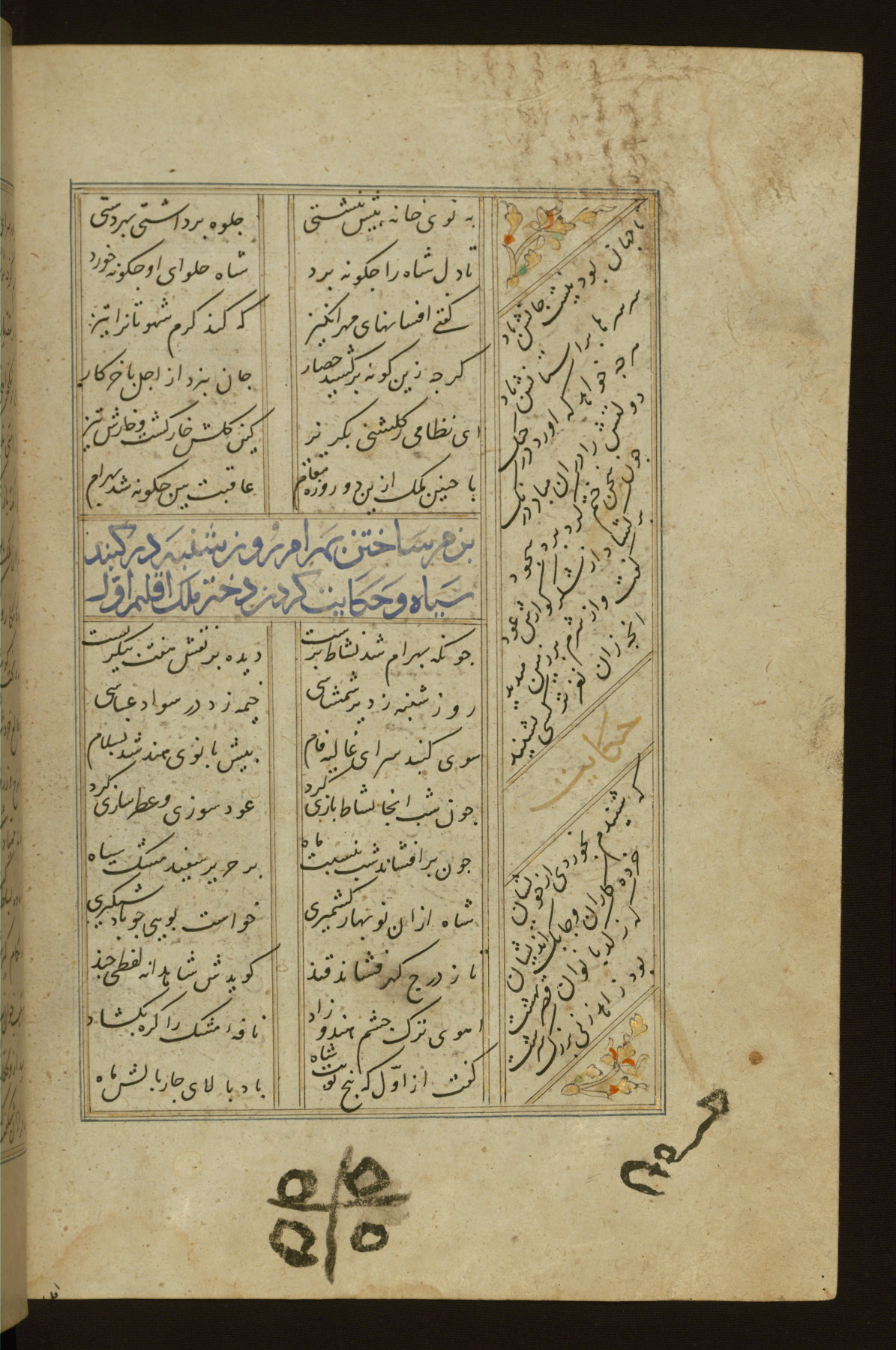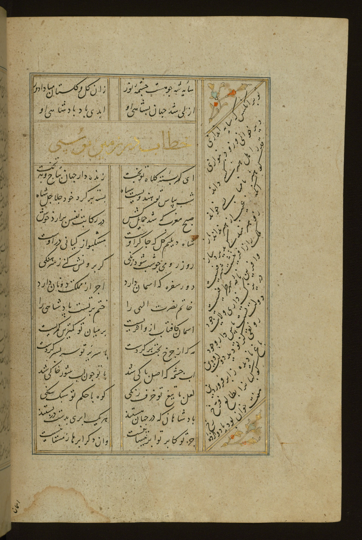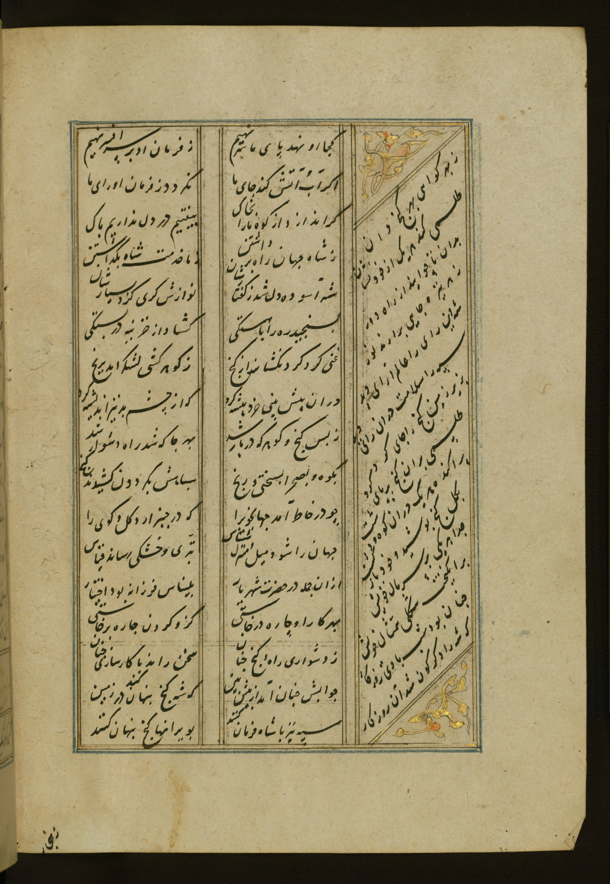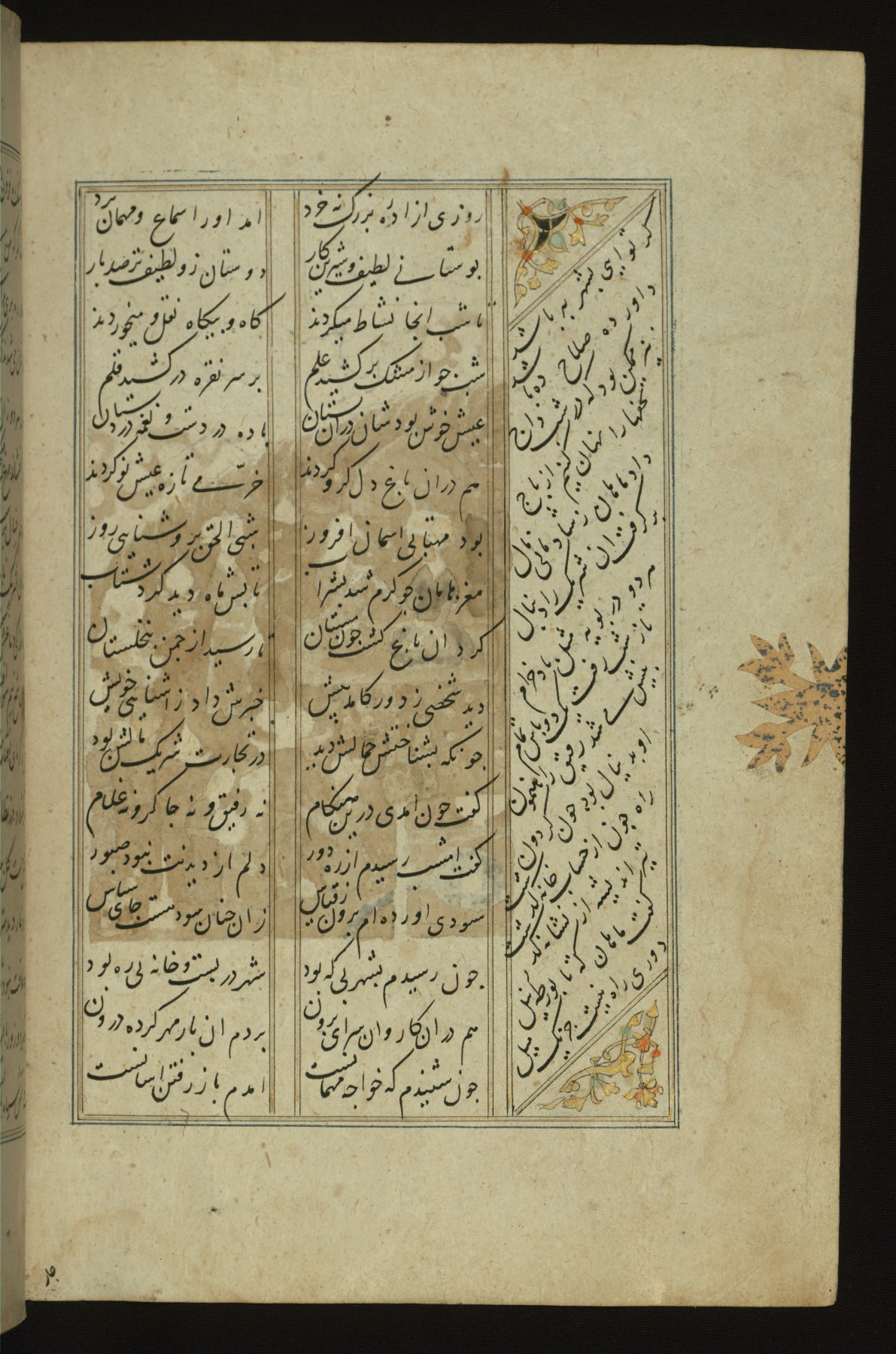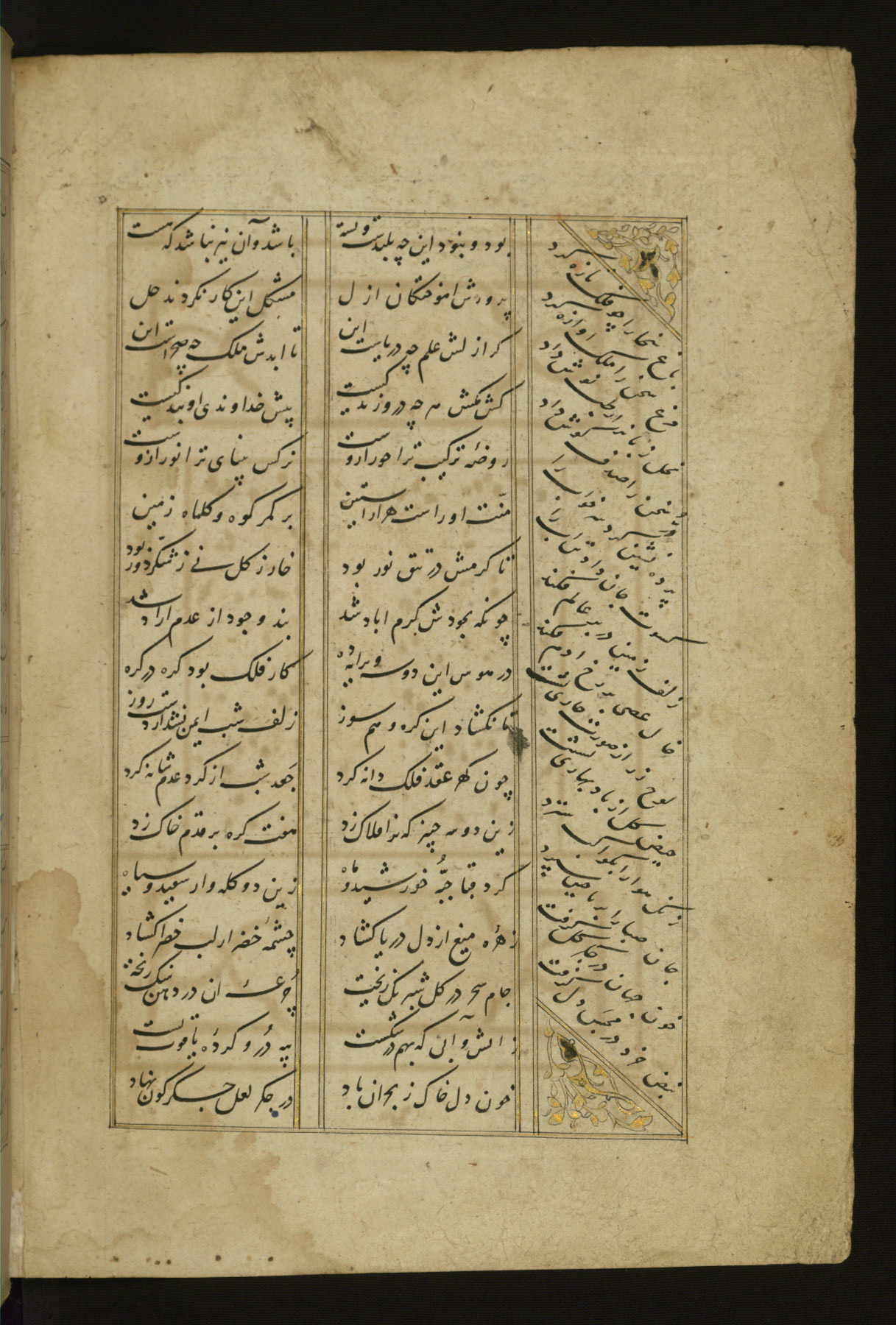 This copy of the Khamsah (quintet) of Niẓāmī Ganjavī (d. 605 AH / 1209 CE) was written by Abū Bakr Shāh ibn Ḥasan ibn ʿAlī al-Shahrastānī and illuminated by Jamāl al-Dīn ibn Muḥammad al-Ṣiddīqī al-Iṣfahānī between 892 AH / 1486 CE and 900 AH / 1494-5 CE. The manuscript opens with a double-page illuminated frontispiece with an inscription giving the title of the work and the name of the author (fols. 1b-2a). There are four illuminated titlepieces with the names of the individual poems and twenty-six repainted illustrations. According to evidence supplied by the colophons, the original binding was by the hand of Jamāl al-Dīn ibn Muḥammad al-Ṣiddīqī al-Iṣfahānī, as well. Unfortunately, it has not survived. The binding presently attached to the manuscript dates to the twelfth century AH / eighteenth CE.