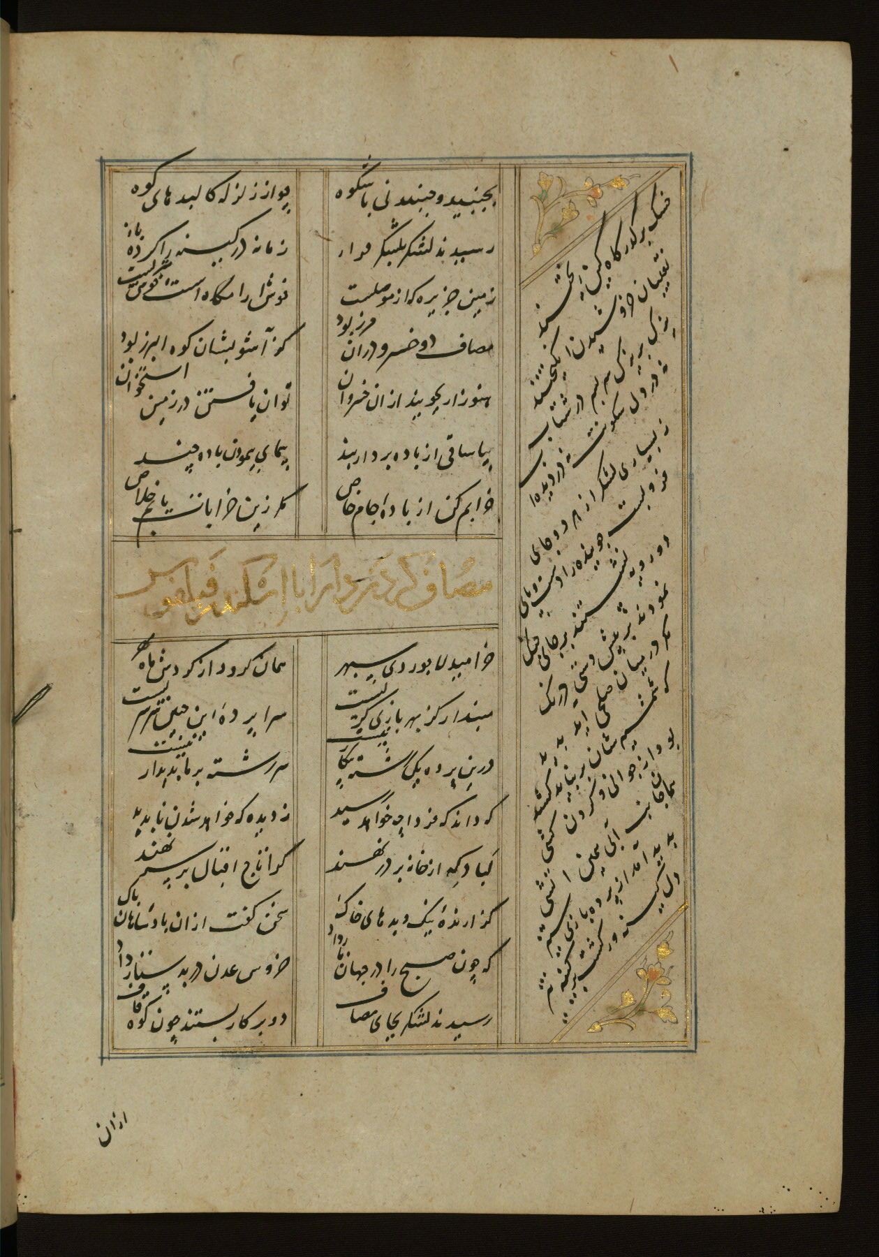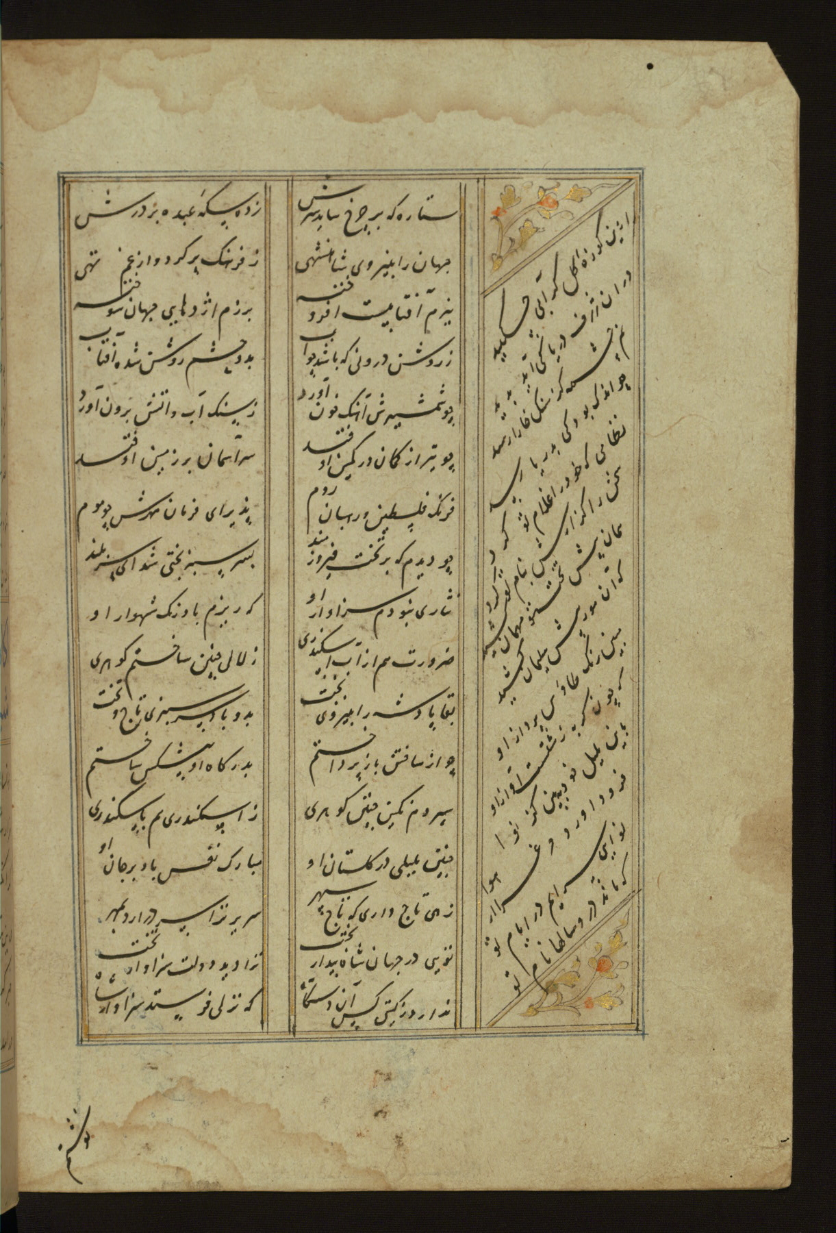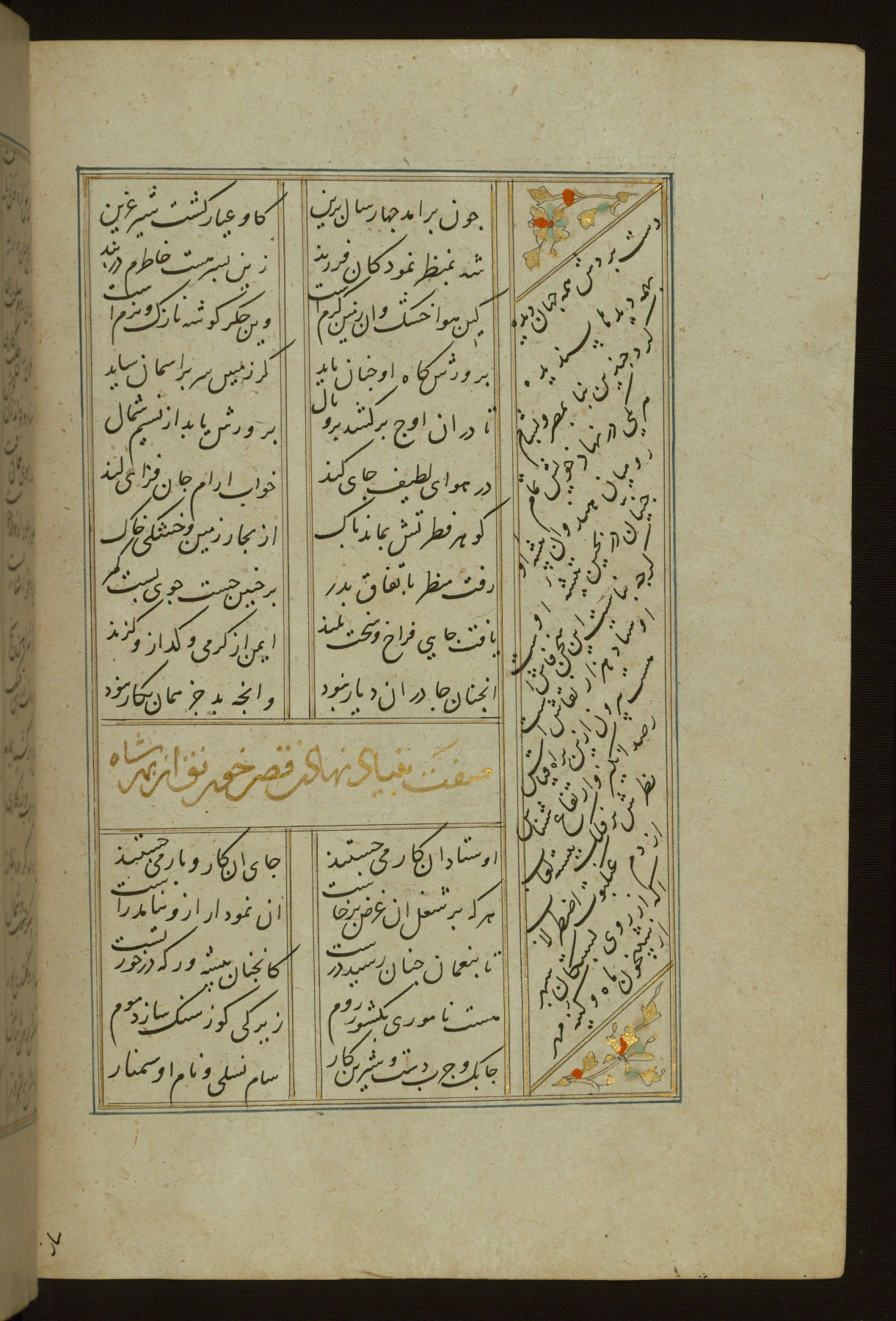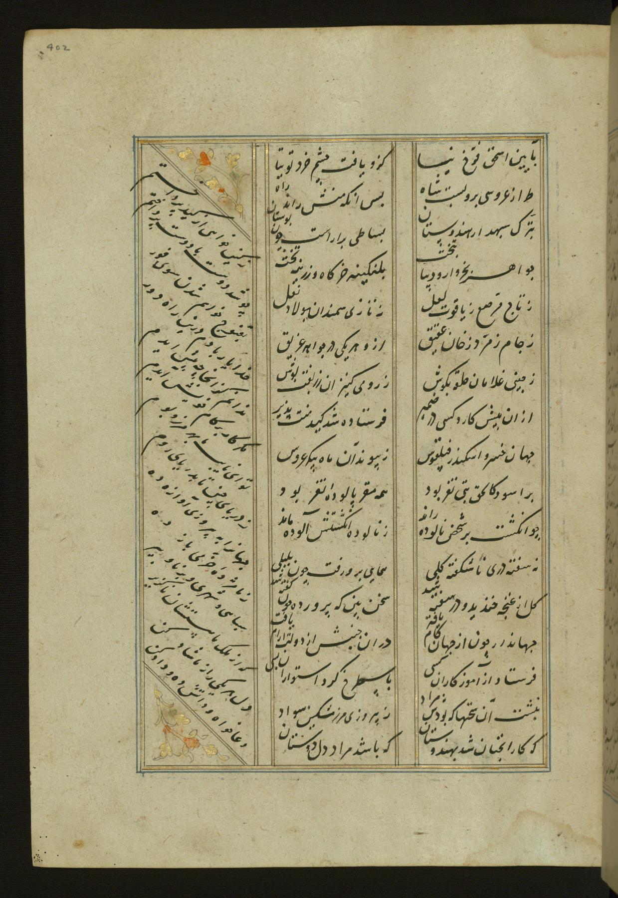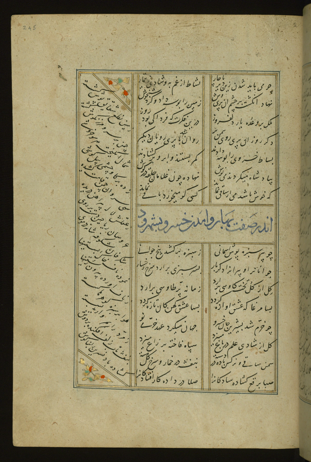 This copy of the Khamsah (quintet) of Niẓāmī Ganjavī (d. 605 AH / 1209 CE) was written by Abū Bakr Shāh ibn Ḥasan ibn ʿAlī al-Shahrastānī and illuminated by Jamāl al-Dīn ibn Muḥammad al-Ṣiddīqī al-Iṣfahānī between 892 AH / 1486 CE and 900 AH / 1494-5 CE. The manuscript opens with a double-page illuminated frontispiece with an inscription giving the title of the work and the name of the author (fols. 1b-2a). There are four illuminated titlepieces with the names of the individual poems and twenty-six repainted illustrations. According to evidence supplied by the colophons, the original binding was by the hand of Jamāl al-Dīn ibn Muḥammad al-Ṣiddīqī al-Iṣfahānī, as well. Unfortunately, it has not survived. The binding presently attached to the manuscript dates to the twelfth century AH / eighteenth CE.