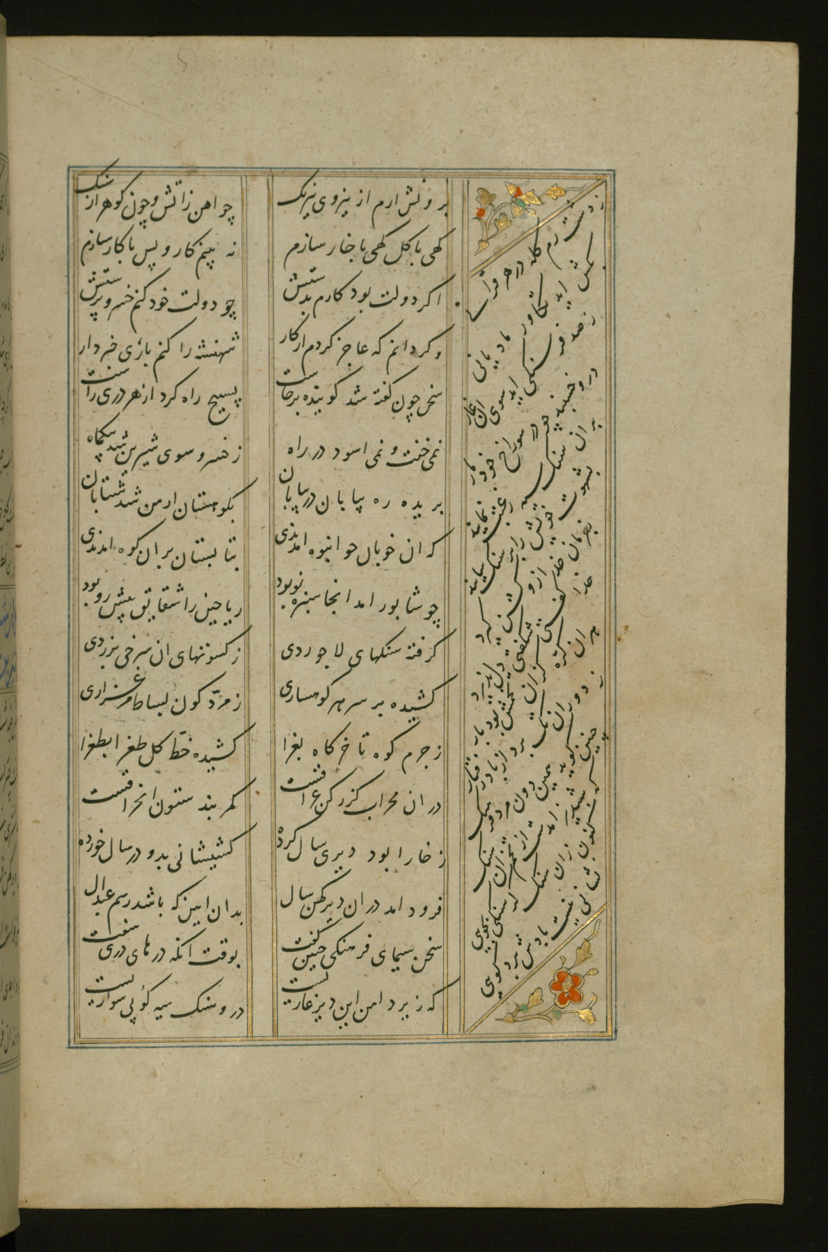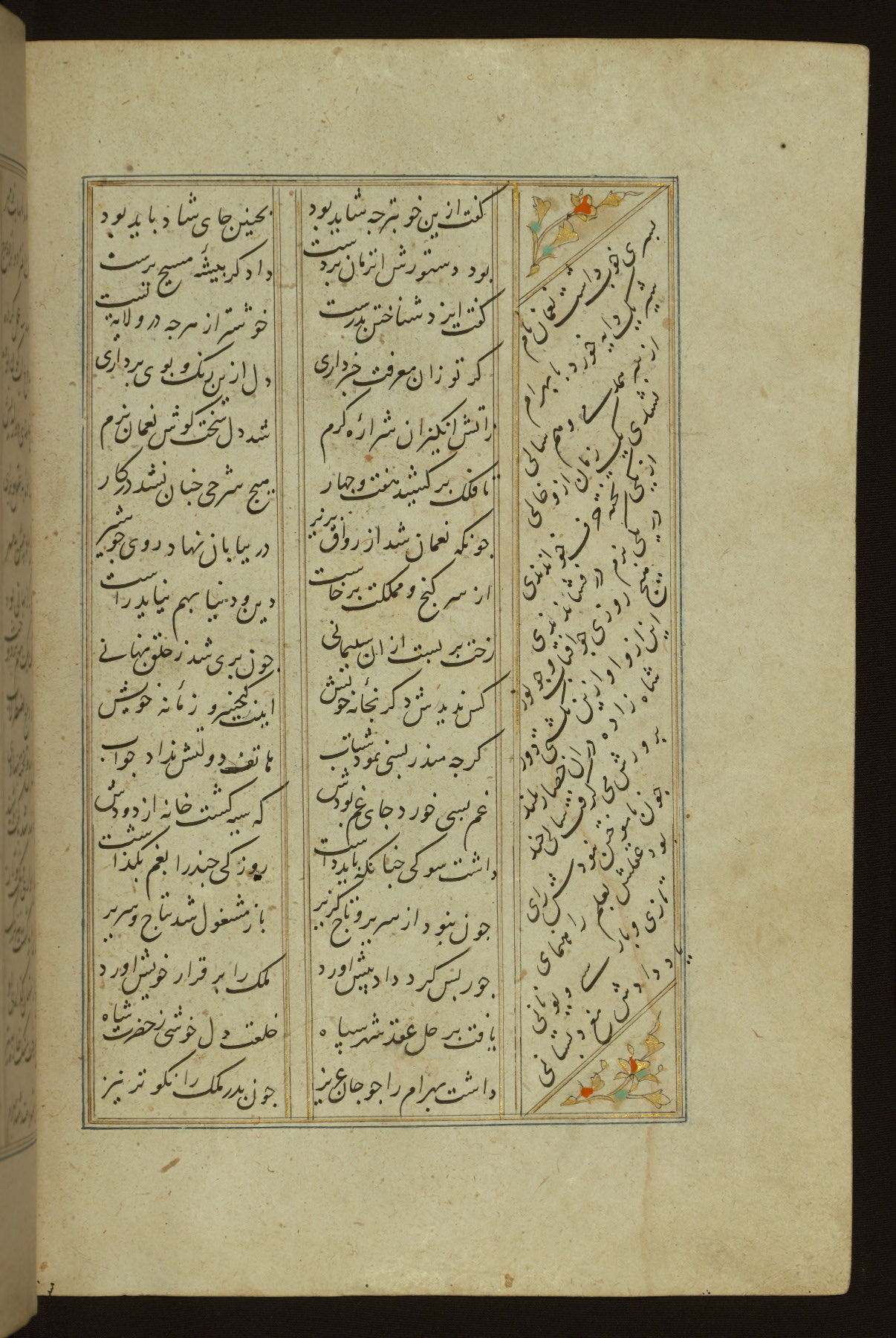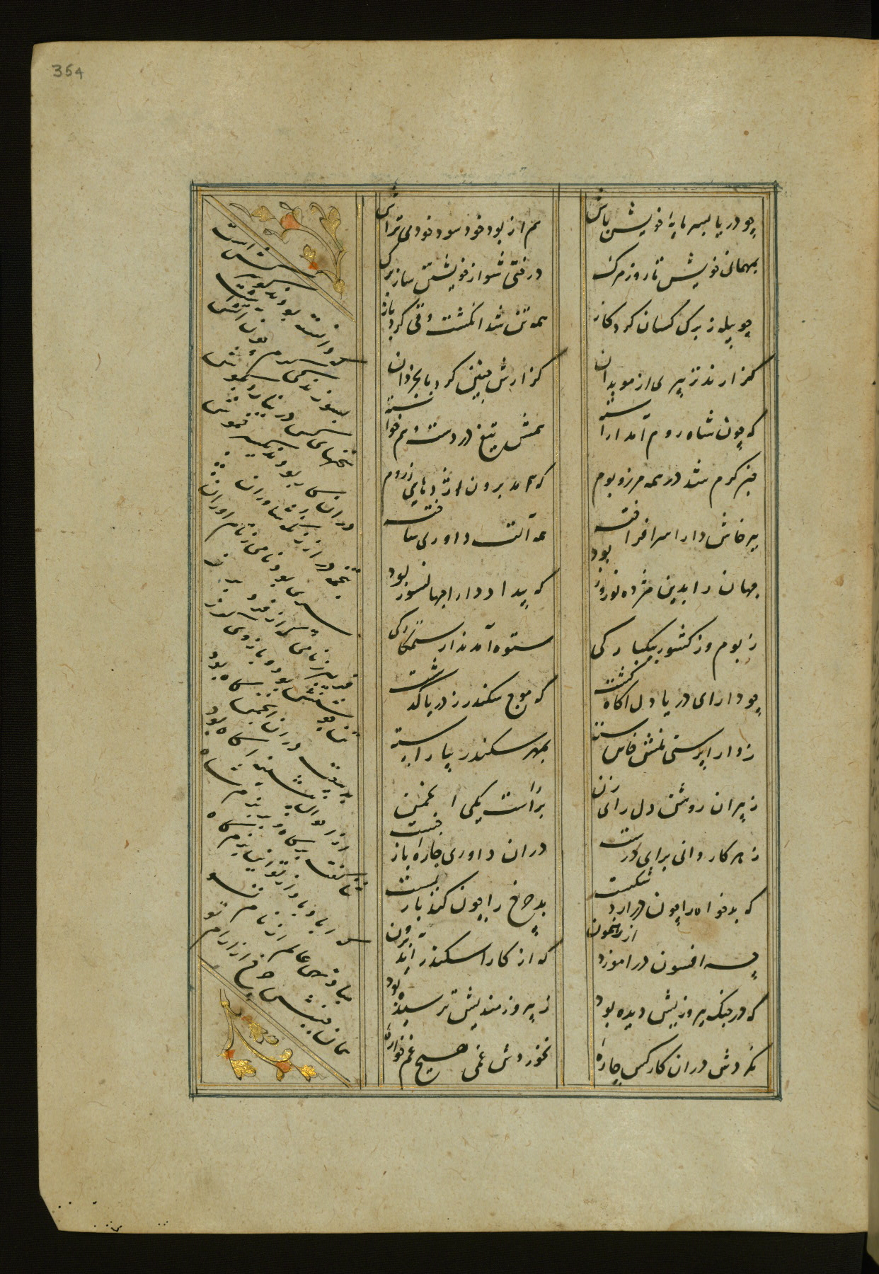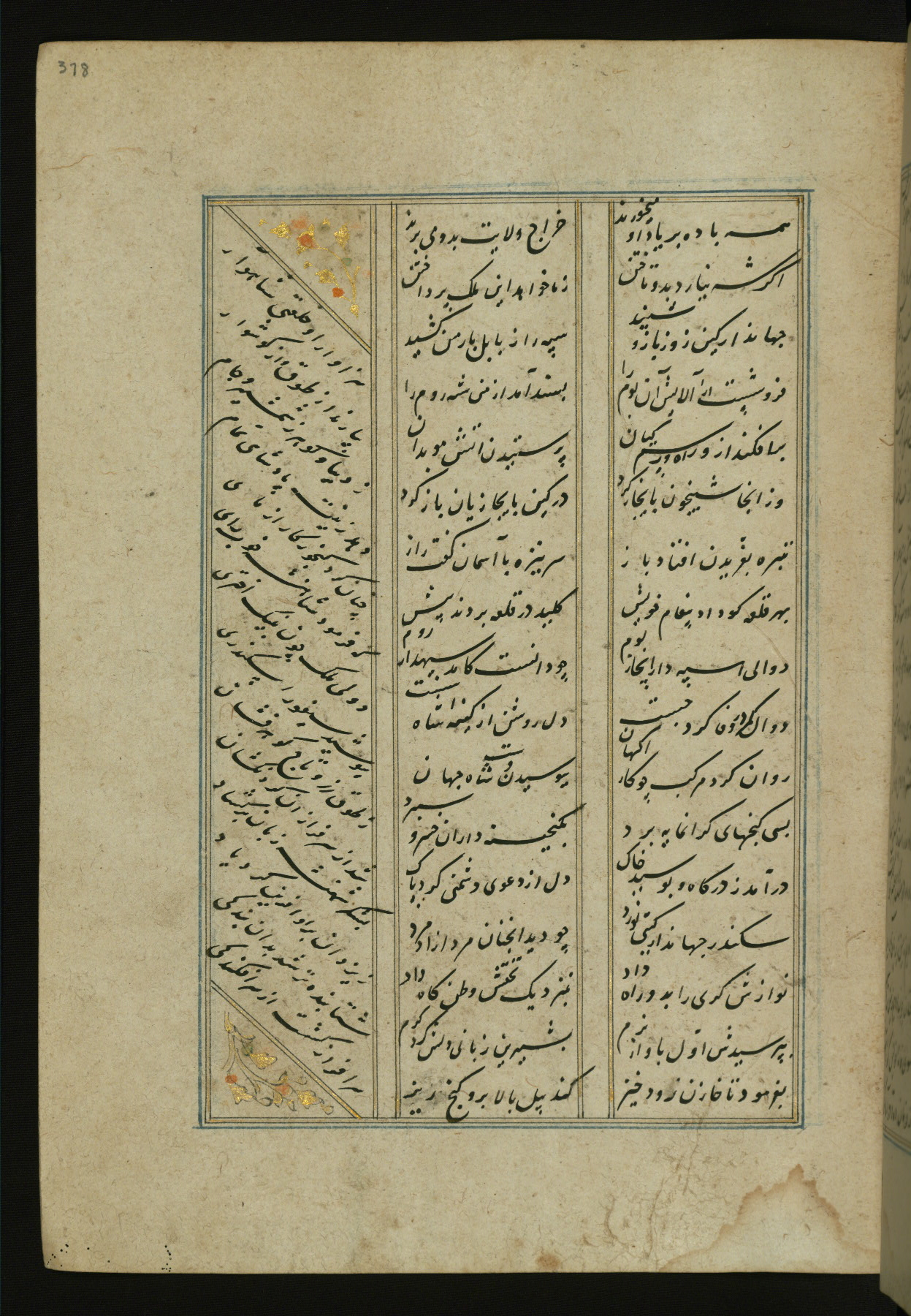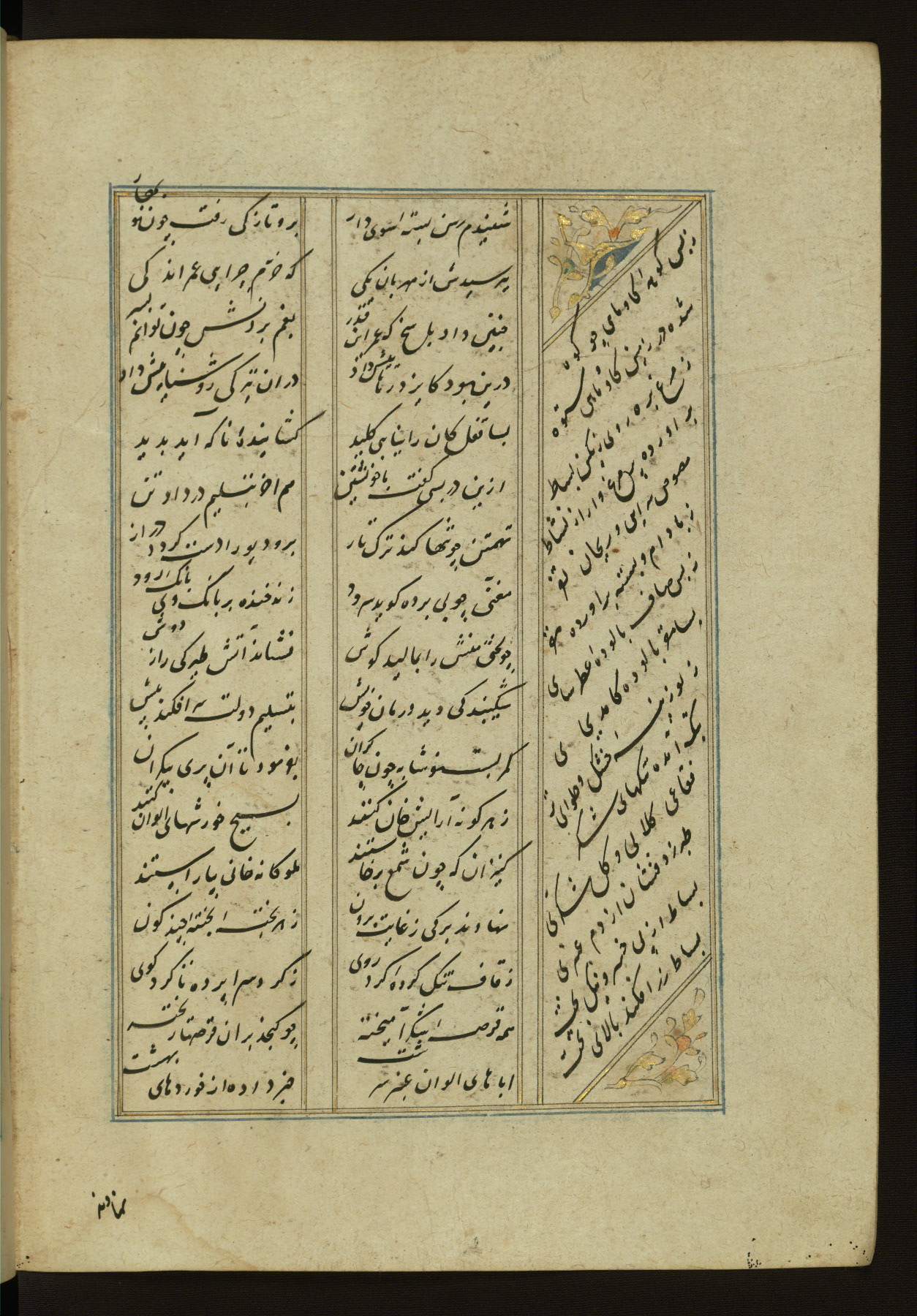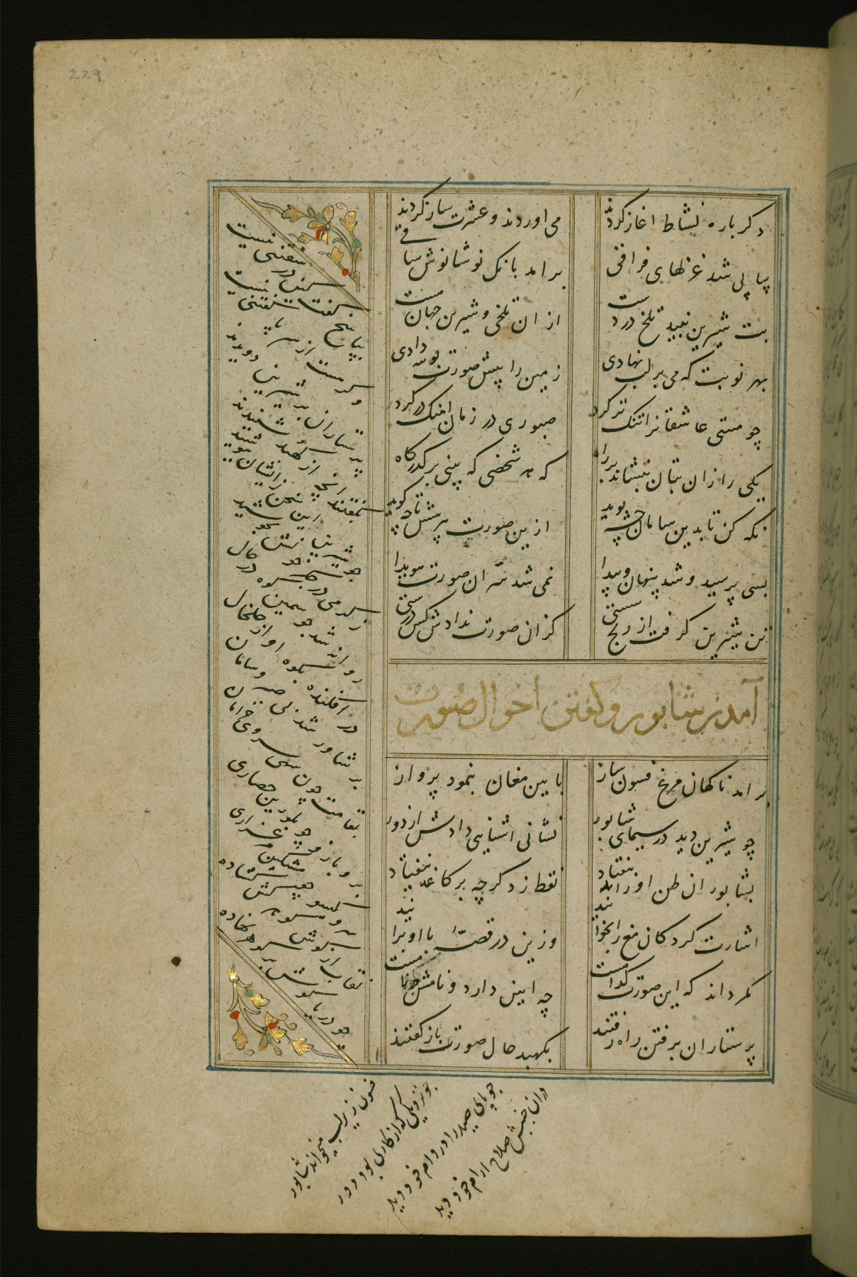 This copy of the Khamsah (quintet) of Niẓāmī Ganjavī (d. 605 AH / 1209 CE) was written by Abū Bakr Shāh ibn Ḥasan ibn ʿAlī al-Shahrastānī and illuminated by Jamāl al-Dīn ibn Muḥammad al-Ṣiddīqī al-Iṣfahānī between 892 AH / 1486 CE and 900 AH / 1494-5 CE. The manuscript opens with a double-page illuminated frontispiece with an inscription giving the title of the work and the name of the author (fols. 1b-2a). There are four illuminated titlepieces with the names of the individual poems and twenty-six repainted illustrations. According to evidence supplied by the colophons, the original binding was by the hand of Jamāl al-Dīn ibn Muḥammad al-Ṣiddīqī al-Iṣfahānī, as well. Unfortunately, it has not survived. The binding presently attached to the manuscript dates to the twelfth century AH / eighteenth CE.