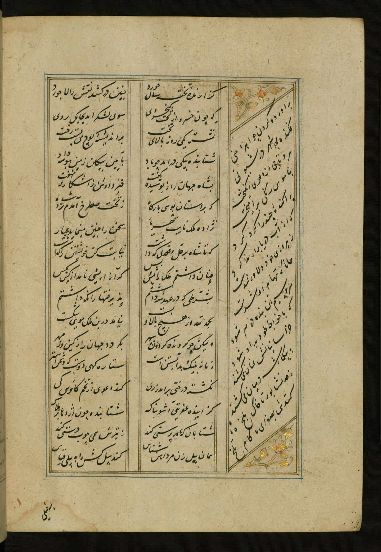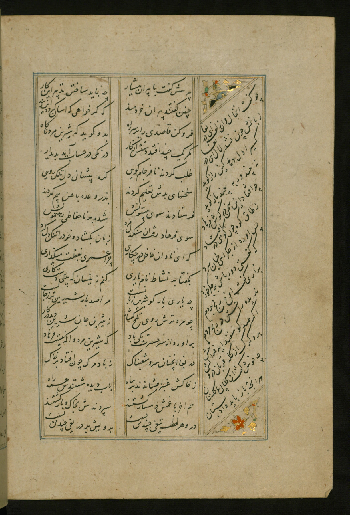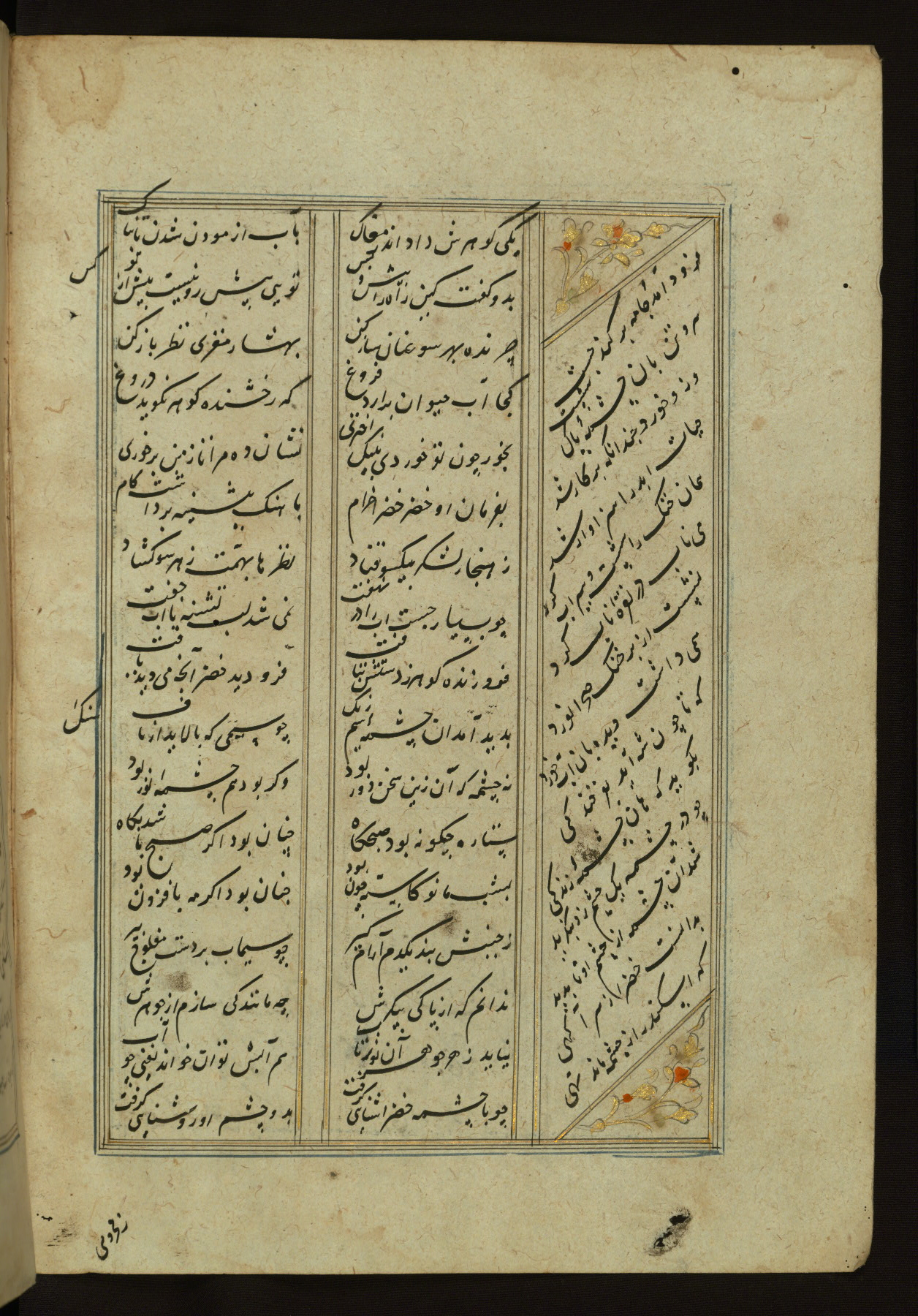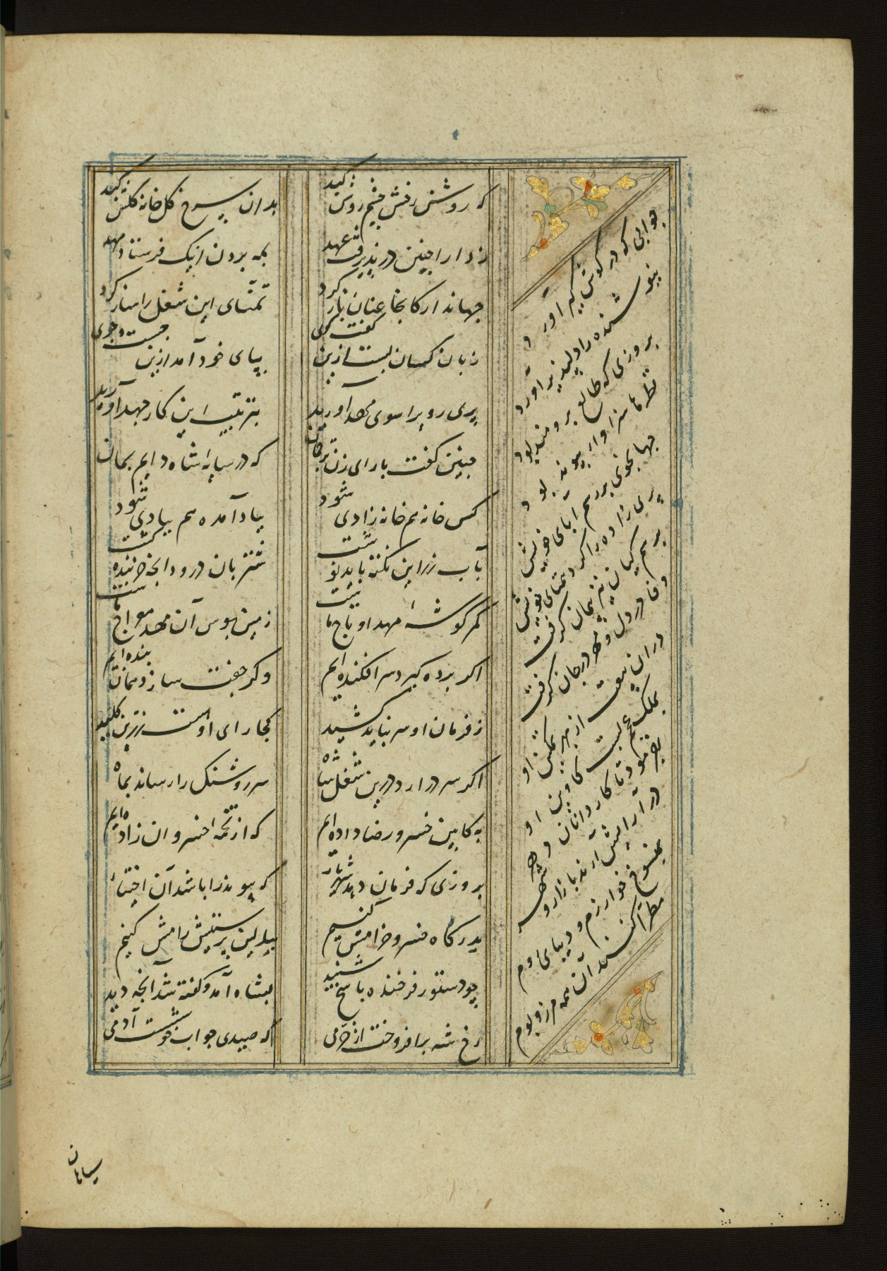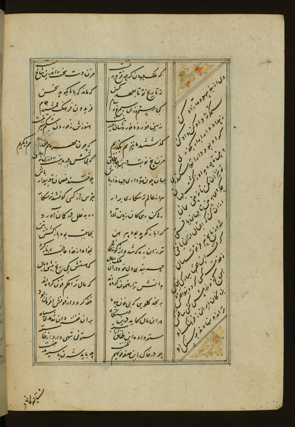 This copy of the Khamsah (quintet) of Niẓāmī Ganjavī (d. 605 AH / 1209 CE) was written by Abū Bakr Shāh ibn Ḥasan ibn ʿAlī al-Shahrastānī and illuminated by Jamāl al-Dīn ibn Muḥammad al-Ṣiddīqī al-Iṣfahānī between 892 AH / 1486 CE and 900 AH / 1494-5 CE. The manuscript opens with a double-page illuminated frontispiece with an inscription giving the title of the work and the name of the author (fols. 1b-2a). There are four illuminated titlepieces with the names of the individual poems and twenty-six repainted illustrations. According to evidence supplied by the colophons, the original binding was by the hand of Jamāl al-Dīn ibn Muḥammad al-Ṣiddīqī al-Iṣfahānī, as well. Unfortunately, it has not survived. The binding presently attached to the manuscript dates to the twelfth century AH / eighteenth CE.