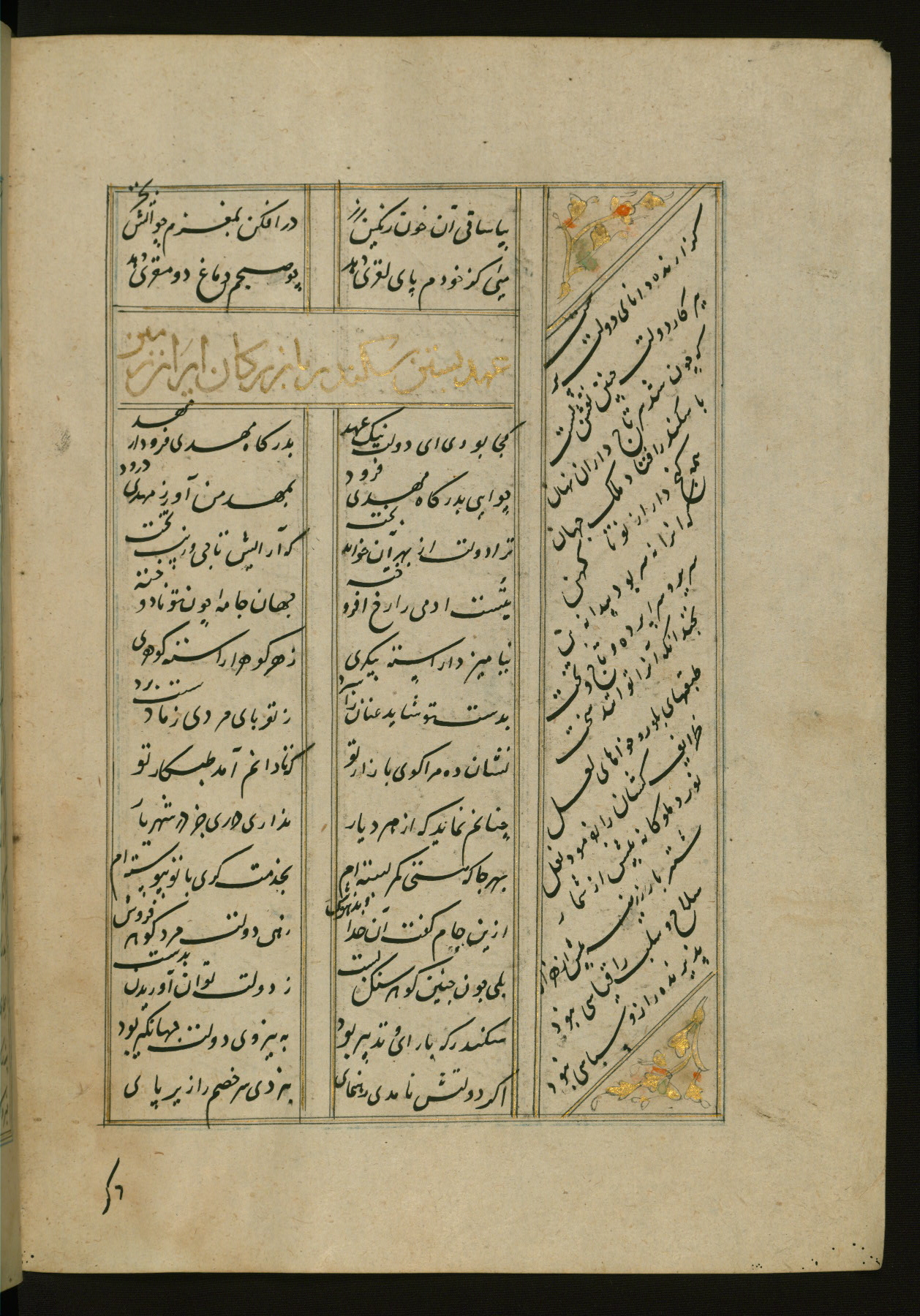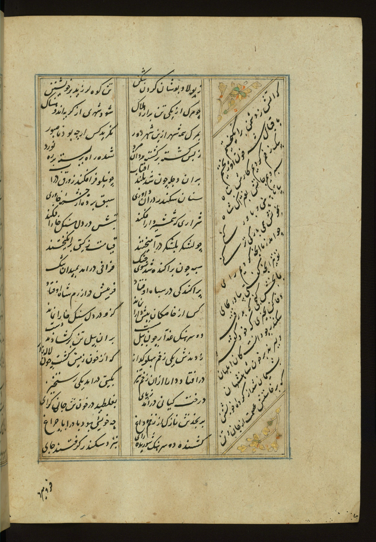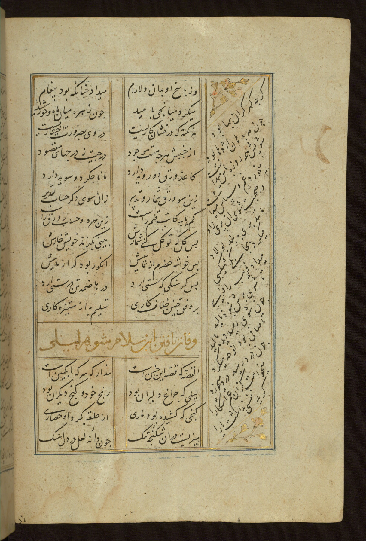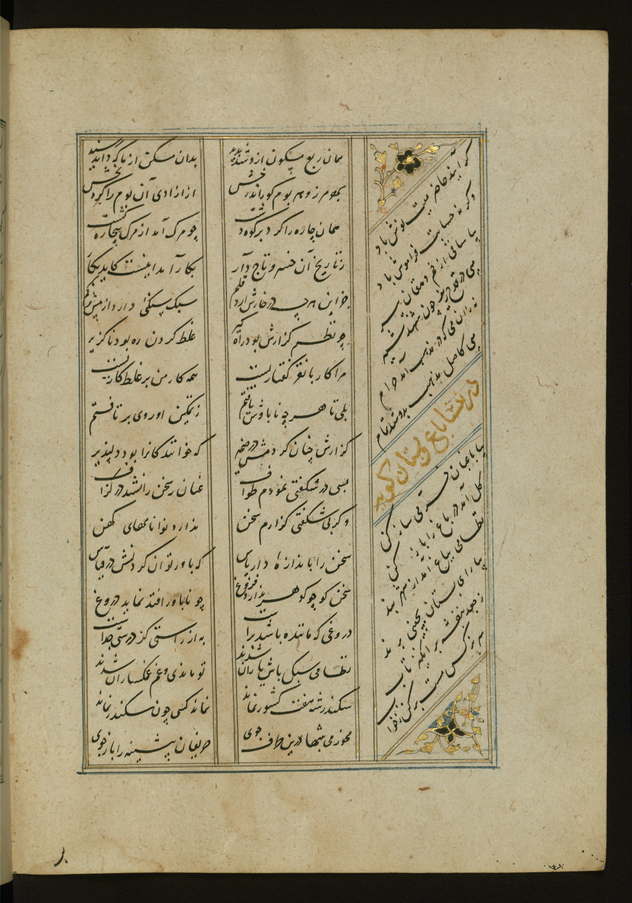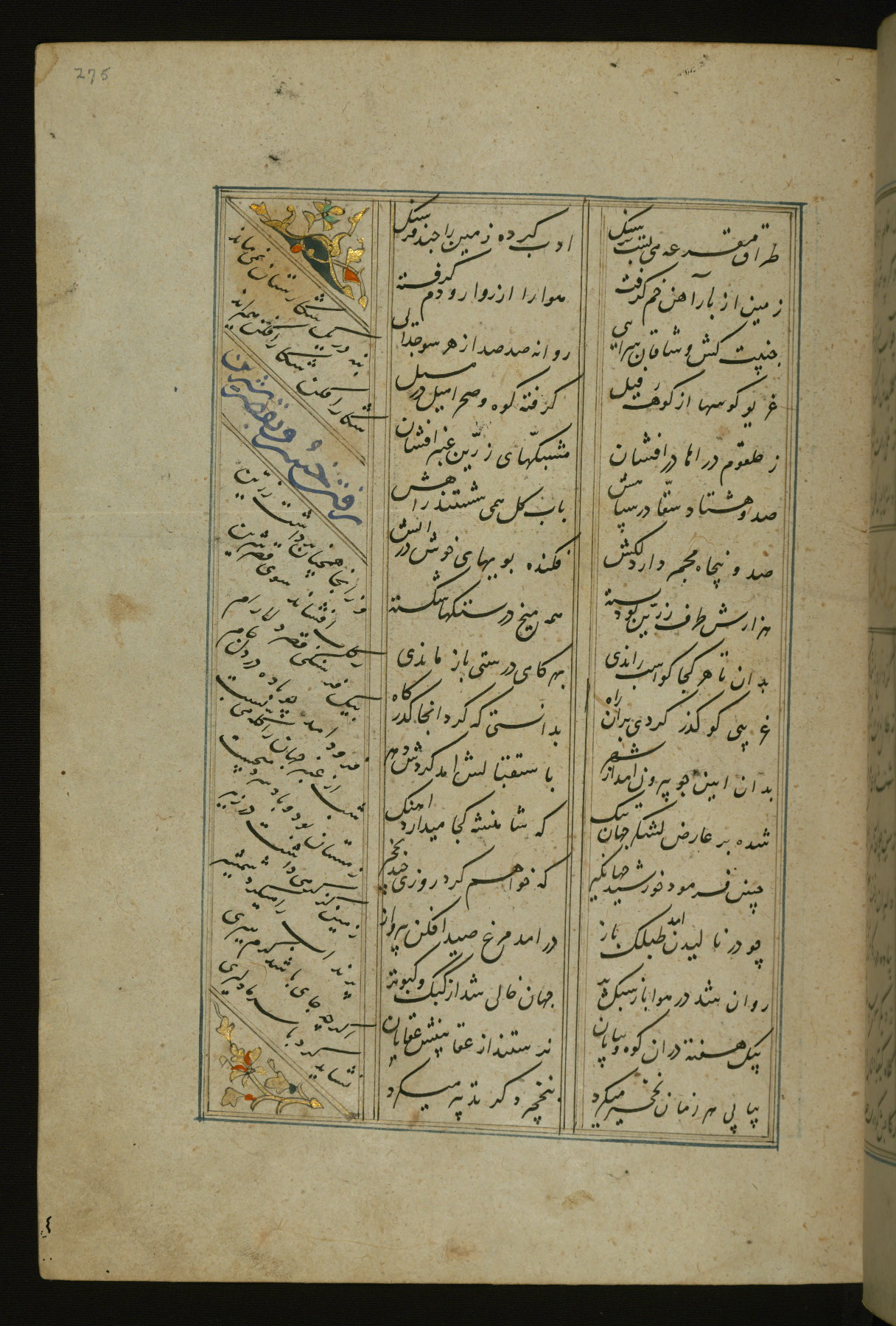 This copy of the Khamsah (quintet) of Niẓāmī Ganjavī (d. 605 AH / 1209 CE) was written by Abū Bakr Shāh ibn Ḥasan ibn ʿAlī al-Shahrastānī and illuminated by Jamāl al-Dīn ibn Muḥammad al-Ṣiddīqī al-Iṣfahānī between 892 AH / 1486 CE and 900 AH / 1494-5 CE. The manuscript opens with a double-page illuminated frontispiece with an inscription giving the title of the work and the name of the author (fols. 1b-2a). There are four illuminated titlepieces with the names of the individual poems and twenty-six repainted illustrations. According to evidence supplied by the colophons, the original binding was by the hand of Jamāl al-Dīn ibn Muḥammad al-Ṣiddīqī al-Iṣfahānī, as well. Unfortunately, it has not survived. The binding presently attached to the manuscript dates to the twelfth century AH / eighteenth CE.