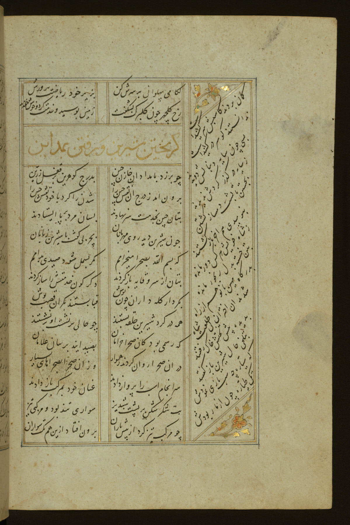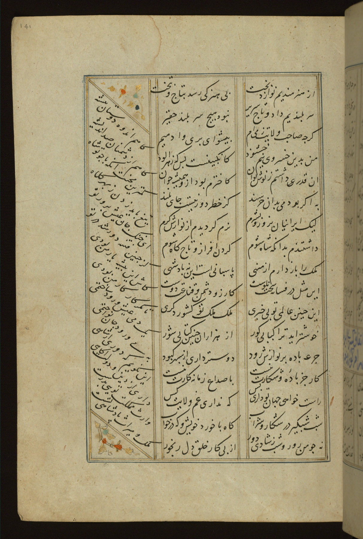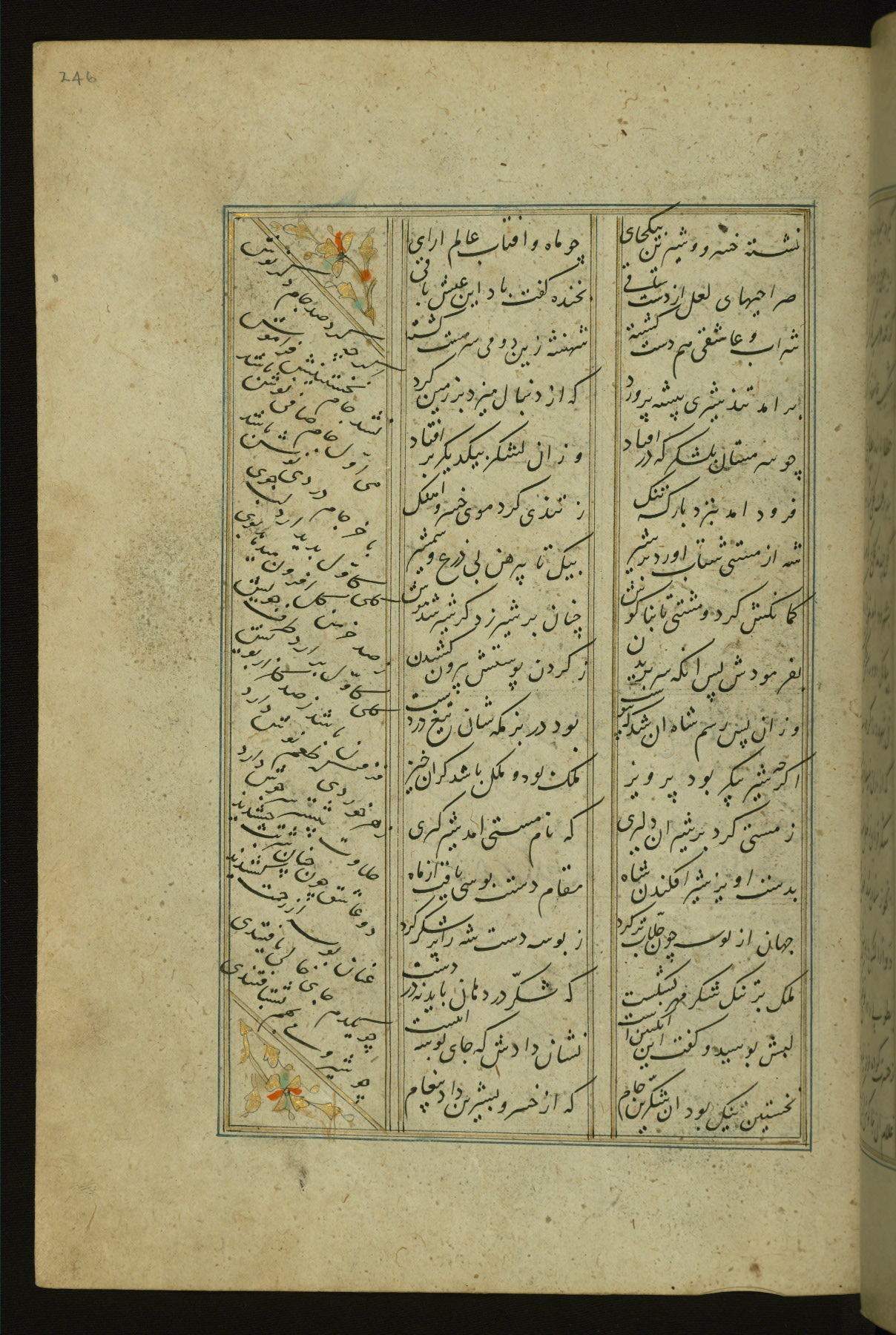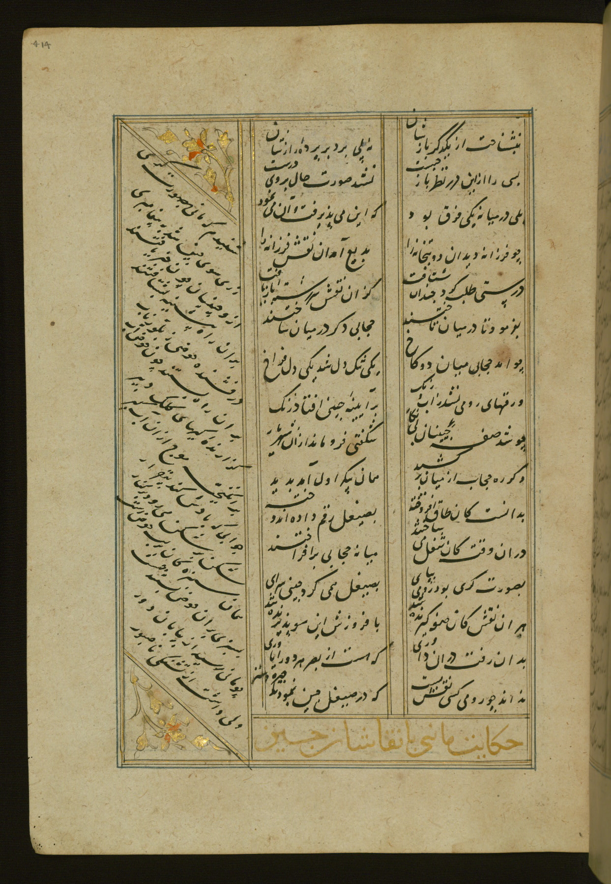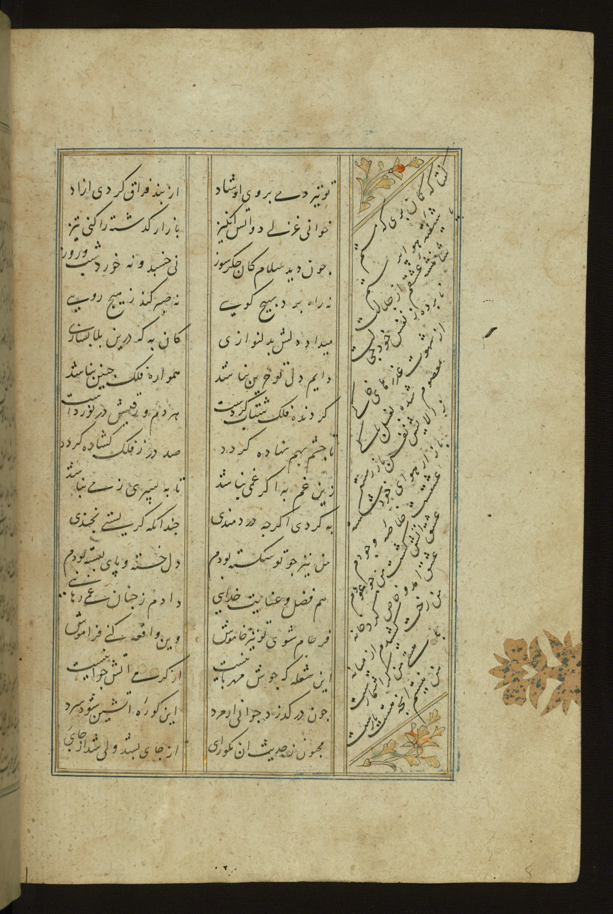 This copy of the Khamsah (quintet) of Niẓāmī Ganjavī (d. 605 AH / 1209 CE) was written by Abū Bakr Shāh ibn Ḥasan ibn ʿAlī al-Shahrastānī and illuminated by Jamāl al-Dīn ibn Muḥammad al-Ṣiddīqī al-Iṣfahānī between 892 AH / 1486 CE and 900 AH / 1494-5 CE. The manuscript opens with a double-page illuminated frontispiece with an inscription giving the title of the work and the name of the author (fols. 1b-2a). There are four illuminated titlepieces with the names of the individual poems and twenty-six repainted illustrations. According to evidence supplied by the colophons, the original binding was by the hand of Jamāl al-Dīn ibn Muḥammad al-Ṣiddīqī al-Iṣfahānī, as well. Unfortunately, it has not survived. The binding presently attached to the manuscript dates to the twelfth century AH / eighteenth CE.