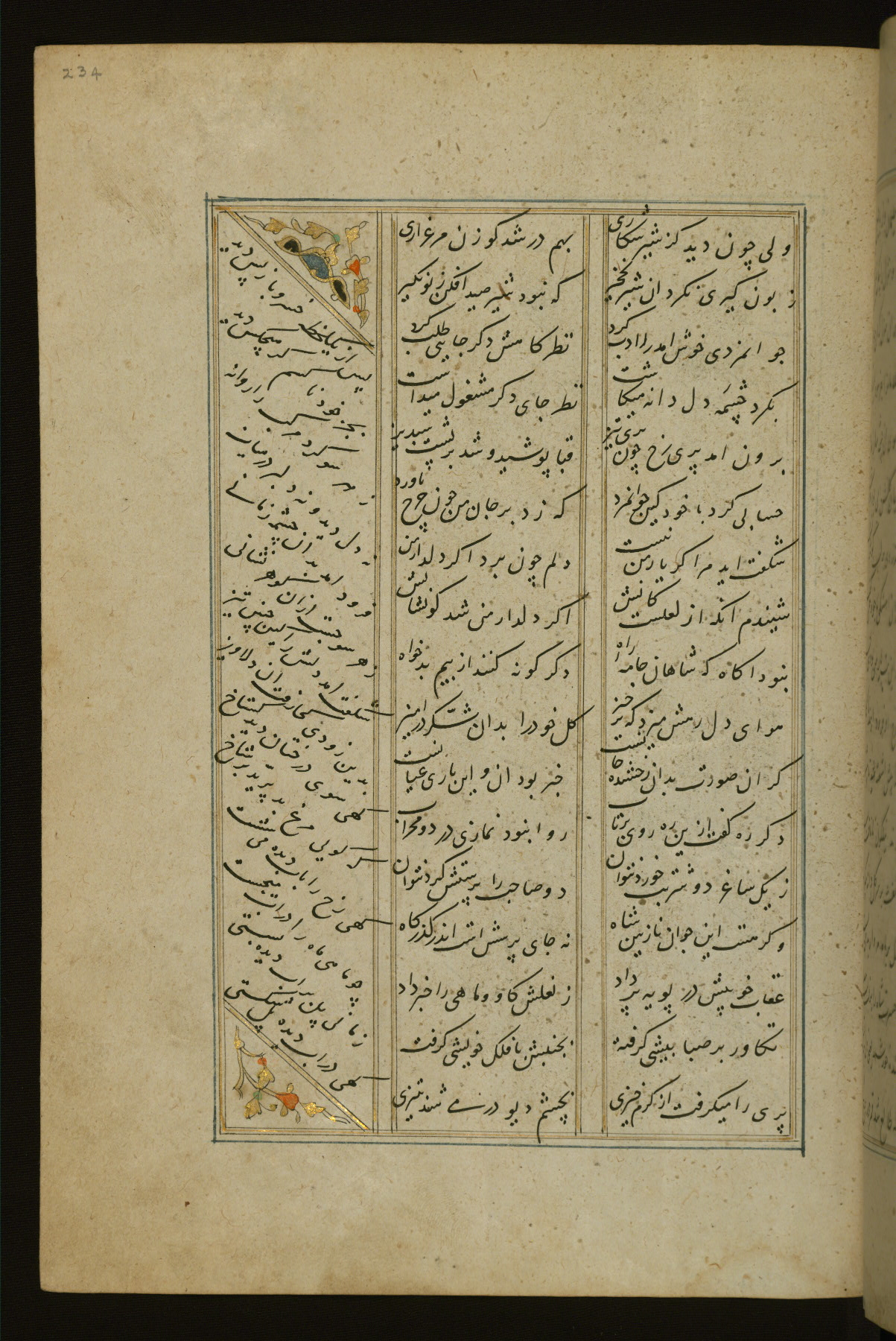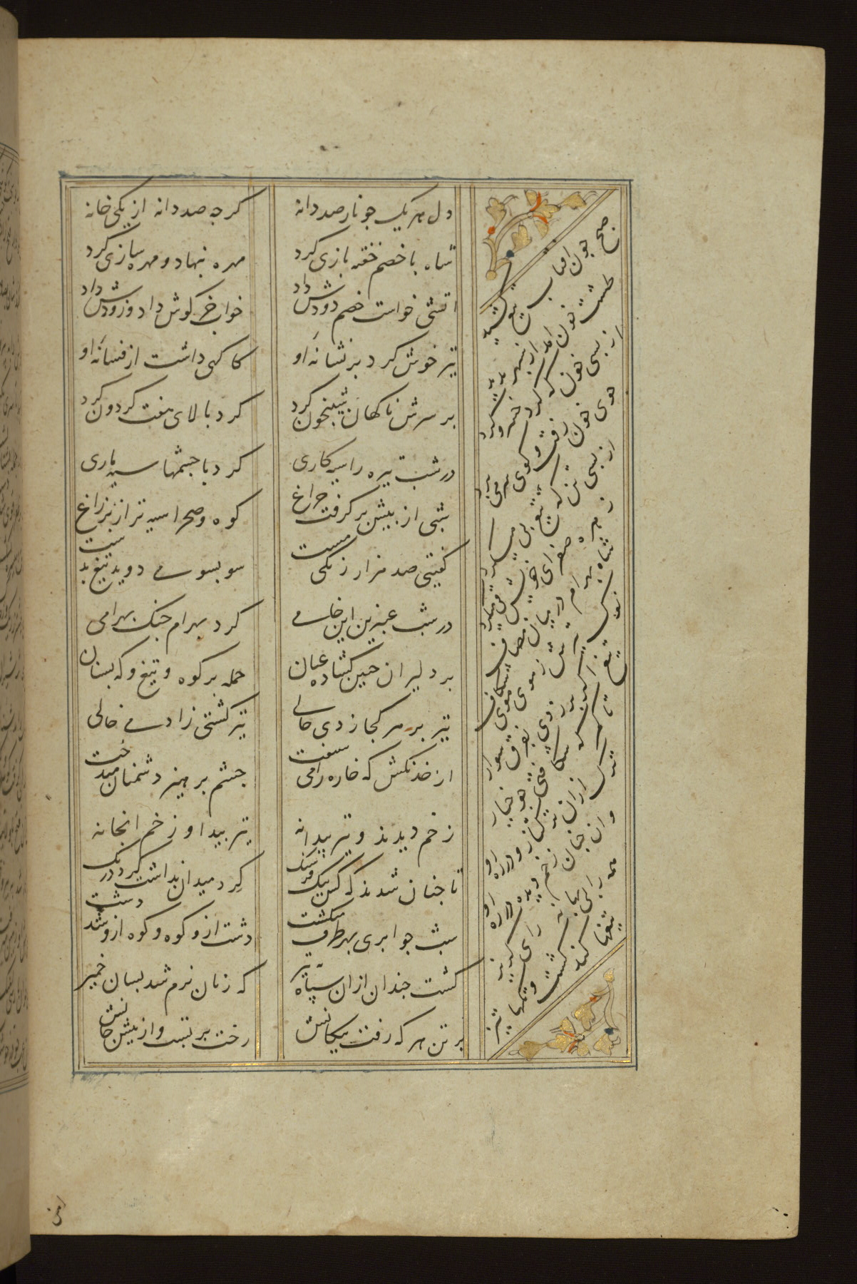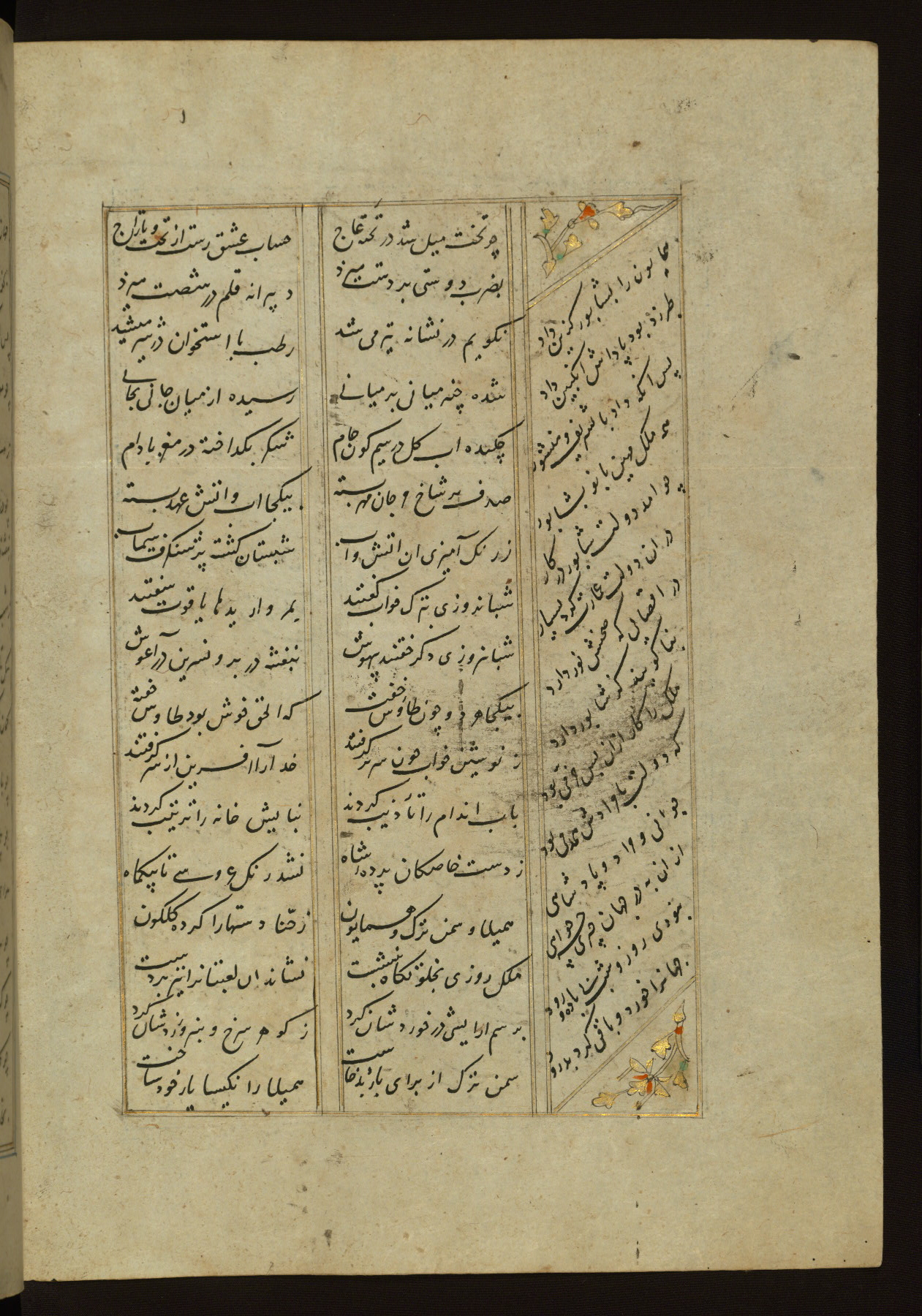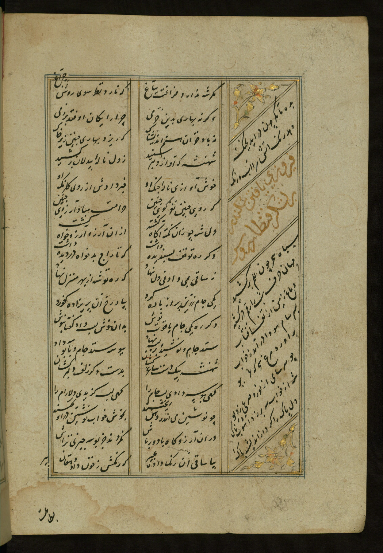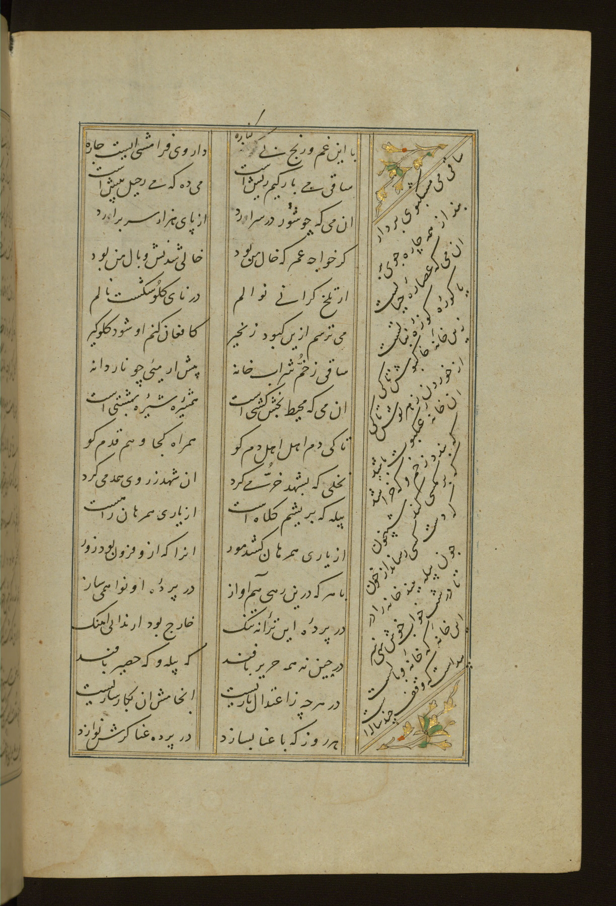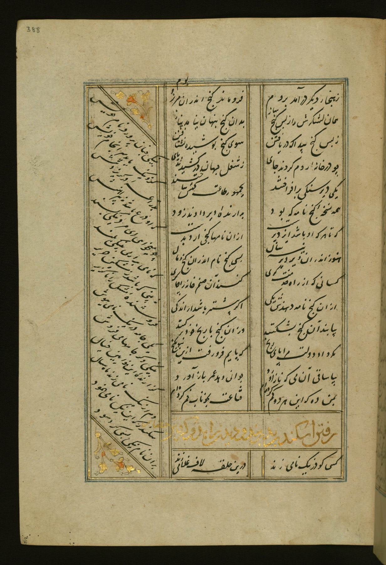 This copy of the Khamsah (quintet) of Niẓāmī Ganjavī (d. 605 AH / 1209 CE) was written by Abū Bakr Shāh ibn Ḥasan ibn ʿAlī al-Shahrastānī and illuminated by Jamāl al-Dīn ibn Muḥammad al-Ṣiddīqī al-Iṣfahānī between 892 AH / 1486 CE and 900 AH / 1494-5 CE. The manuscript opens with a double-page illuminated frontispiece with an inscription giving the title of the work and the name of the author (fols. 1b-2a). There are four illuminated titlepieces with the names of the individual poems and twenty-six repainted illustrations. According to evidence supplied by the colophons, the original binding was by the hand of Jamāl al-Dīn ibn Muḥammad al-Ṣiddīqī al-Iṣfahānī, as well. Unfortunately, it has not survived. The binding presently attached to the manuscript dates to the twelfth century AH / eighteenth CE.