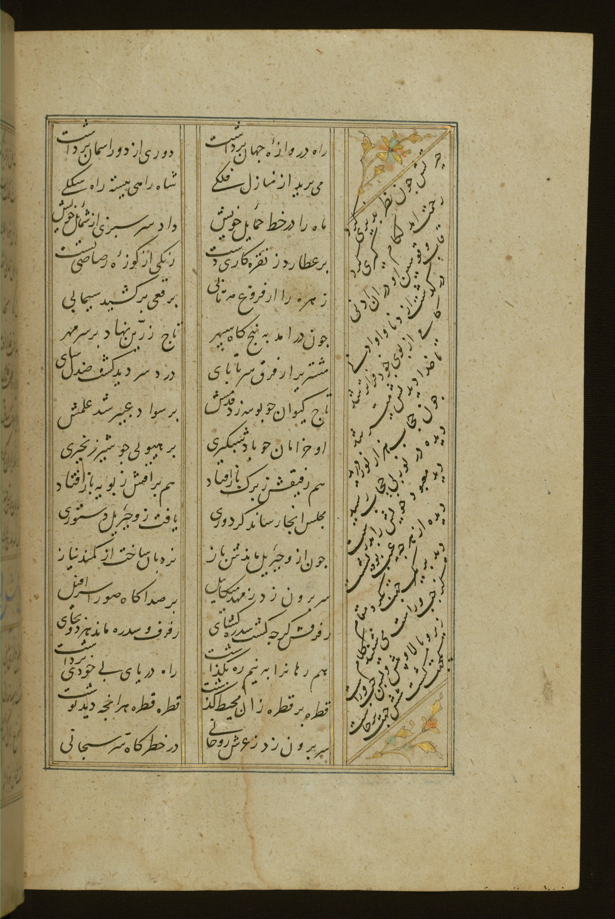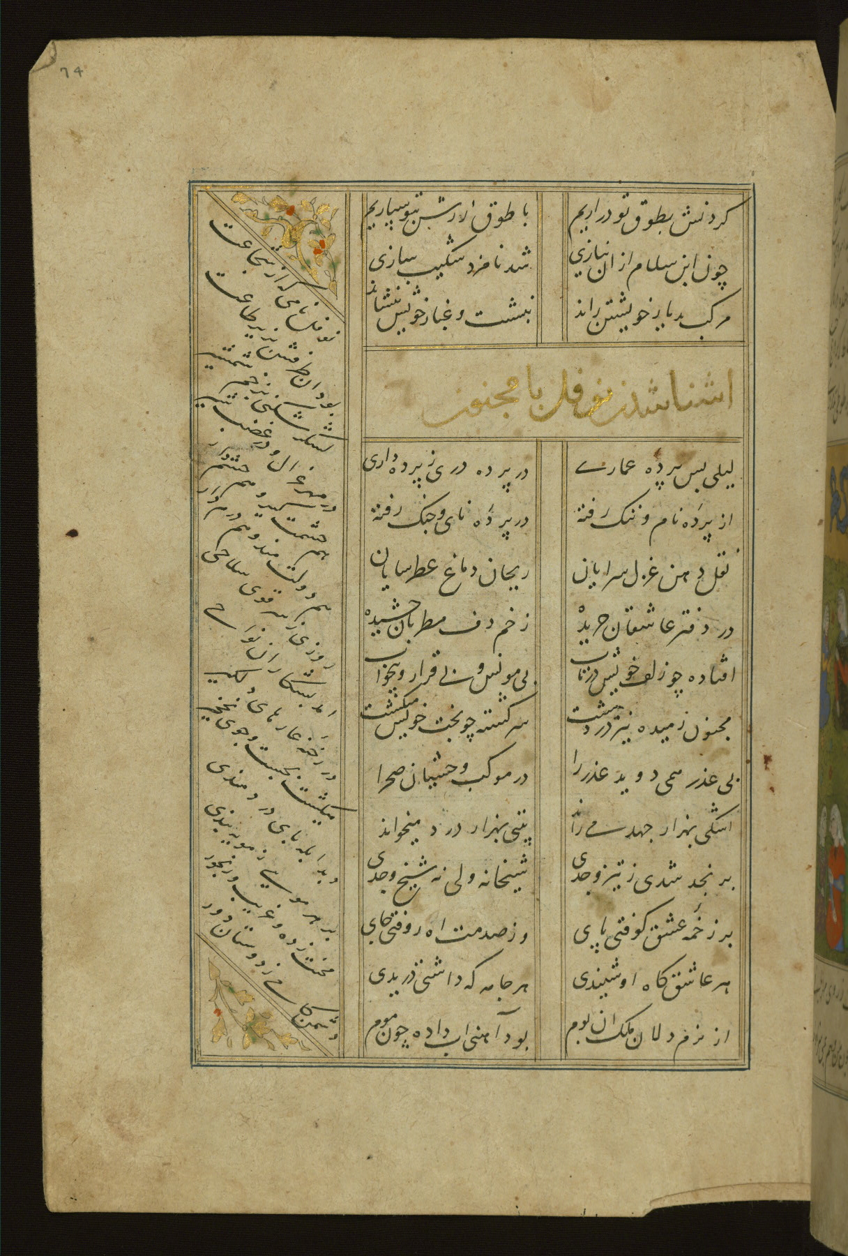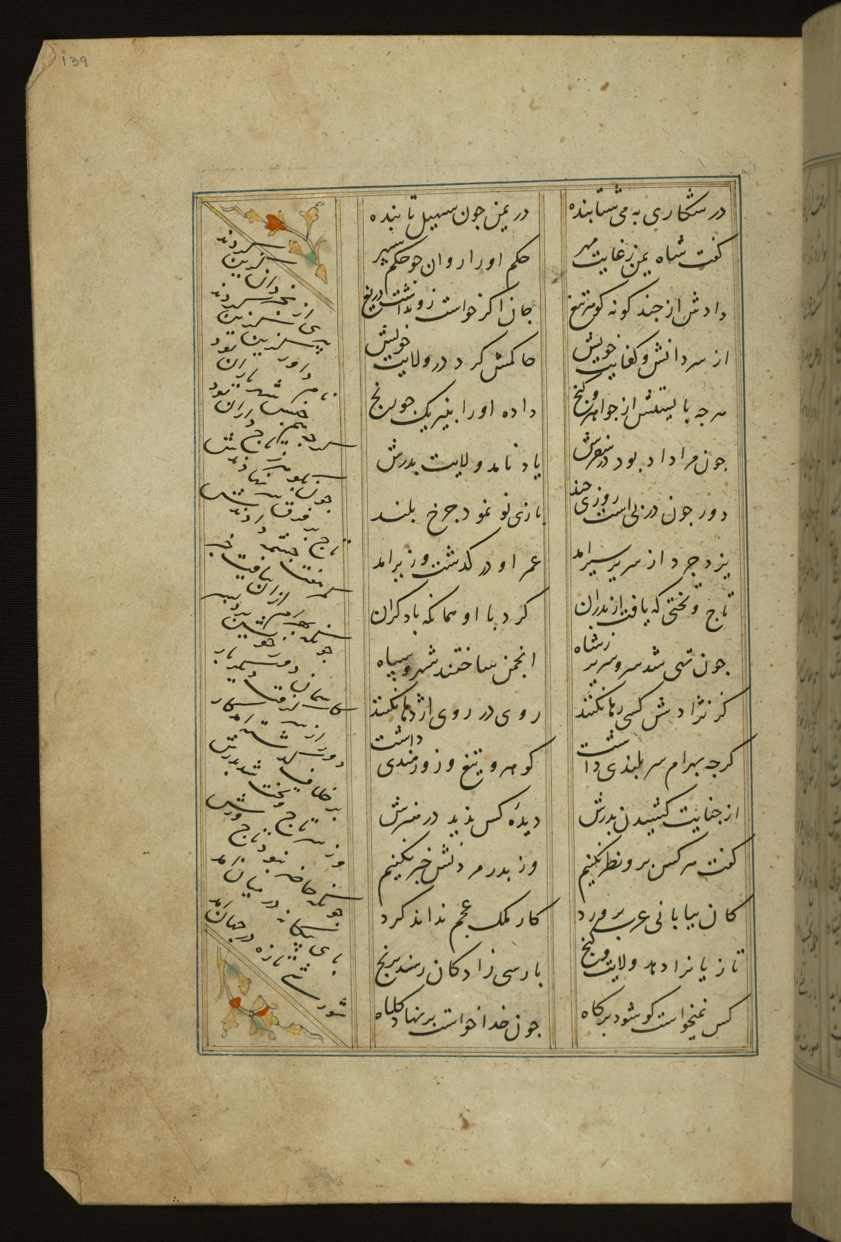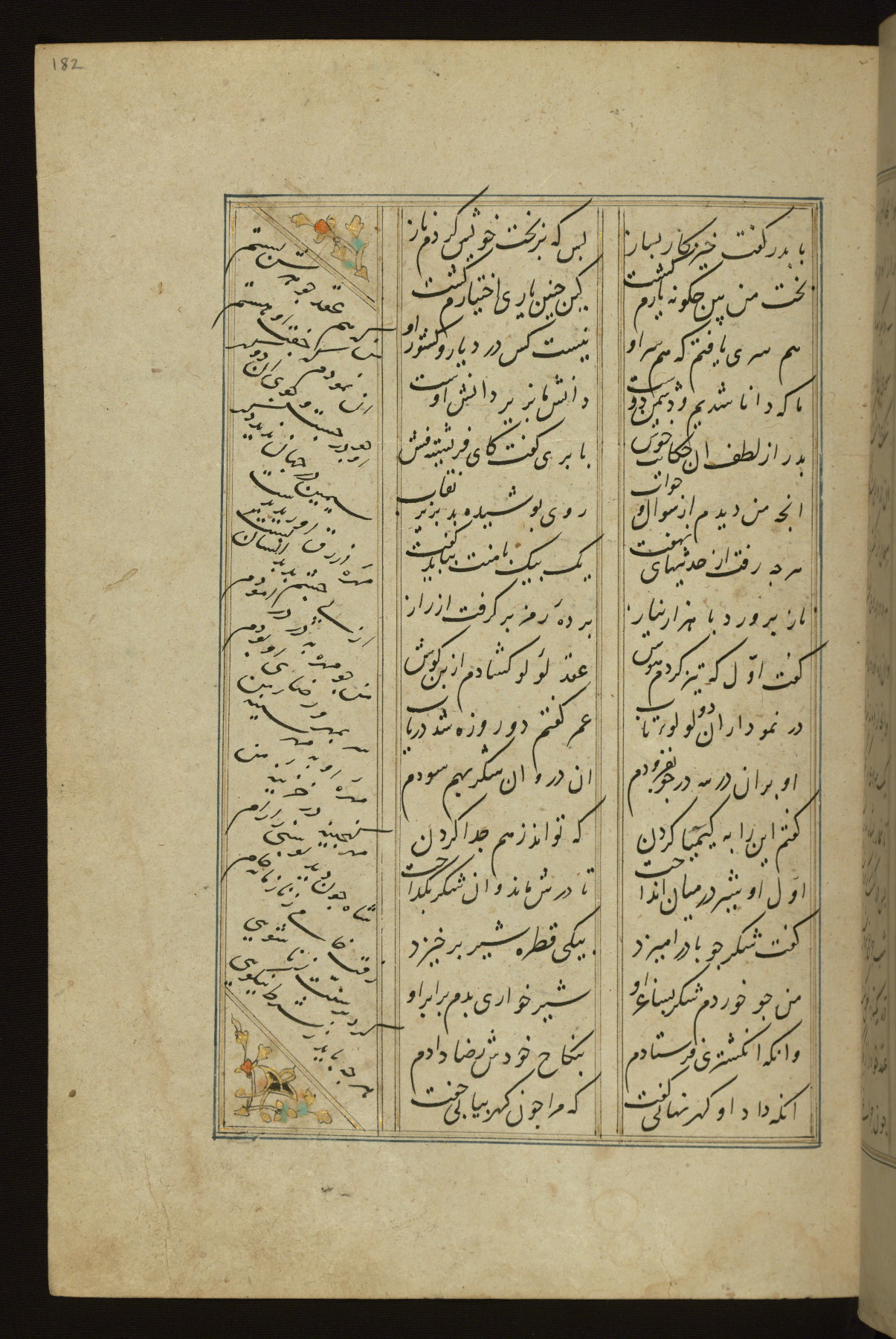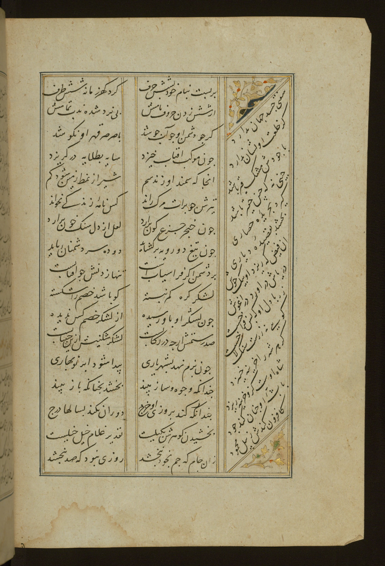 This copy of the Khamsah (quintet) of Niẓāmī Ganjavī (d. 605 AH / 1209 CE) was written by Abū Bakr Shāh ibn Ḥasan ibn ʿAlī al-Shahrastānī and illuminated by Jamāl al-Dīn ibn Muḥammad al-Ṣiddīqī al-Iṣfahānī between 892 AH / 1486 CE and 900 AH / 1494-5 CE. The manuscript opens with a double-page illuminated frontispiece with an inscription giving the title of the work and the name of the author (fols. 1b-2a). There are four illuminated titlepieces with the names of the individual poems and twenty-six repainted illustrations. According to evidence supplied by the colophons, the original binding was by the hand of Jamāl al-Dīn ibn Muḥammad al-Ṣiddīqī al-Iṣfahānī, as well. Unfortunately, it has not survived. The binding presently attached to the manuscript dates to the twelfth century AH / eighteenth CE.
