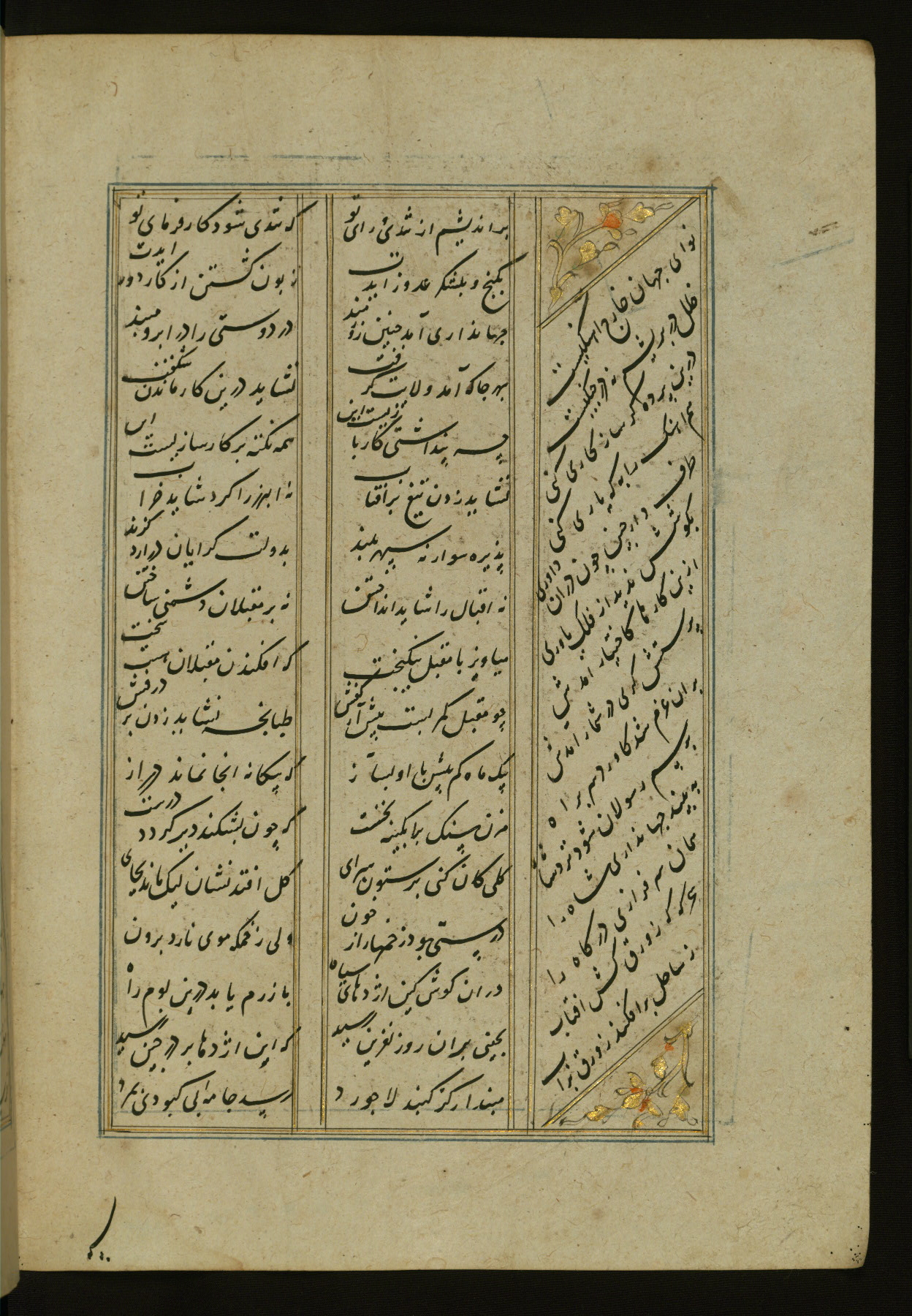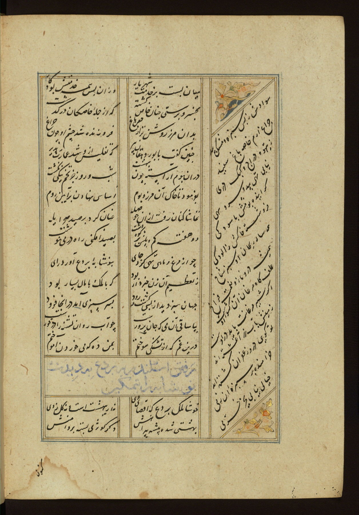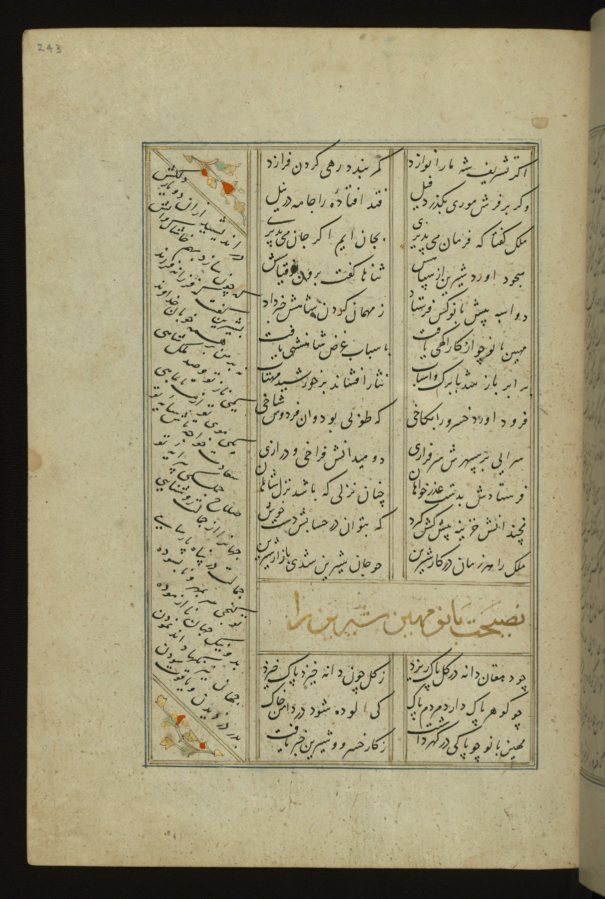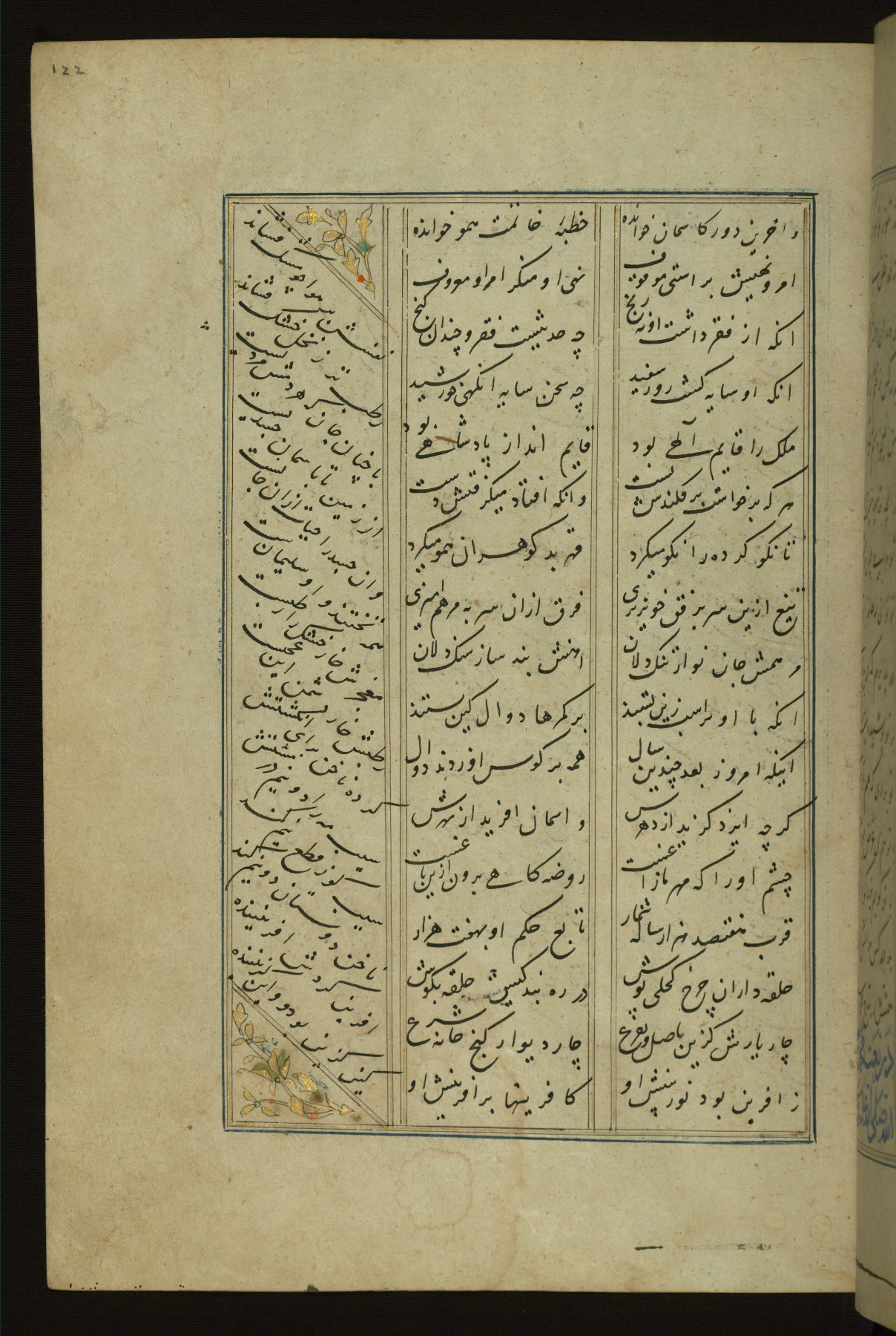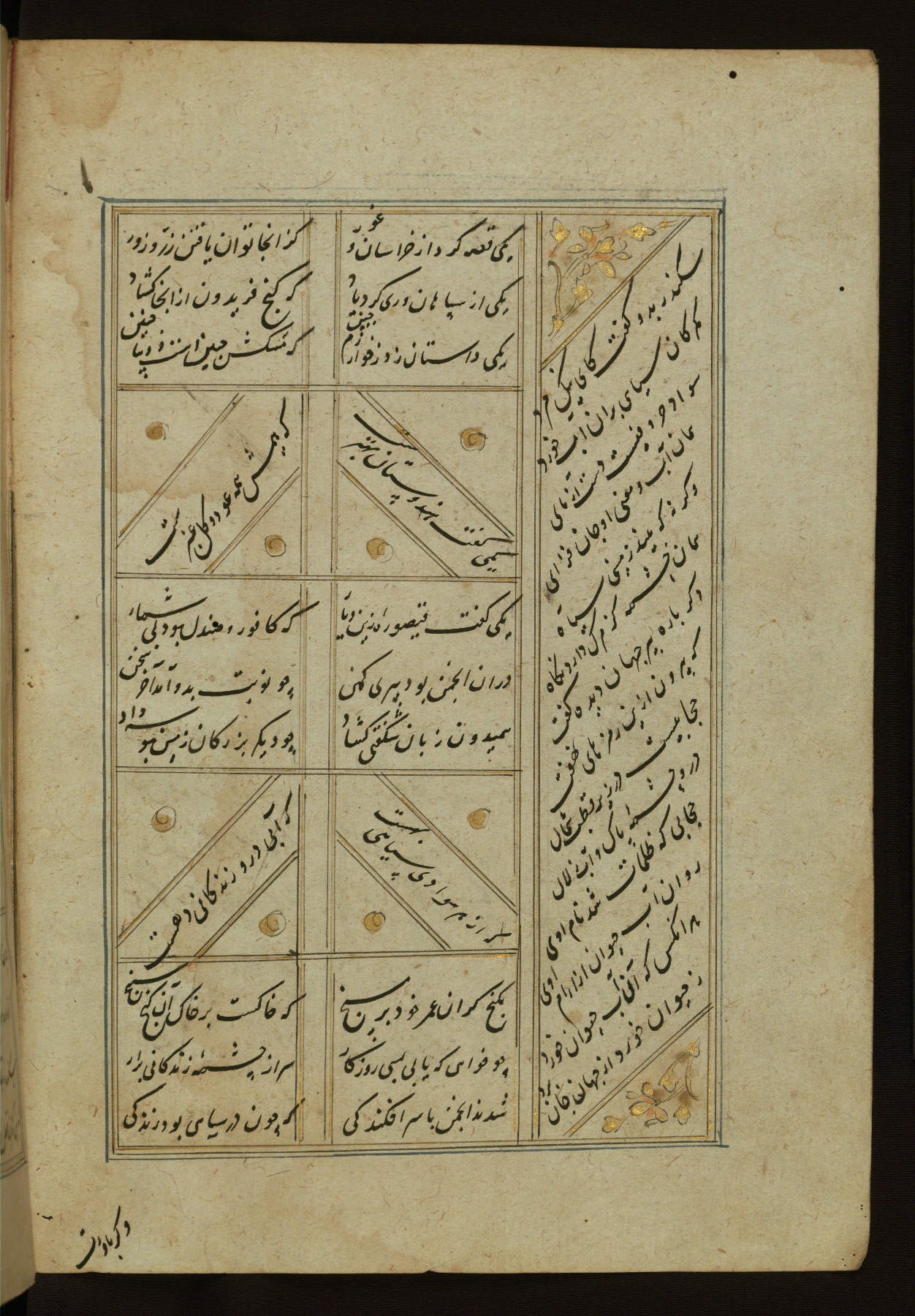 This copy of the Khamsah (quintet) of Niẓāmī Ganjavī (d. 605 AH / 1209 CE) was written by Abū Bakr Shāh ibn Ḥasan ibn ʿAlī al-Shahrastānī and illuminated by Jamāl al-Dīn ibn Muḥammad al-Ṣiddīqī al-Iṣfahānī between 892 AH / 1486 CE and 900 AH / 1494-5 CE. The manuscript opens with a double-page illuminated frontispiece with an inscription giving the title of the work and the name of the author (fols. 1b-2a). There are four illuminated titlepieces with the names of the individual poems and twenty-six repainted illustrations. According to evidence supplied by the colophons, the original binding was by the hand of Jamāl al-Dīn ibn Muḥammad al-Ṣiddīqī al-Iṣfahānī, as well. Unfortunately, it has not survived. The binding presently attached to the manuscript dates to the twelfth century AH / eighteenth CE.