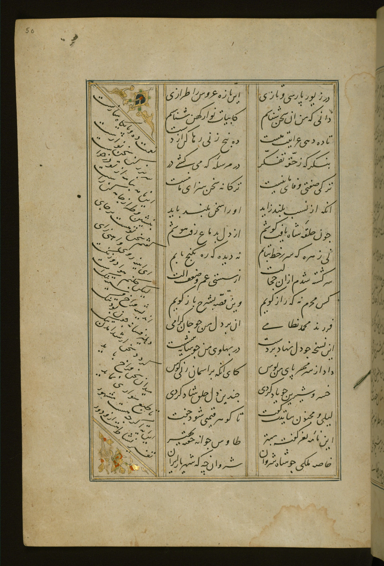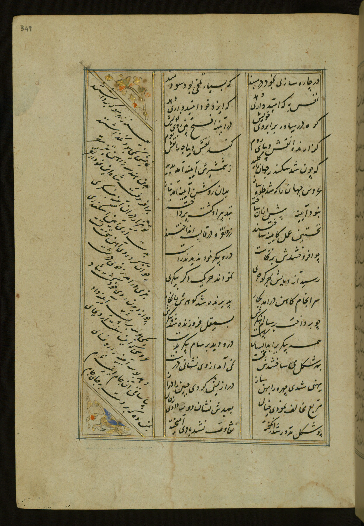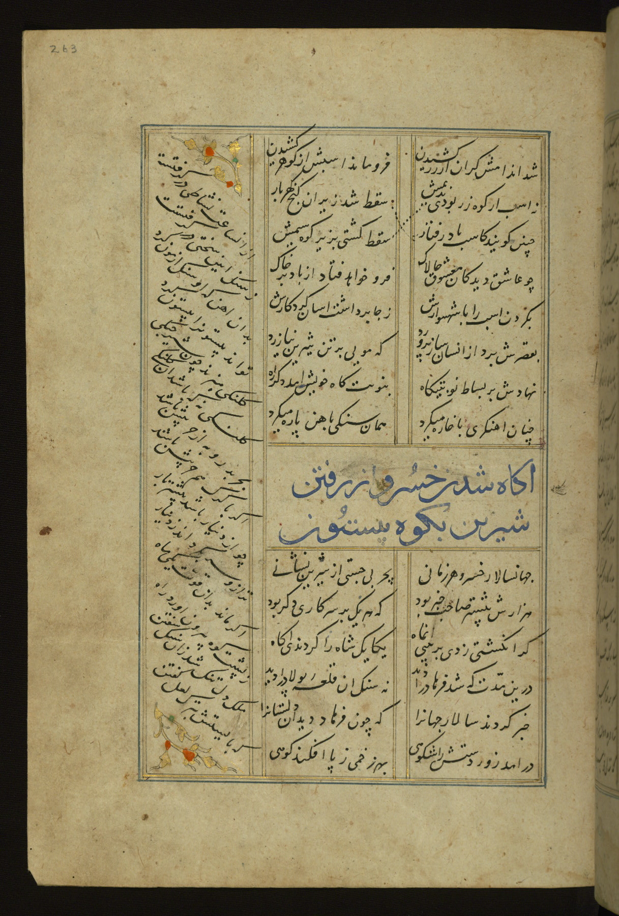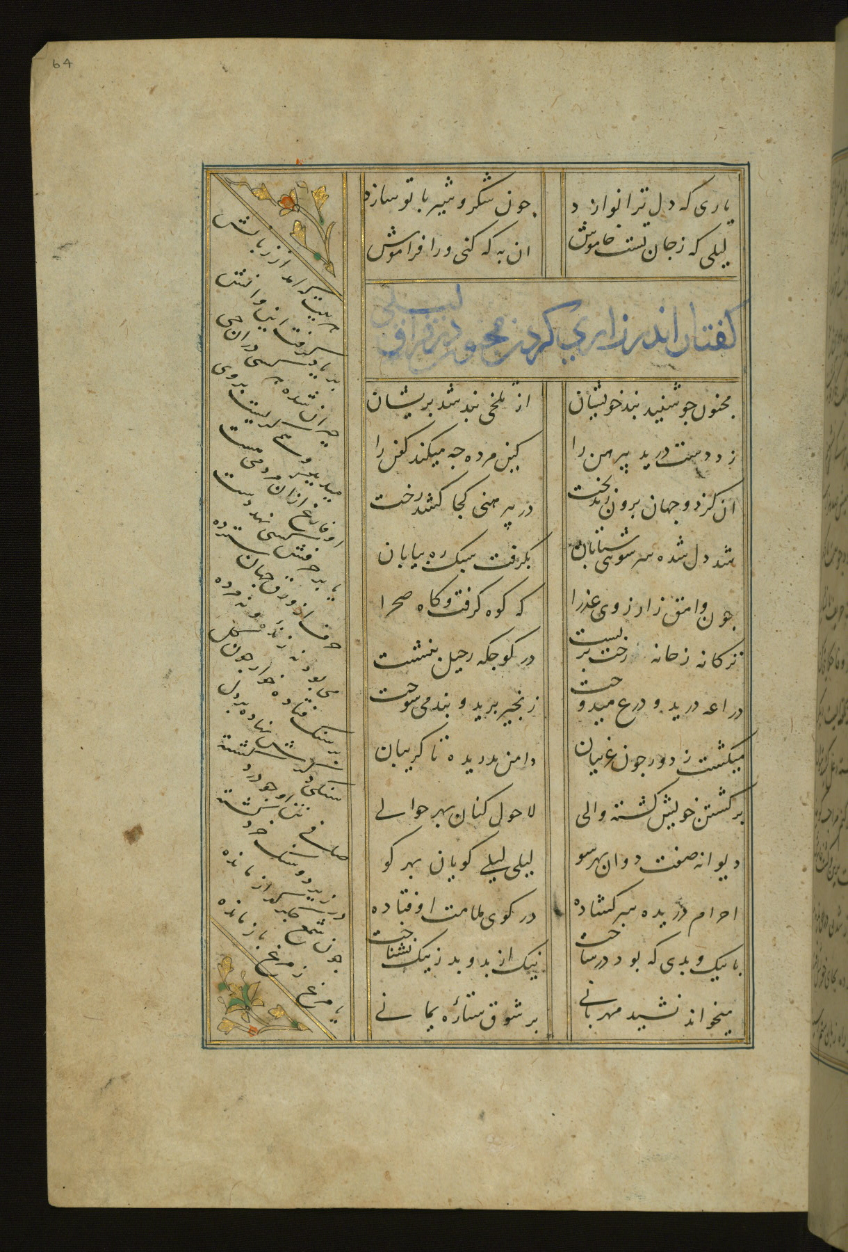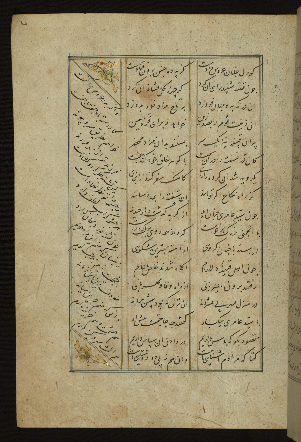 This copy of the Khamsah (quintet) of Niẓāmī Ganjavī (d. 605 AH / 1209 CE) was written by Abū Bakr Shāh ibn Ḥasan ibn ʿAlī al-Shahrastānī and illuminated by Jamāl al-Dīn ibn Muḥammad al-Ṣiddīqī al-Iṣfahānī between 892 AH / 1486 CE and 900 AH / 1494-5 CE. The manuscript opens with a double-page illuminated frontispiece with an inscription giving the title of the work and the name of the author (fols. 1b-2a). There are four illuminated titlepieces with the names of the individual poems and twenty-six repainted illustrations. According to evidence supplied by the colophons, the original binding was by the hand of Jamāl al-Dīn ibn Muḥammad al-Ṣiddīqī al-Iṣfahānī, as well. Unfortunately, it has not survived. The binding presently attached to the manuscript dates to the twelfth century AH / eighteenth CE.