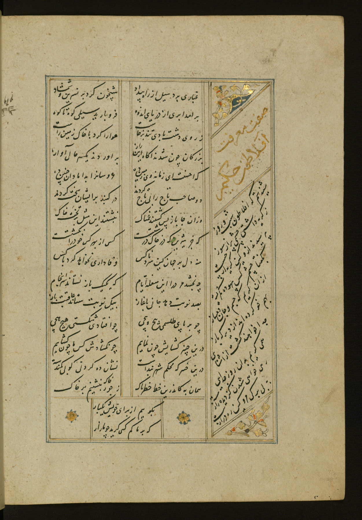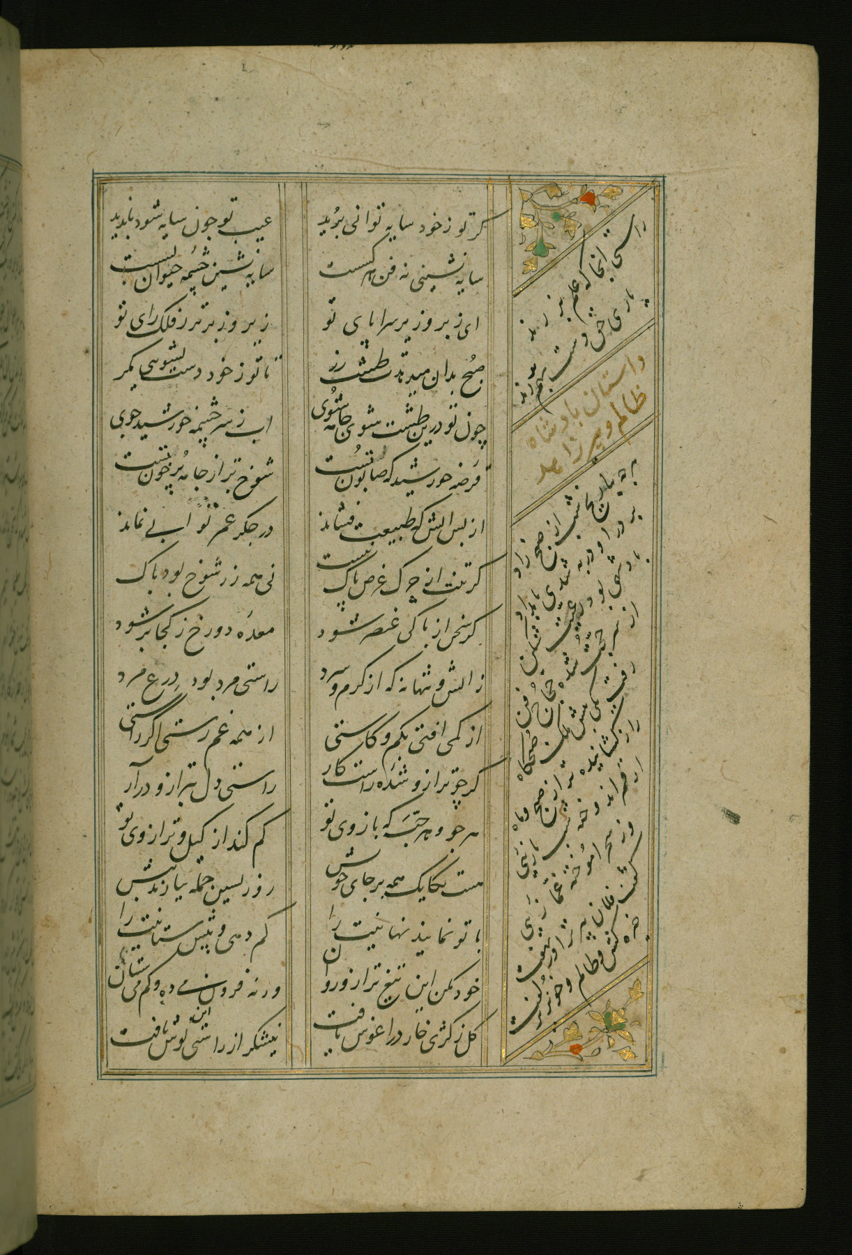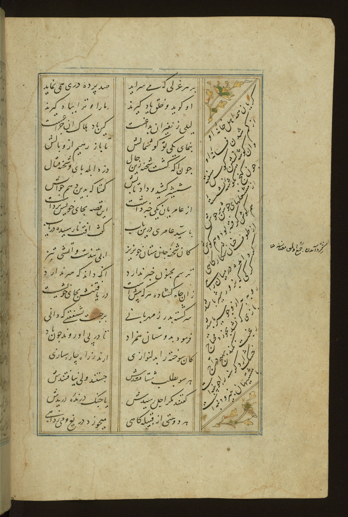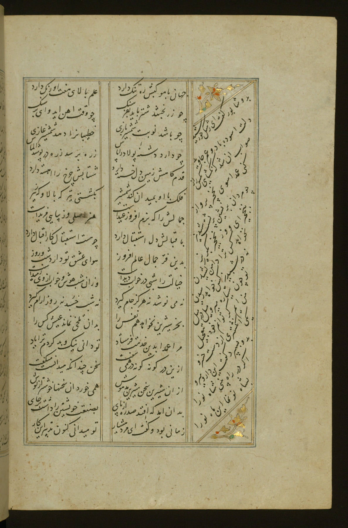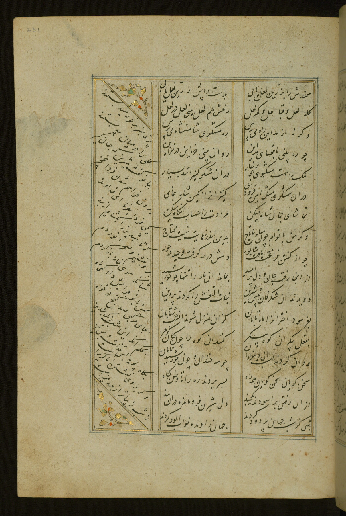 This copy of the Khamsah (quintet) of Niẓāmī Ganjavī (d. 605 AH / 1209 CE) was written by Abū Bakr Shāh ibn Ḥasan ibn ʿAlī al-Shahrastānī and illuminated by Jamāl al-Dīn ibn Muḥammad al-Ṣiddīqī al-Iṣfahānī between 892 AH / 1486 CE and 900 AH / 1494-5 CE. The manuscript opens with a double-page illuminated frontispiece with an inscription giving the title of the work and the name of the author (fols. 1b-2a). There are four illuminated titlepieces with the names of the individual poems and twenty-six repainted illustrations. According to evidence supplied by the colophons, the original binding was by the hand of Jamāl al-Dīn ibn Muḥammad al-Ṣiddīqī al-Iṣfahānī, as well. Unfortunately, it has not survived. The binding presently attached to the manuscript dates to the twelfth century AH / eighteenth CE.