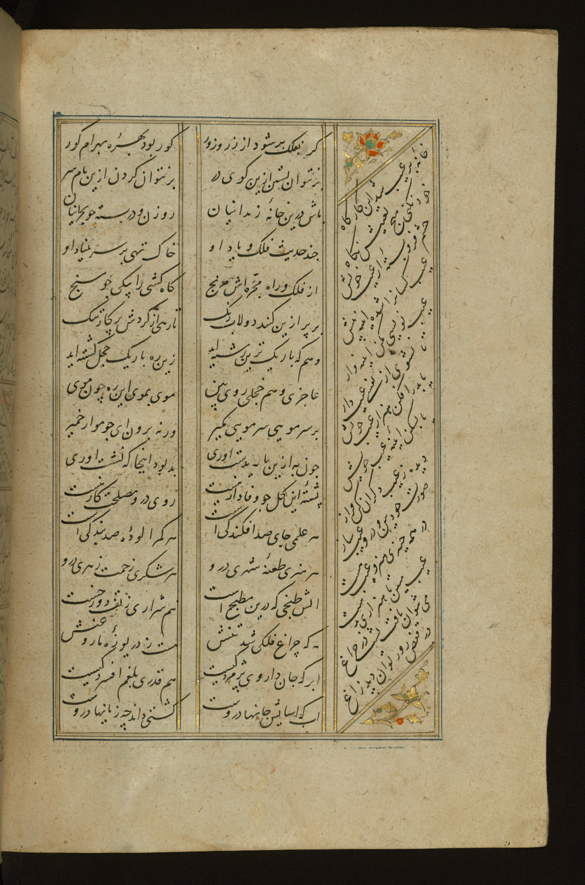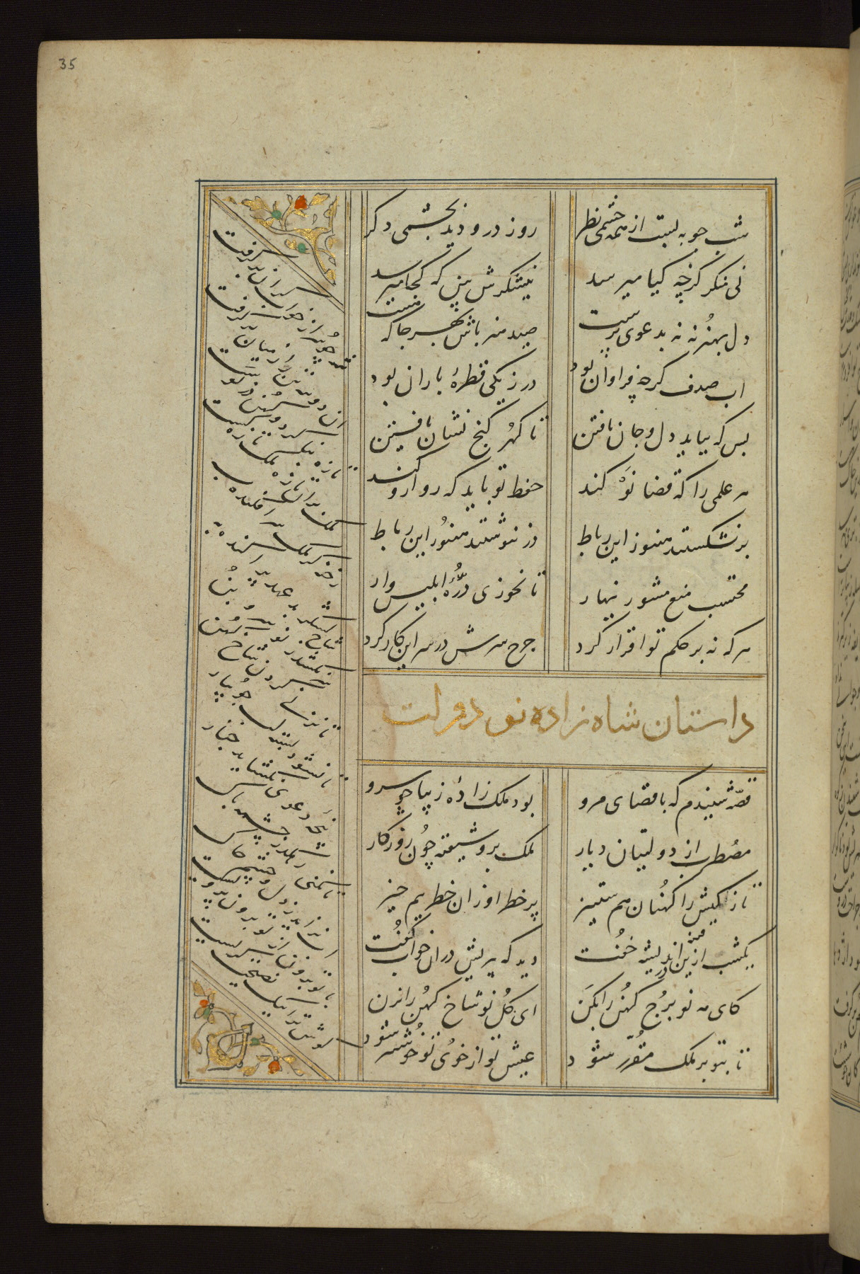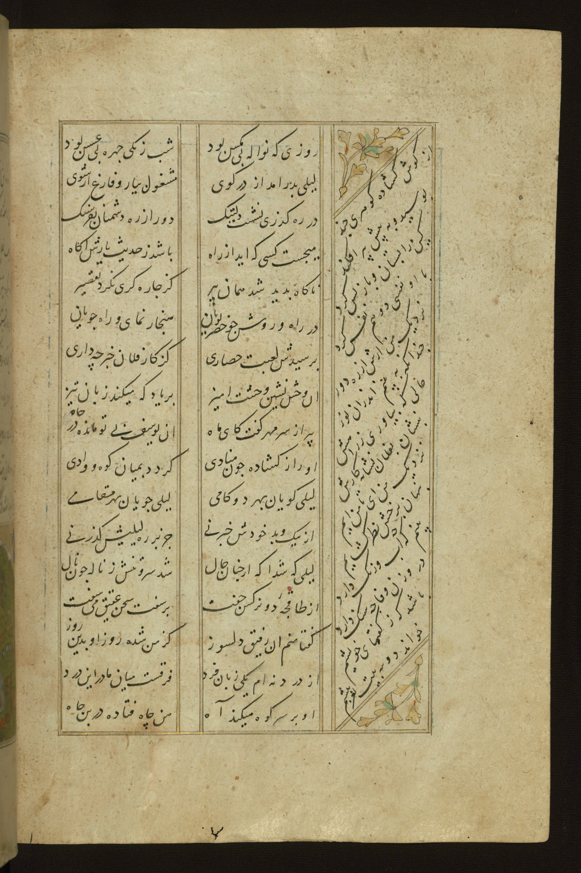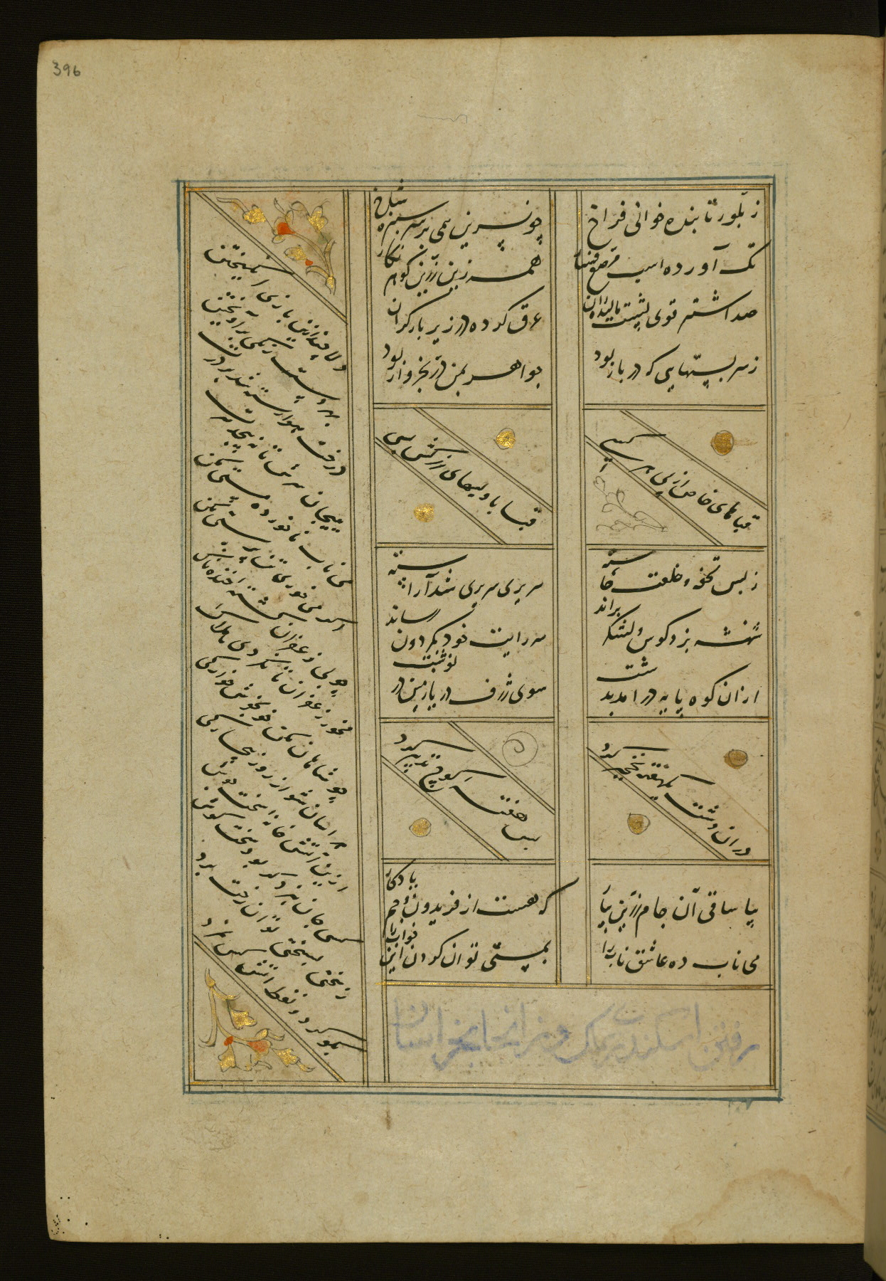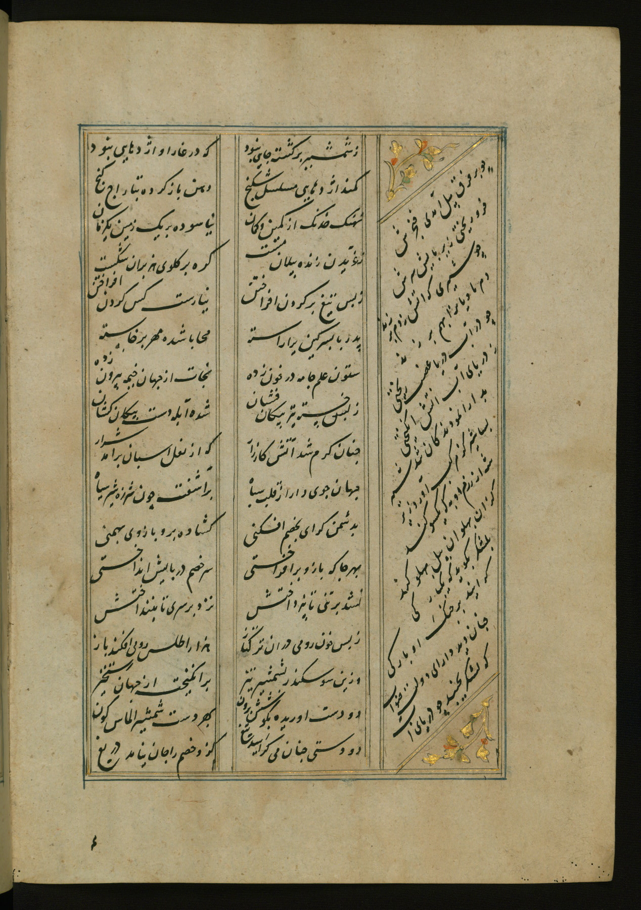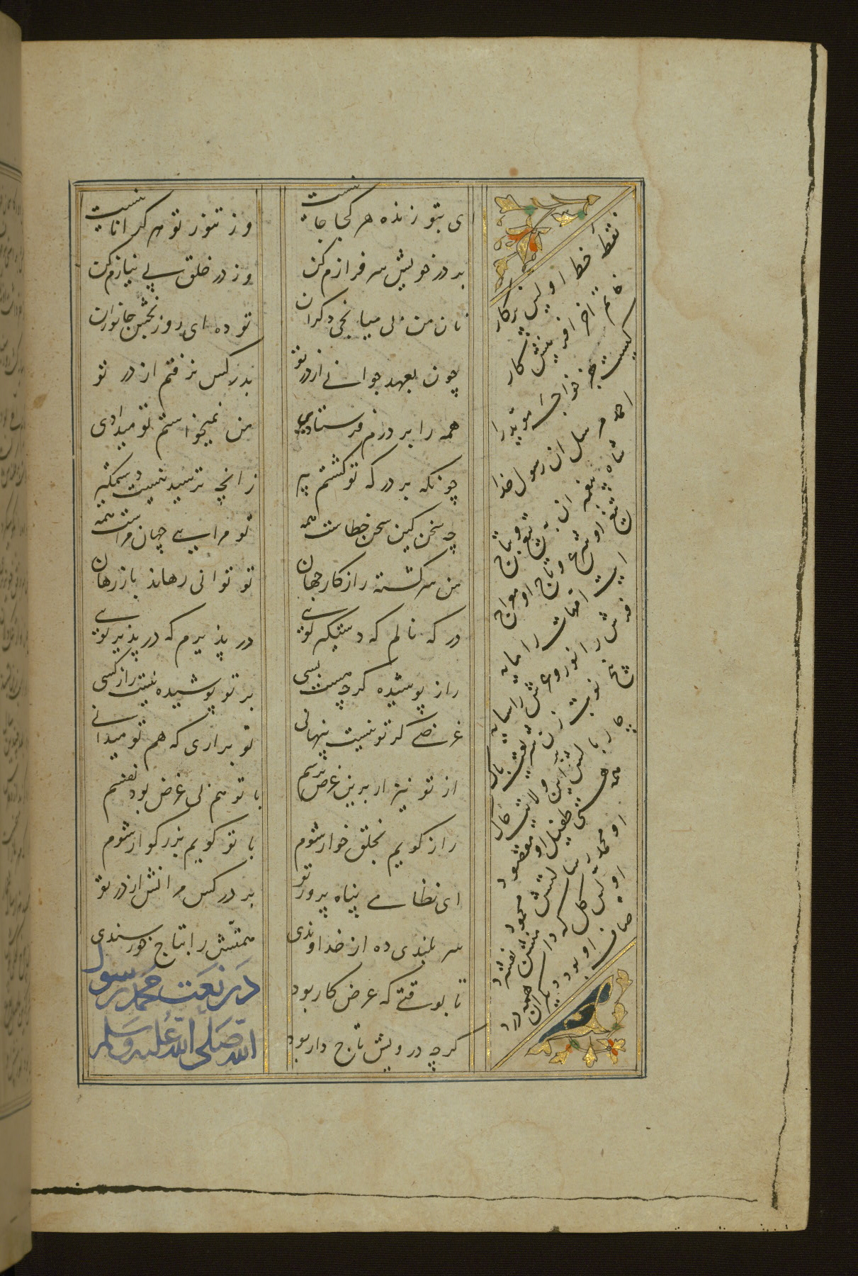 This copy of the Khamsah (quintet) of Niẓāmī Ganjavī (d. 605 AH / 1209 CE) was written by Abū Bakr Shāh ibn Ḥasan ibn ʿAlī al-Shahrastānī and illuminated by Jamāl al-Dīn ibn Muḥammad al-Ṣiddīqī al-Iṣfahānī between 892 AH / 1486 CE and 900 AH / 1494-5 CE. The manuscript opens with a double-page illuminated frontispiece with an inscription giving the title of the work and the name of the author (fols. 1b-2a). There are four illuminated titlepieces with the names of the individual poems and twenty-six repainted illustrations. According to evidence supplied by the colophons, the original binding was by the hand of Jamāl al-Dīn ibn Muḥammad al-Ṣiddīqī al-Iṣfahānī, as well. Unfortunately, it has not survived. The binding presently attached to the manuscript dates to the twelfth century AH / eighteenth CE.