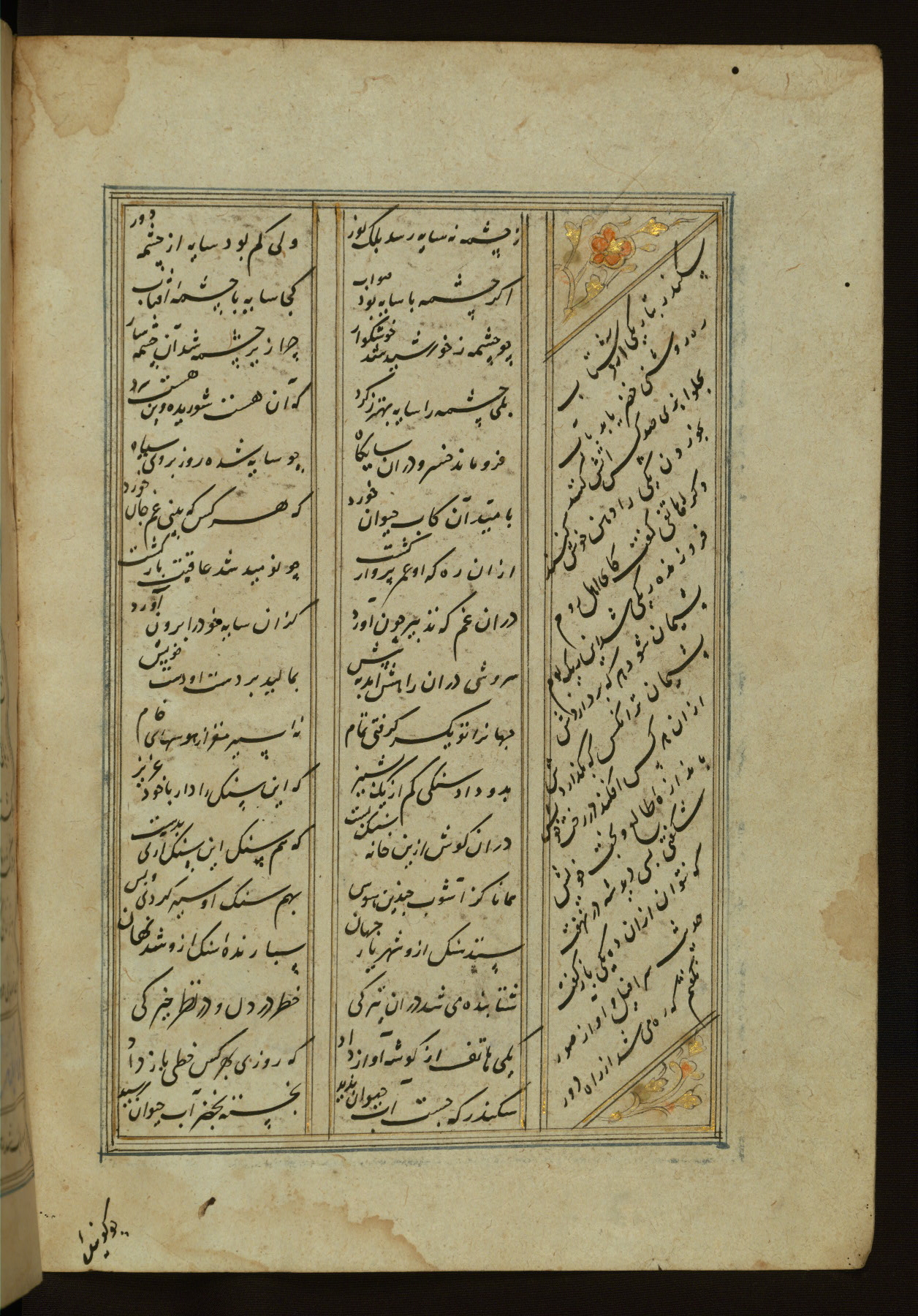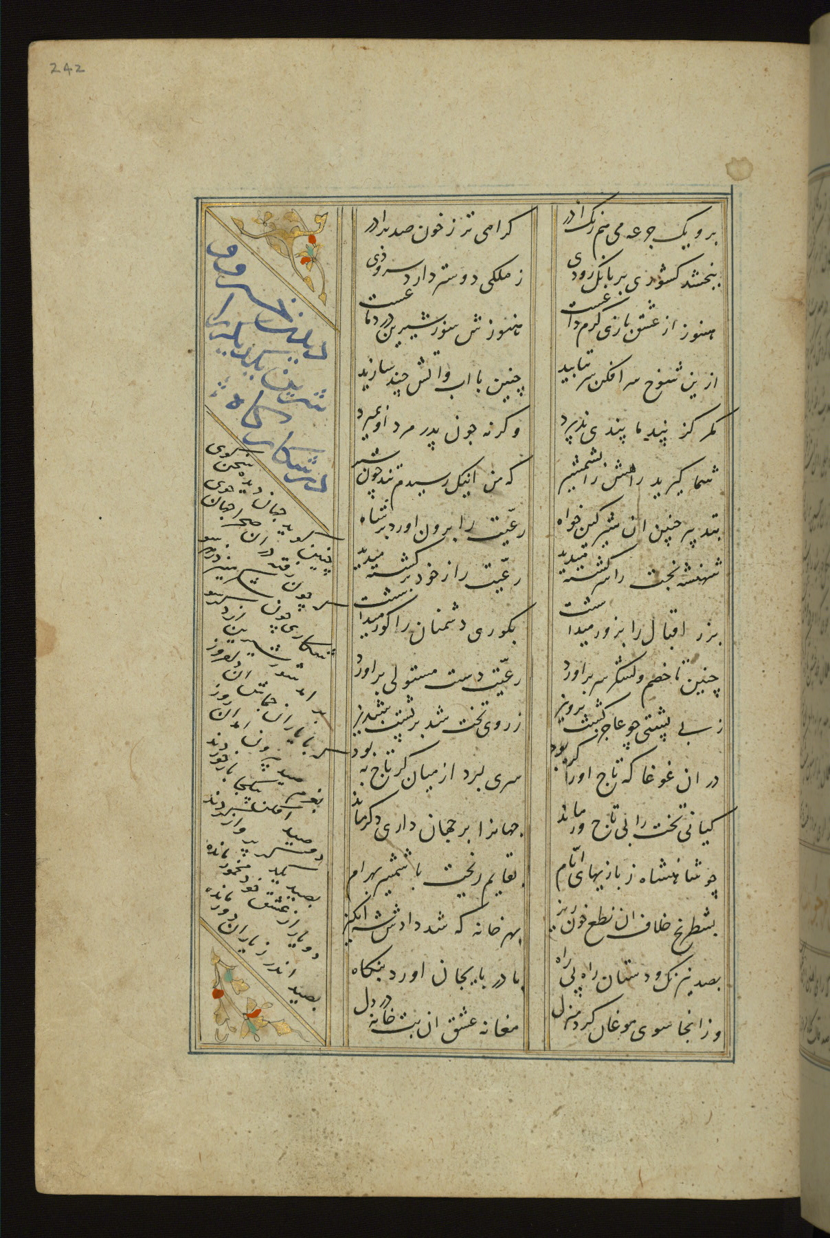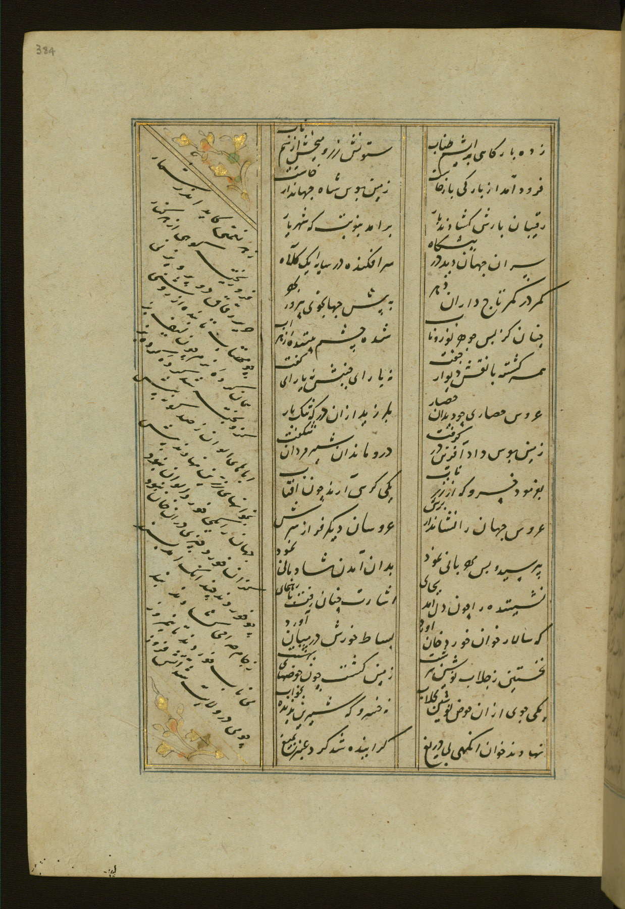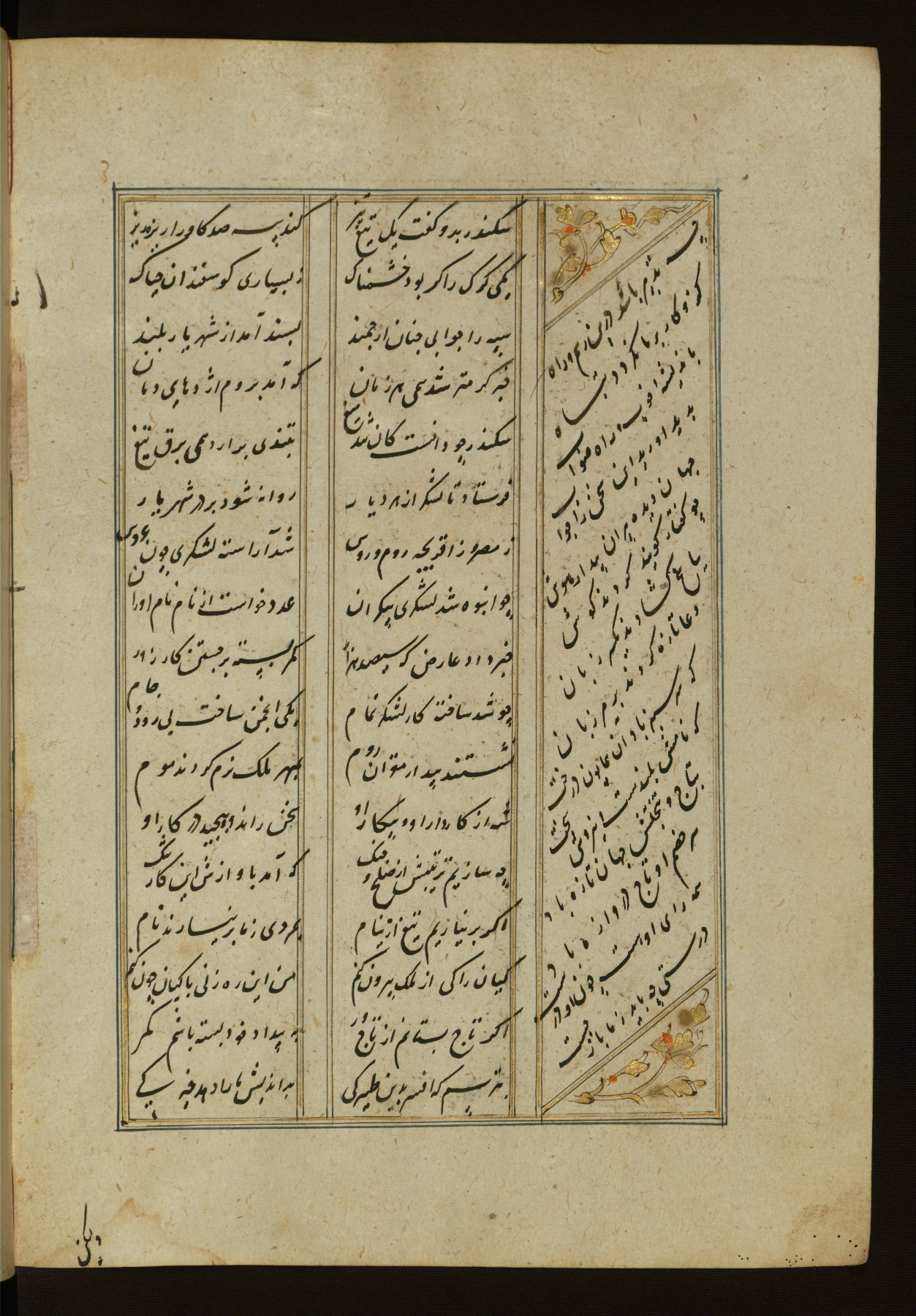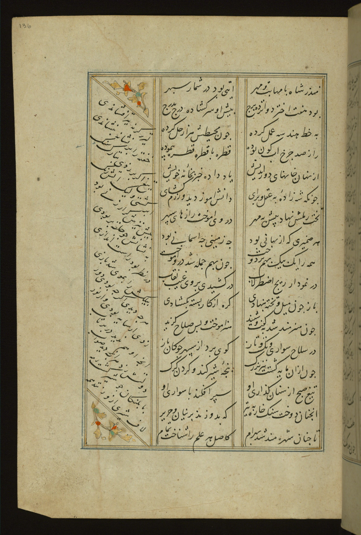 This copy of the Khamsah (quintet) of Niẓāmī Ganjavī (d. 605 AH / 1209 CE) was written by Abū Bakr Shāh ibn Ḥasan ibn ʿAlī al-Shahrastānī and illuminated by Jamāl al-Dīn ibn Muḥammad al-Ṣiddīqī al-Iṣfahānī between 892 AH / 1486 CE and 900 AH / 1494-5 CE. The manuscript opens with a double-page illuminated frontispiece with an inscription giving the title of the work and the name of the author (fols. 1b-2a). There are four illuminated titlepieces with the names of the individual poems and twenty-six repainted illustrations. According to evidence supplied by the colophons, the original binding was by the hand of Jamāl al-Dīn ibn Muḥammad al-Ṣiddīqī al-Iṣfahānī, as well. Unfortunately, it has not survived. The binding presently attached to the manuscript dates to the twelfth century AH / eighteenth CE.