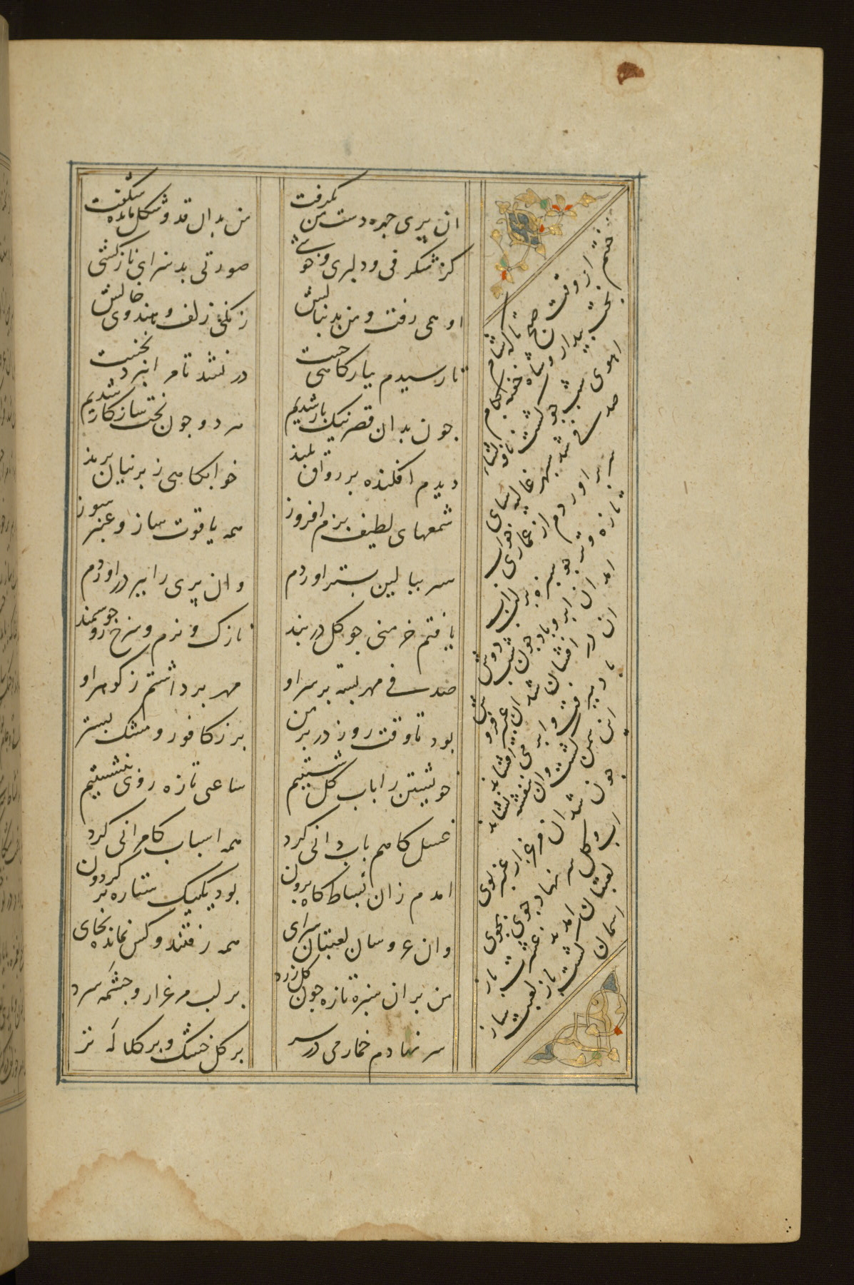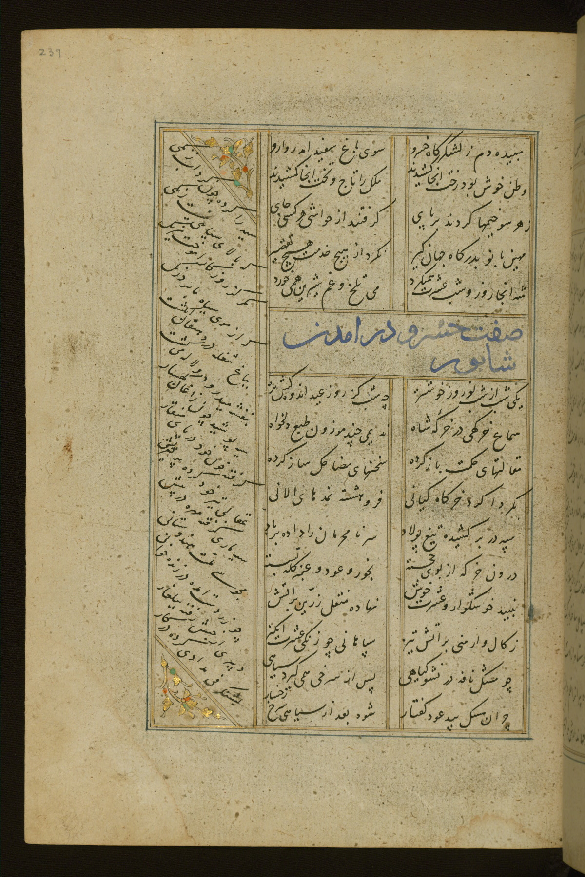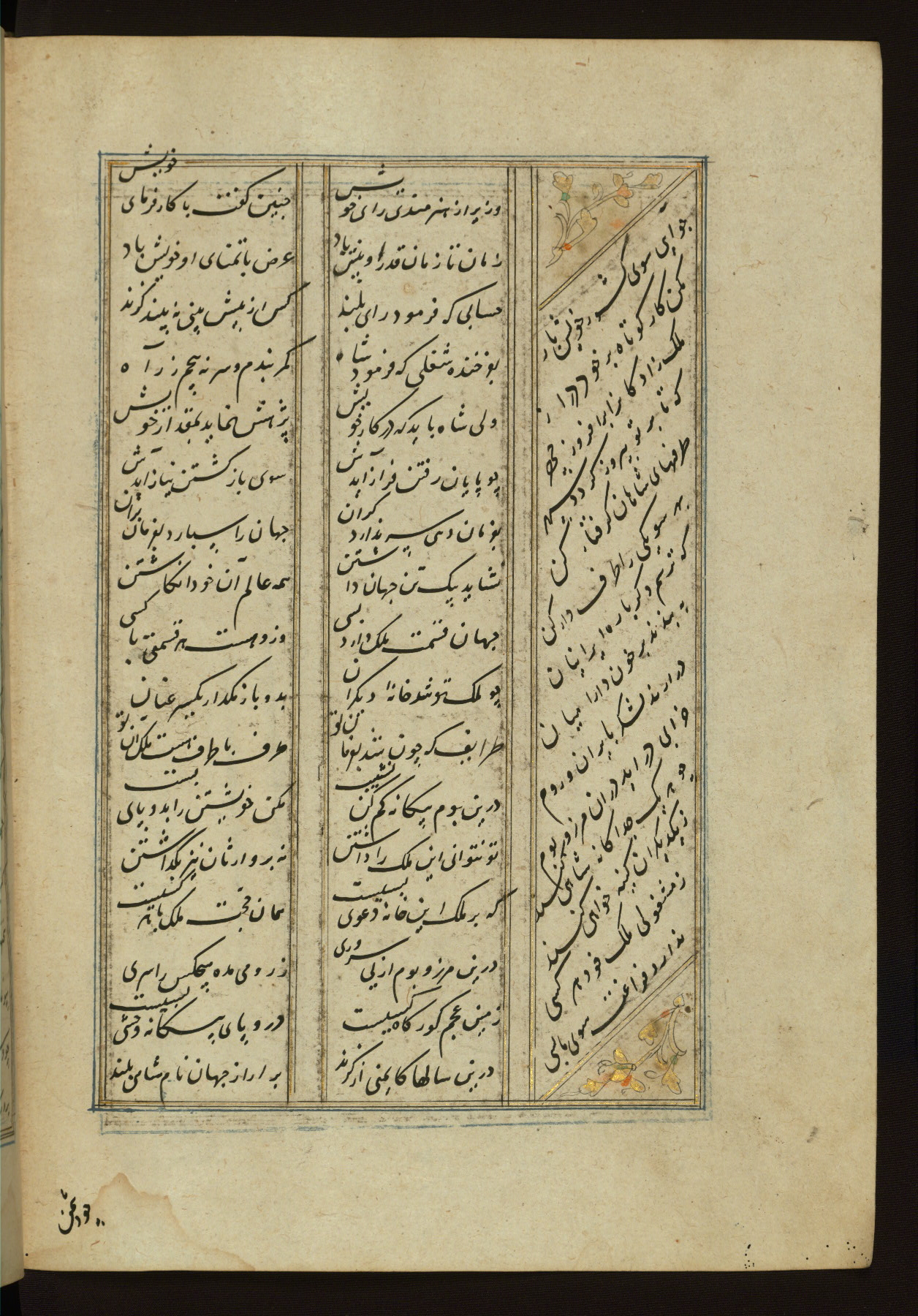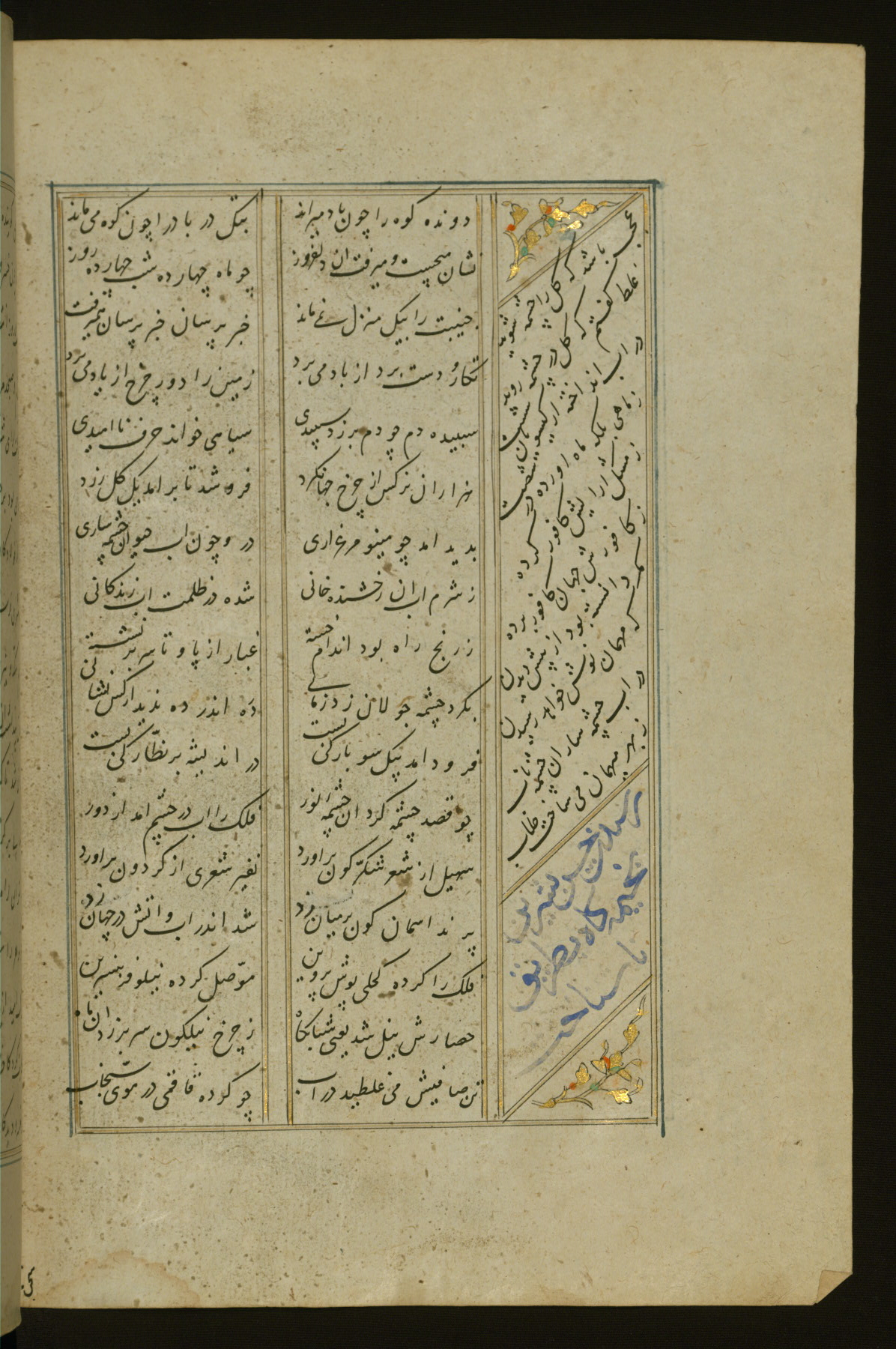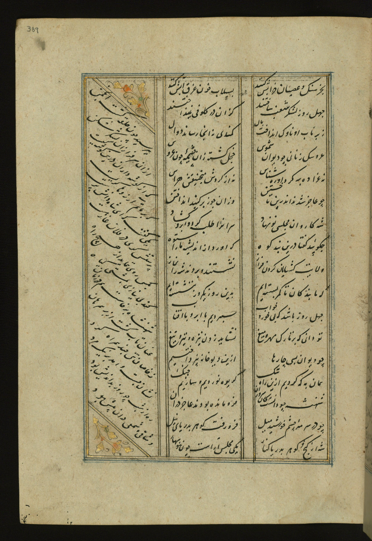 This copy of the Khamsah (quintet) of Niẓāmī Ganjavī (d. 605 AH / 1209 CE) was written by Abū Bakr Shāh ibn Ḥasan ibn ʿAlī al-Shahrastānī and illuminated by Jamāl al-Dīn ibn Muḥammad al-Ṣiddīqī al-Iṣfahānī between 892 AH / 1486 CE and 900 AH / 1494-5 CE. The manuscript opens with a double-page illuminated frontispiece with an inscription giving the title of the work and the name of the author (fols. 1b-2a). There are four illuminated titlepieces with the names of the individual poems and twenty-six repainted illustrations. According to evidence supplied by the colophons, the original binding was by the hand of Jamāl al-Dīn ibn Muḥammad al-Ṣiddīqī al-Iṣfahānī, as well. Unfortunately, it has not survived. The binding presently attached to the manuscript dates to the twelfth century AH / eighteenth CE.