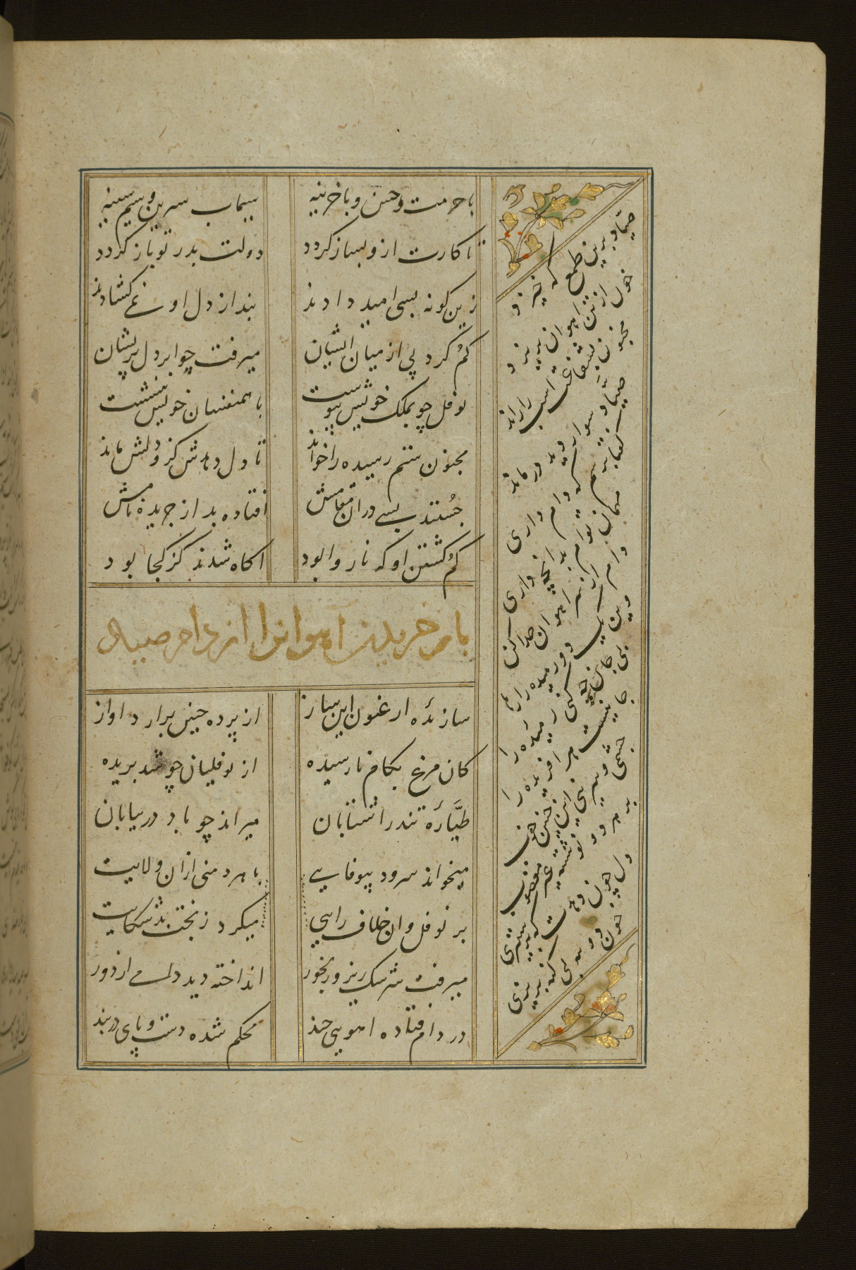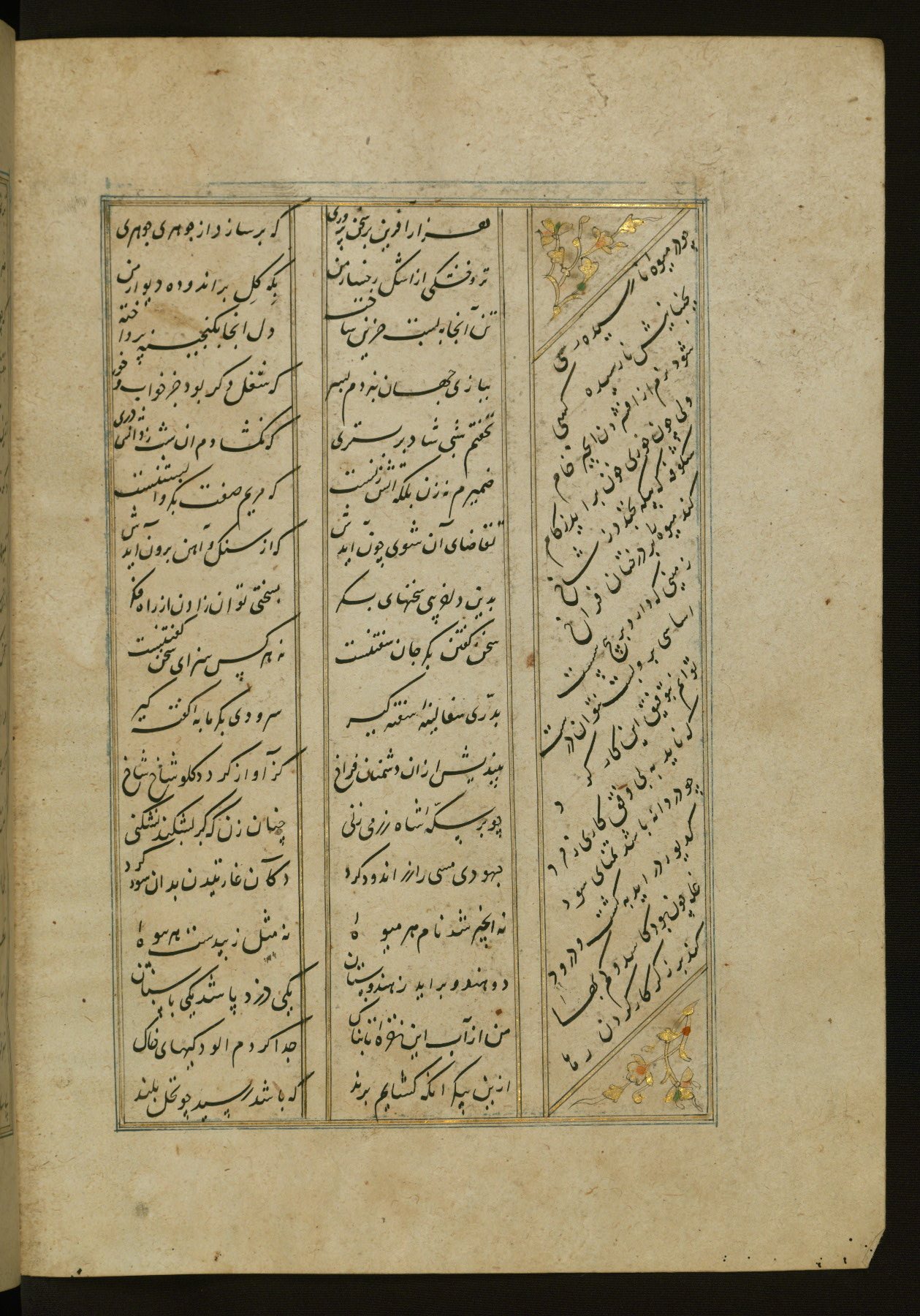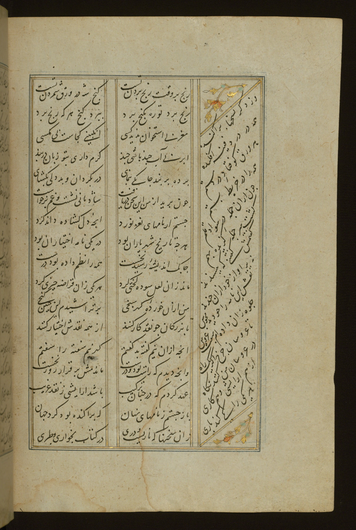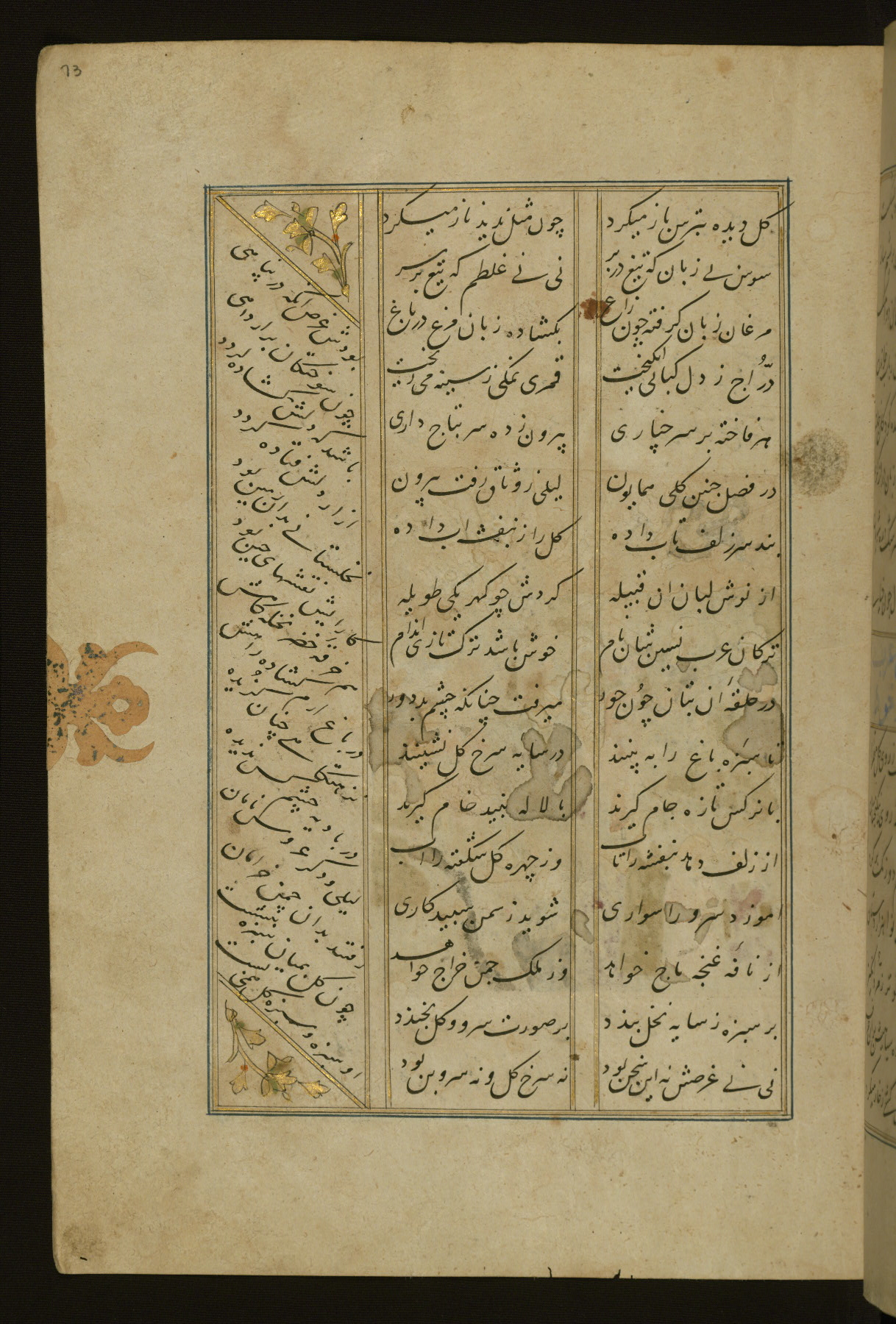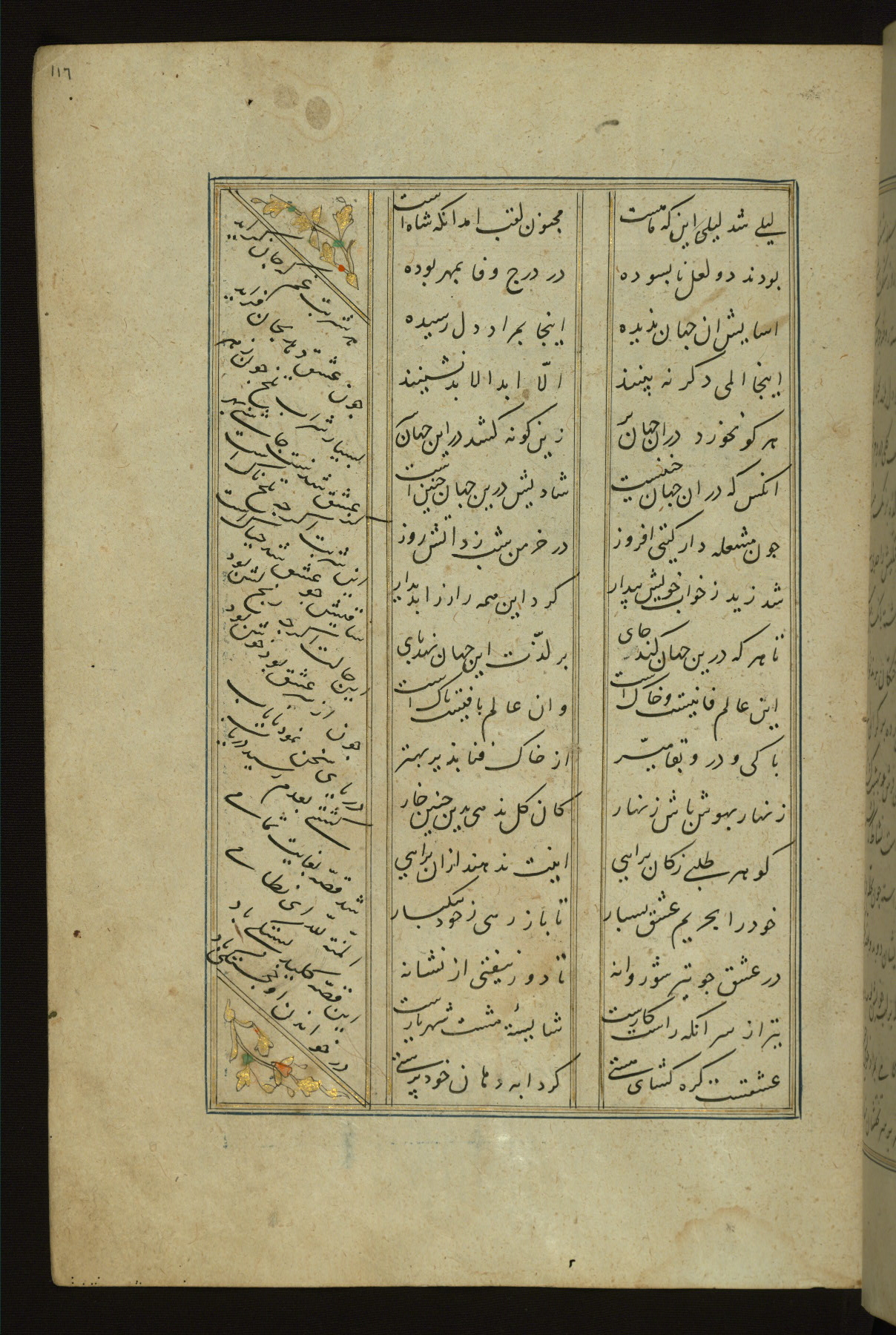 This copy of the Khamsah (quintet) of Niẓāmī Ganjavī (d. 605 AH / 1209 CE) was written by Abū Bakr Shāh ibn Ḥasan ibn ʿAlī al-Shahrastānī and illuminated by Jamāl al-Dīn ibn Muḥammad al-Ṣiddīqī al-Iṣfahānī between 892 AH / 1486 CE and 900 AH / 1494-5 CE. The manuscript opens with a double-page illuminated frontispiece with an inscription giving the title of the work and the name of the author (fols. 1b-2a). There are four illuminated titlepieces with the names of the individual poems and twenty-six repainted illustrations. According to evidence supplied by the colophons, the original binding was by the hand of Jamāl al-Dīn ibn Muḥammad al-Ṣiddīqī al-Iṣfahānī, as well. Unfortunately, it has not survived. The binding presently attached to the manuscript dates to the twelfth century AH / eighteenth CE.