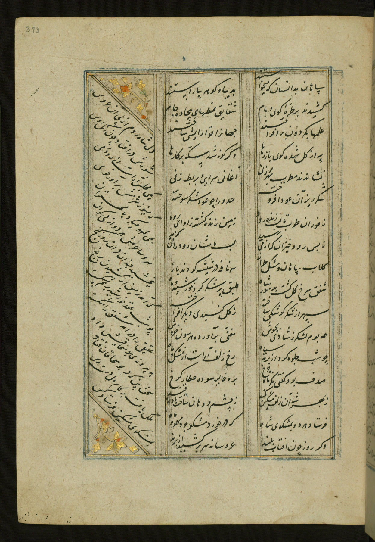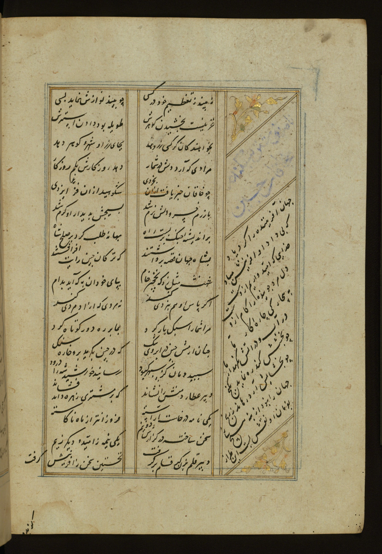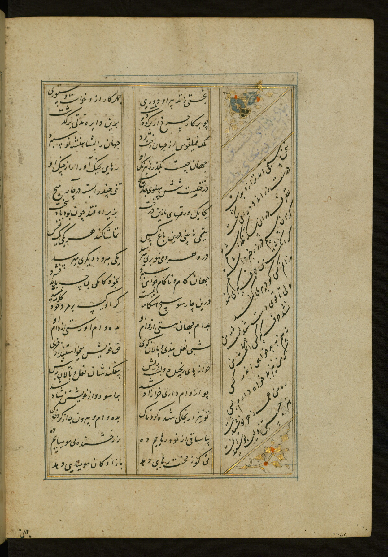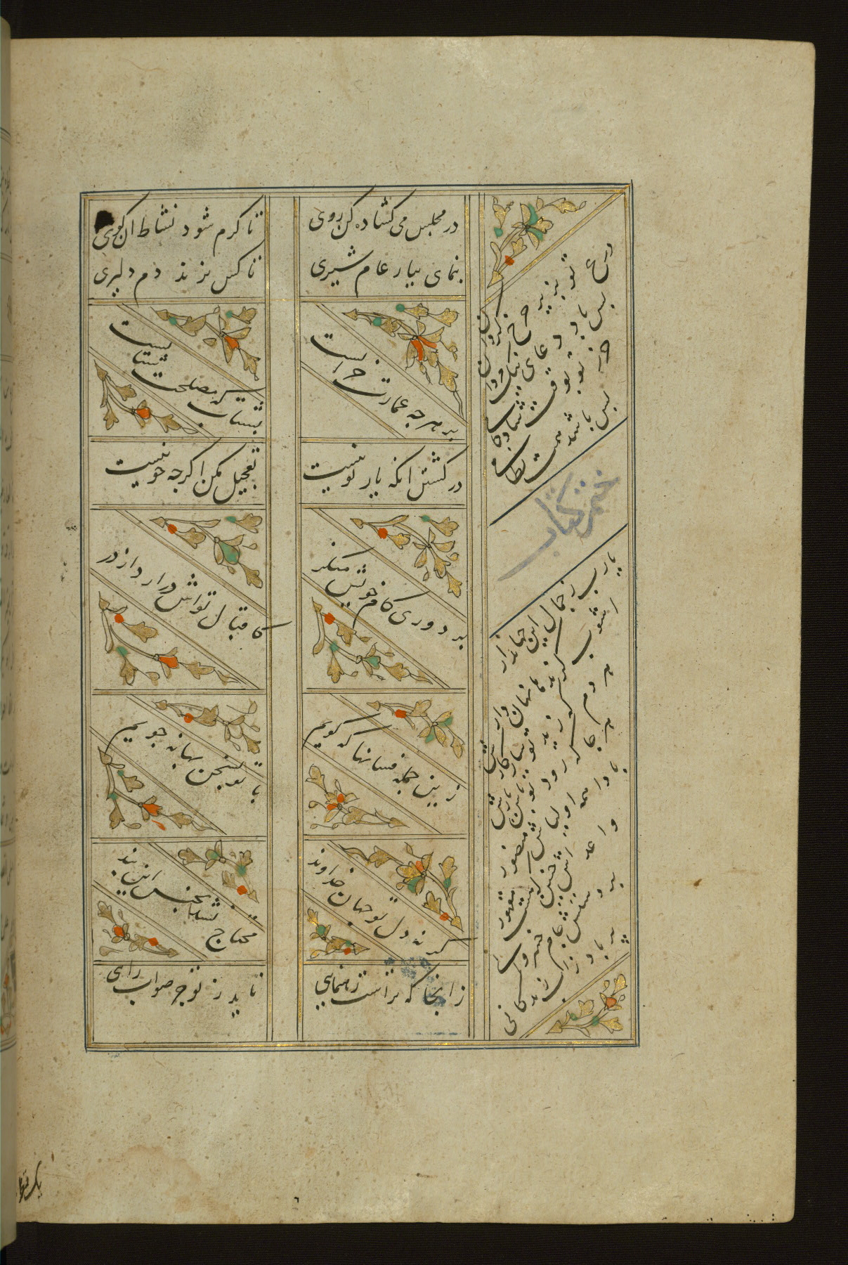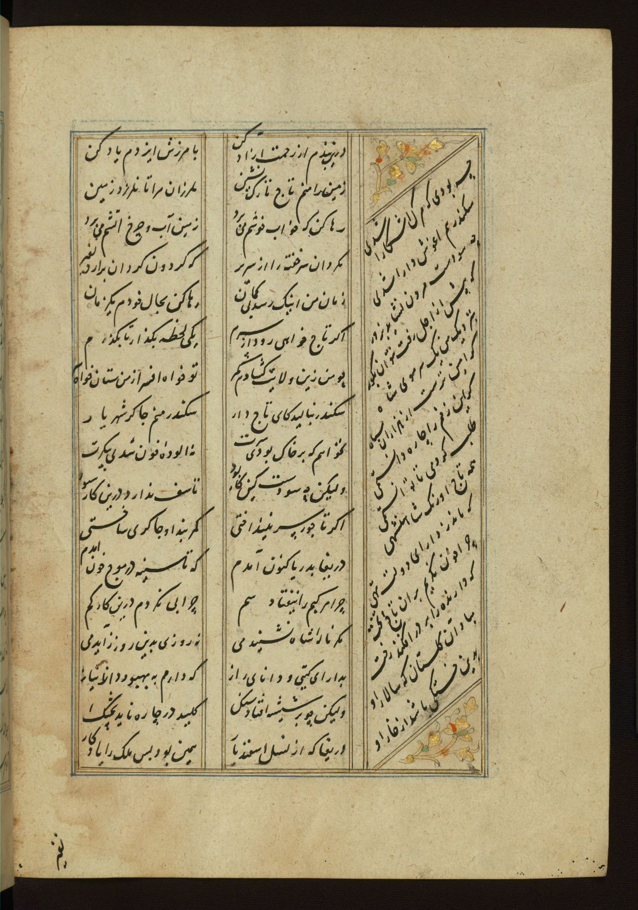 This copy of the Khamsah (quintet) of Niẓāmī Ganjavī (d. 605 AH / 1209 CE) was written by Abū Bakr Shāh ibn Ḥasan ibn ʿAlī al-Shahrastānī and illuminated by Jamāl al-Dīn ibn Muḥammad al-Ṣiddīqī al-Iṣfahānī between 892 AH / 1486 CE and 900 AH / 1494-5 CE. The manuscript opens with a double-page illuminated frontispiece with an inscription giving the title of the work and the name of the author (fols. 1b-2a). There are four illuminated titlepieces with the names of the individual poems and twenty-six repainted illustrations. According to evidence supplied by the colophons, the original binding was by the hand of Jamāl al-Dīn ibn Muḥammad al-Ṣiddīqī al-Iṣfahānī, as well. Unfortunately, it has not survived. The binding presently attached to the manuscript dates to the twelfth century AH / eighteenth CE.