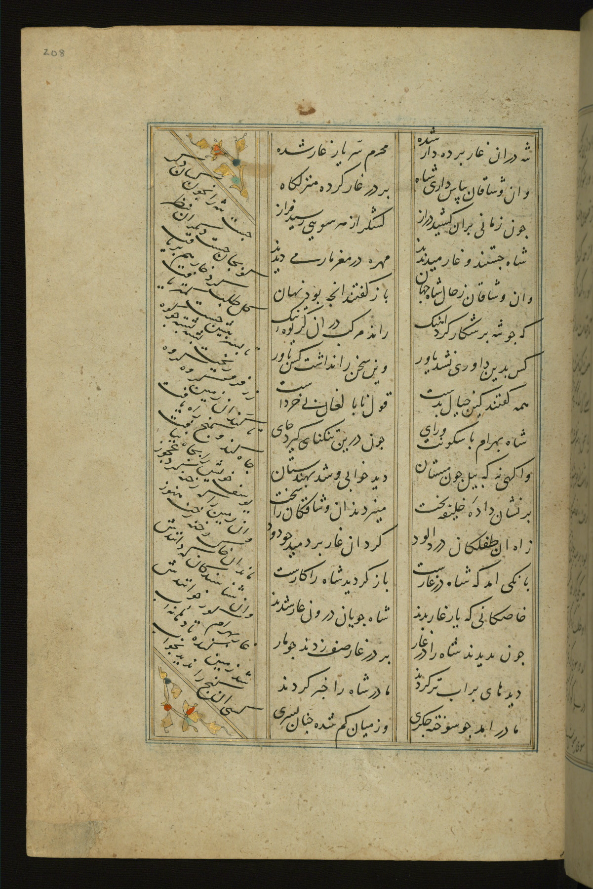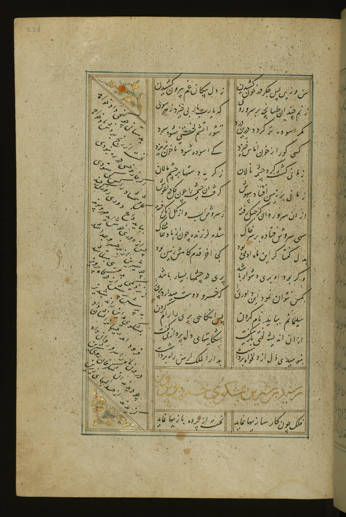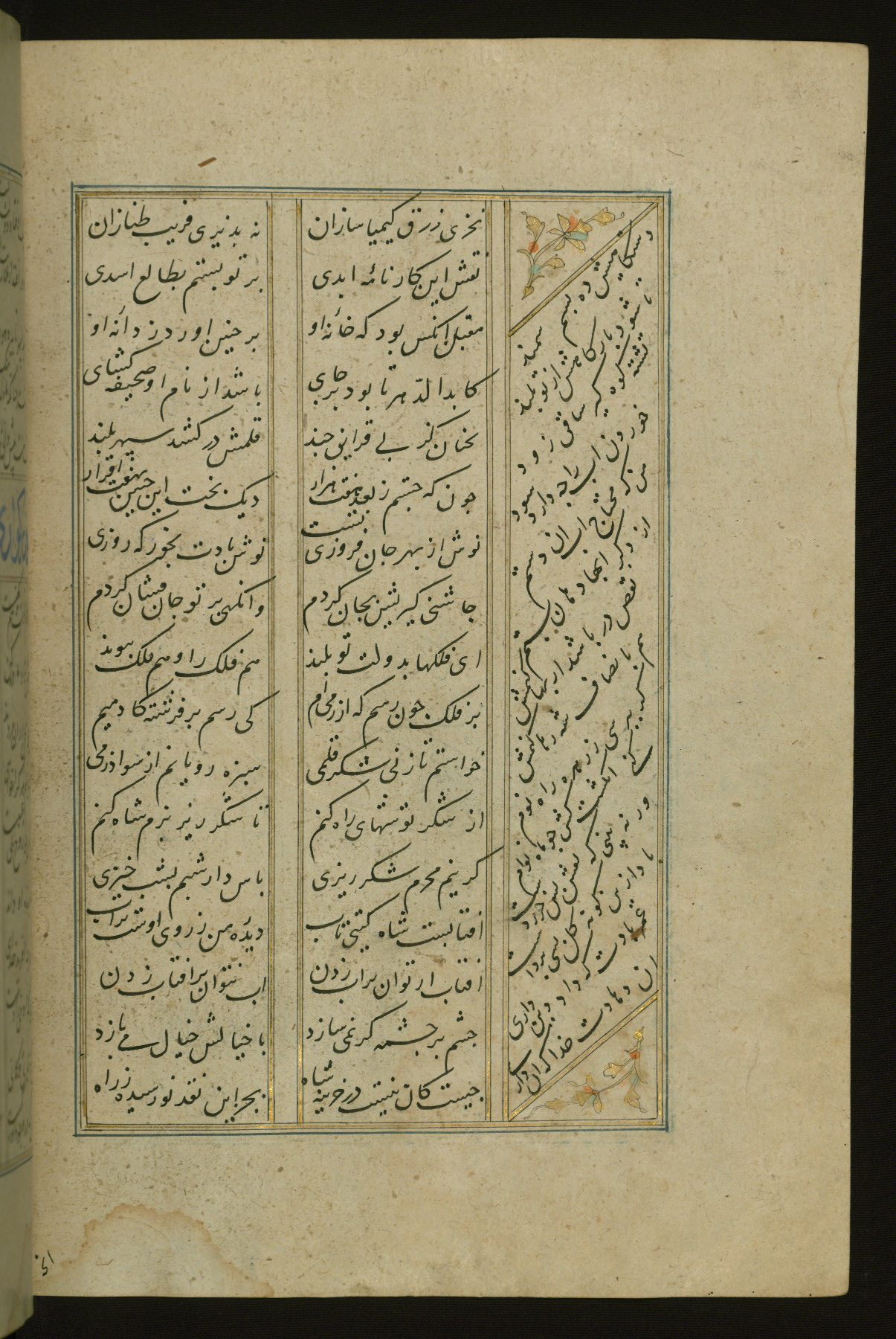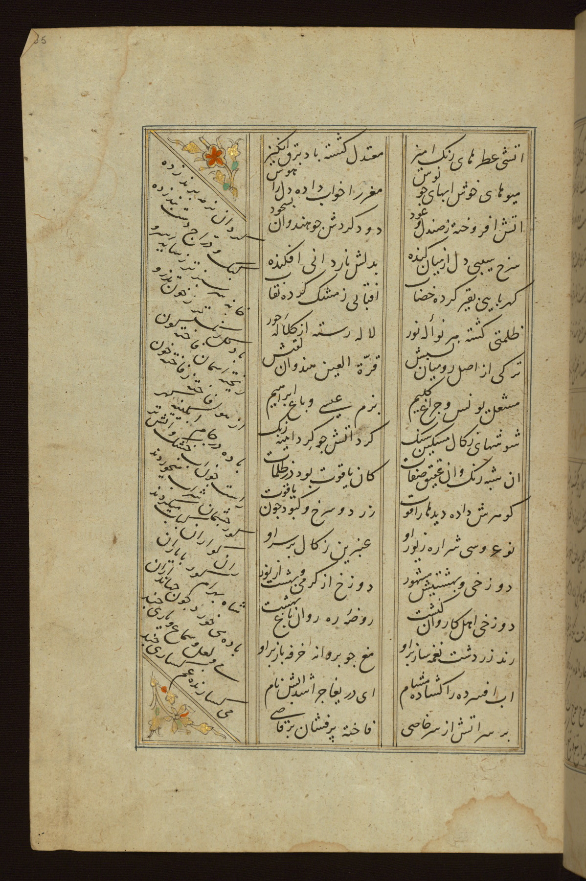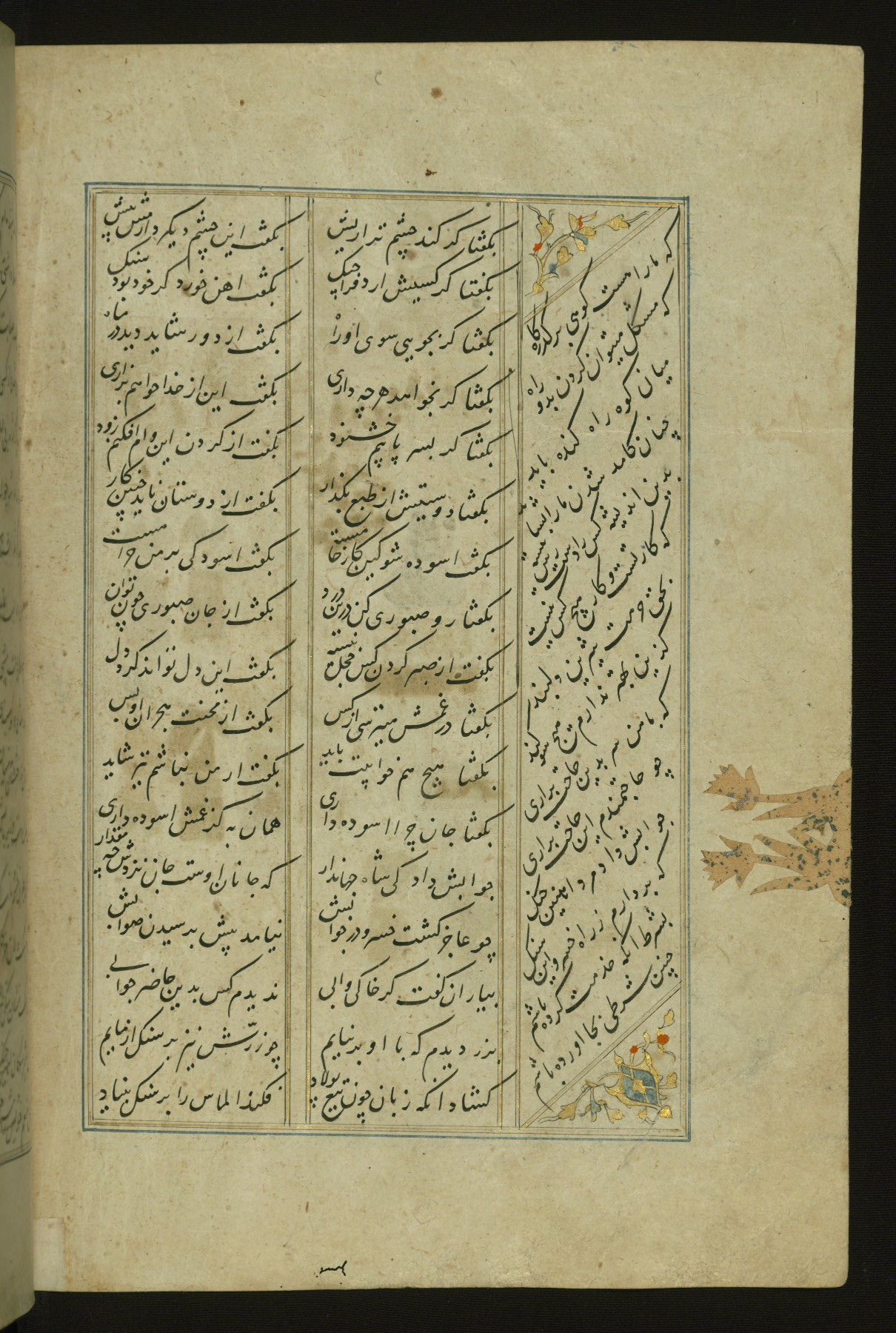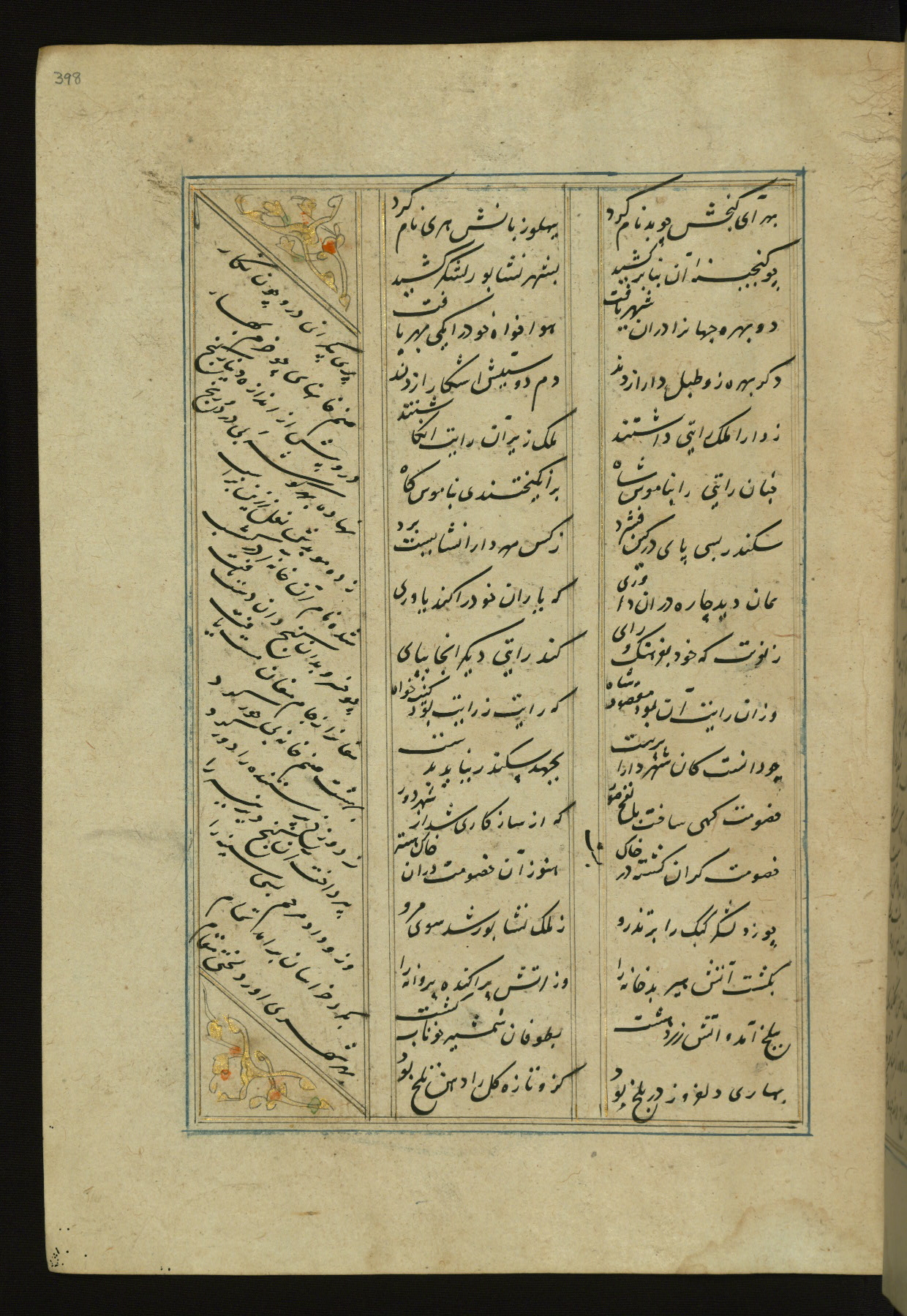This copy of the Khamsah (quintet) of Niẓāmī Ganjavī (d. 605 AH / 1209 CE) was written by Abū Bakr Shāh ibn Ḥasan ibn ʿAlī al-Shahrastānī and illuminated by Jamāl al-Dīn ibn Muḥammad al-Ṣiddīqī al-Iṣfahānī between 892 AH / 1486 CE and 900 AH / 1494-5 CE. The manuscript opens with a double-page illuminated frontispiece with an inscription giving the title of the work and the name of the author (fols. 1b-2a). There are four illuminated titlepieces with the names of the individual poems and twenty-six repainted illustrations. According to evidence supplied by the colophons, the original binding was by the hand of Jamāl al-Dīn ibn Muḥammad al-Ṣiddīqī al-Iṣfahānī, as well. Unfortunately, it has not survived. The binding presently attached to the manuscript dates to the twelfth century AH / eighteenth CE.