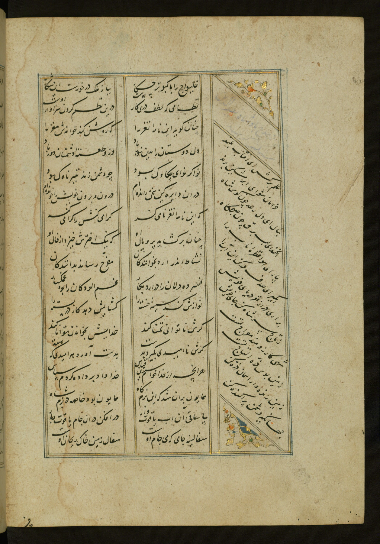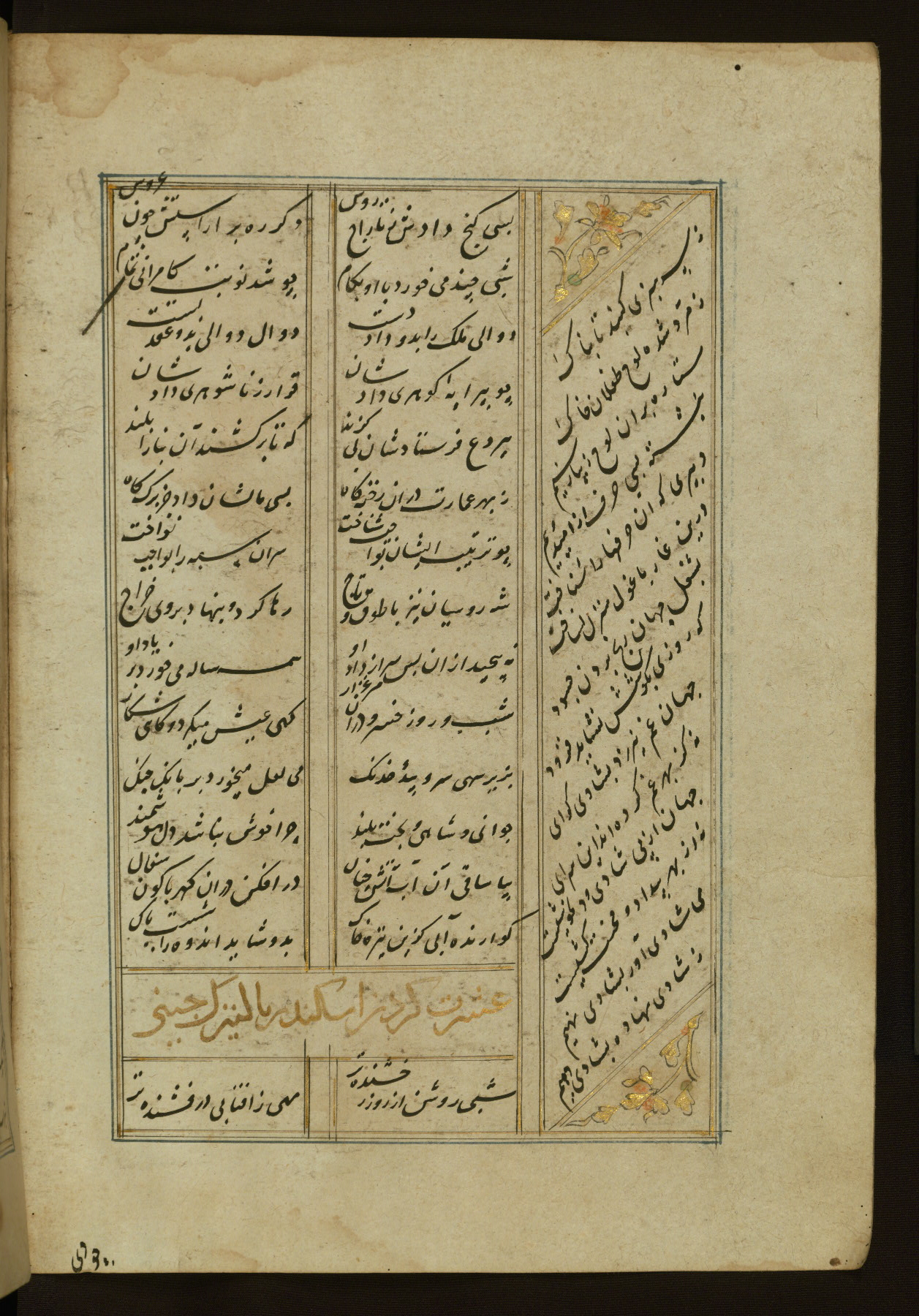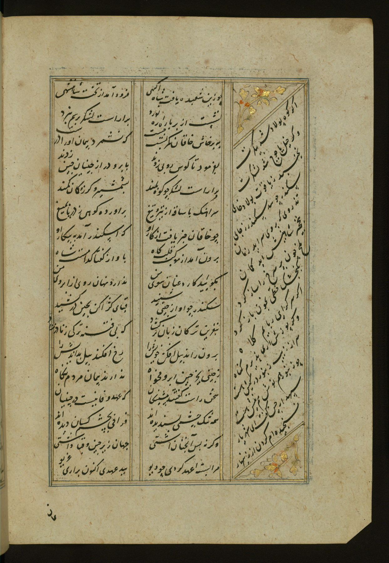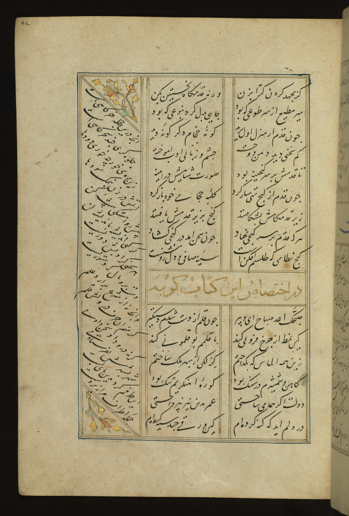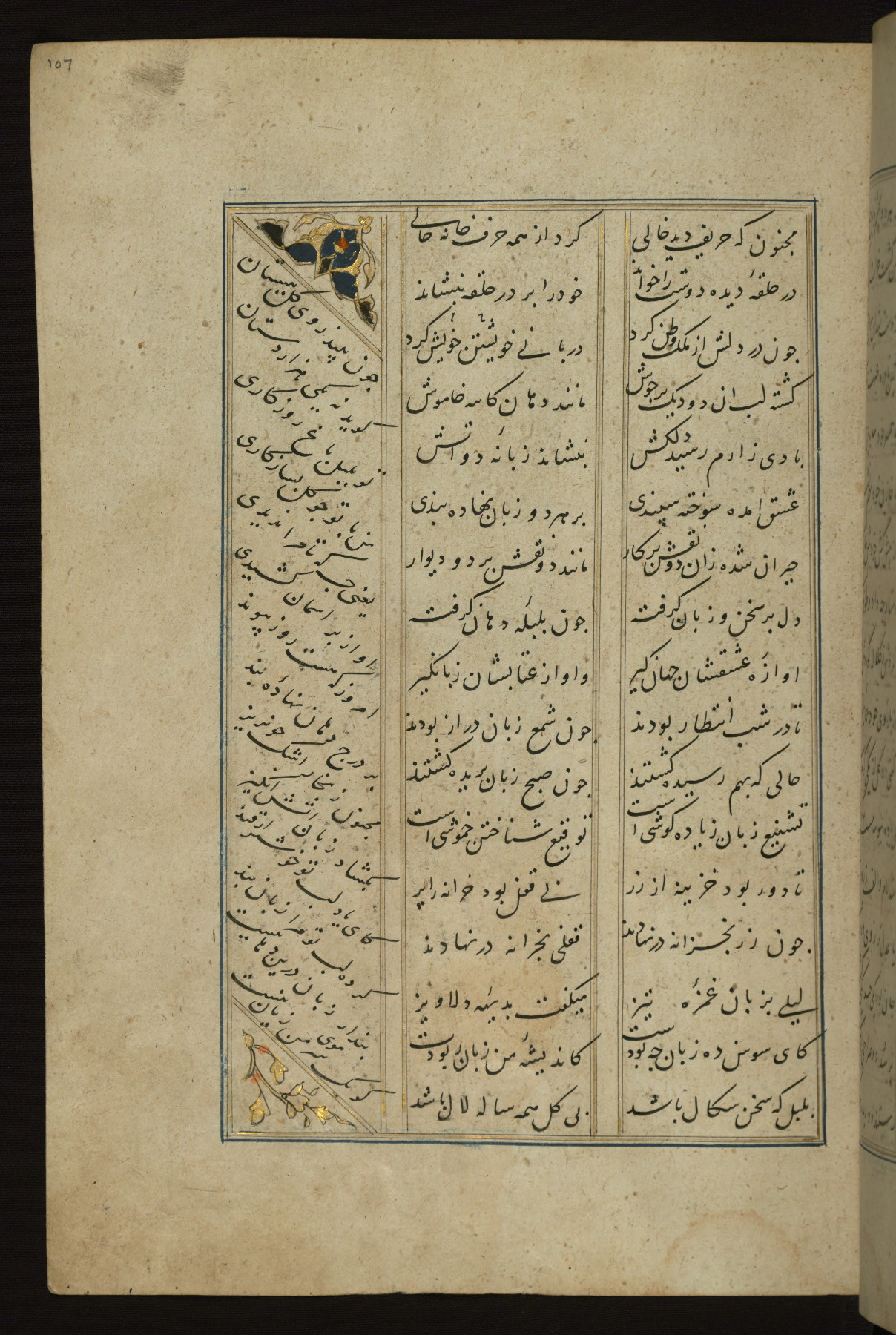 This copy of the Khamsah (quintet) of Niẓāmī Ganjavī (d. 605 AH / 1209 CE) was written by Abū Bakr Shāh ibn Ḥasan ibn ʿAlī al-Shahrastānī and illuminated by Jamāl al-Dīn ibn Muḥammad al-Ṣiddīqī al-Iṣfahānī between 892 AH / 1486 CE and 900 AH / 1494-5 CE. The manuscript opens with a double-page illuminated frontispiece with an inscription giving the title of the work and the name of the author (fols. 1b-2a). There are four illuminated titlepieces with the names of the individual poems and twenty-six repainted illustrations. According to evidence supplied by the colophons, the original binding was by the hand of Jamāl al-Dīn ibn Muḥammad al-Ṣiddīqī al-Iṣfahānī, as well. Unfortunately, it has not survived. The binding presently attached to the manuscript dates to the twelfth century AH / eighteenth CE.