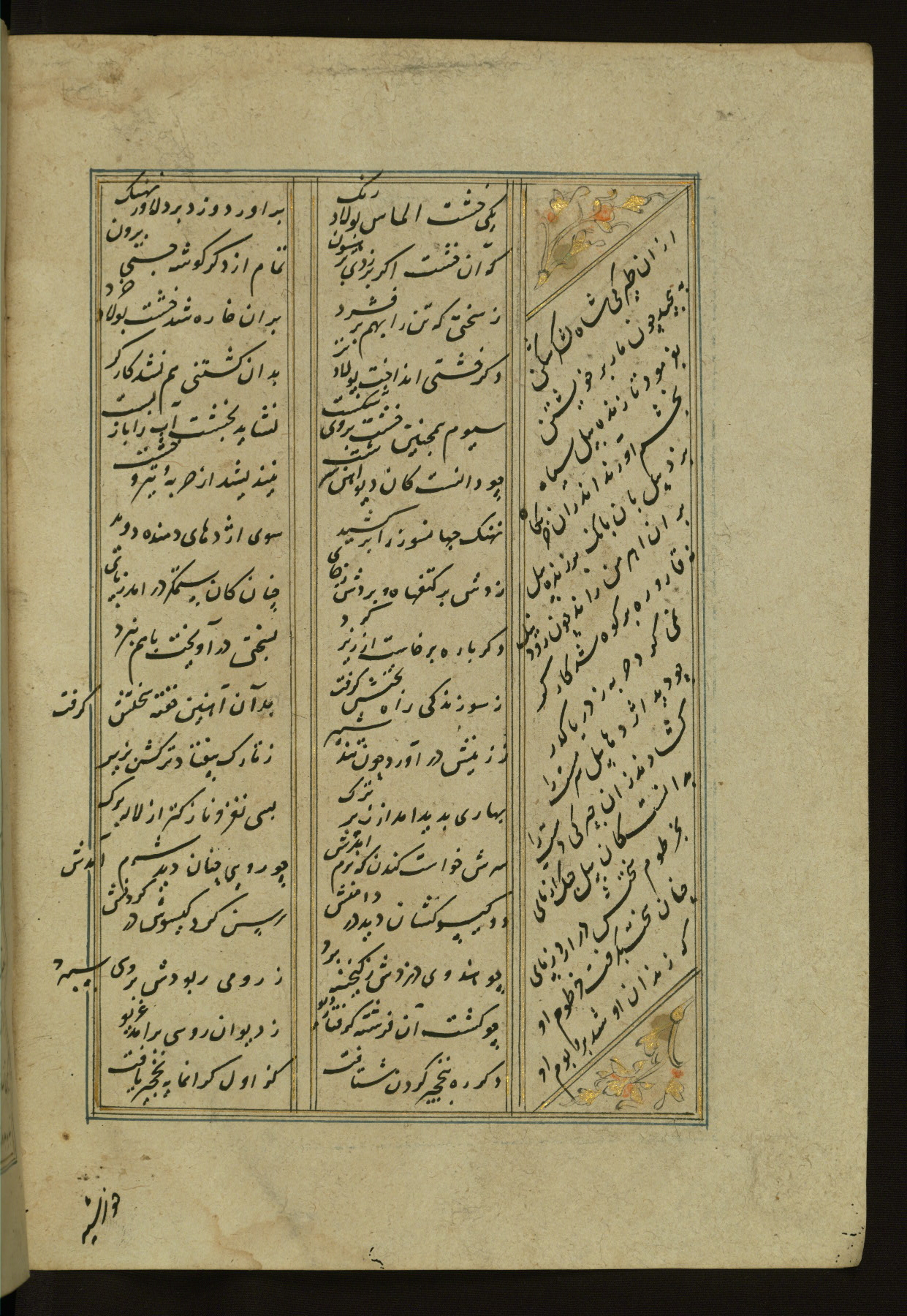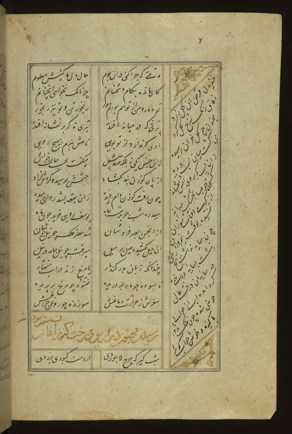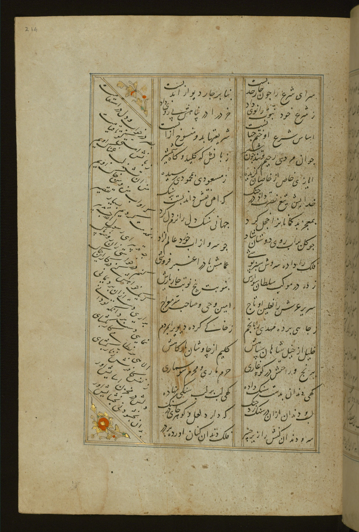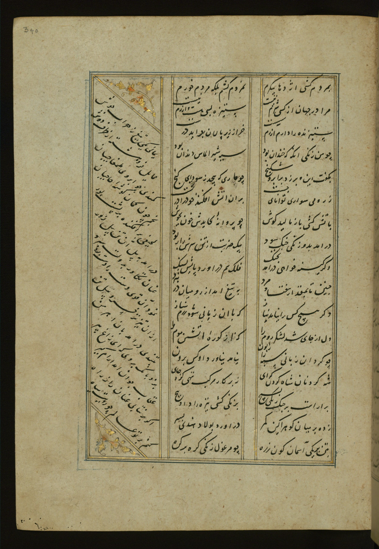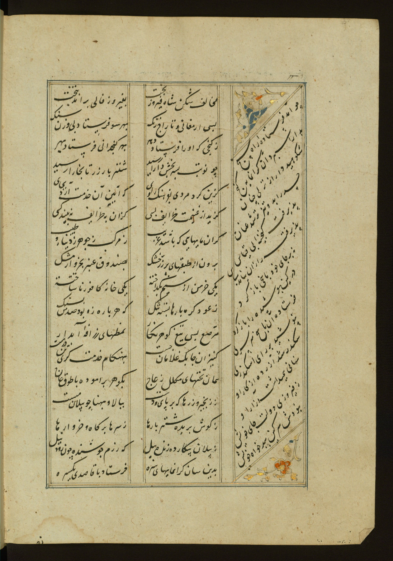 This copy of the Khamsah (quintet) of Niẓāmī Ganjavī (d. 605 AH / 1209 CE) was written by Abū Bakr Shāh ibn Ḥasan ibn ʿAlī al-Shahrastānī and illuminated by Jamāl al-Dīn ibn Muḥammad al-Ṣiddīqī al-Iṣfahānī between 892 AH / 1486 CE and 900 AH / 1494-5 CE. The manuscript opens with a double-page illuminated frontispiece with an inscription giving the title of the work and the name of the author (fols. 1b-2a). There are four illuminated titlepieces with the names of the individual poems and twenty-six repainted illustrations. According to evidence supplied by the colophons, the original binding was by the hand of Jamāl al-Dīn ibn Muḥammad al-Ṣiddīqī al-Iṣfahānī, as well. Unfortunately, it has not survived. The binding presently attached to the manuscript dates to the twelfth century AH / eighteenth CE.