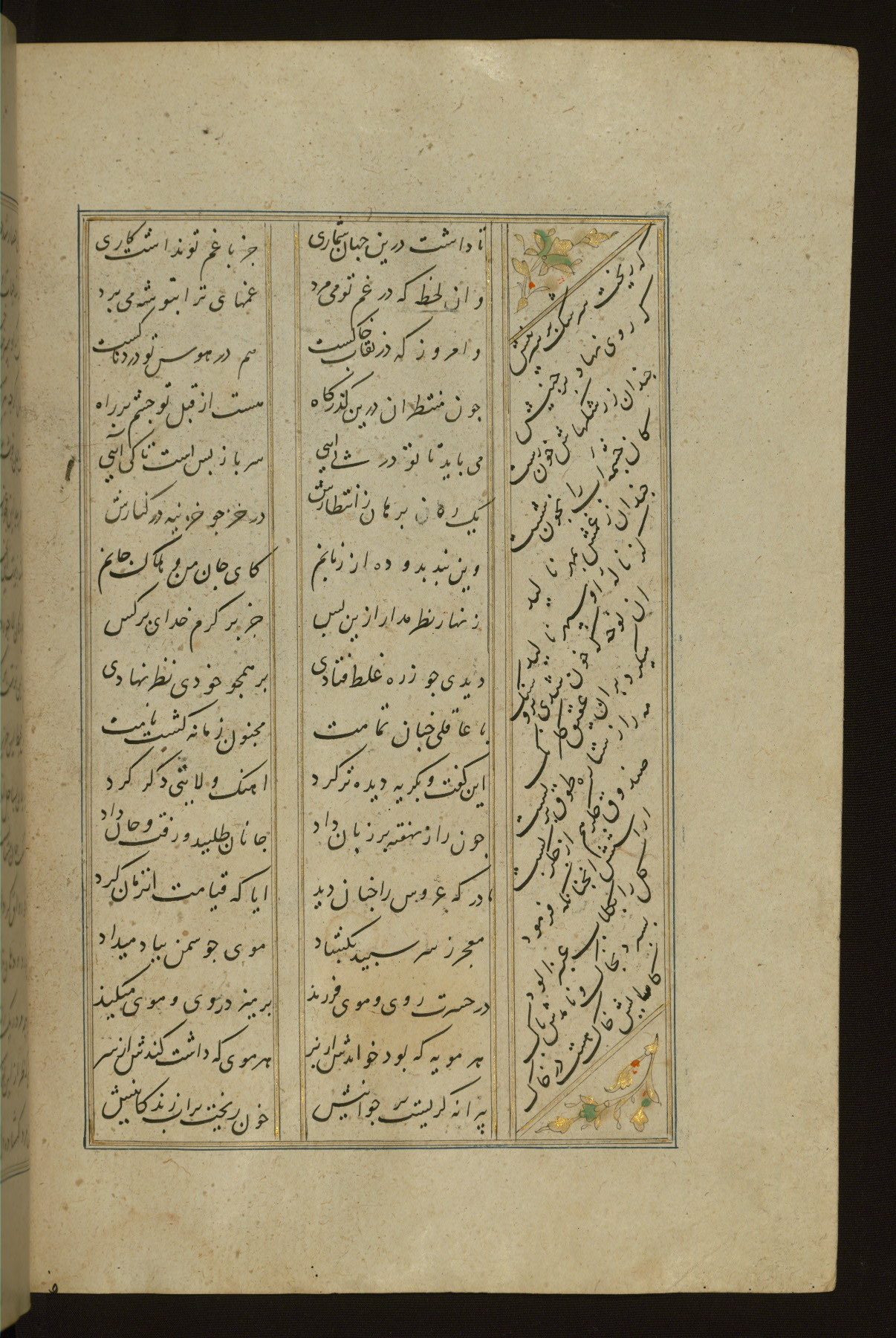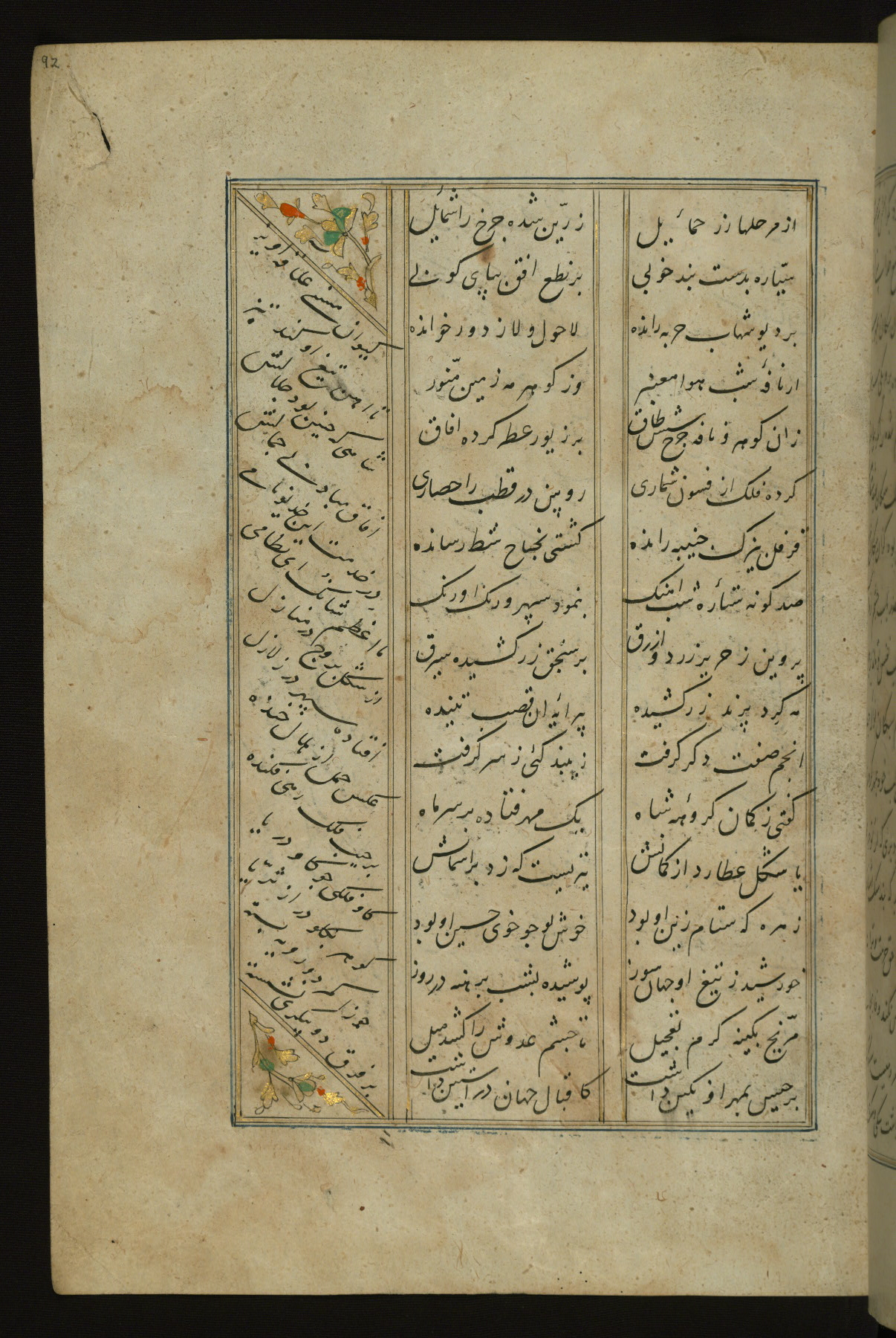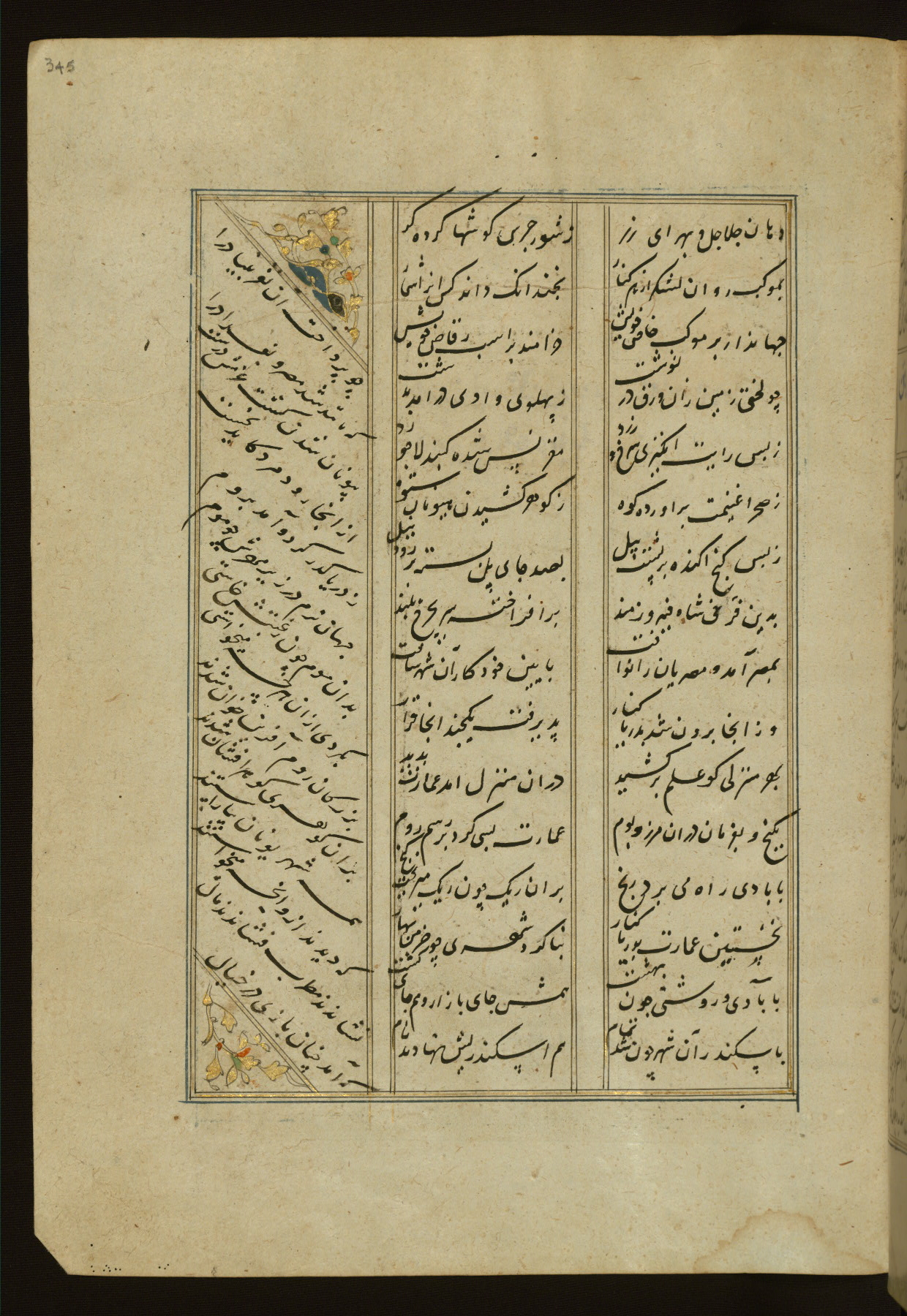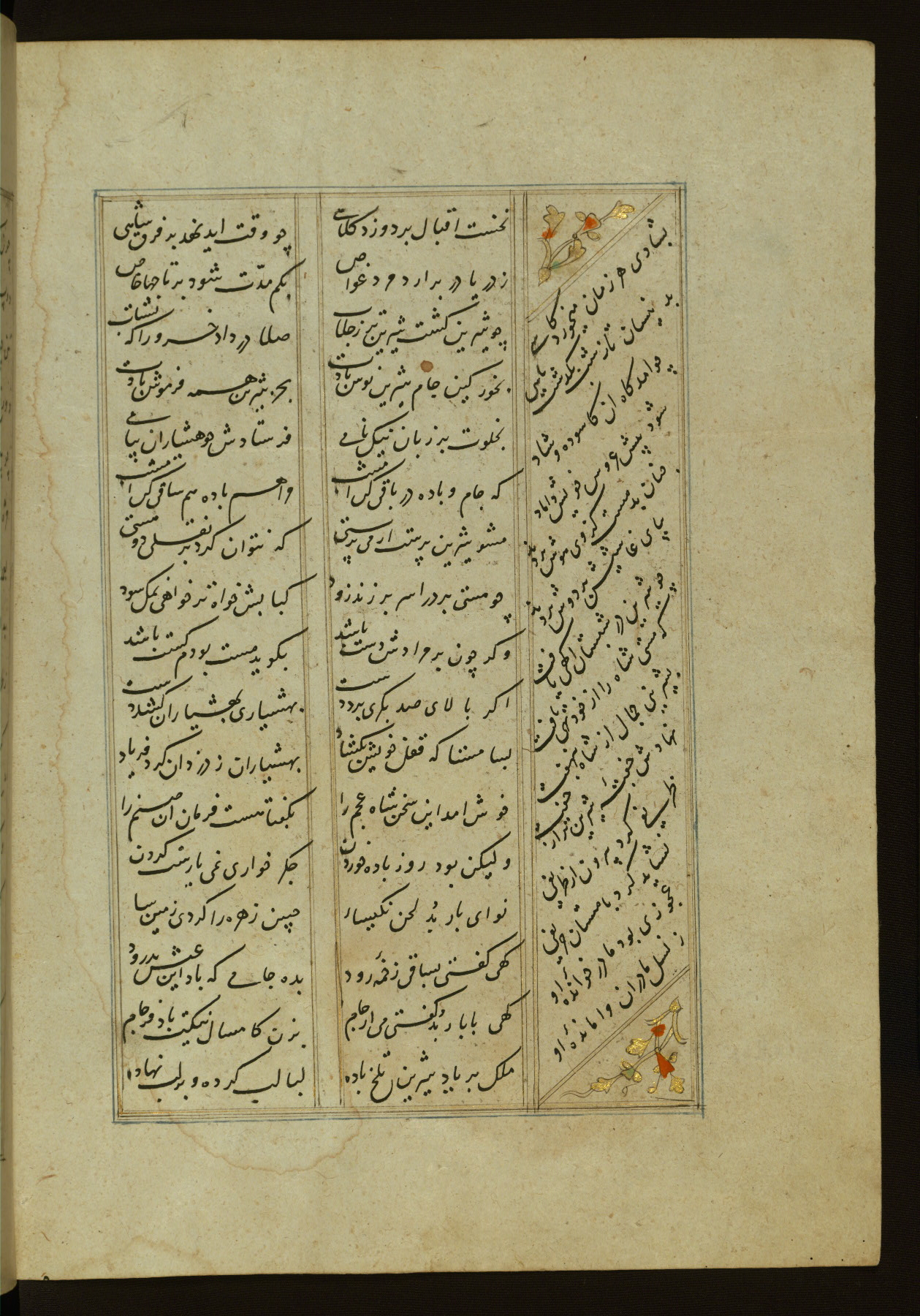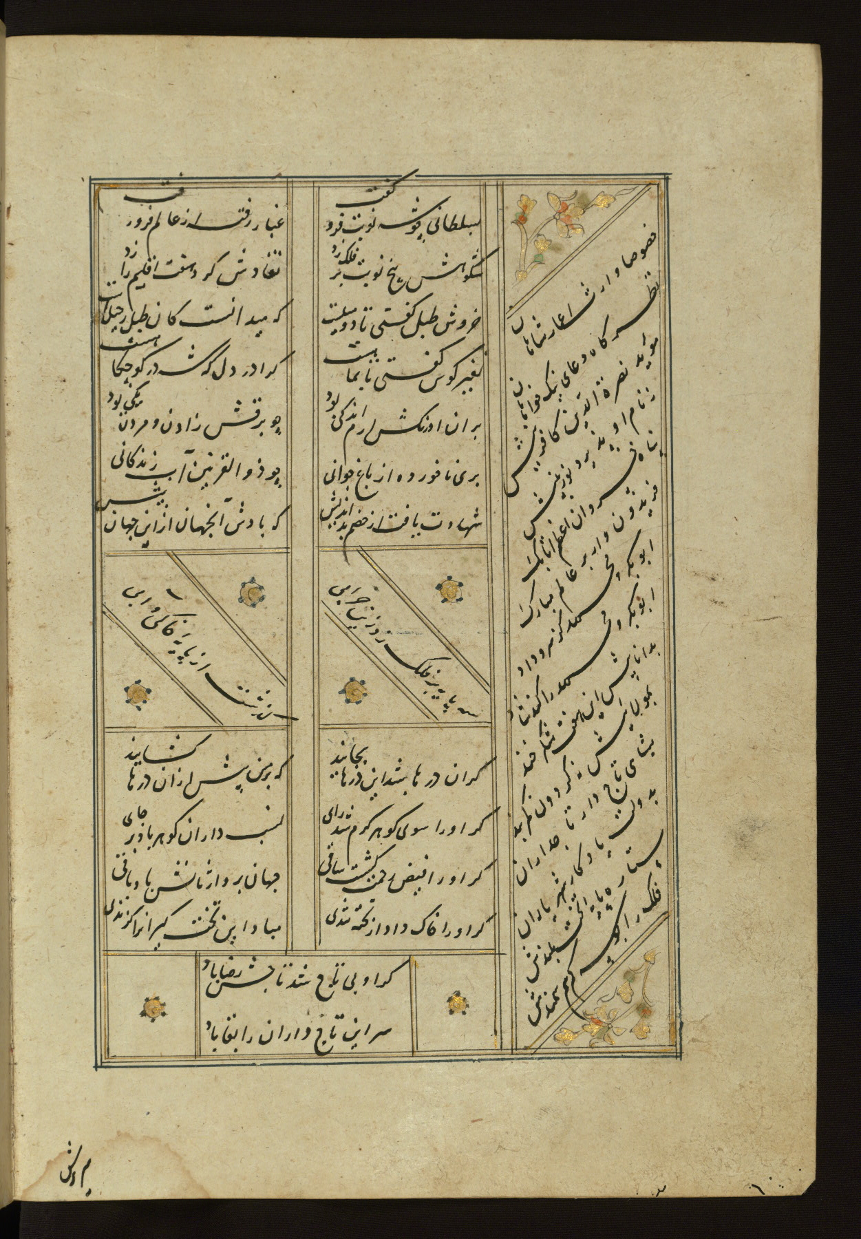 This copy of the Khamsah (quintet) of Niẓāmī Ganjavī (d. 605 AH / 1209 CE) was written by Abū Bakr Shāh ibn Ḥasan ibn ʿAlī al-Shahrastānī and illuminated by Jamāl al-Dīn ibn Muḥammad al-Ṣiddīqī al-Iṣfahānī between 892 AH / 1486 CE and 900 AH / 1494-5 CE. The manuscript opens with a double-page illuminated frontispiece with an inscription giving the title of the work and the name of the author (fols. 1b-2a). There are four illuminated titlepieces with the names of the individual poems and twenty-six repainted illustrations. According to evidence supplied by the colophons, the original binding was by the hand of Jamāl al-Dīn ibn Muḥammad al-Ṣiddīqī al-Iṣfahānī, as well. Unfortunately, it has not survived. The binding presently attached to the manuscript dates to the twelfth century AH / eighteenth CE.