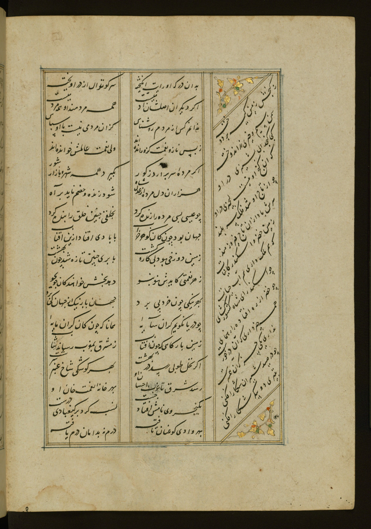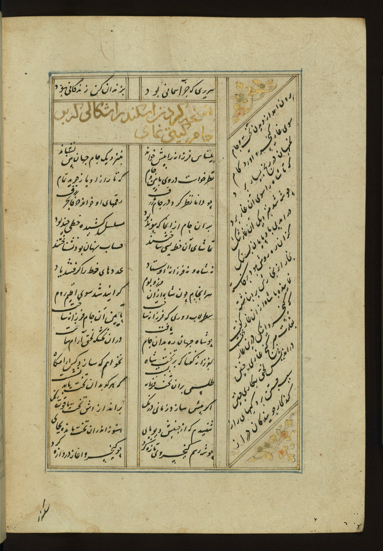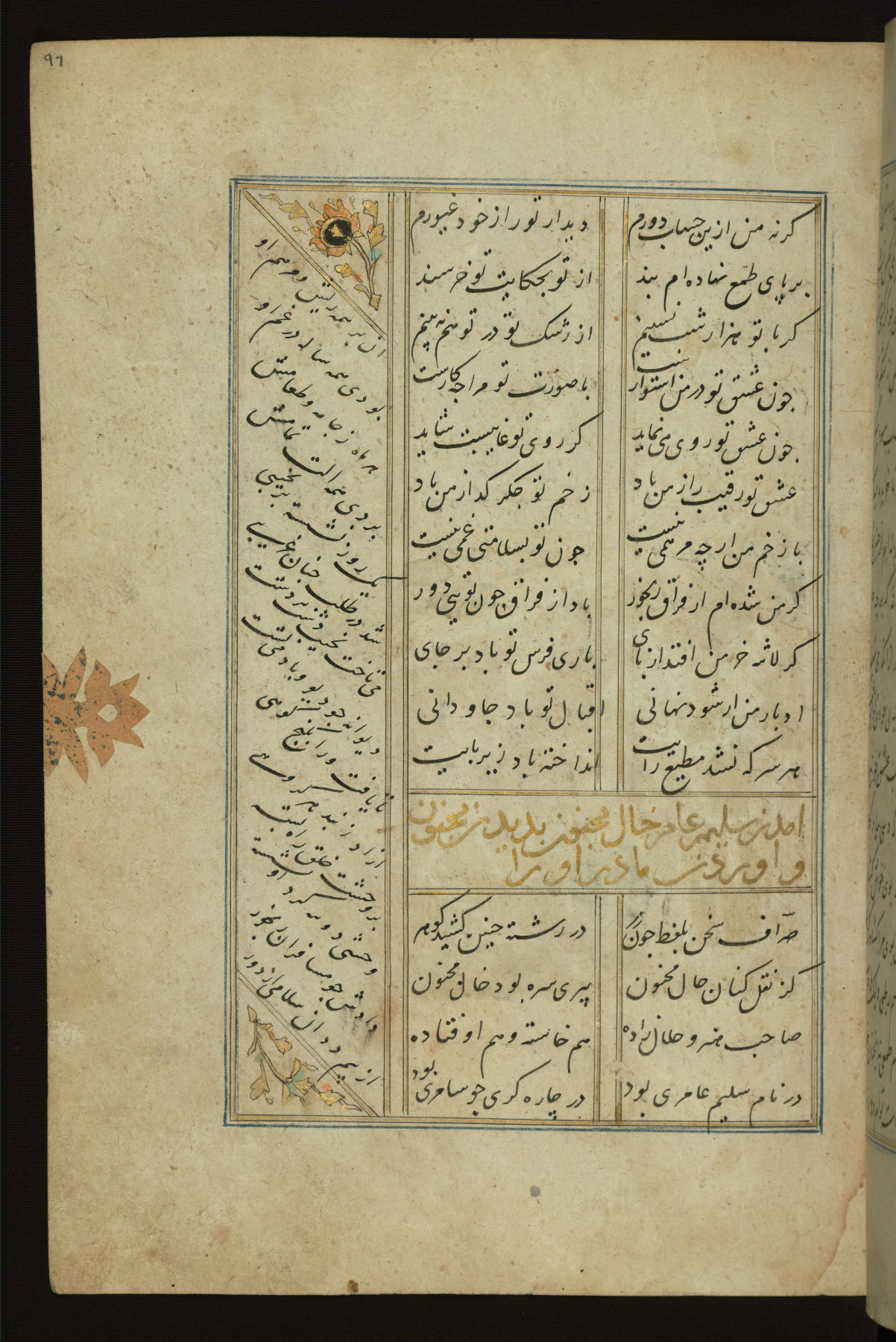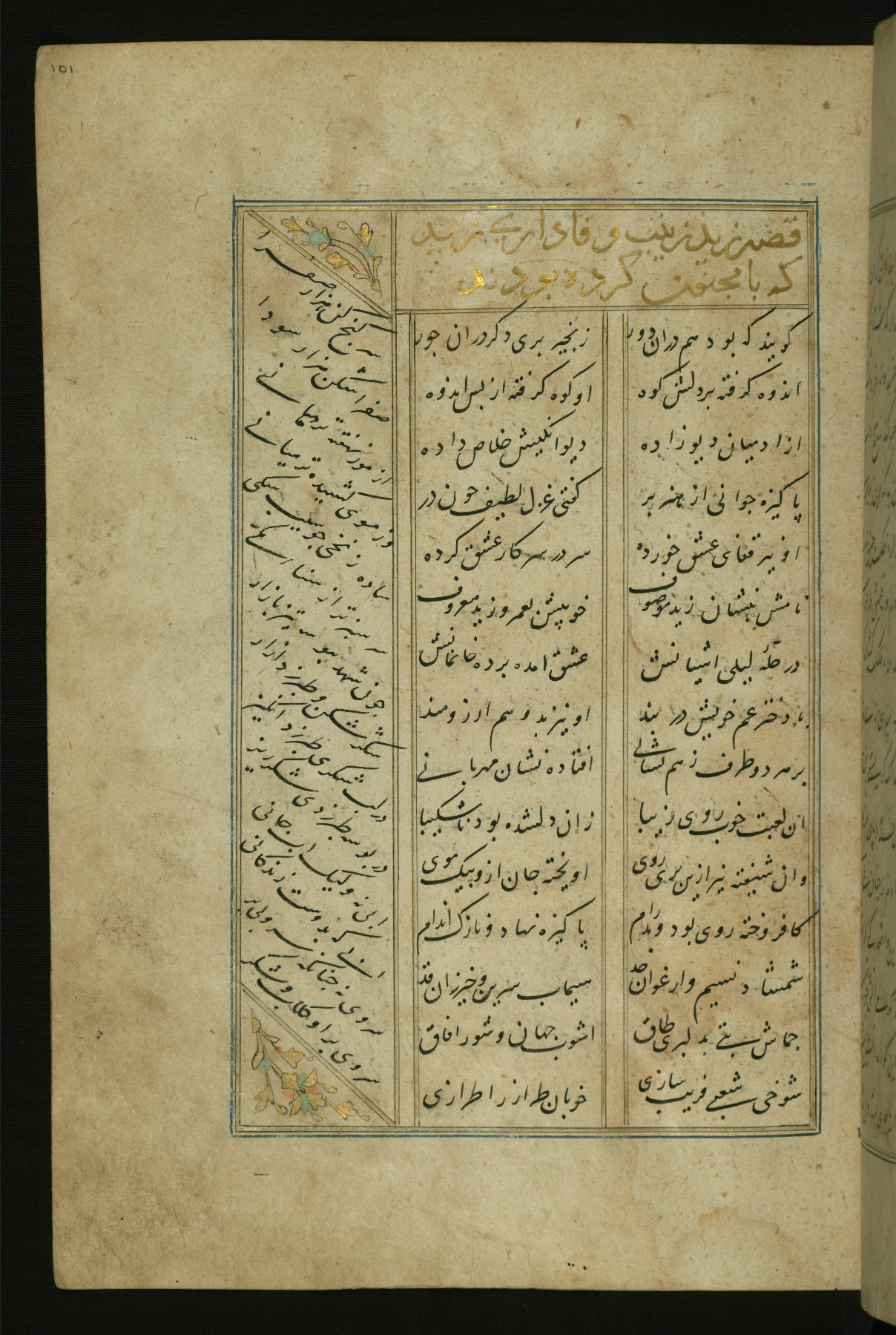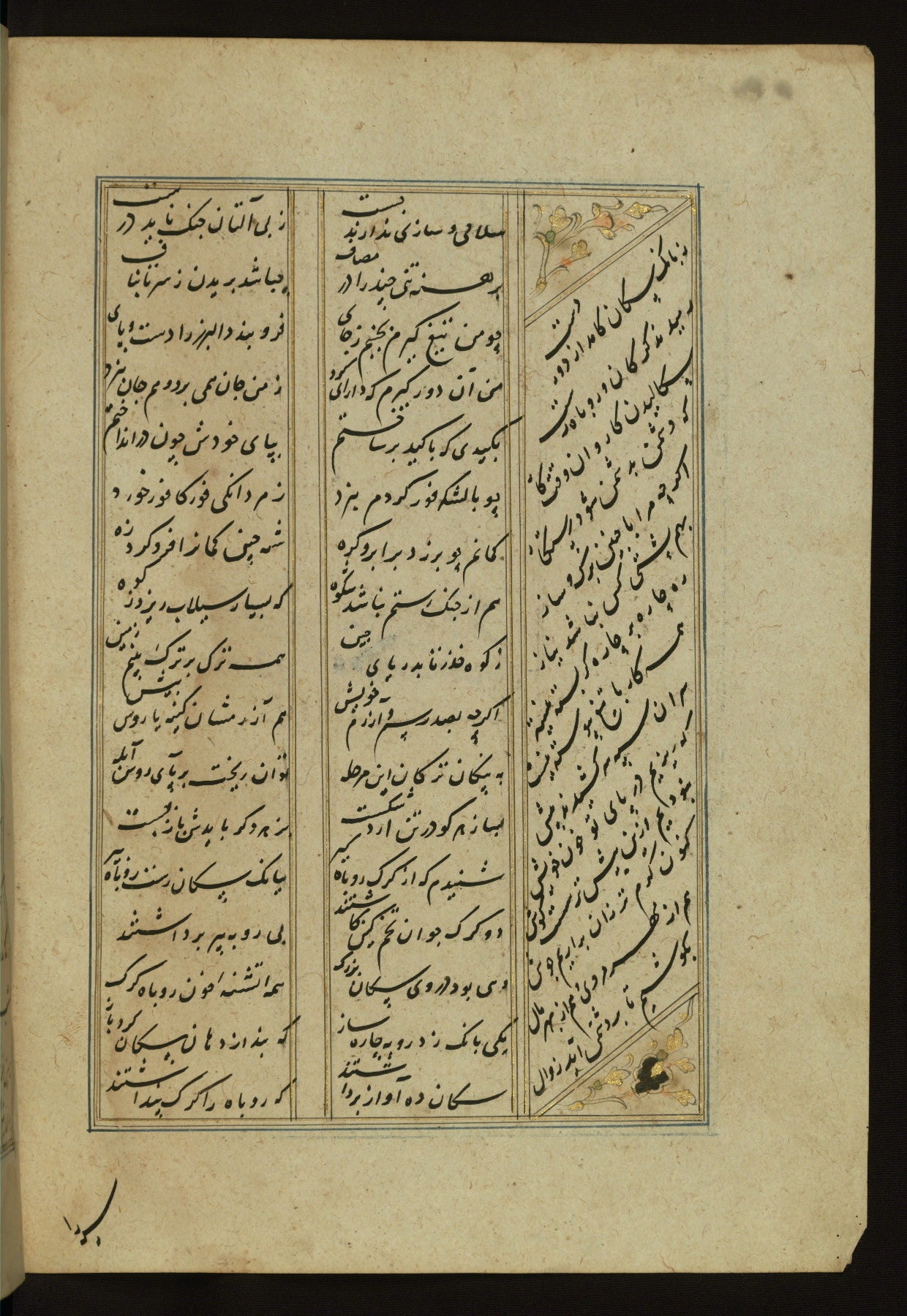 This copy of the Khamsah (quintet) of Niẓāmī Ganjavī (d. 605 AH / 1209 CE) was written by Abū Bakr Shāh ibn Ḥasan ibn ʿAlī al-Shahrastānī and illuminated by Jamāl al-Dīn ibn Muḥammad al-Ṣiddīqī al-Iṣfahānī between 892 AH / 1486 CE and 900 AH / 1494-5 CE. The manuscript opens with a double-page illuminated frontispiece with an inscription giving the title of the work and the name of the author (fols. 1b-2a). There are four illuminated titlepieces with the names of the individual poems and twenty-six repainted illustrations. According to evidence supplied by the colophons, the original binding was by the hand of Jamāl al-Dīn ibn Muḥammad al-Ṣiddīqī al-Iṣfahānī, as well. Unfortunately, it has not survived. The binding presently attached to the manuscript dates to the twelfth century AH / eighteenth CE.