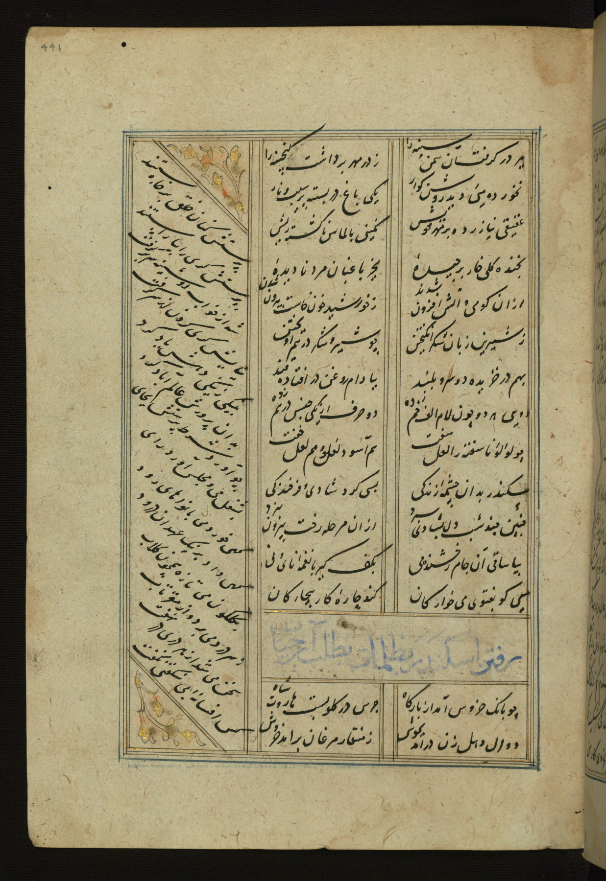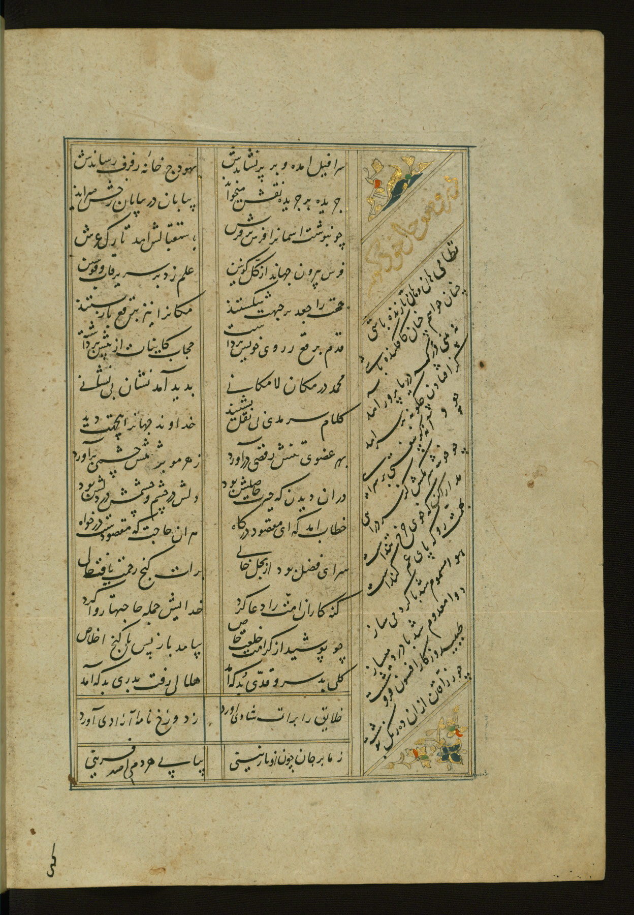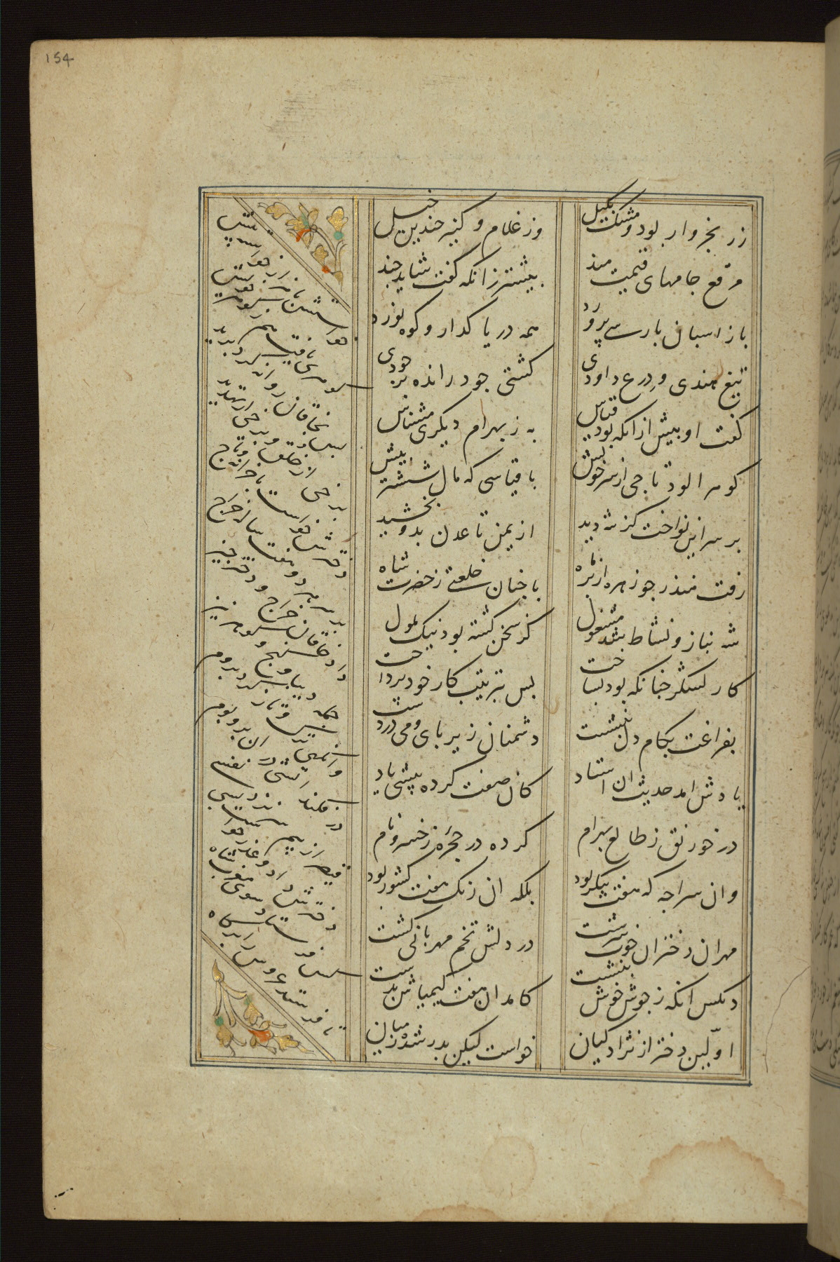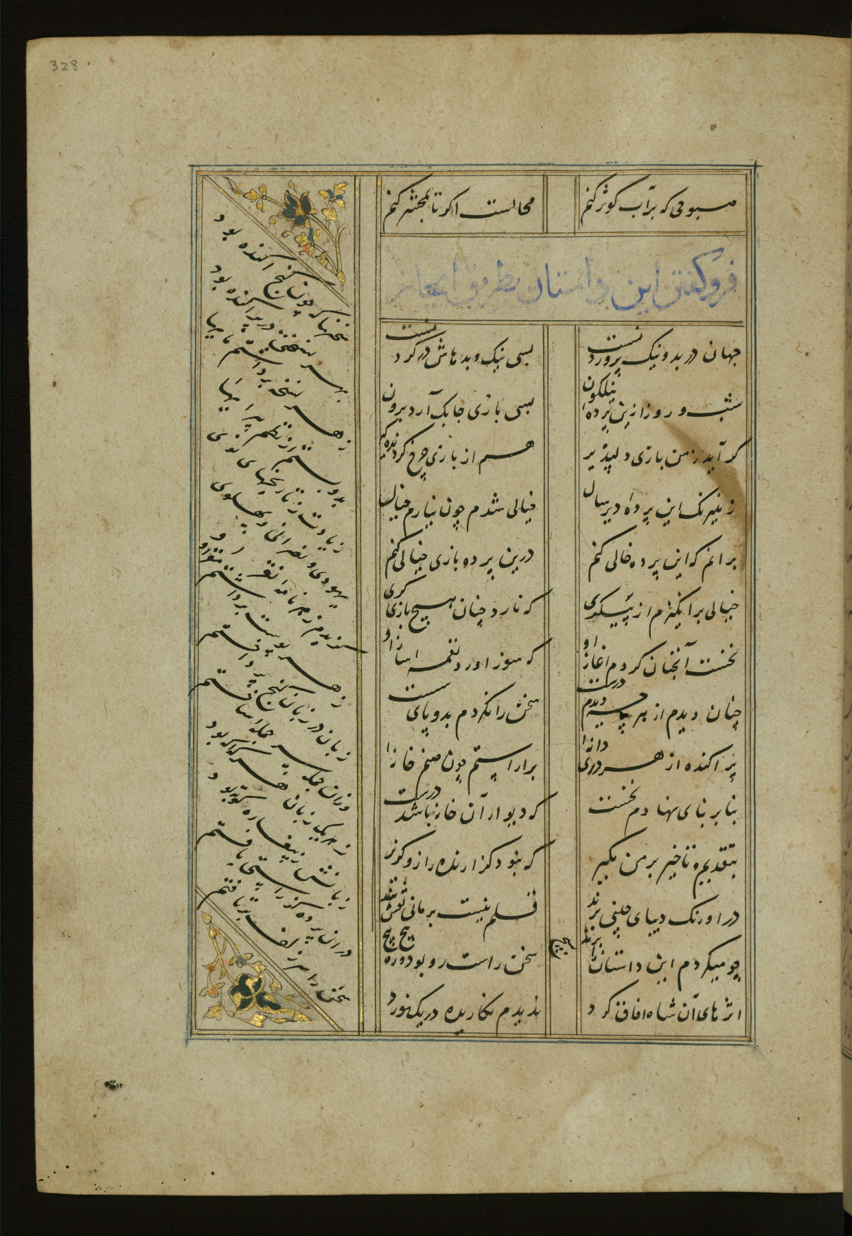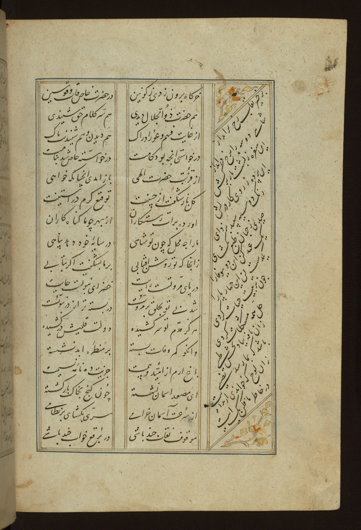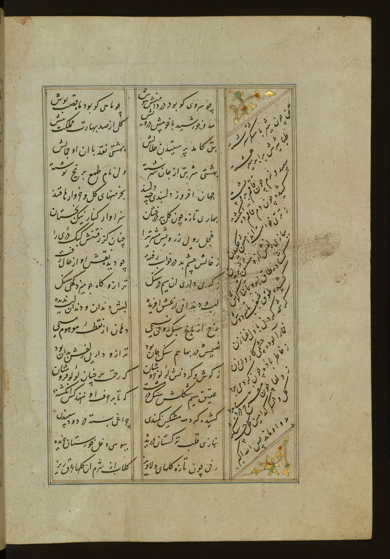 This copy of the Khamsah (quintet) of Niẓāmī Ganjavī (d. 605 AH / 1209 CE) was written by Abū Bakr Shāh ibn Ḥasan ibn ʿAlī al-Shahrastānī and illuminated by Jamāl al-Dīn ibn Muḥammad al-Ṣiddīqī al-Iṣfahānī between 892 AH / 1486 CE and 900 AH / 1494-5 CE. The manuscript opens with a double-page illuminated frontispiece with an inscription giving the title of the work and the name of the author (fols. 1b-2a). There are four illuminated titlepieces with the names of the individual poems and twenty-six repainted illustrations. According to evidence supplied by the colophons, the original binding was by the hand of Jamāl al-Dīn ibn Muḥammad al-Ṣiddīqī al-Iṣfahānī, as well. Unfortunately, it has not survived. The binding presently attached to the manuscript dates to the twelfth century AH / eighteenth CE.
