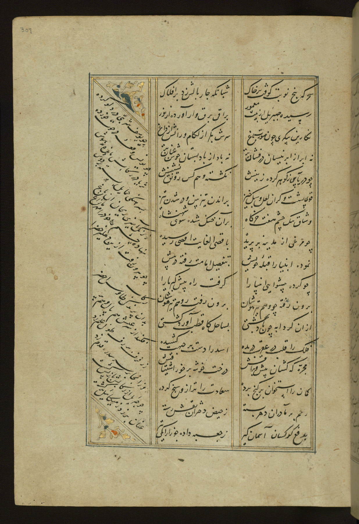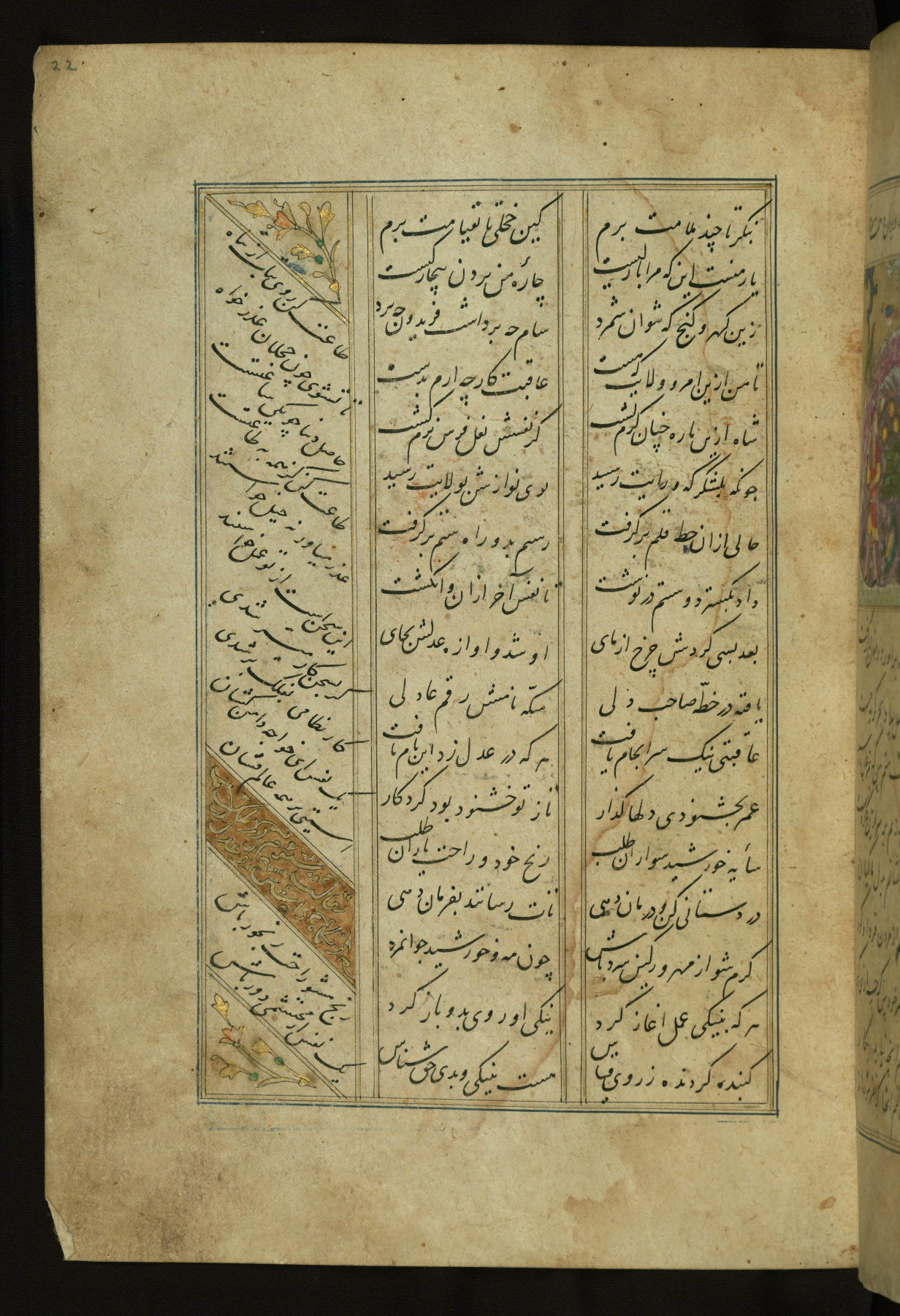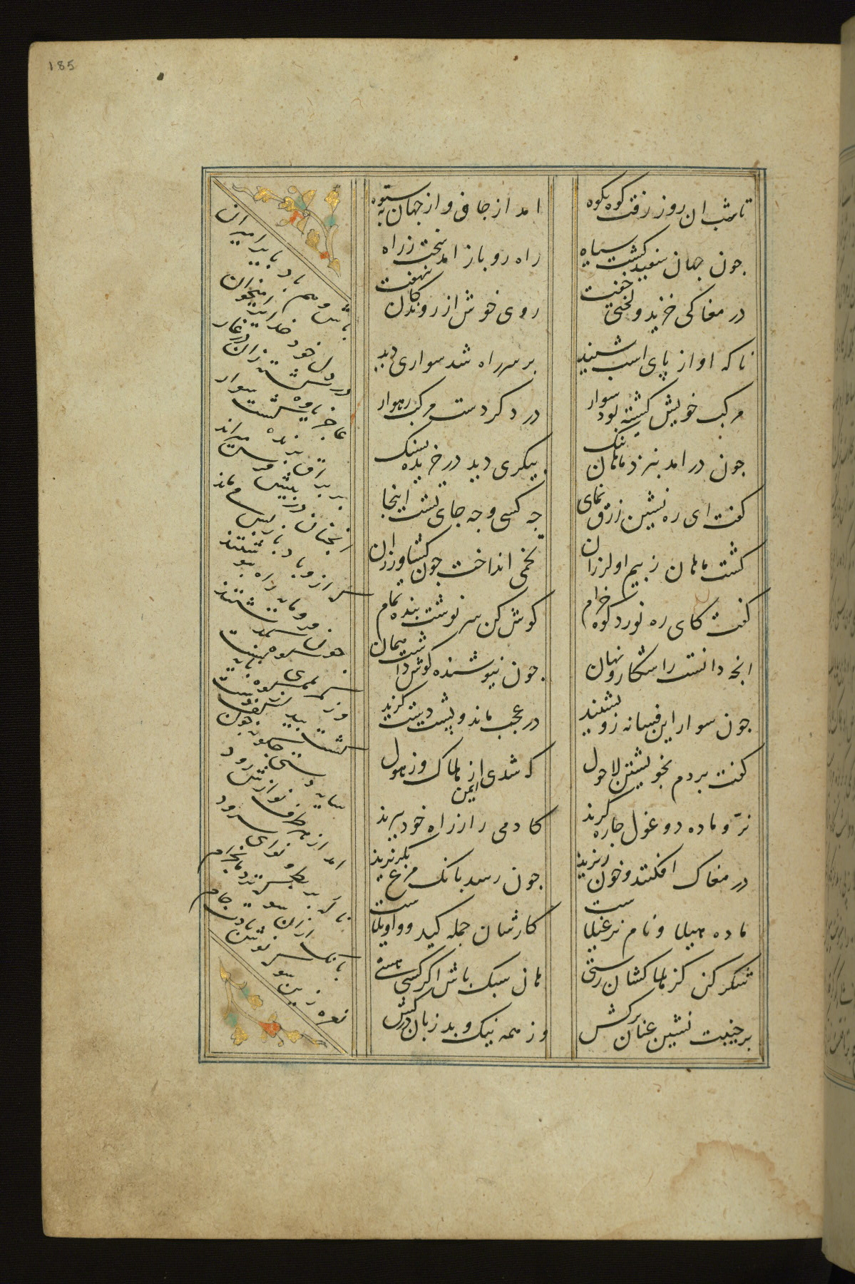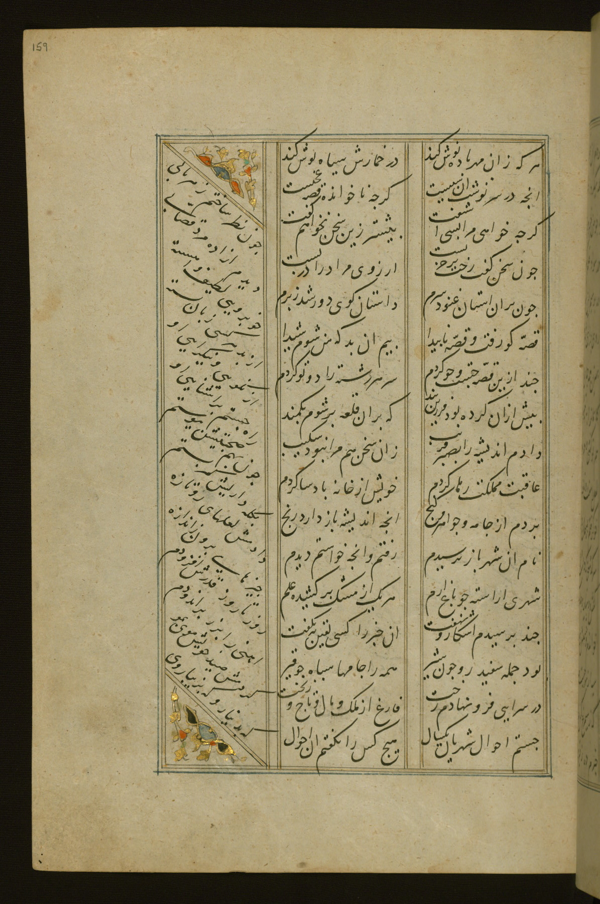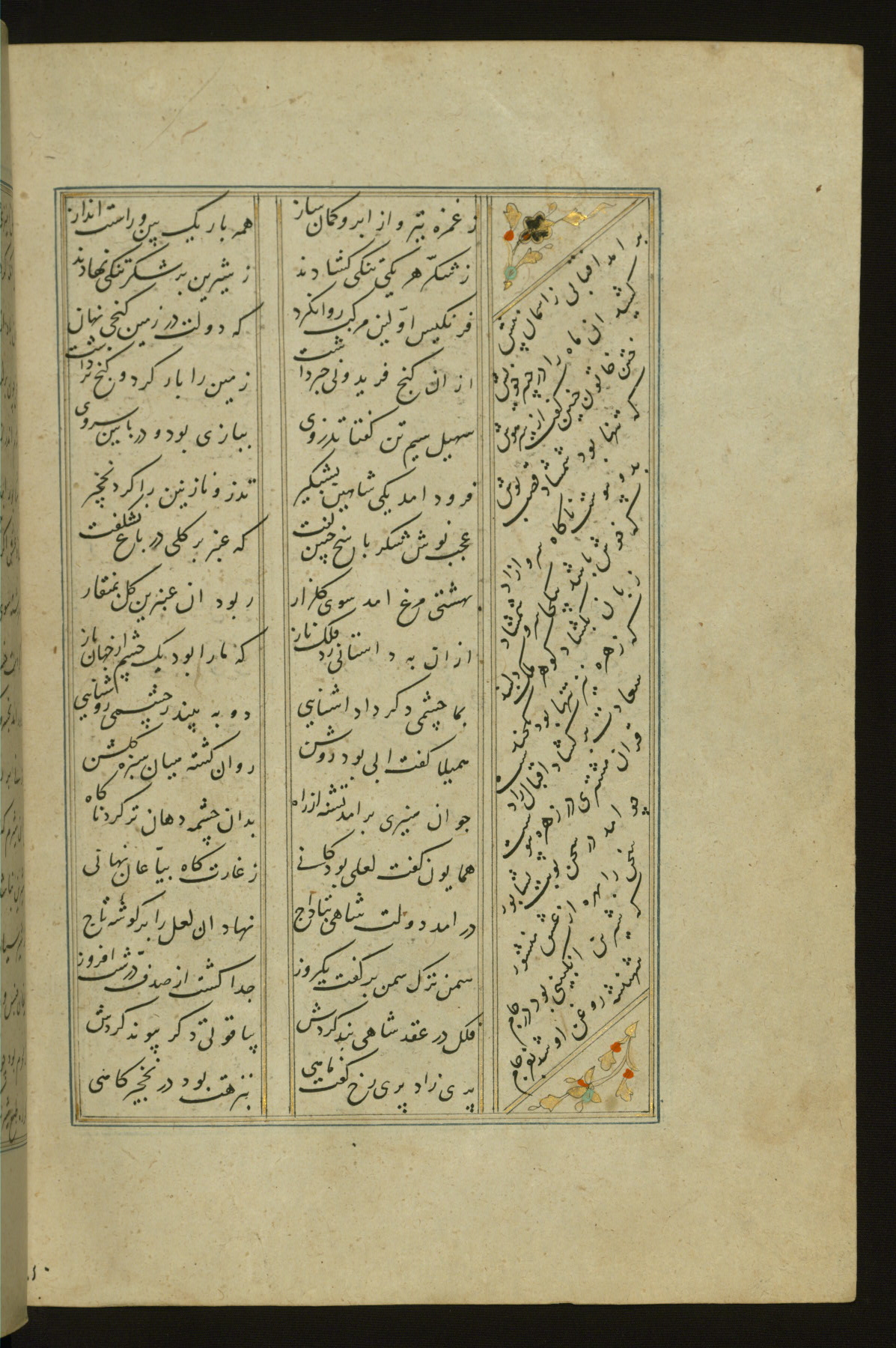 This copy of the Khamsah (quintet) of Niẓāmī Ganjavī (d. 605 AH / 1209 CE) was written by Abū Bakr Shāh ibn Ḥasan ibn ʿAlī al-Shahrastānī and illuminated by Jamāl al-Dīn ibn Muḥammad al-Ṣiddīqī al-Iṣfahānī between 892 AH / 1486 CE and 900 AH / 1494-5 CE. The manuscript opens with a double-page illuminated frontispiece with an inscription giving the title of the work and the name of the author (fols. 1b-2a). There are four illuminated titlepieces with the names of the individual poems and twenty-six repainted illustrations. According to evidence supplied by the colophons, the original binding was by the hand of Jamāl al-Dīn ibn Muḥammad al-Ṣiddīqī al-Iṣfahānī, as well. Unfortunately, it has not survived. The binding presently attached to the manuscript dates to the twelfth century AH / eighteenth CE.