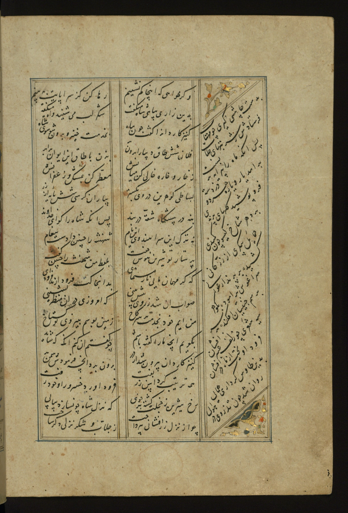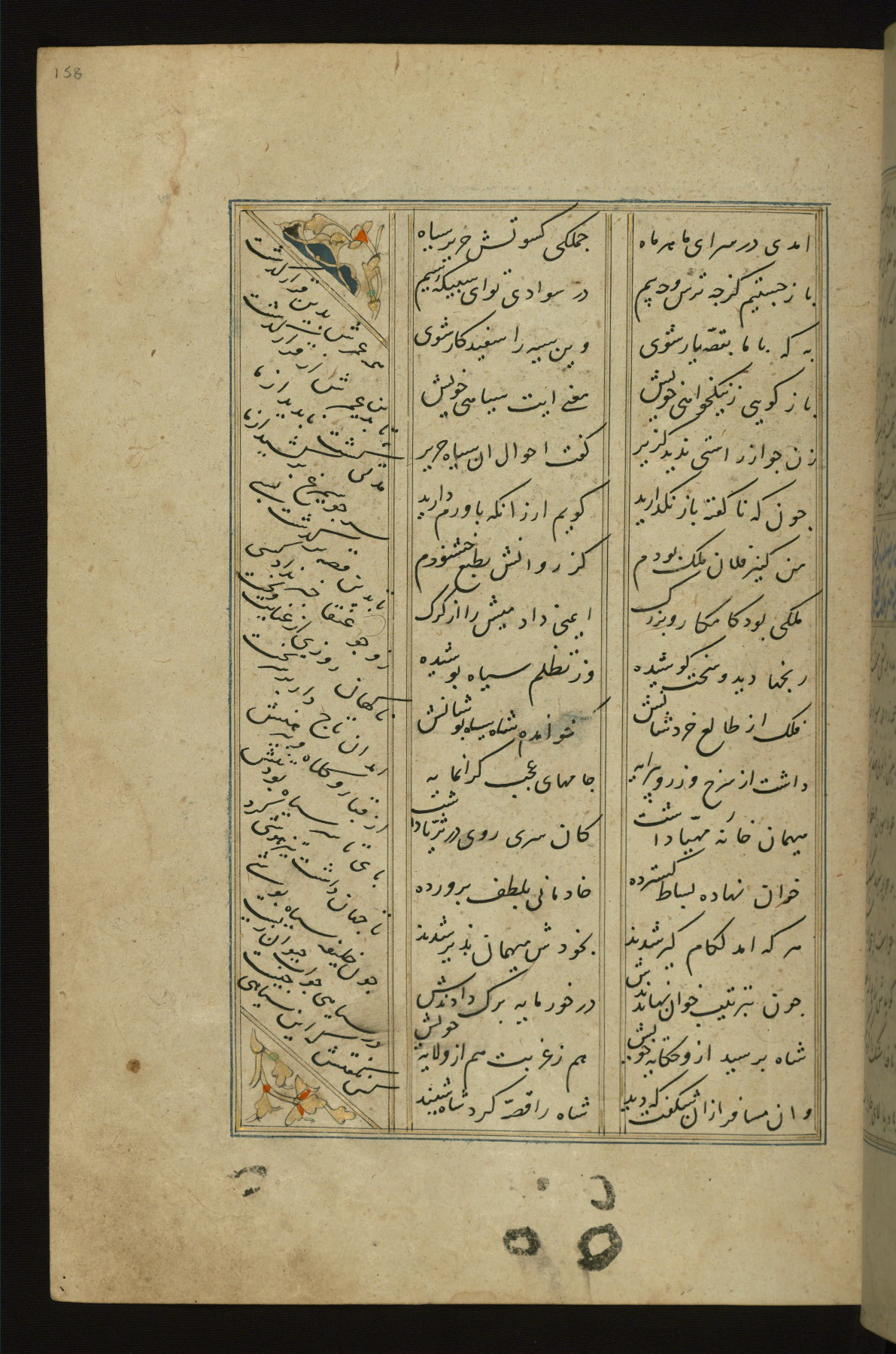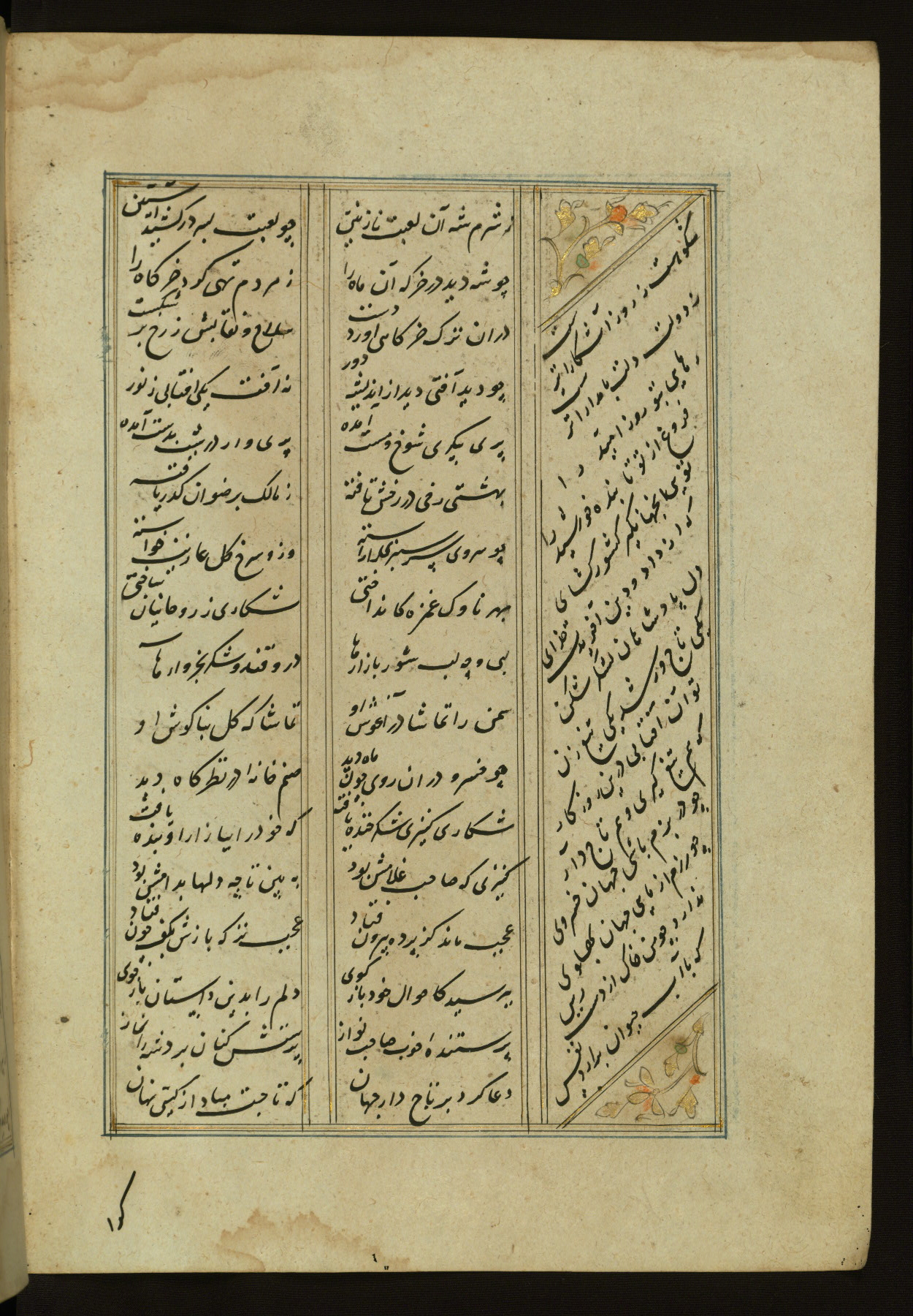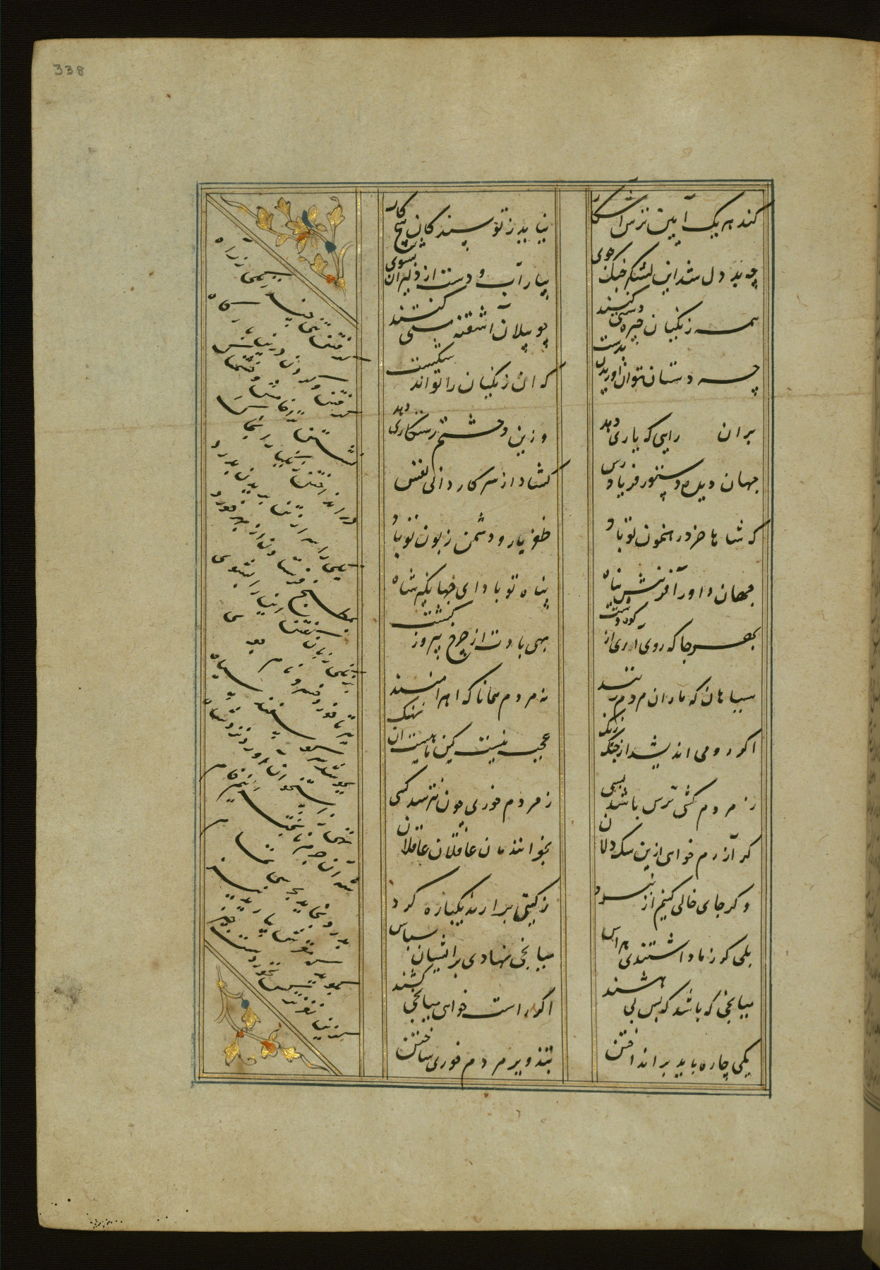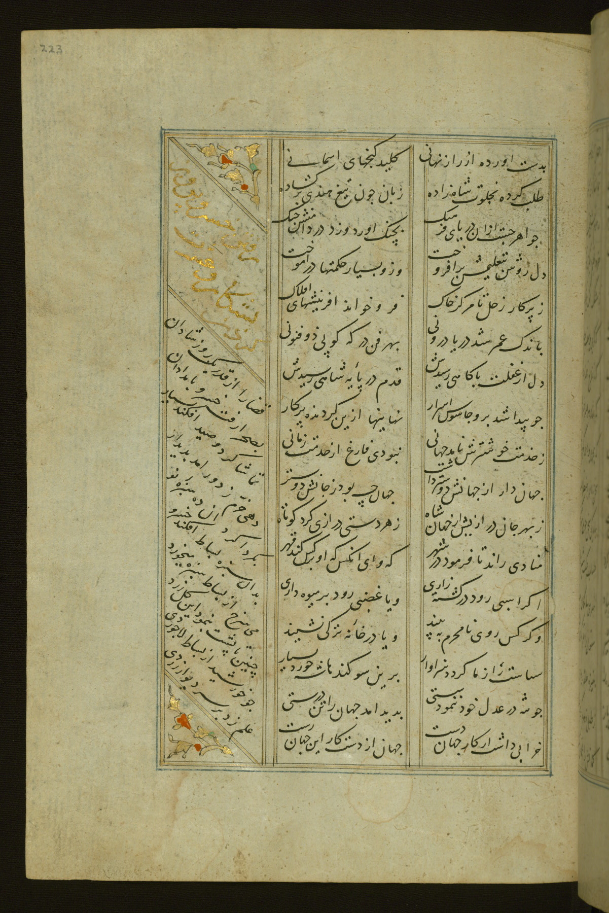 This copy of the Khamsah (quintet) of Niẓāmī Ganjavī (d. 605 AH / 1209 CE) was written by Abū Bakr Shāh ibn Ḥasan ibn ʿAlī al-Shahrastānī and illuminated by Jamāl al-Dīn ibn Muḥammad al-Ṣiddīqī al-Iṣfahānī between 892 AH / 1486 CE and 900 AH / 1494-5 CE. The manuscript opens with a double-page illuminated frontispiece with an inscription giving the title of the work and the name of the author (fols. 1b-2a). There are four illuminated titlepieces with the names of the individual poems and twenty-six repainted illustrations. According to evidence supplied by the colophons, the original binding was by the hand of Jamāl al-Dīn ibn Muḥammad al-Ṣiddīqī al-Iṣfahānī, as well. Unfortunately, it has not survived. The binding presently attached to the manuscript dates to the twelfth century AH / eighteenth CE.