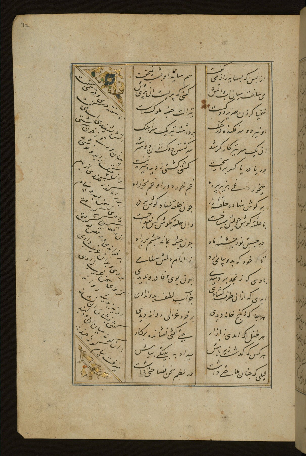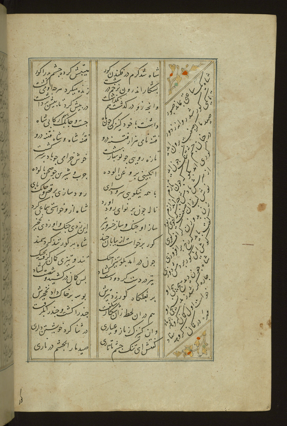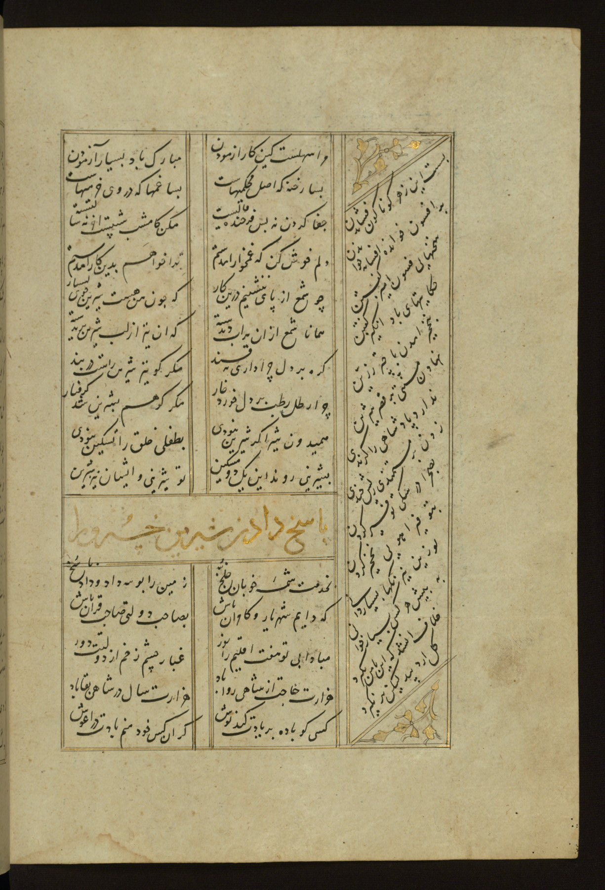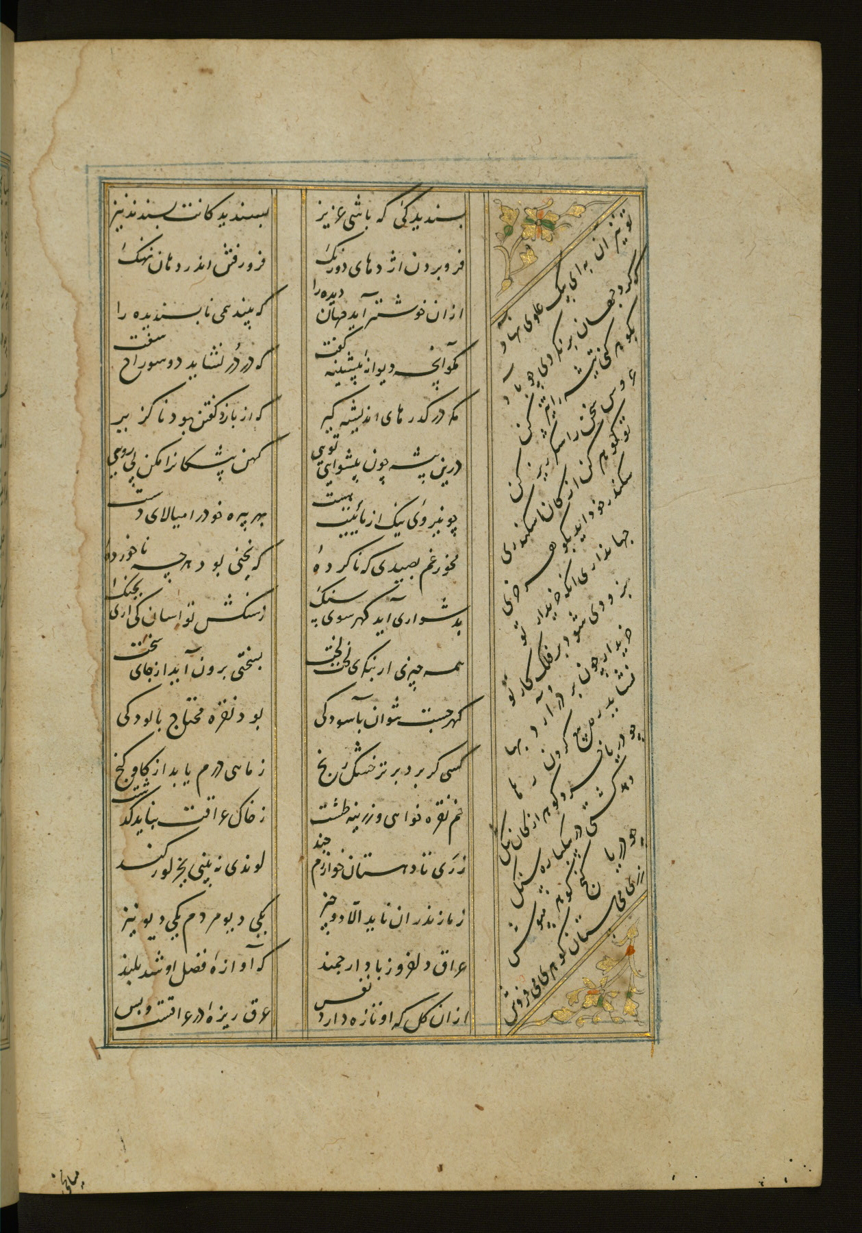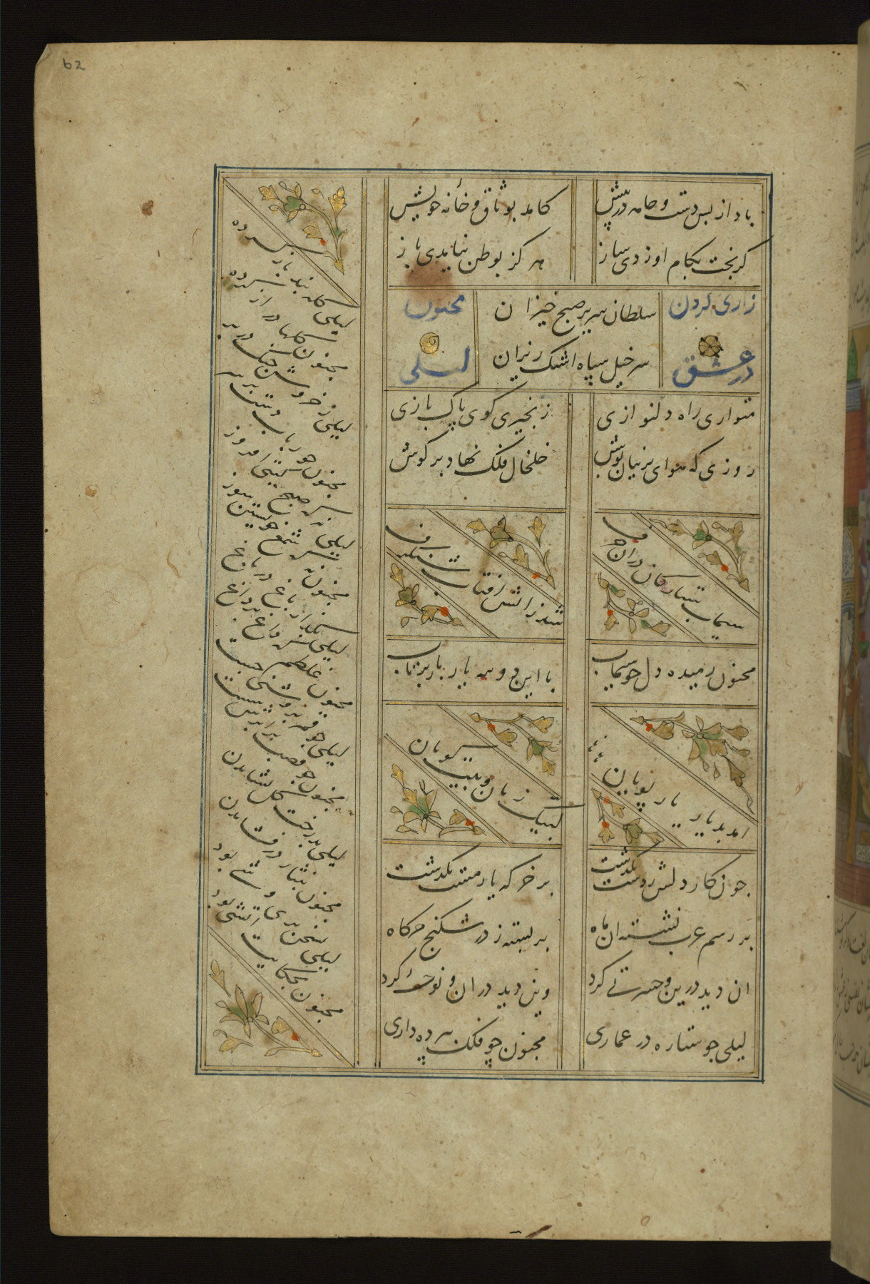 This copy of the Khamsah (quintet) of Niẓāmī Ganjavī (d. 605 AH / 1209 CE) was written by Abū Bakr Shāh ibn Ḥasan ibn ʿAlī al-Shahrastānī and illuminated by Jamāl al-Dīn ibn Muḥammad al-Ṣiddīqī al-Iṣfahānī between 892 AH / 1486 CE and 900 AH / 1494-5 CE. The manuscript opens with a double-page illuminated frontispiece with an inscription giving the title of the work and the name of the author (fols. 1b-2a). There are four illuminated titlepieces with the names of the individual poems and twenty-six repainted illustrations. According to evidence supplied by the colophons, the original binding was by the hand of Jamāl al-Dīn ibn Muḥammad al-Ṣiddīqī al-Iṣfahānī, as well. Unfortunately, it has not survived. The binding presently attached to the manuscript dates to the twelfth century AH / eighteenth CE.